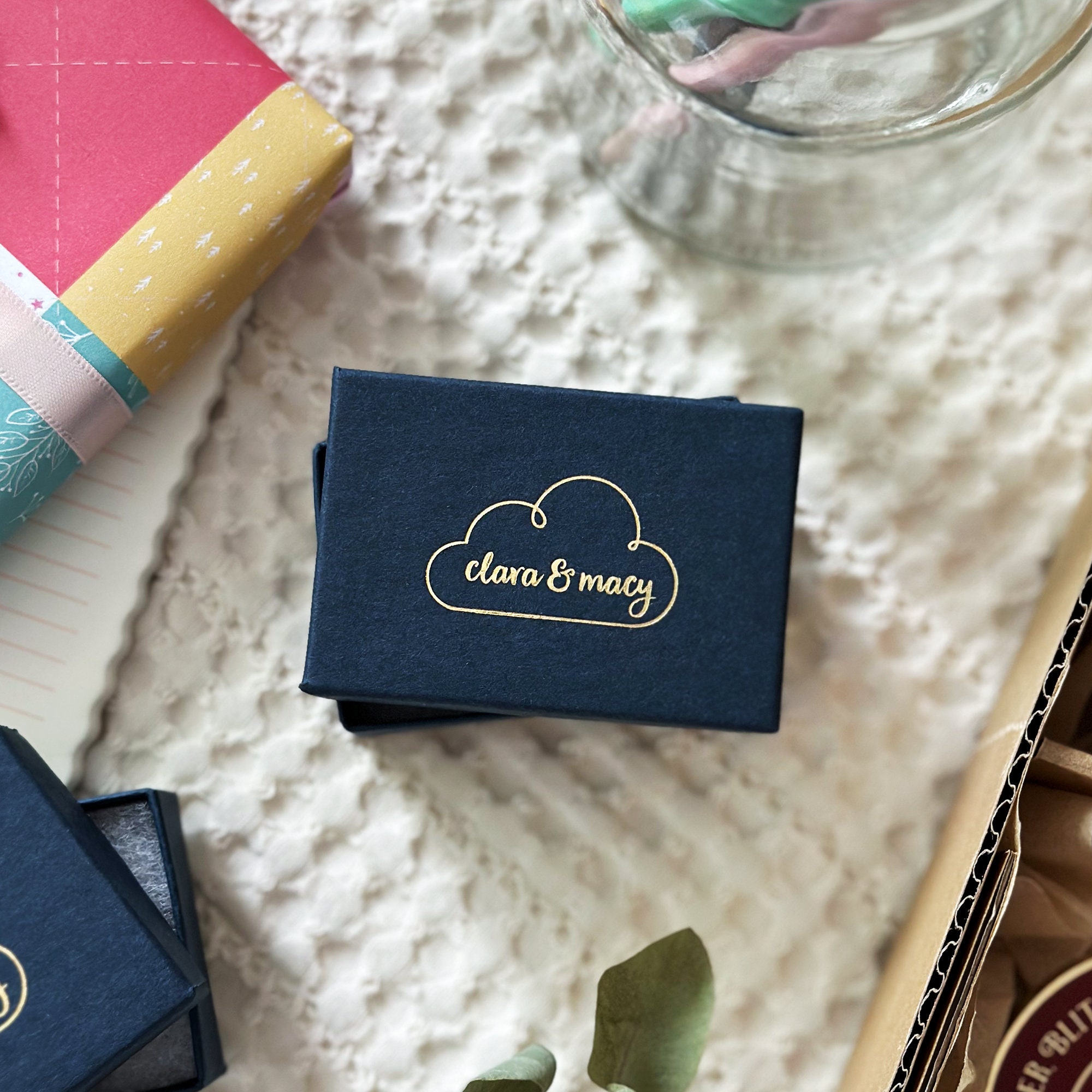 Deep gold plating and navy blue with a rubber clutch. Packaged on a Clara and Macy backing card.