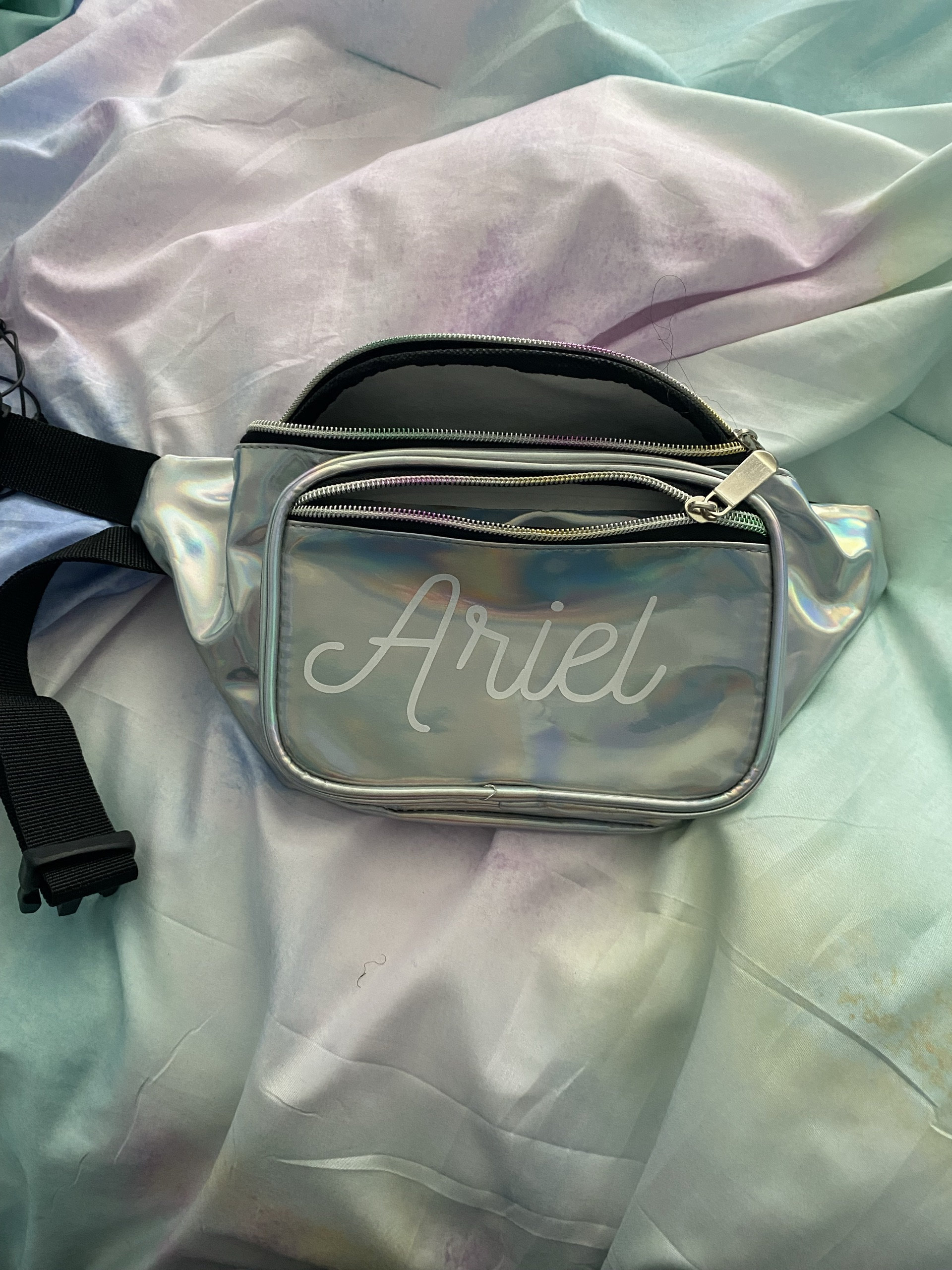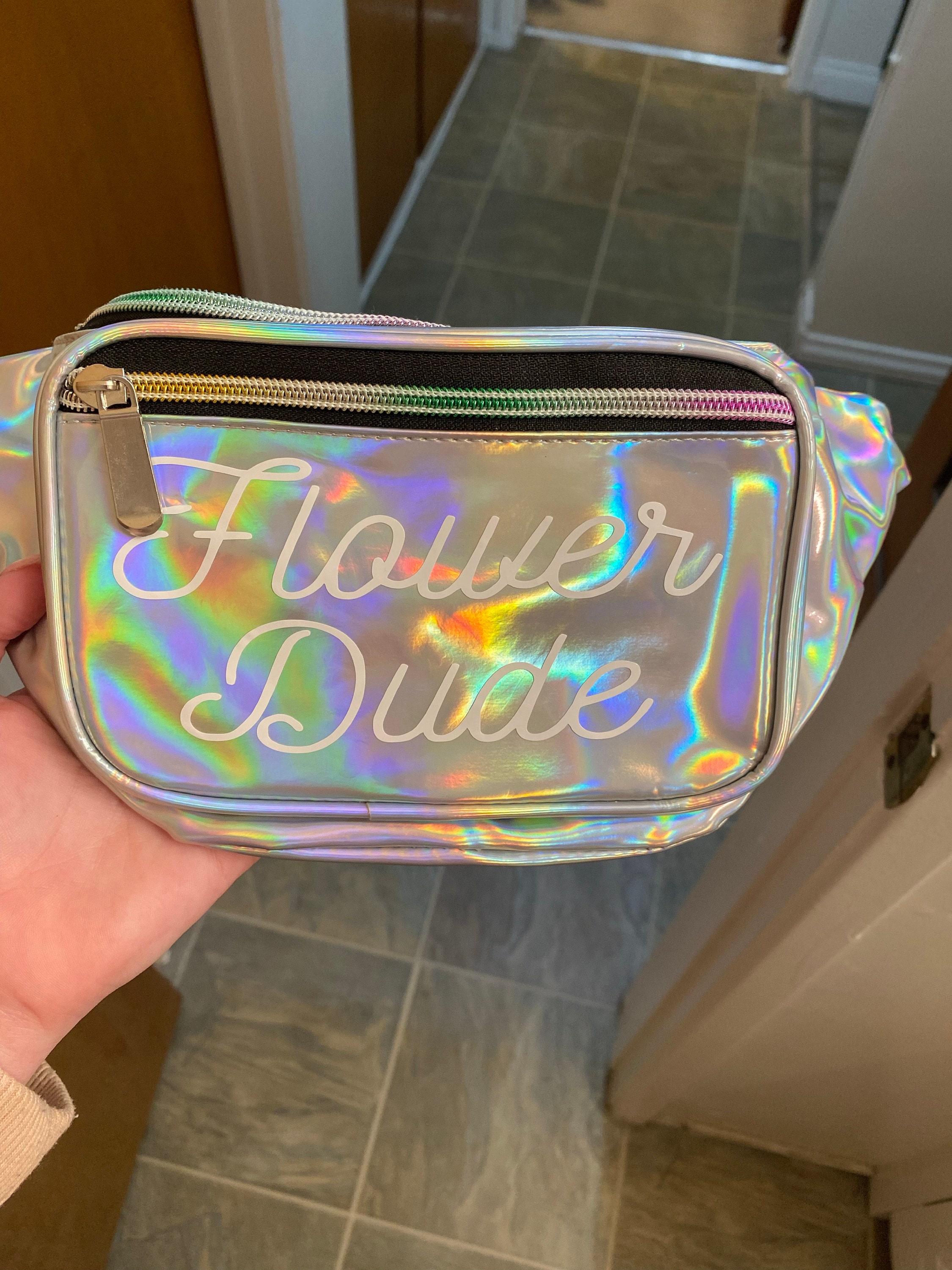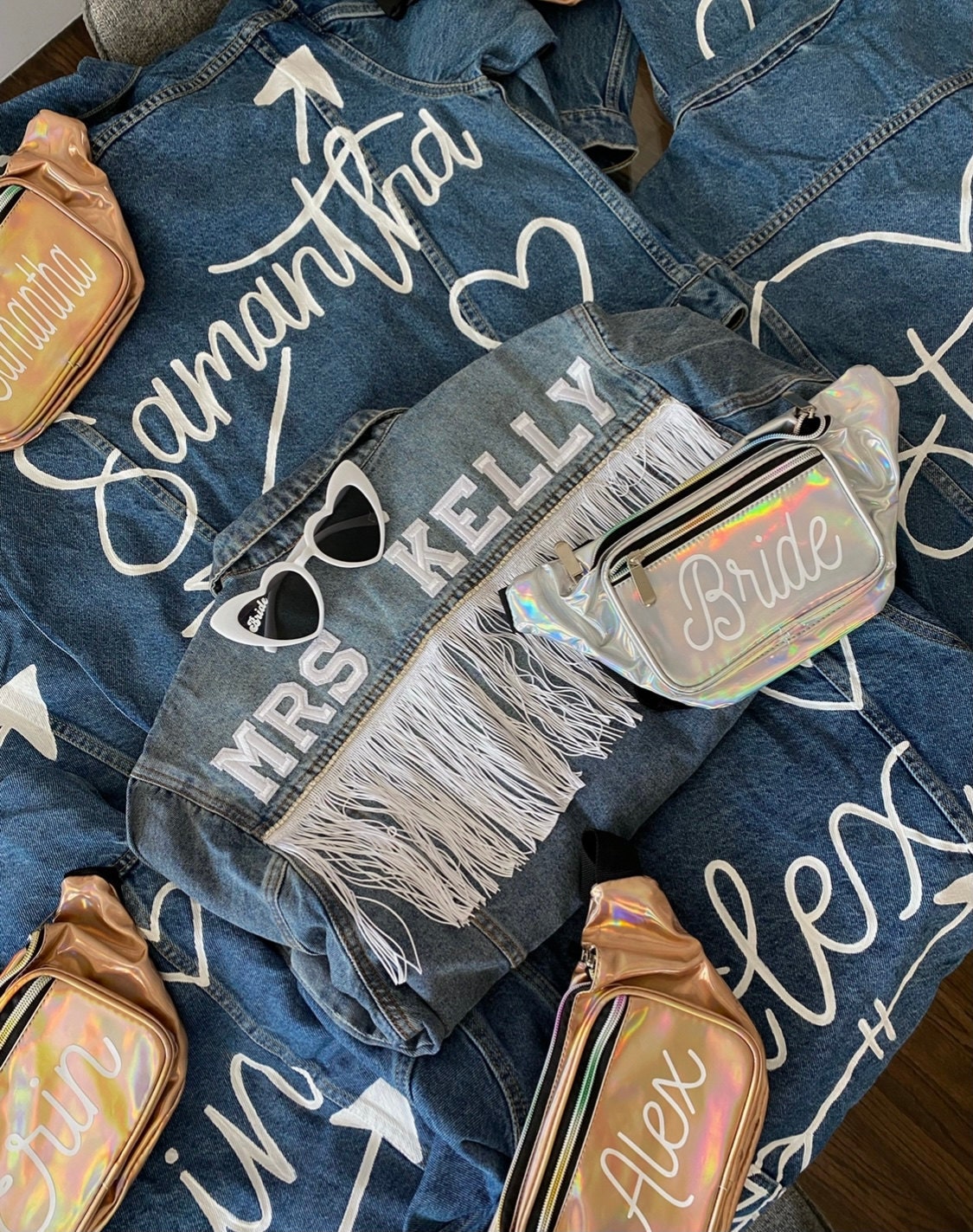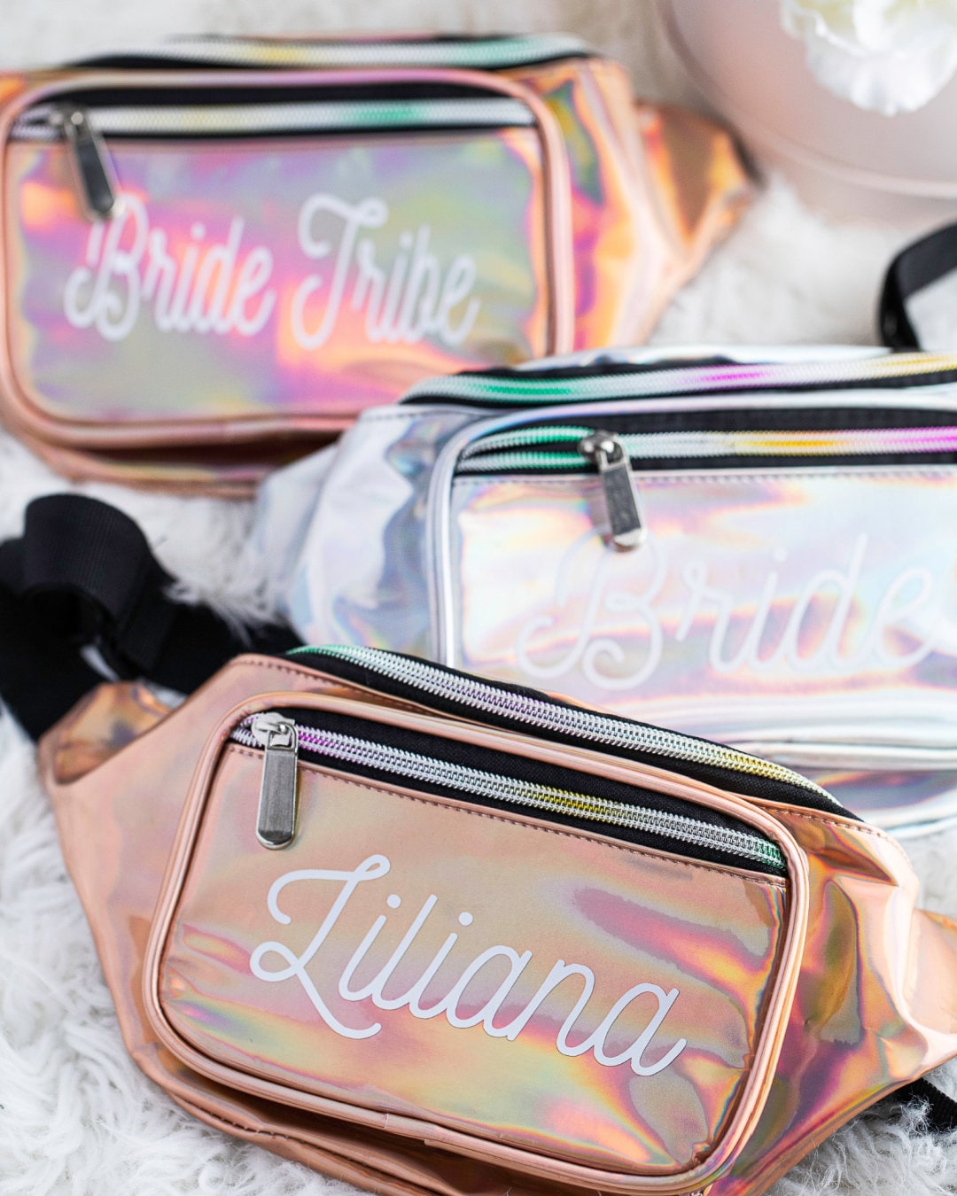 . Perfect for your bridal shower or friends. Each metallic fanny pack comes in the color of your choice, with three pockets with zipper closures, an adjustable strap, and comes personalized with a name bride or bride tribe in white vinyl lettering.