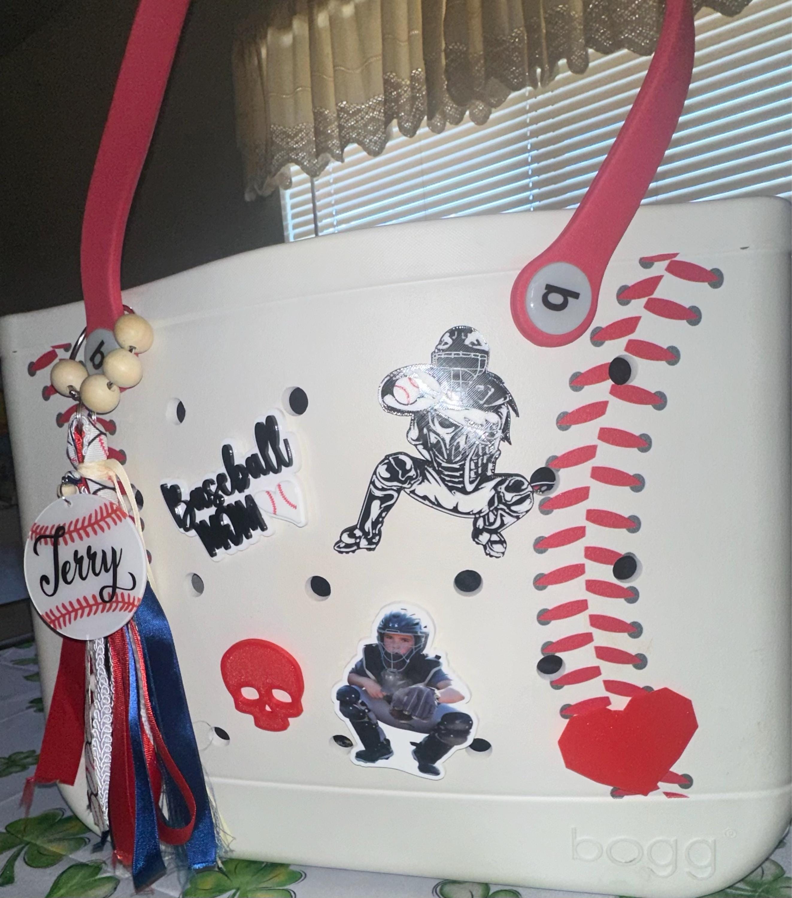 Show your love for the game of baseball and baseball players with this handmade Baseball Bogg Bag accessory featuring an adorable baseball mom design and heart pattern. Perfect for adding some playful flair to any Bogg bag style bag. Hit a home run with this charm!