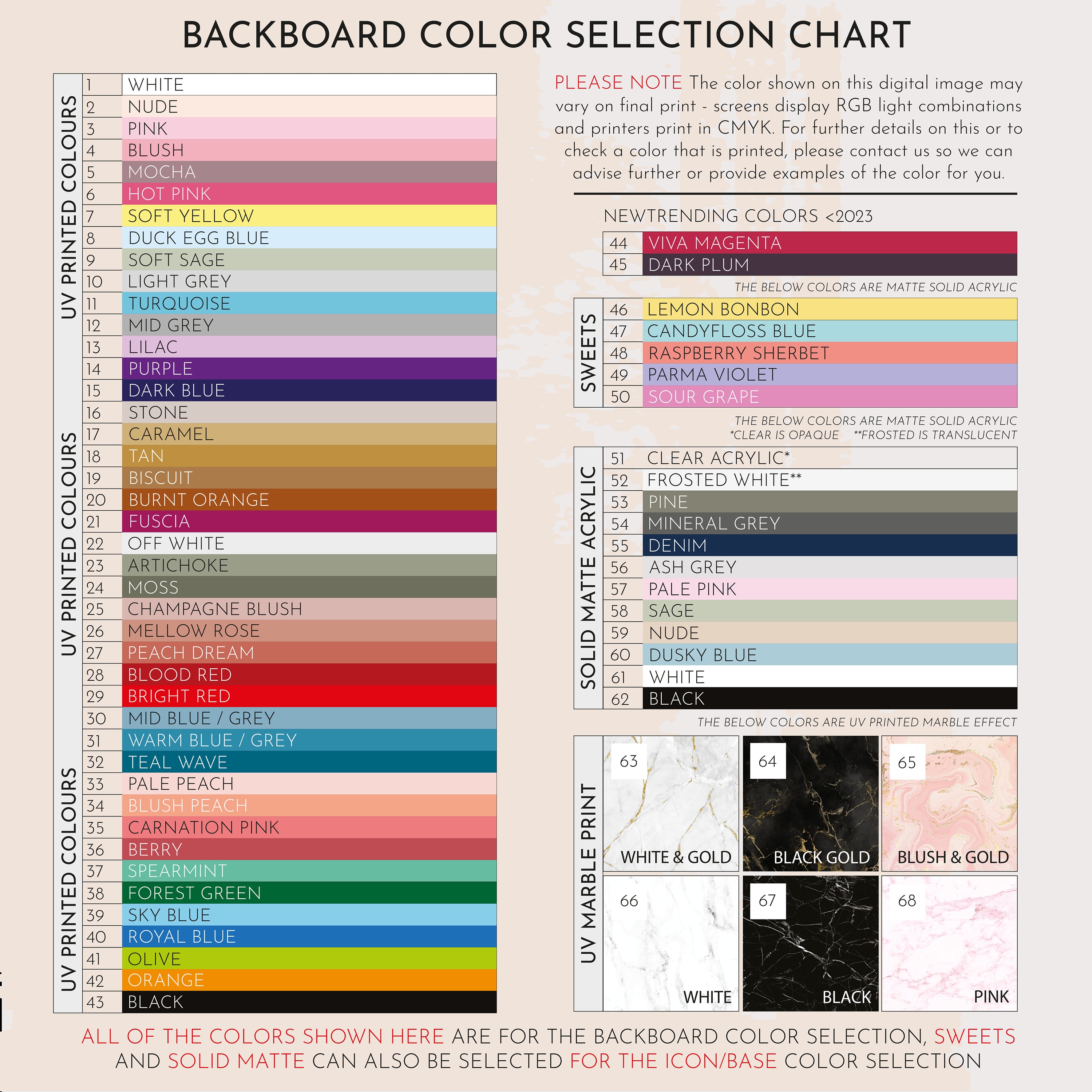 The logos are made from 3mm clear acrylic, cut into a round master shape, and are available in 18 background shades and 12 mirrored acrylic colours to suit any theme. They are printed in Full HD, without the use of vinyl or acrylic paints, for a flawless finish.