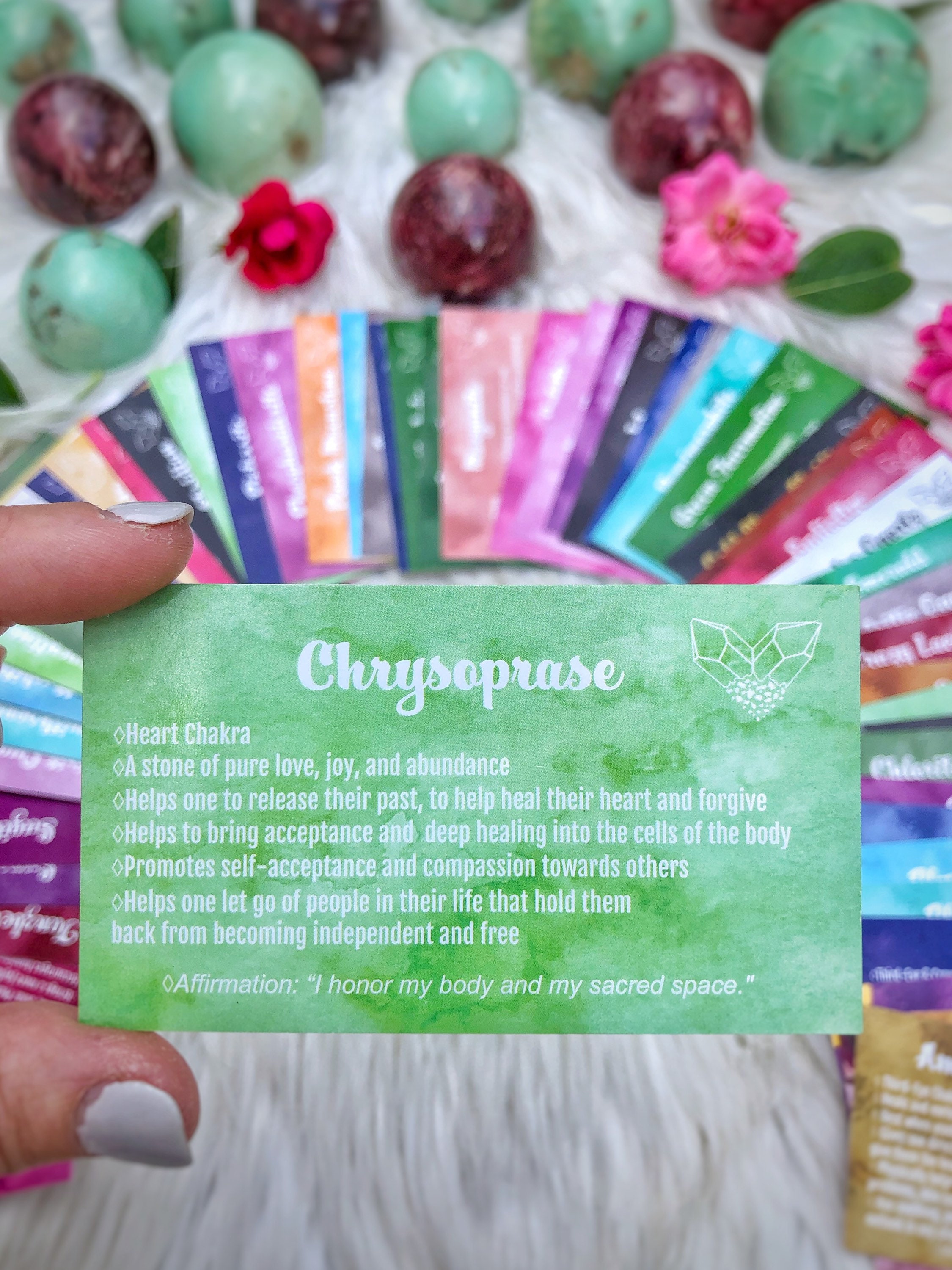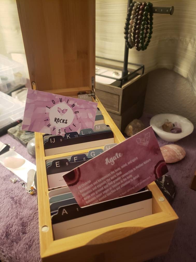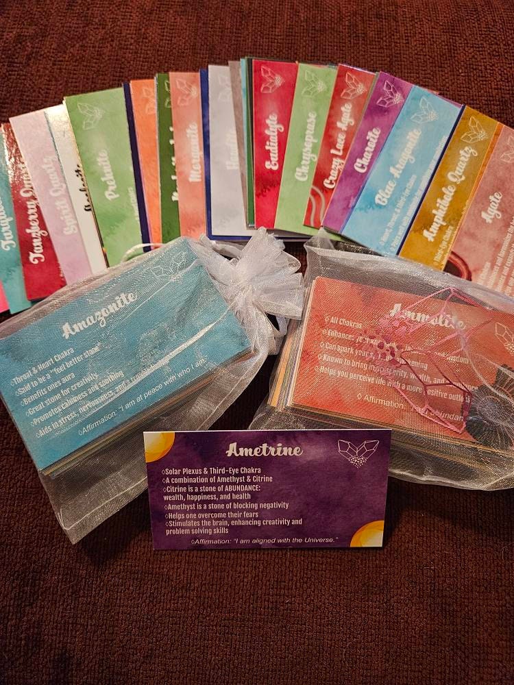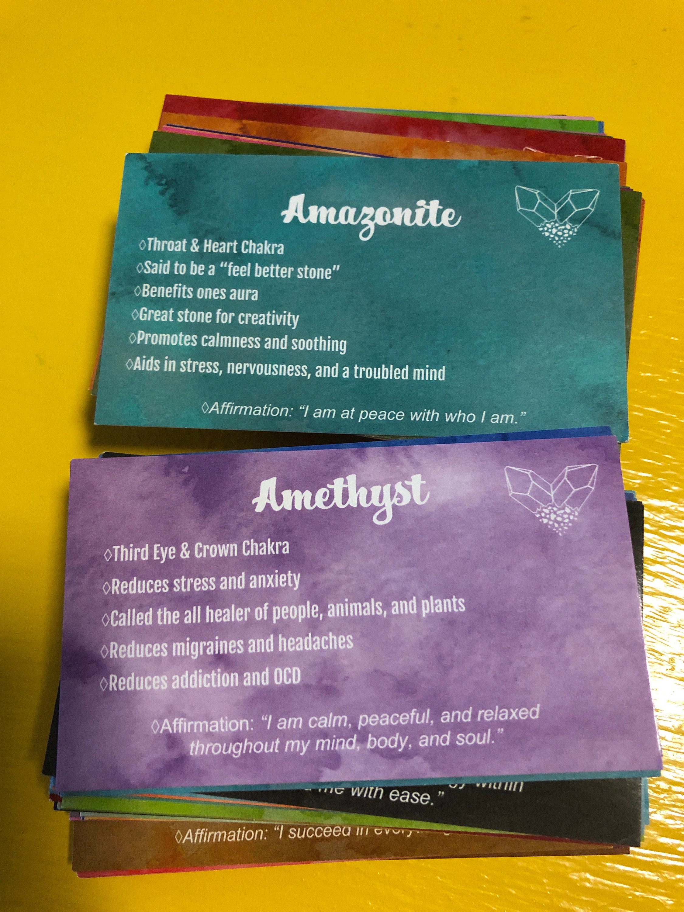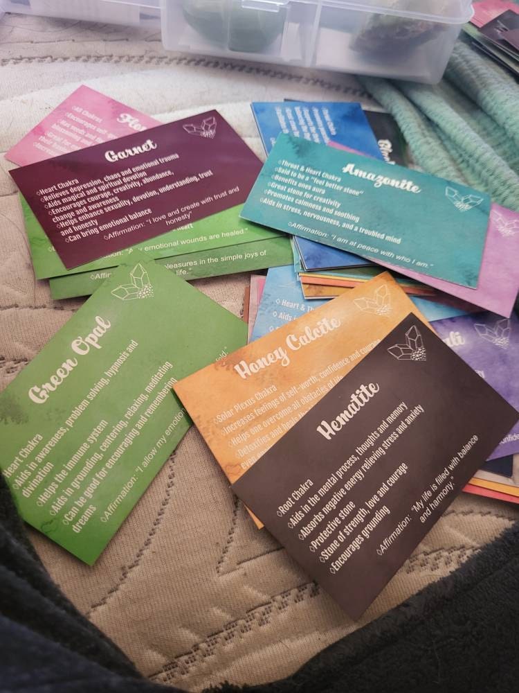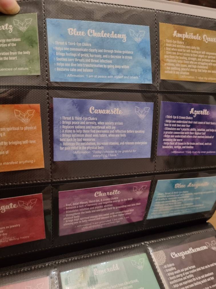 This deck consists of 61 different crystal cards and their meanings! It is designed to be used like a tarot/angel deck, you lay out the cards, close your eyes, ask the universe a question, and then intuitively choose a card from the deck! The card you choose should be the one you will use that day. If you don't have all of the crystals, make a list of the ones you do have and slowly add them to your deck as you get more crystals