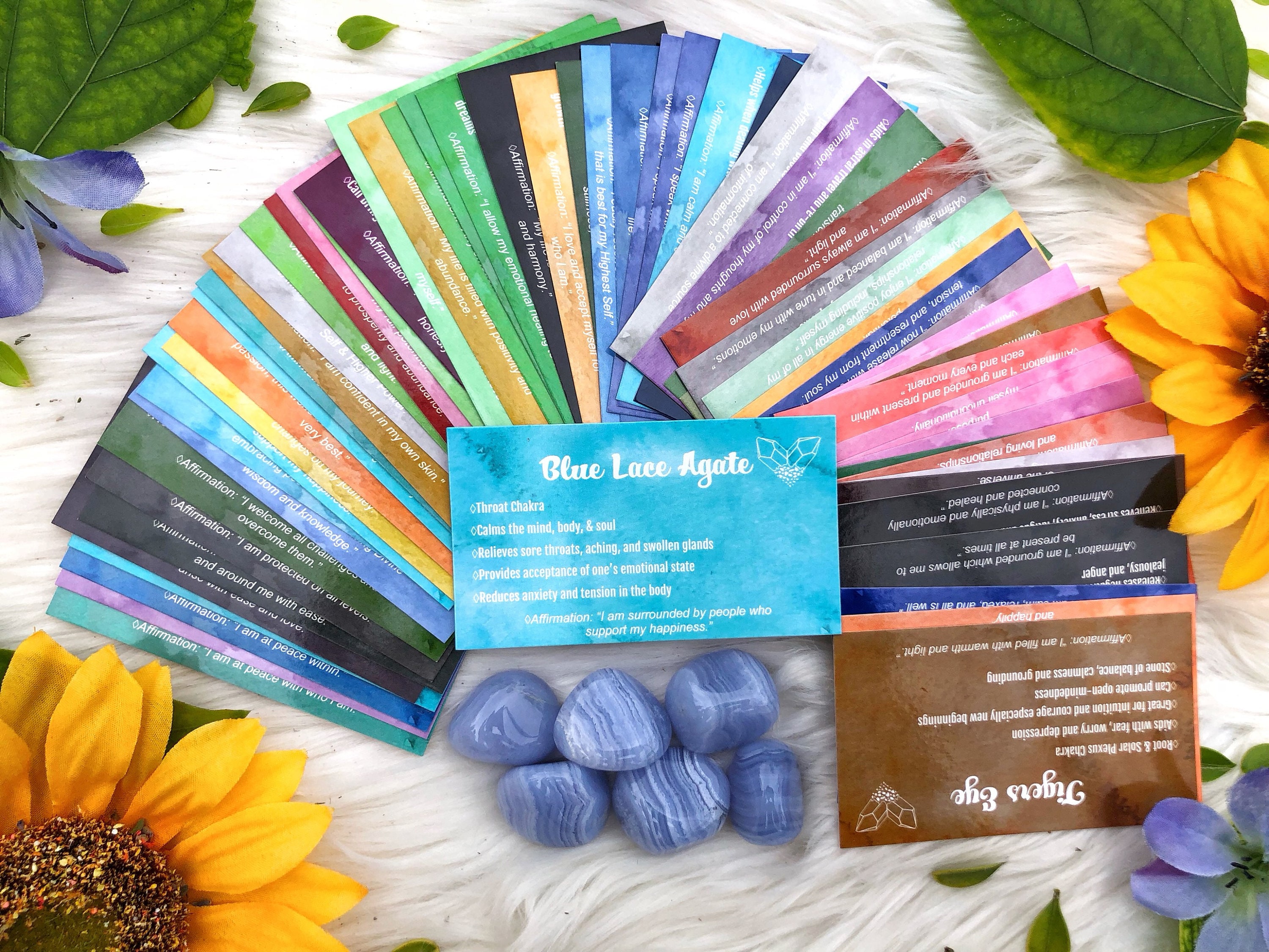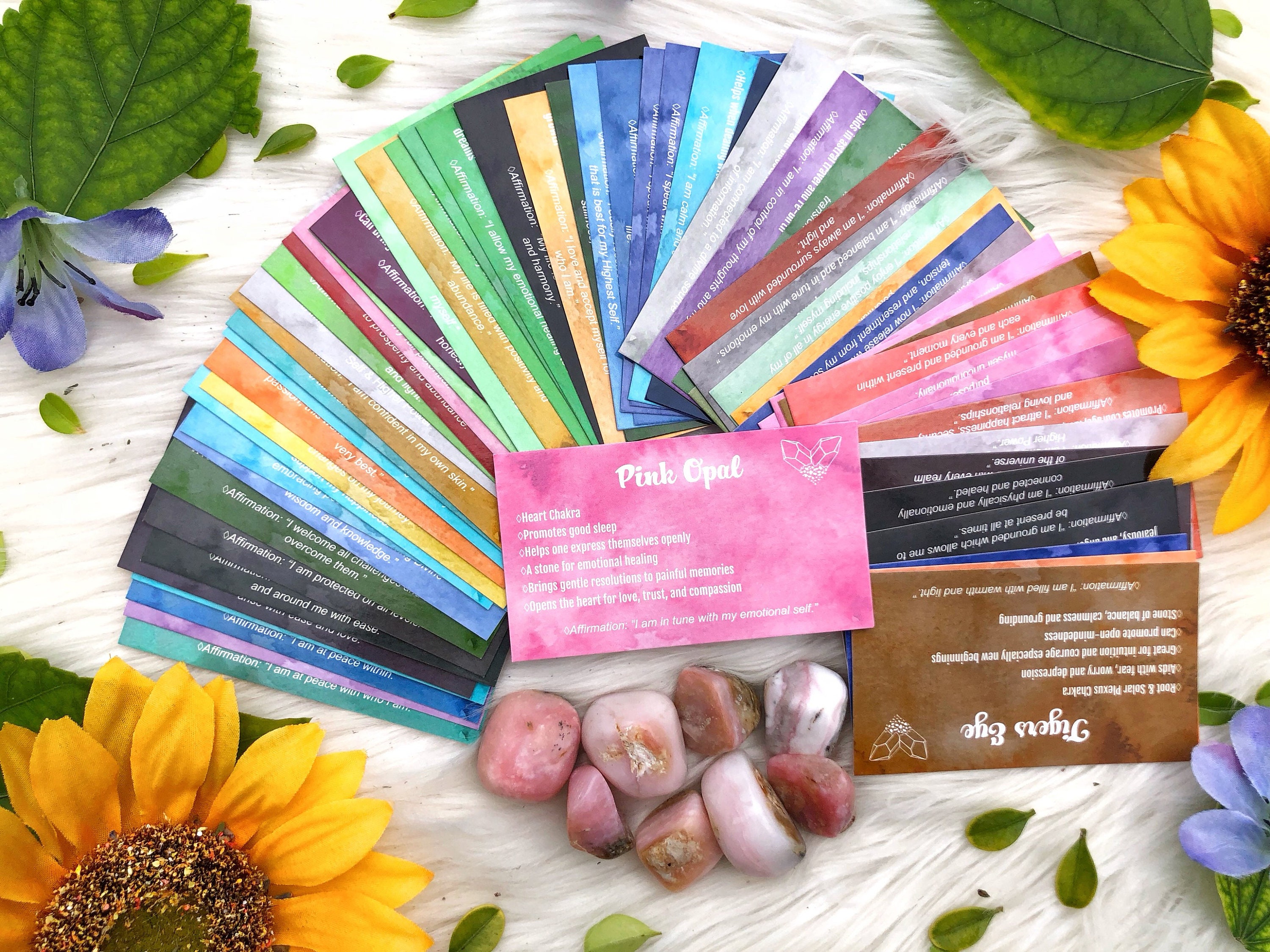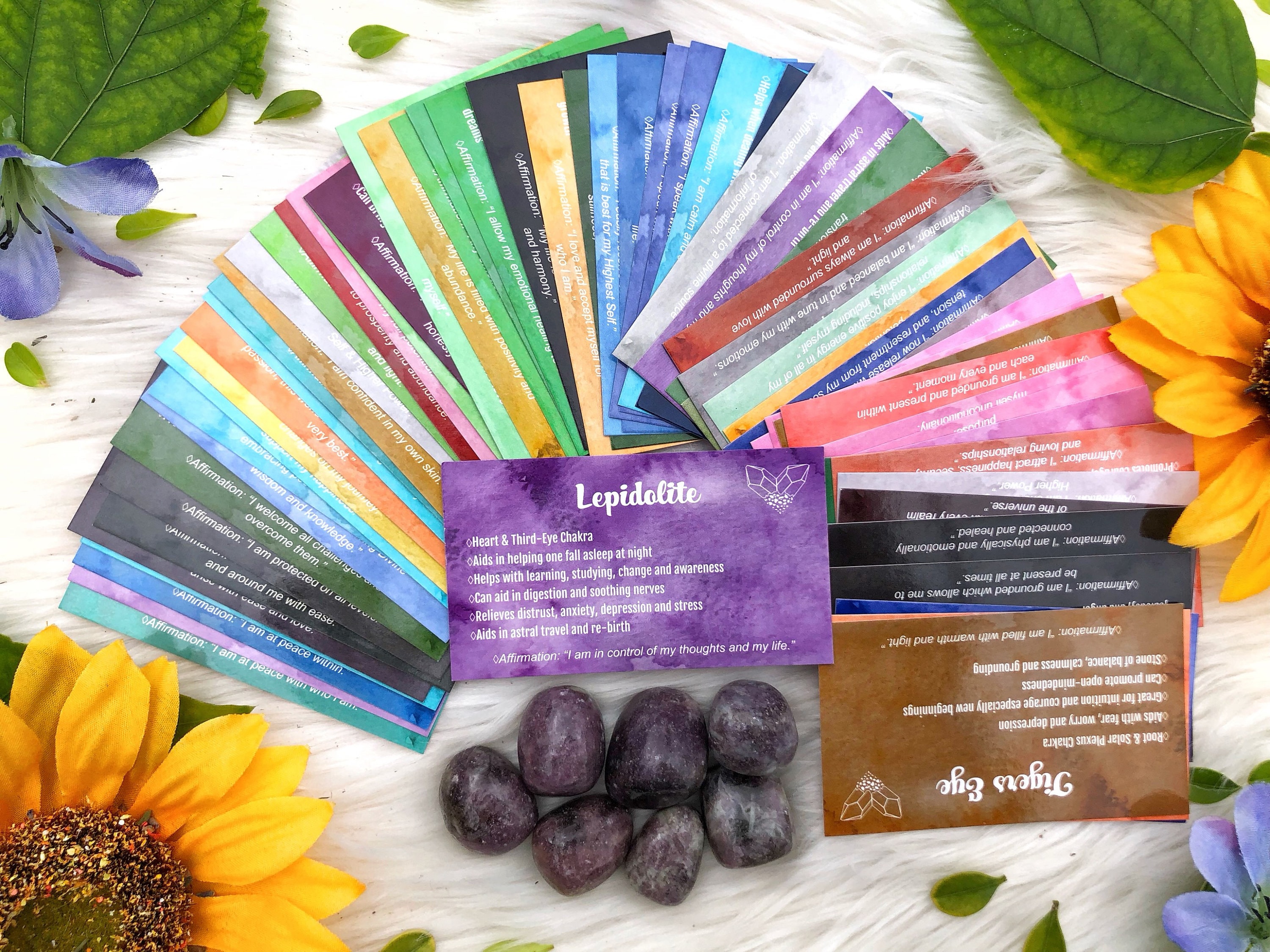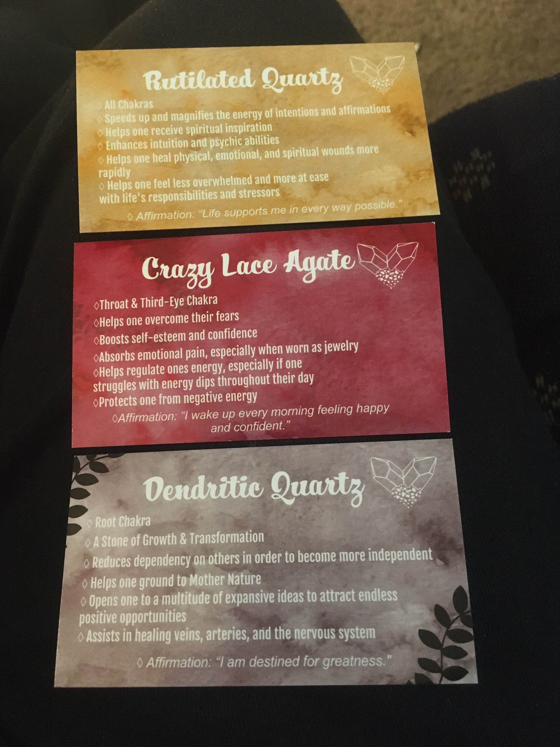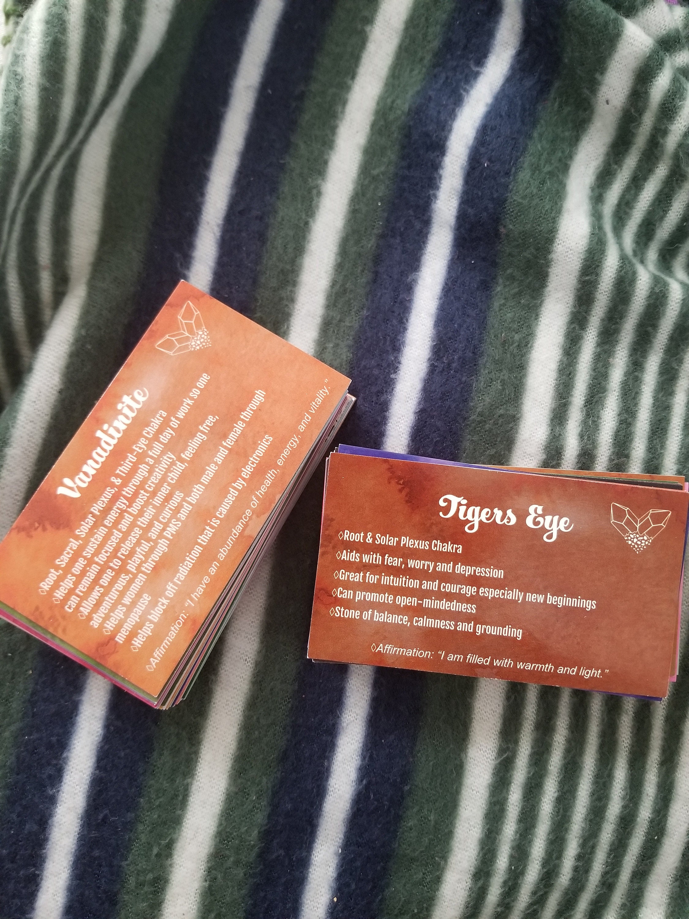 This deck consists of 61 different crystal cards and their meanings! It is designed to be used like a tarot/angel deck, you lay out the cards, close your eyes, ask the universe a question, and then intuitively choose a card from the deck! The card you choose should be the one you will use that day. If you don't have all of the crystals, make a list of the ones you do have and slowly add them to your deck as you get more crystals