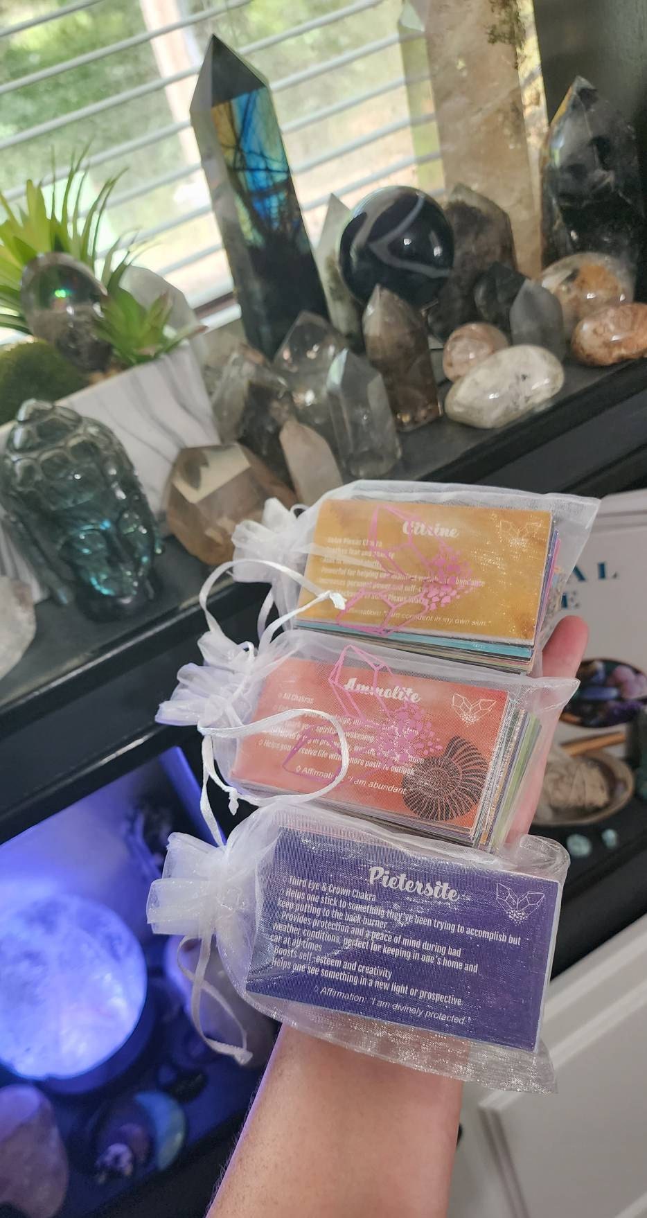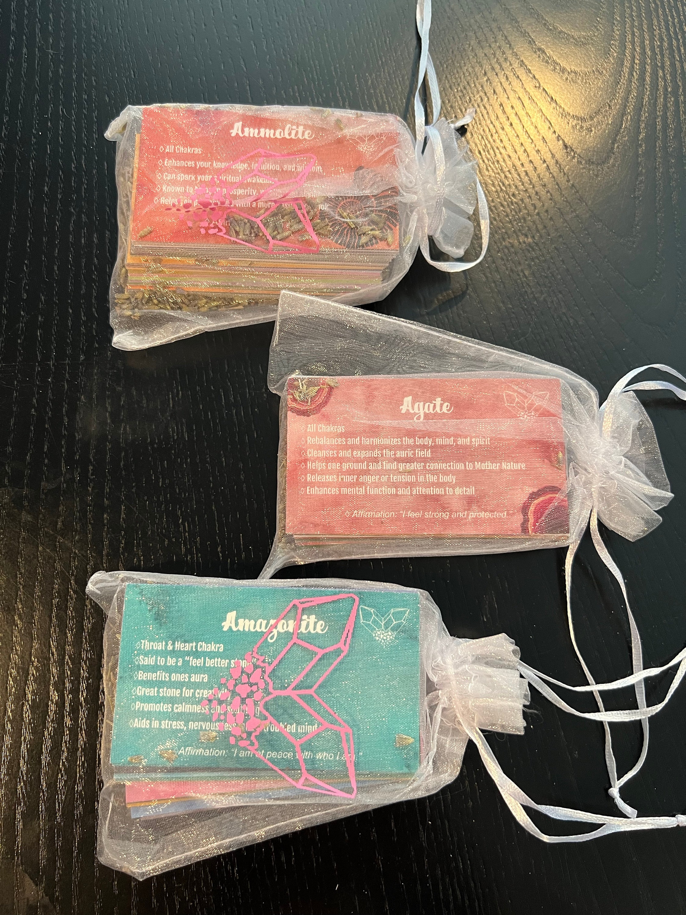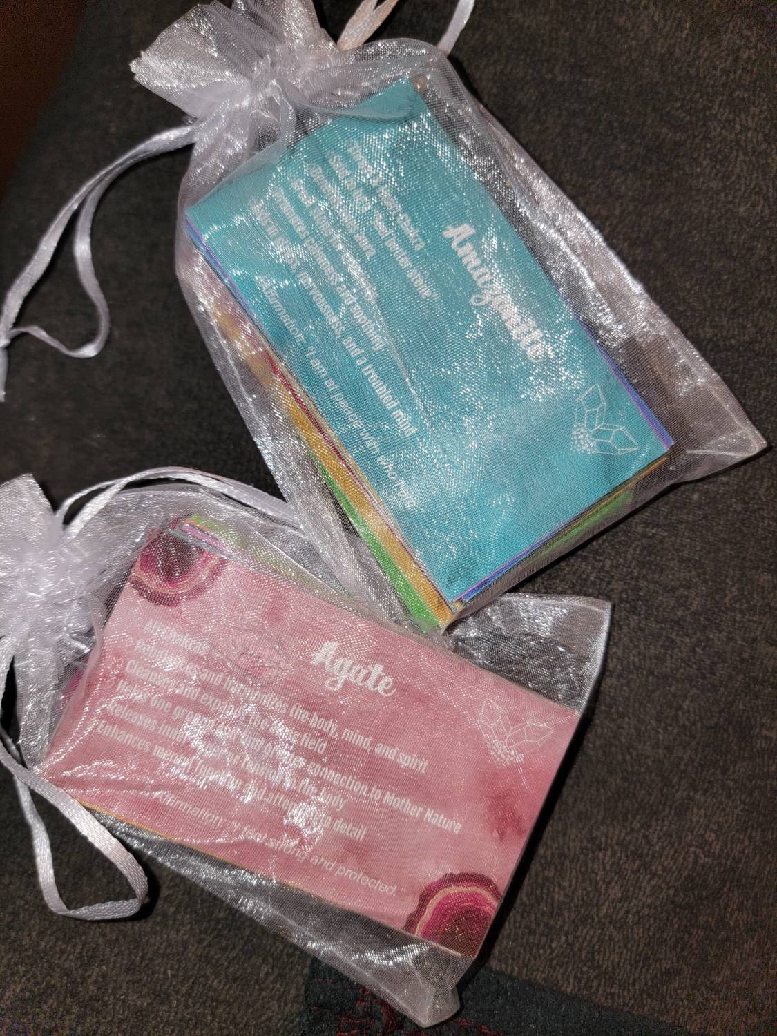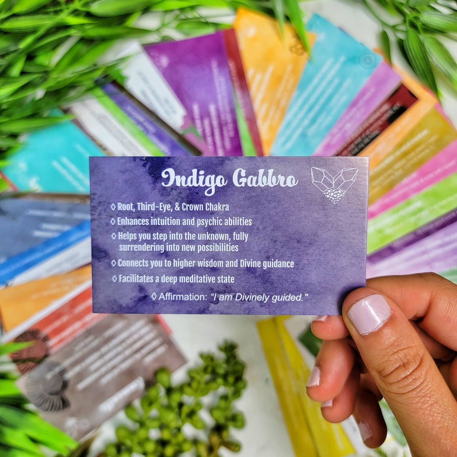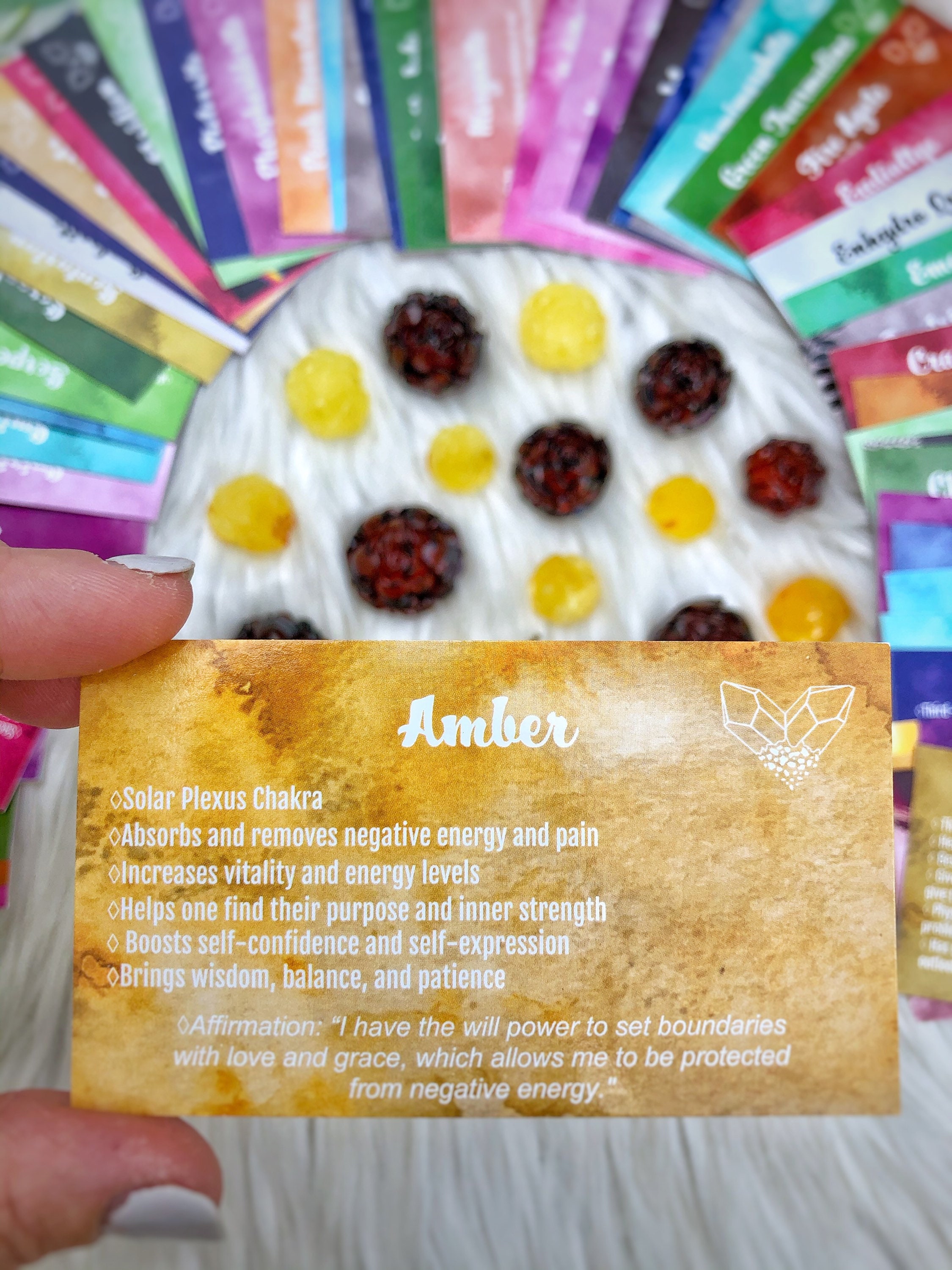 This deck consists of 61 different crystal cards and their meanings! It is designed to be used like a tarot/angel deck, you lay out the cards, close your eyes, ask the universe a question, and then intuitively choose a card from the deck! The card you choose should be the one you will use that day. If you don't have all of the crystals, make a list of the ones you do have and slowly add them to your deck as you get more crystals