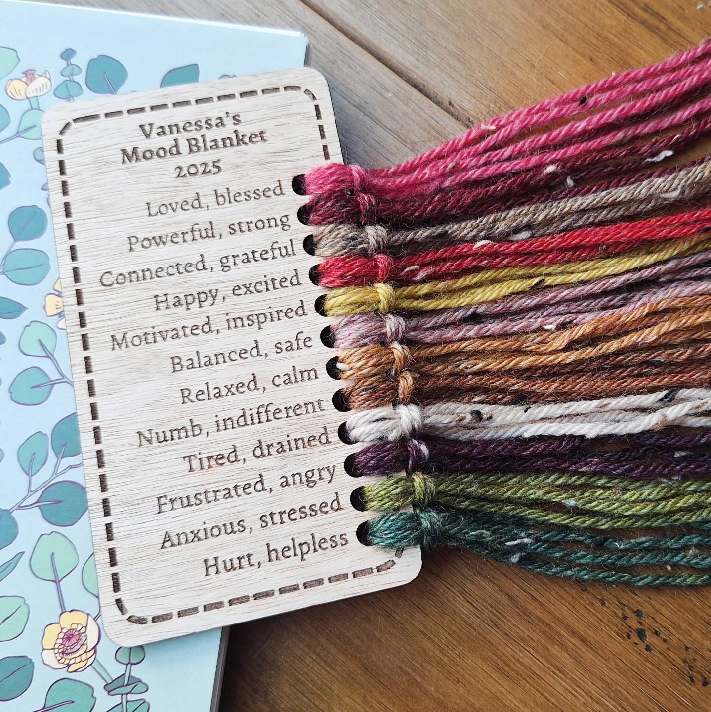 Simply thread the yarn through the holes and write the colour name next to it if you wish. Use an erasable pen or pencil if you would like the card to be reusable. There is space on the back for other important project details.