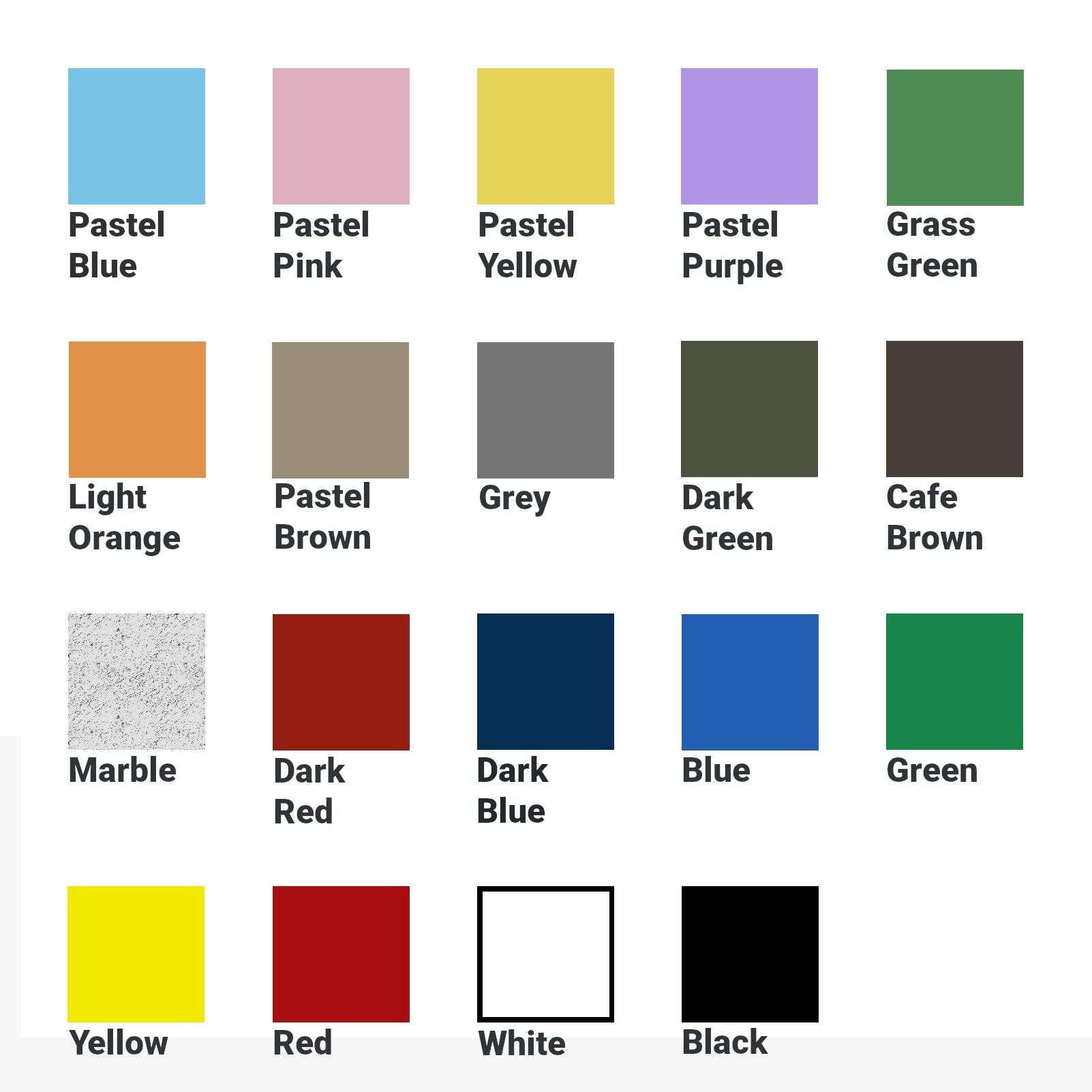 Available in a range of colours. See the image of the palette for available colours and their names.