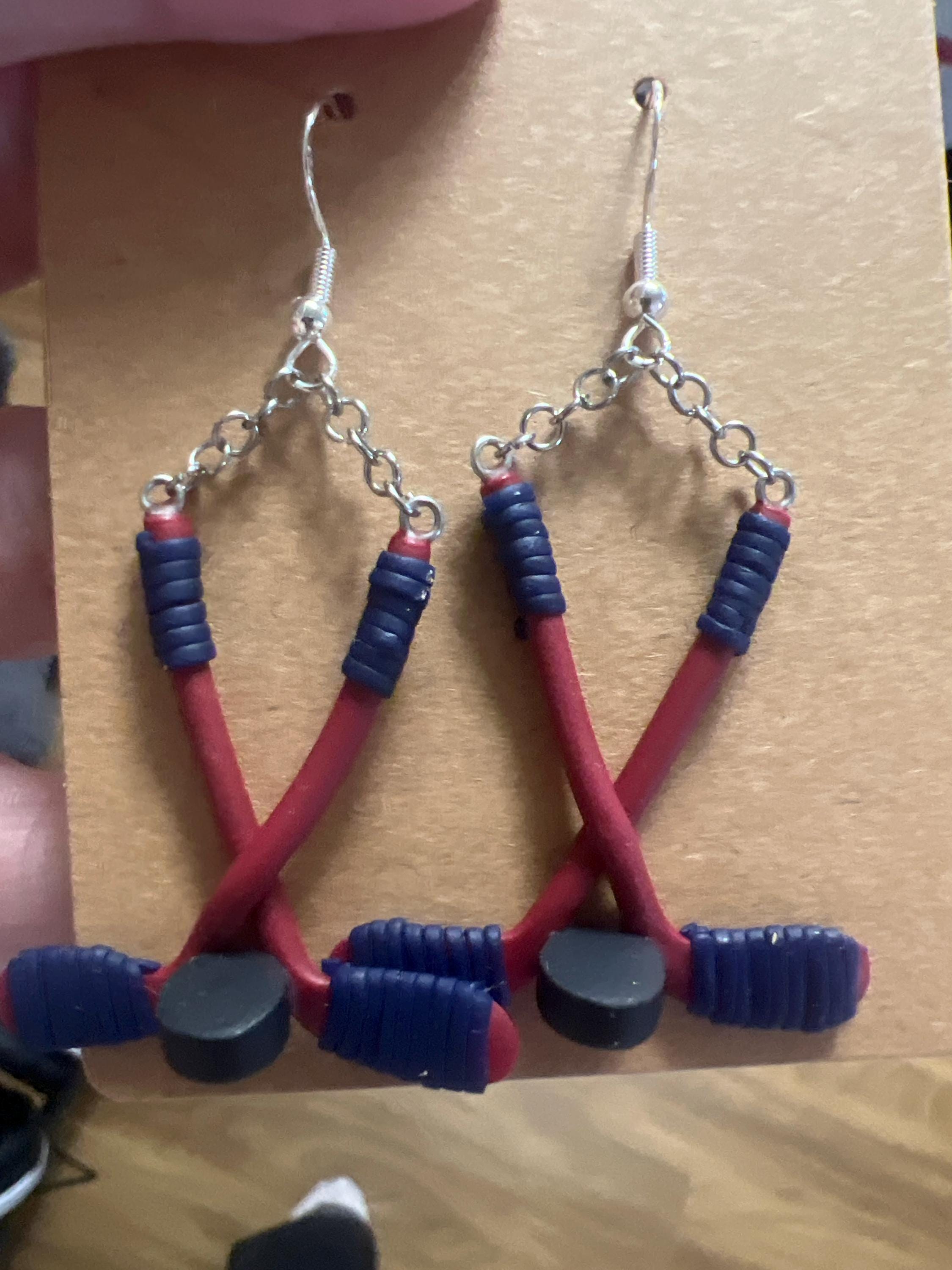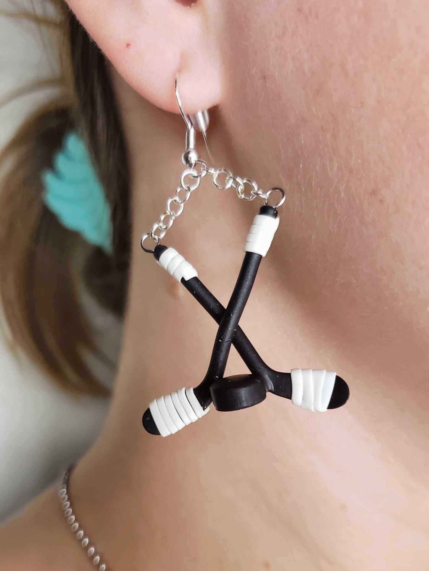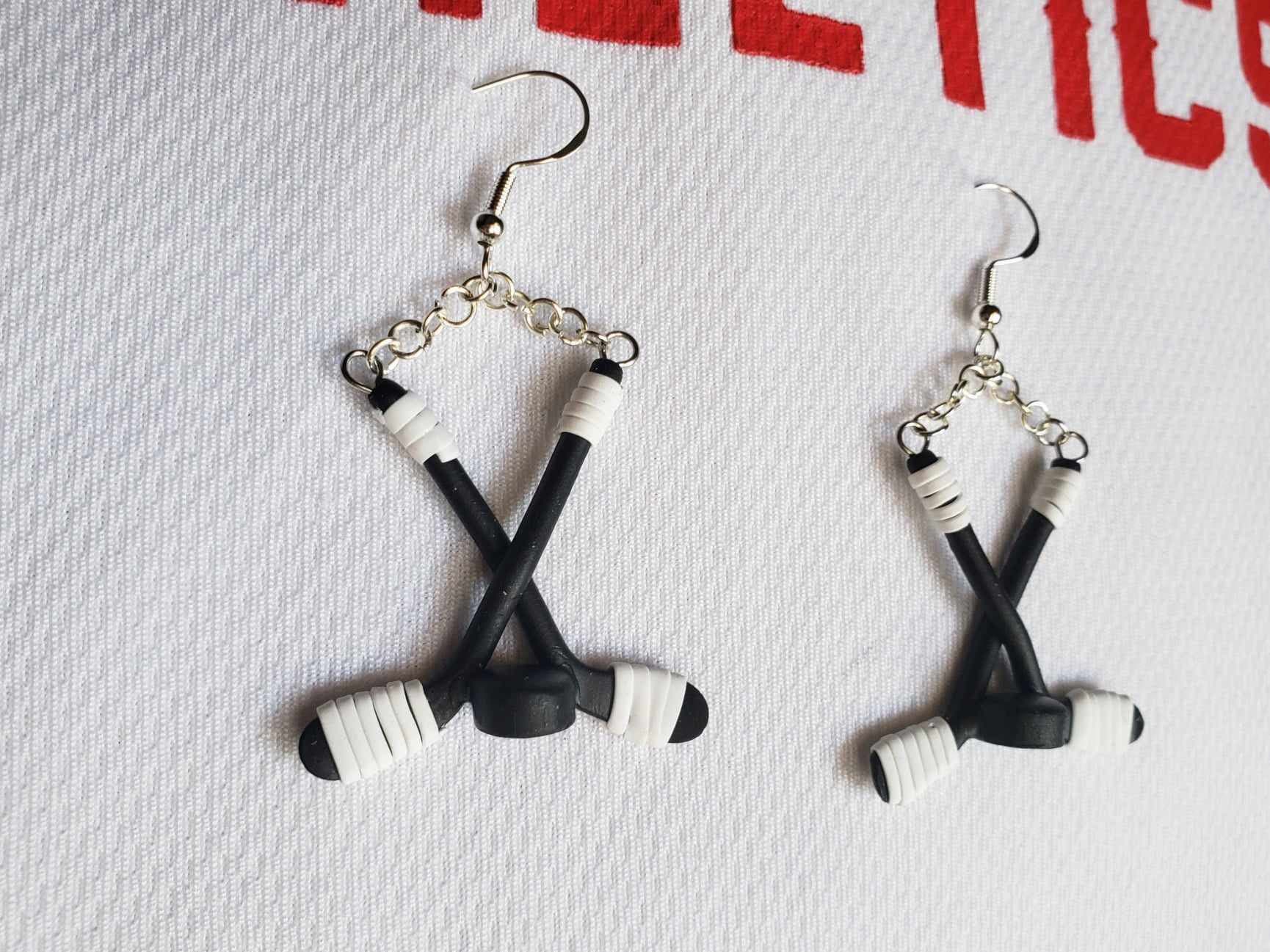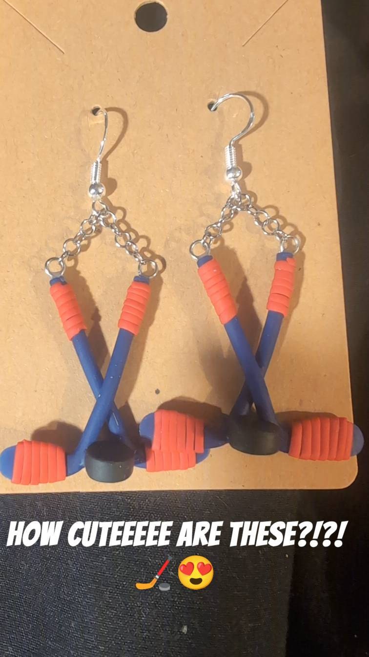 Whether you're cheering from the rink or from your couch, these earrings are the perfect accessory to show off your hockey pride! Each earring is hand-sculpted entirely from jewelry-grade polymer clay. Just choose a primary color for the sticks and a secondary color for the tape. Don't see the colors you need? Send me a message and I'll see what I can mix up! Feel free to also message me a photo or leave me a link to a team website in the personalization box so I can see the exact shades you're looking for. These earrings measure about two and a quarter inches from the top of the hook to the bottom of the sticks and weigh 0.05 ounces each, so you might not even feel them in your ears! Hooks are made of hypoallergenic sterling silver with silicone backs.