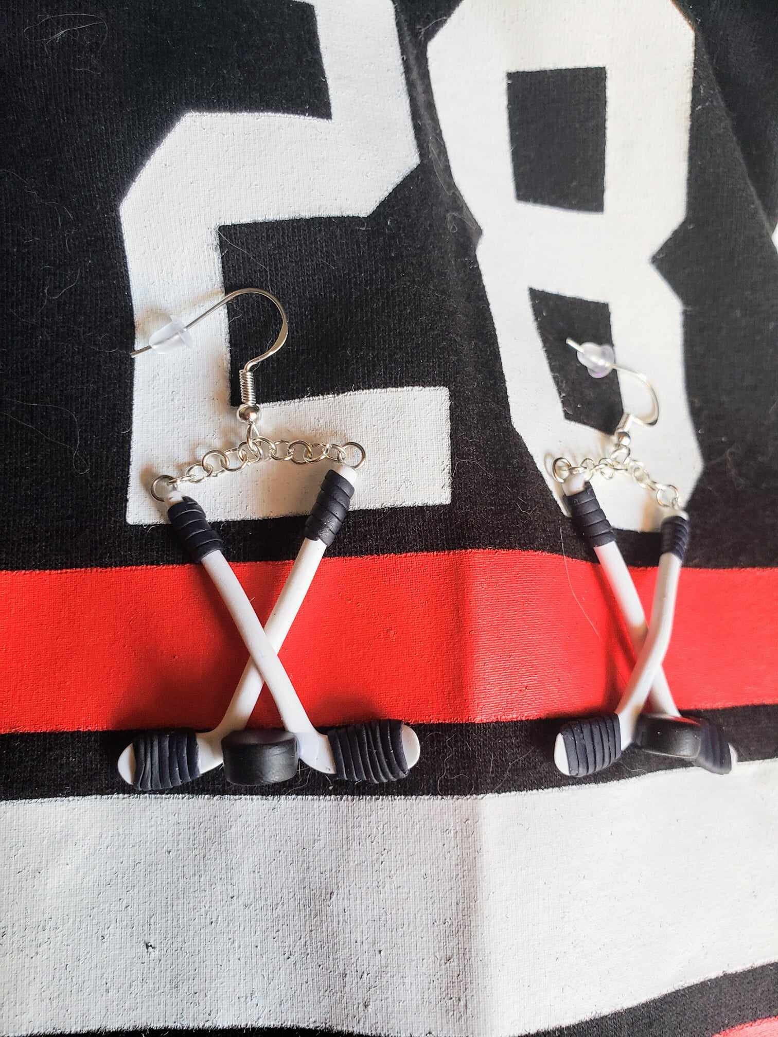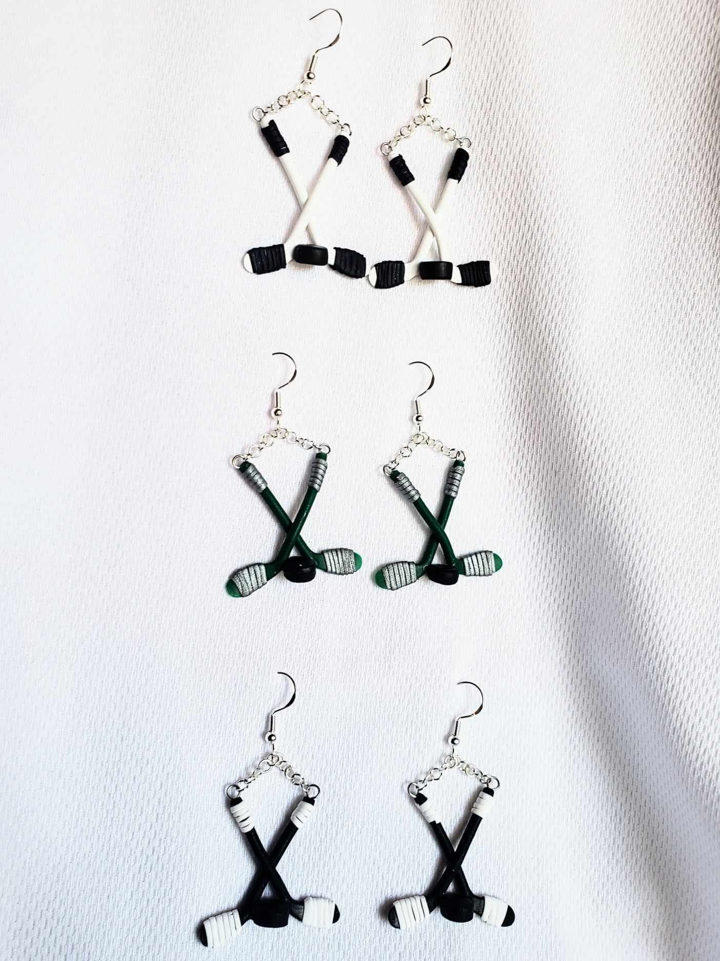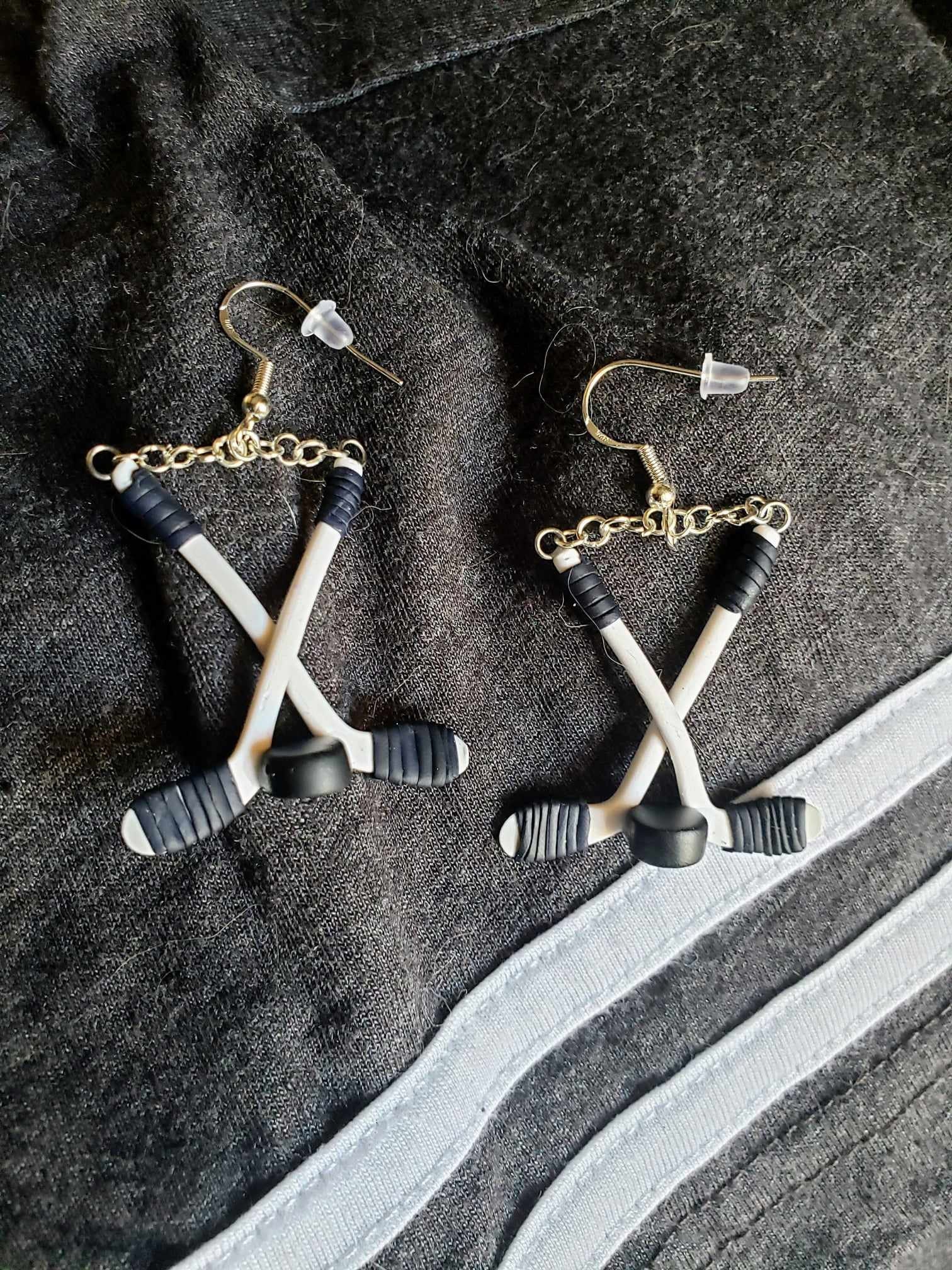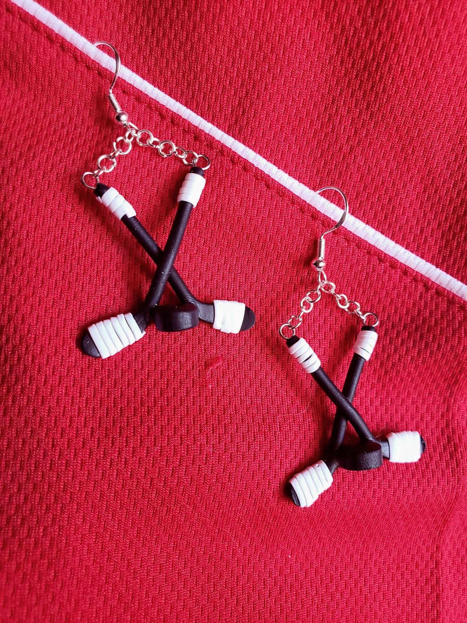 Whether you're cheering from the rink or from your couch, these earrings are the perfect accessory to show off your hockey pride! Each earring is hand-sculpted entirely from jewelry-grade polymer clay. Just choose a primary color for the sticks and a secondary color for the tape. Don't see the colors you need? Send me a message and I'll see what I can mix up! Feel free to also message me a photo or leave me a link to a team website in the personalization box so I can see the exact shades you're looking for. These earrings measure about two and a quarter inches from the top of the hook to the bottom of the sticks and weigh 0.05 ounces each, so you might not even feel them in your ears! Hooks are made of hypoallergenic sterling silver with silicone backs.