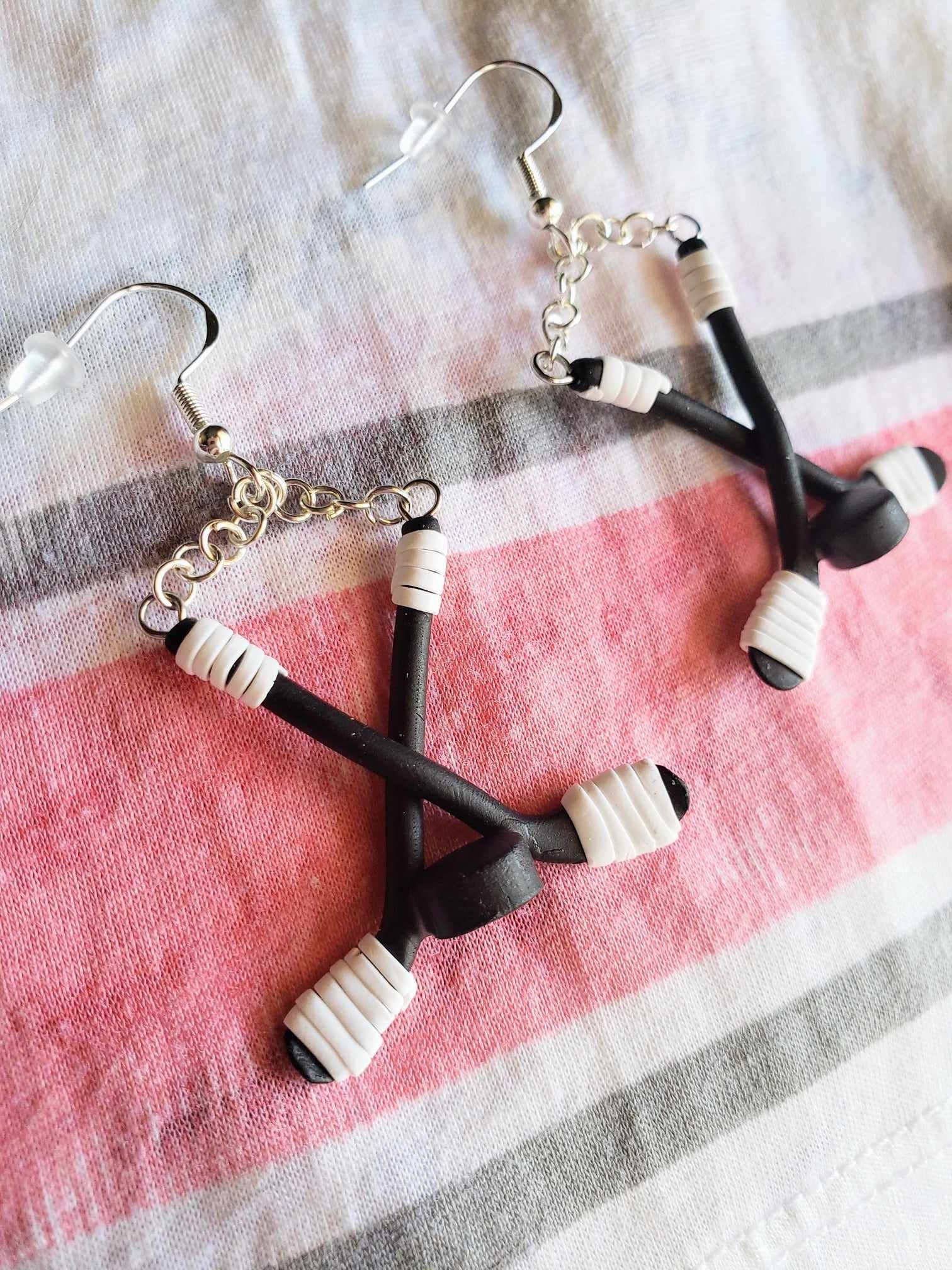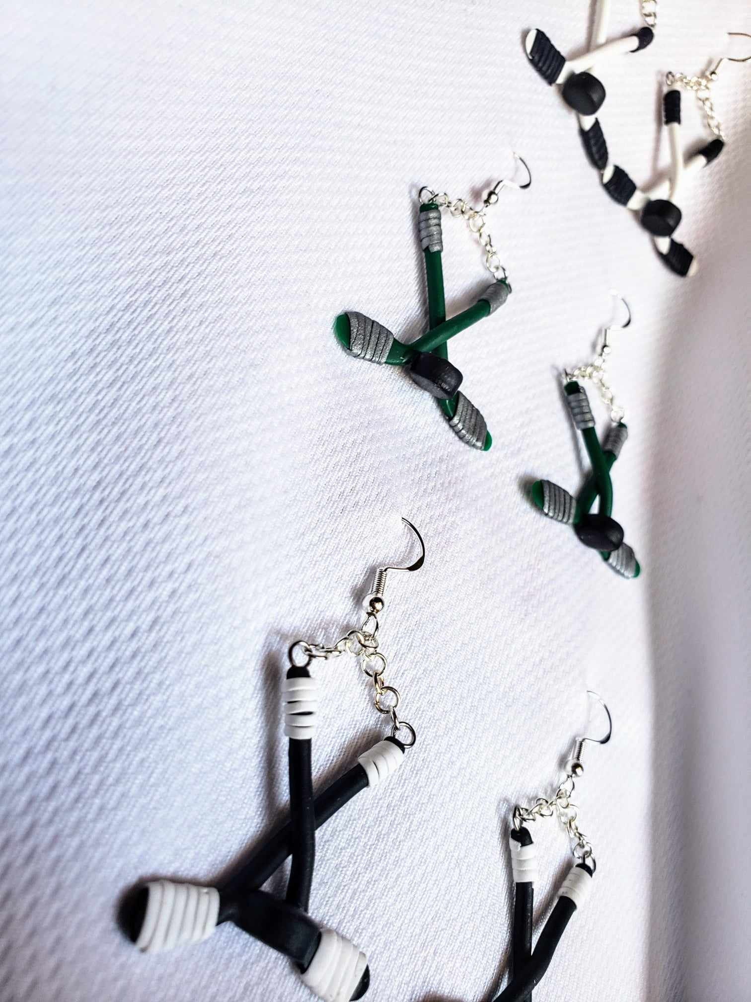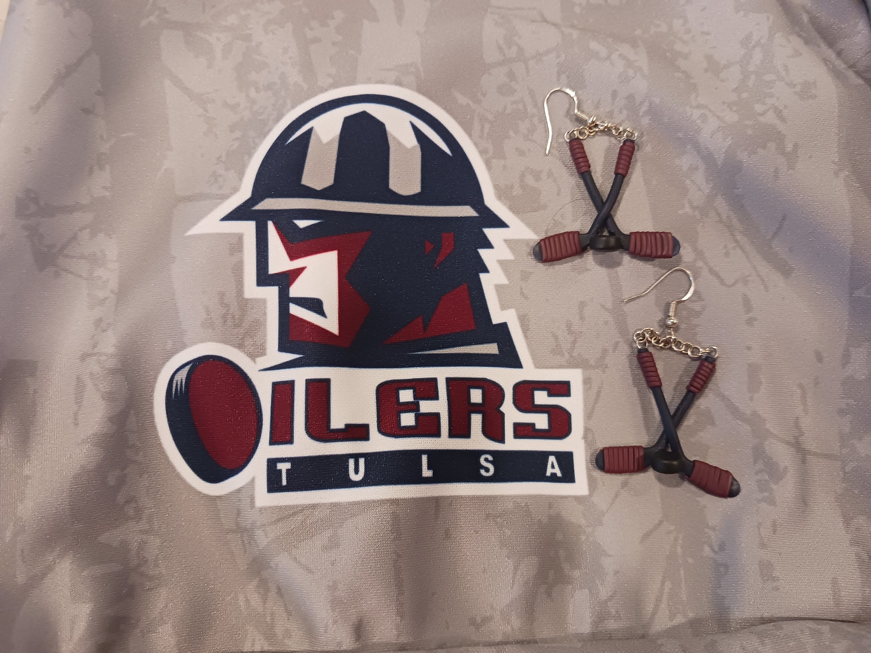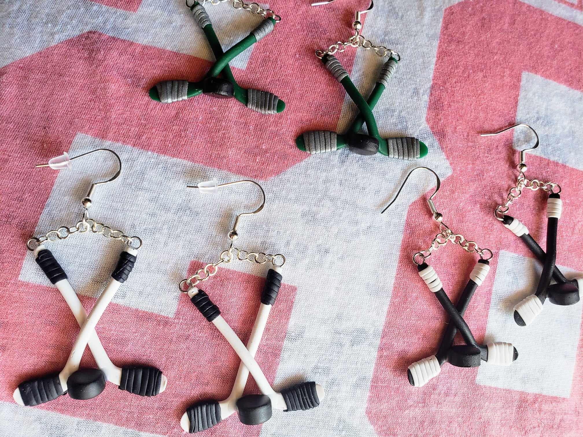 Whether you're cheering from the rink or from your couch, these earrings are the perfect accessory to show off your hockey pride! Each earring is hand-sculpted entirely from jewelry-grade polymer clay. Just choose a primary color for the sticks and a secondary color for the tape. Don't see the colors you need? Send me a message and I'll see what I can mix up! Feel free to also message me a photo or leave me a link to a team website in the personalization box so I can see the exact shades you're looking for. These earrings measure about two and a quarter inches from the top of the hook to the bottom of the sticks and weigh 0.05 ounces each, so you might not even feel them in your ears! Hooks are made of hypoallergenic sterling silver with silicone backs.