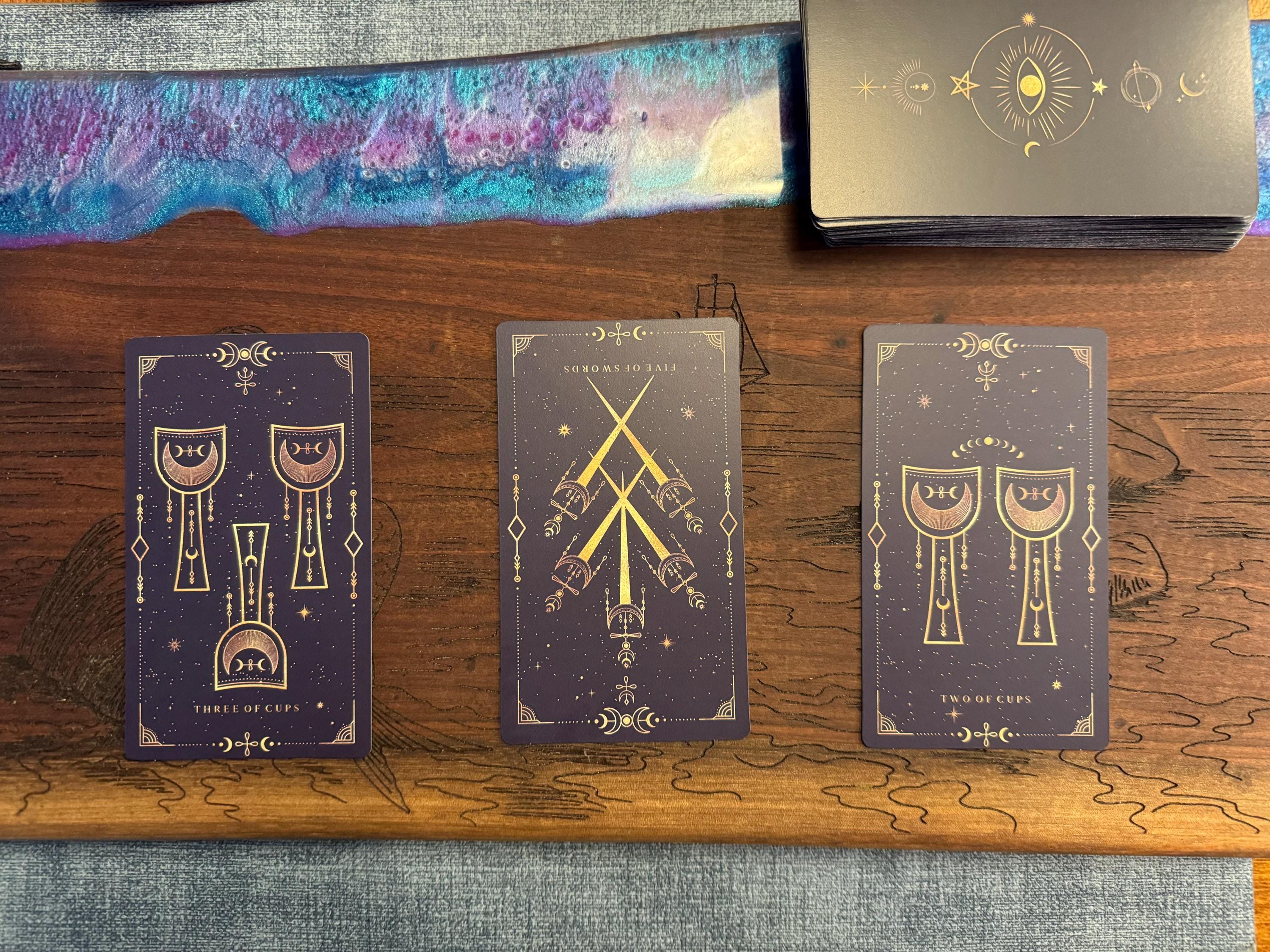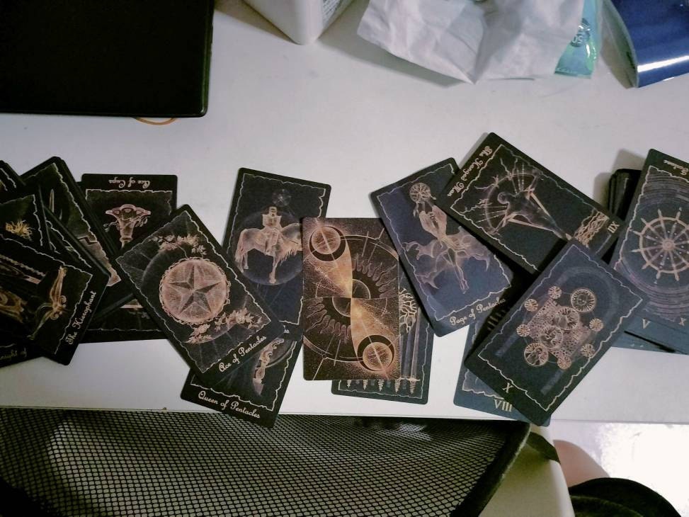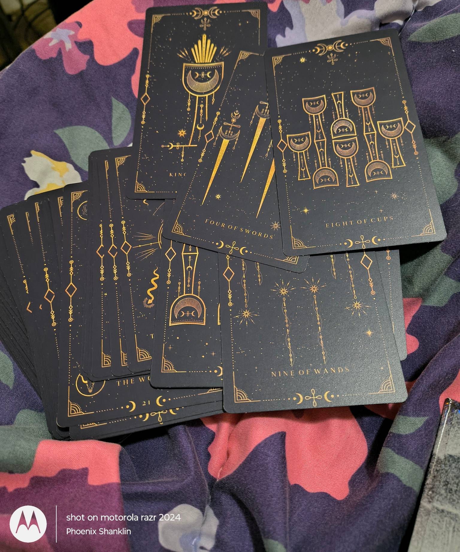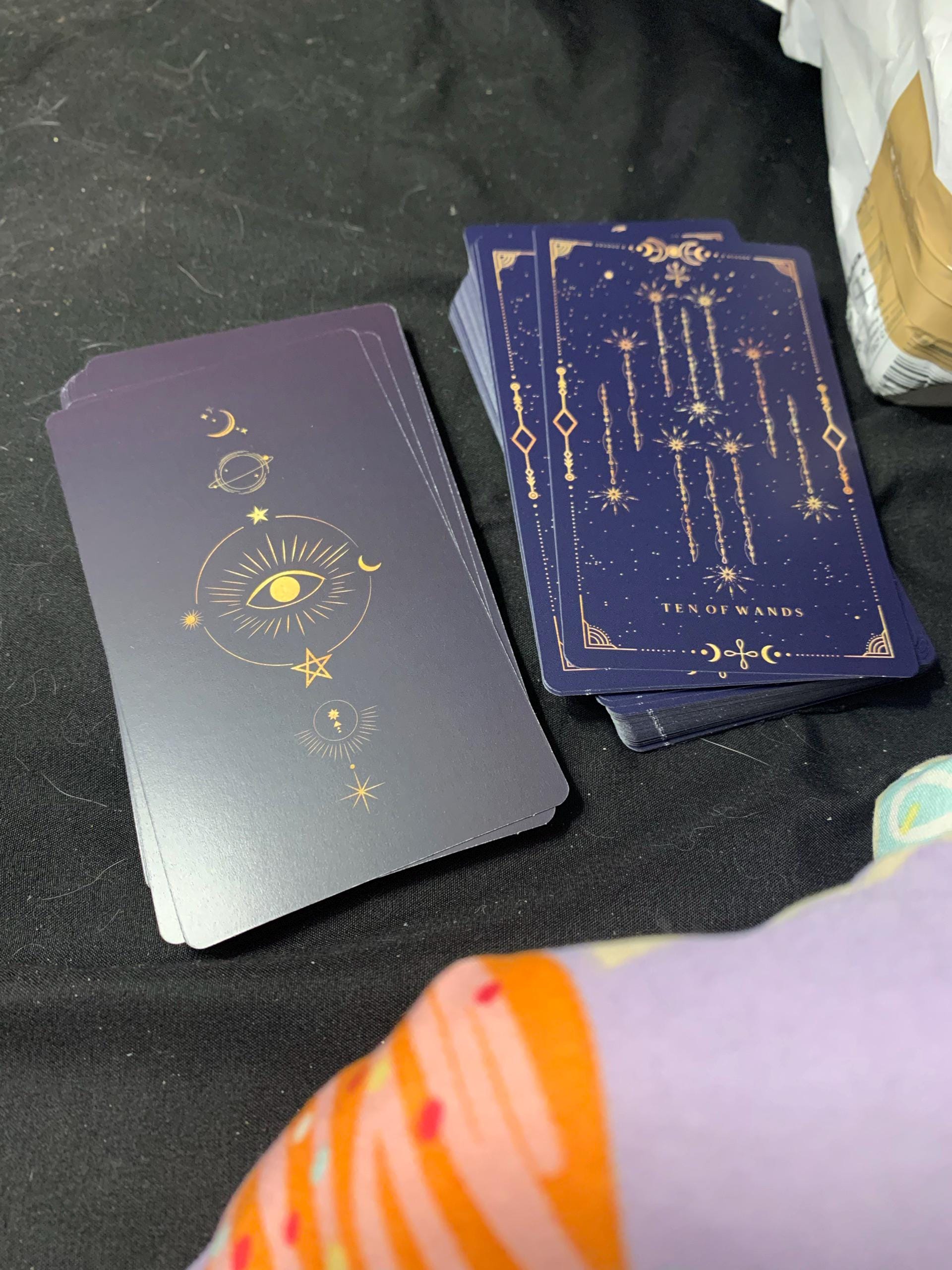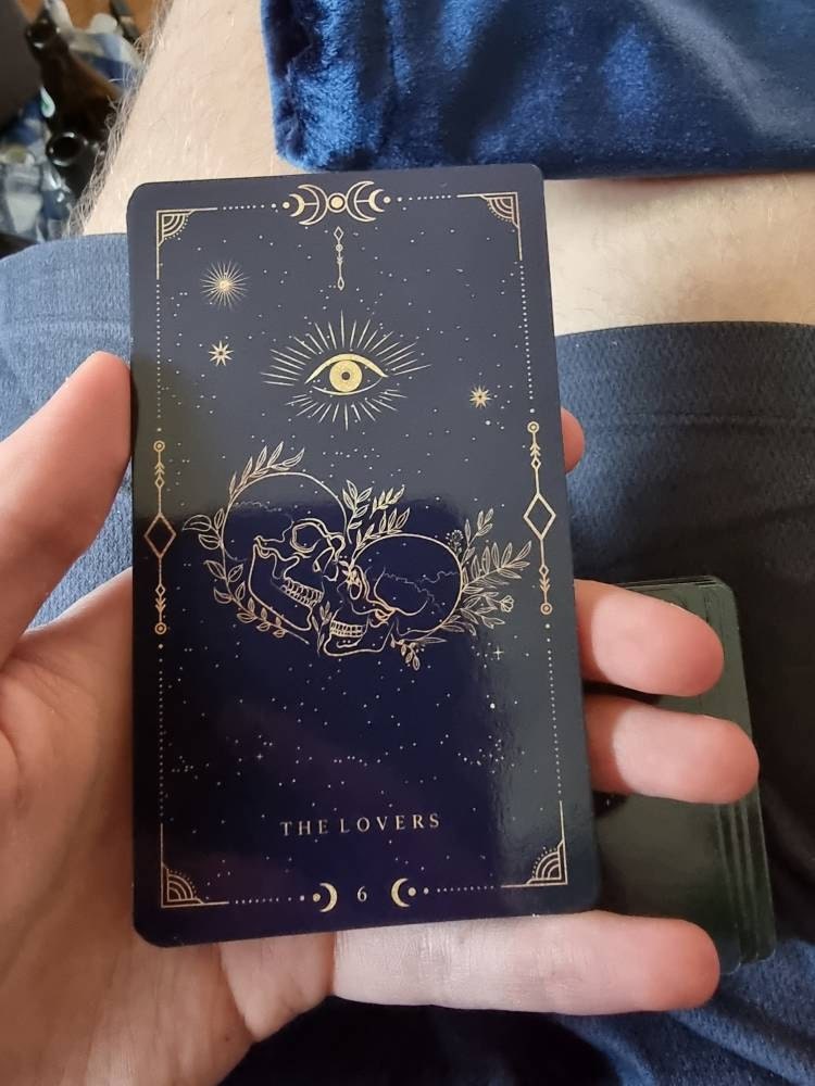 Our cards are digitally printed with unique colors, which makes each card look a little different depending on the light they get. The base color of this deck is dark purple, but it comes in two tones - light and dark. In certain pictures, darker places, etc., the cards may look very dark blue, dark purple, or even black. We chose to make our cards two tones based on our astrological advice and experience with colors and to be different from other decks because it makes our cards look more magical and closer to the universe.