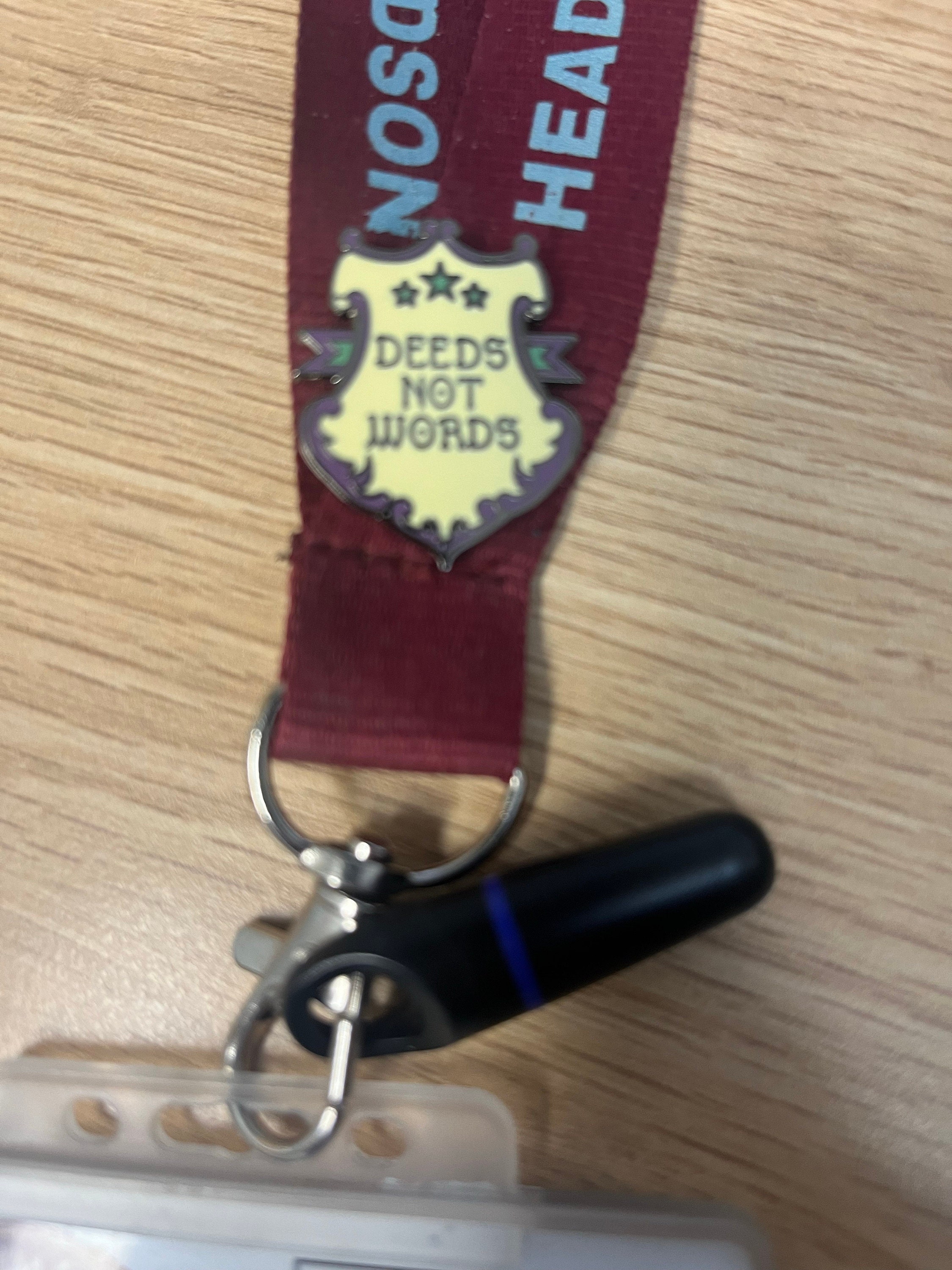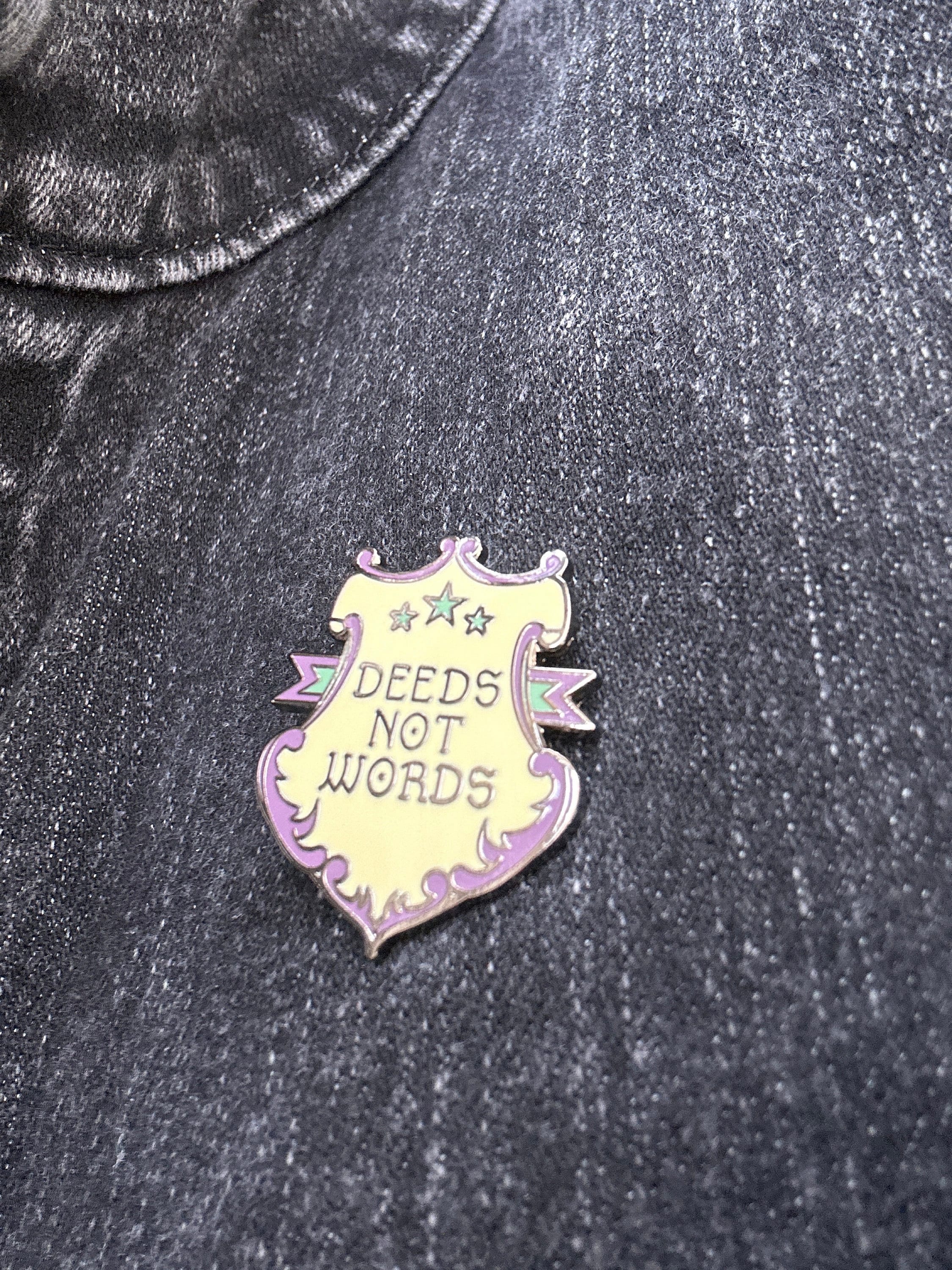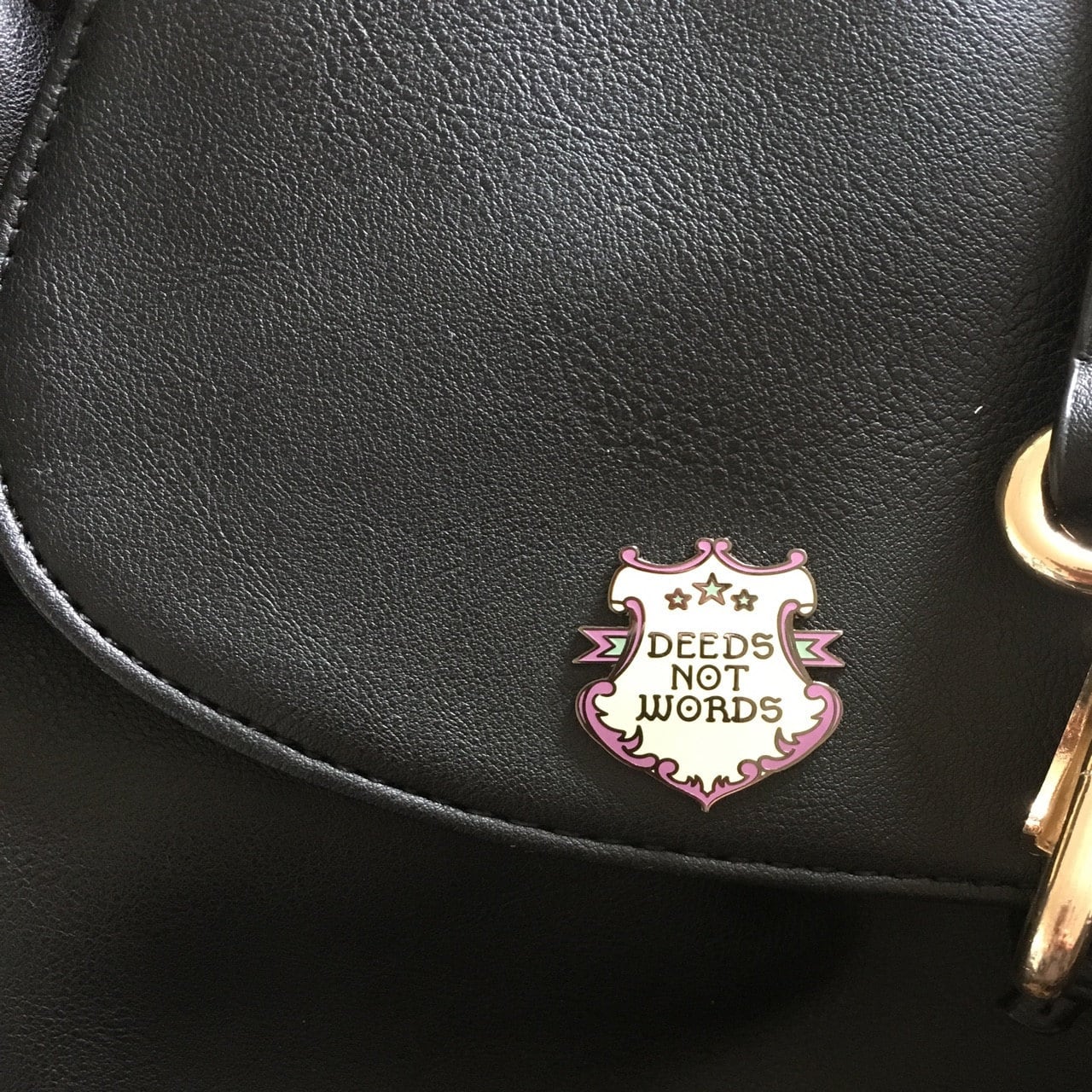 A 'Deeds Not Words' pin in green and purple hard enamel - the official colours of the Women's Suffrage Movement.