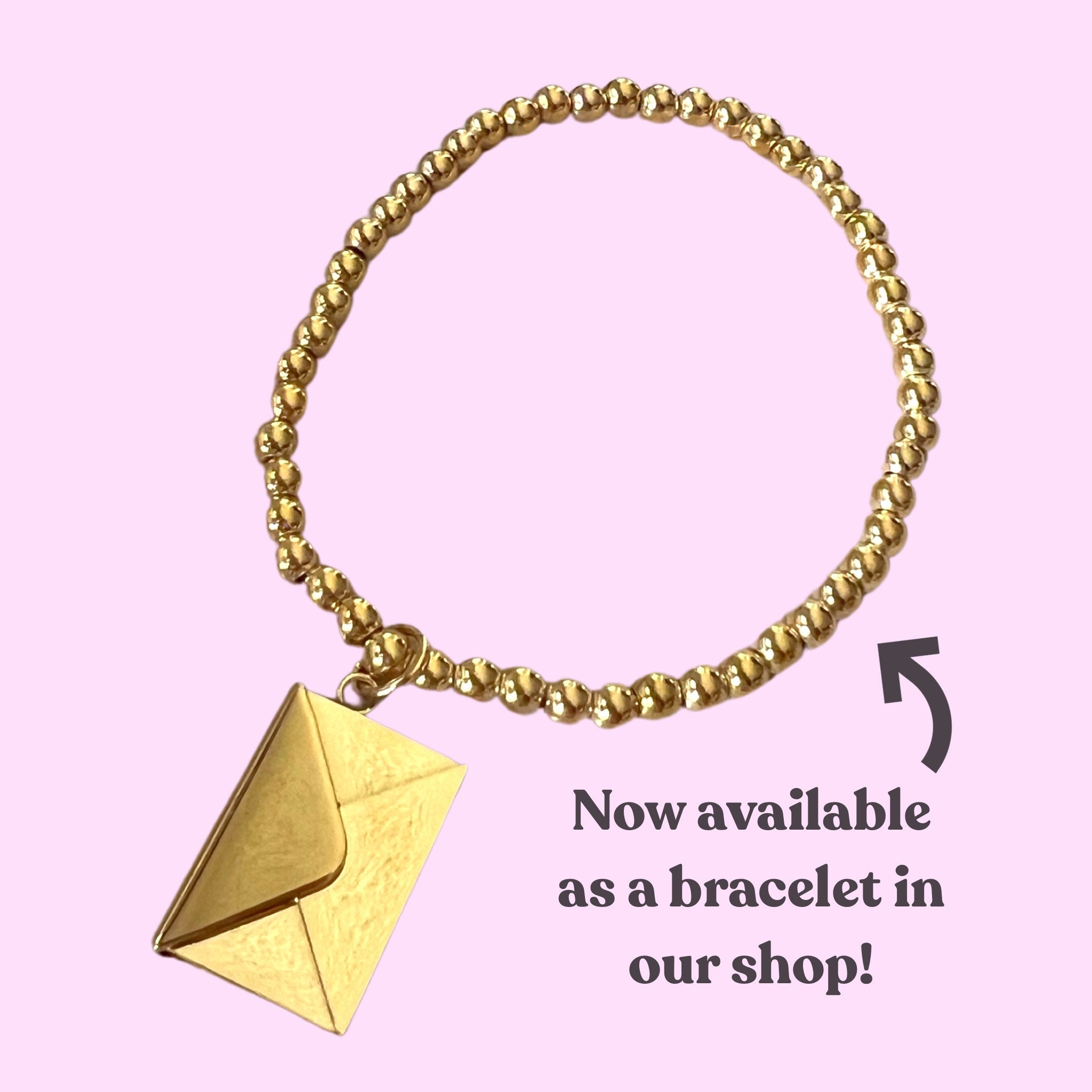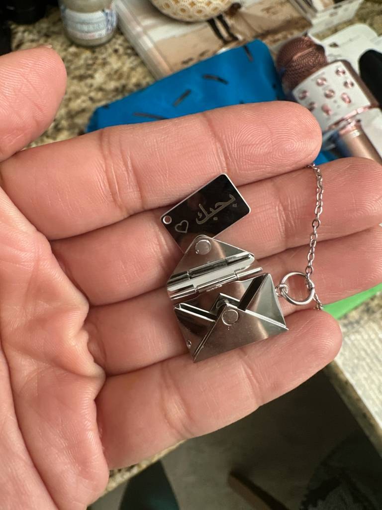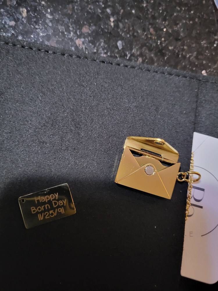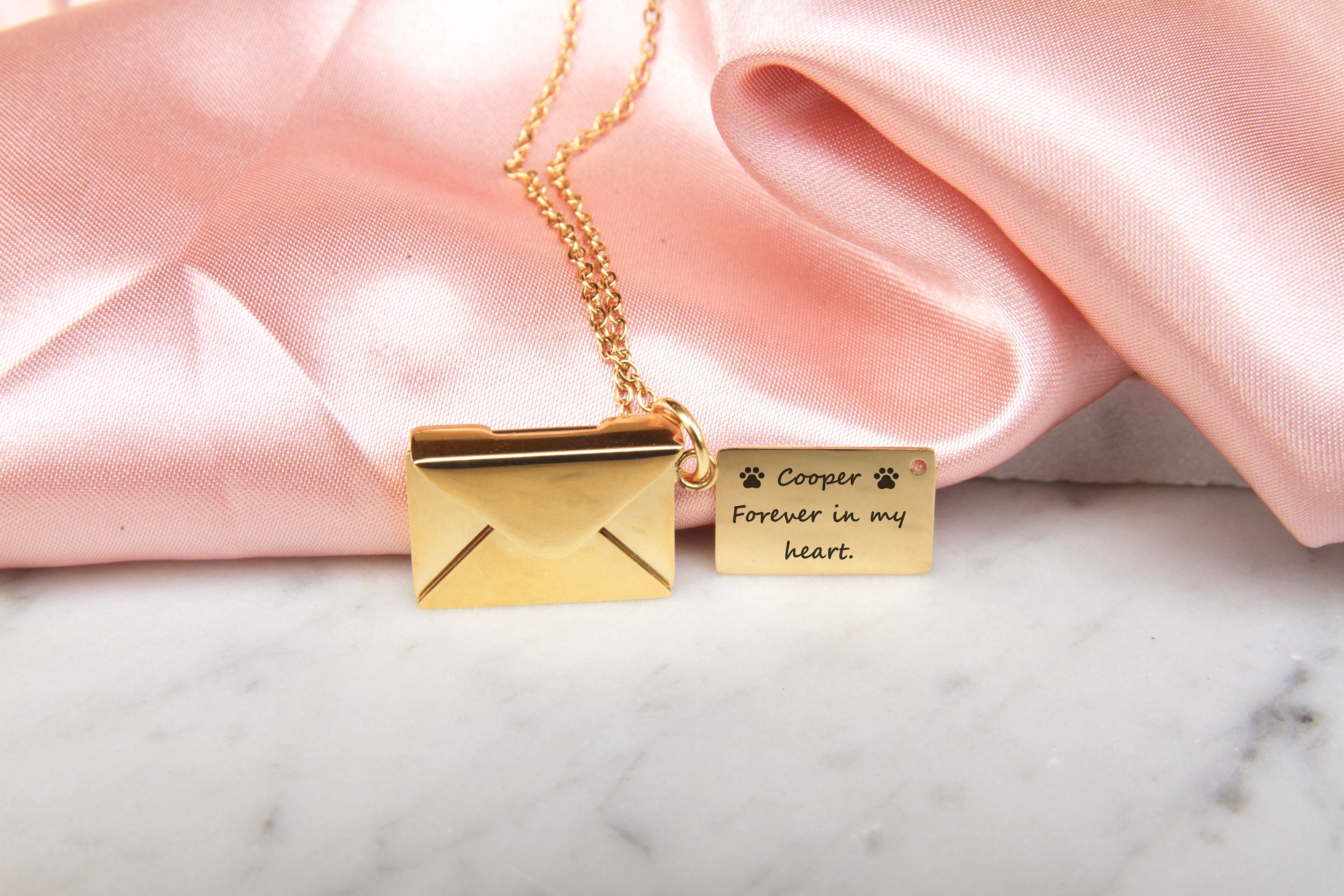 A beautiful engraved custom message gift! Featured a non-tarnish stainless steel envelope charm with removable secret message inside with magnetic closure.