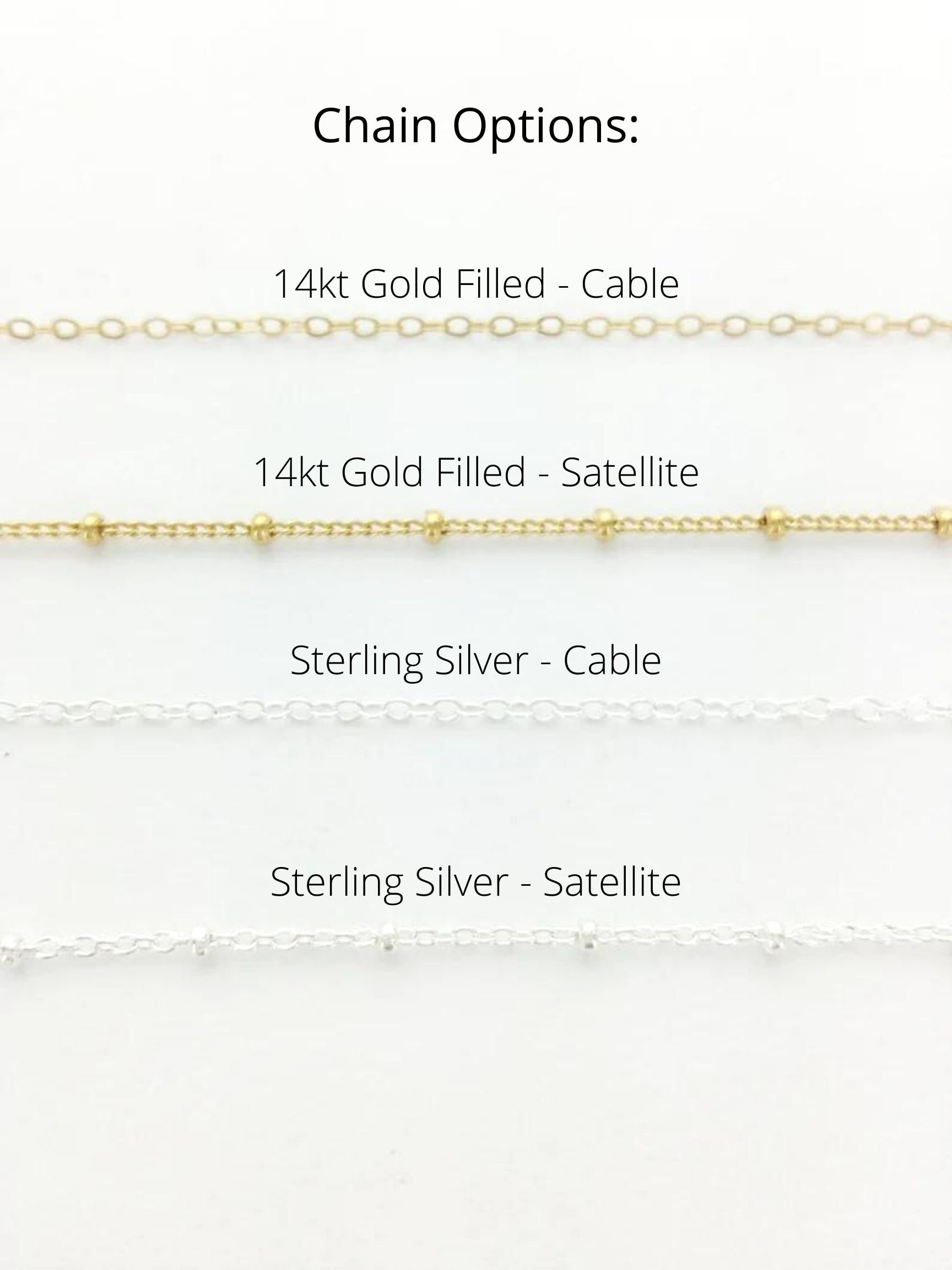 • Chain: 14kt gold plated, sterling silver, or rose gold plated - Cable or Satellite.