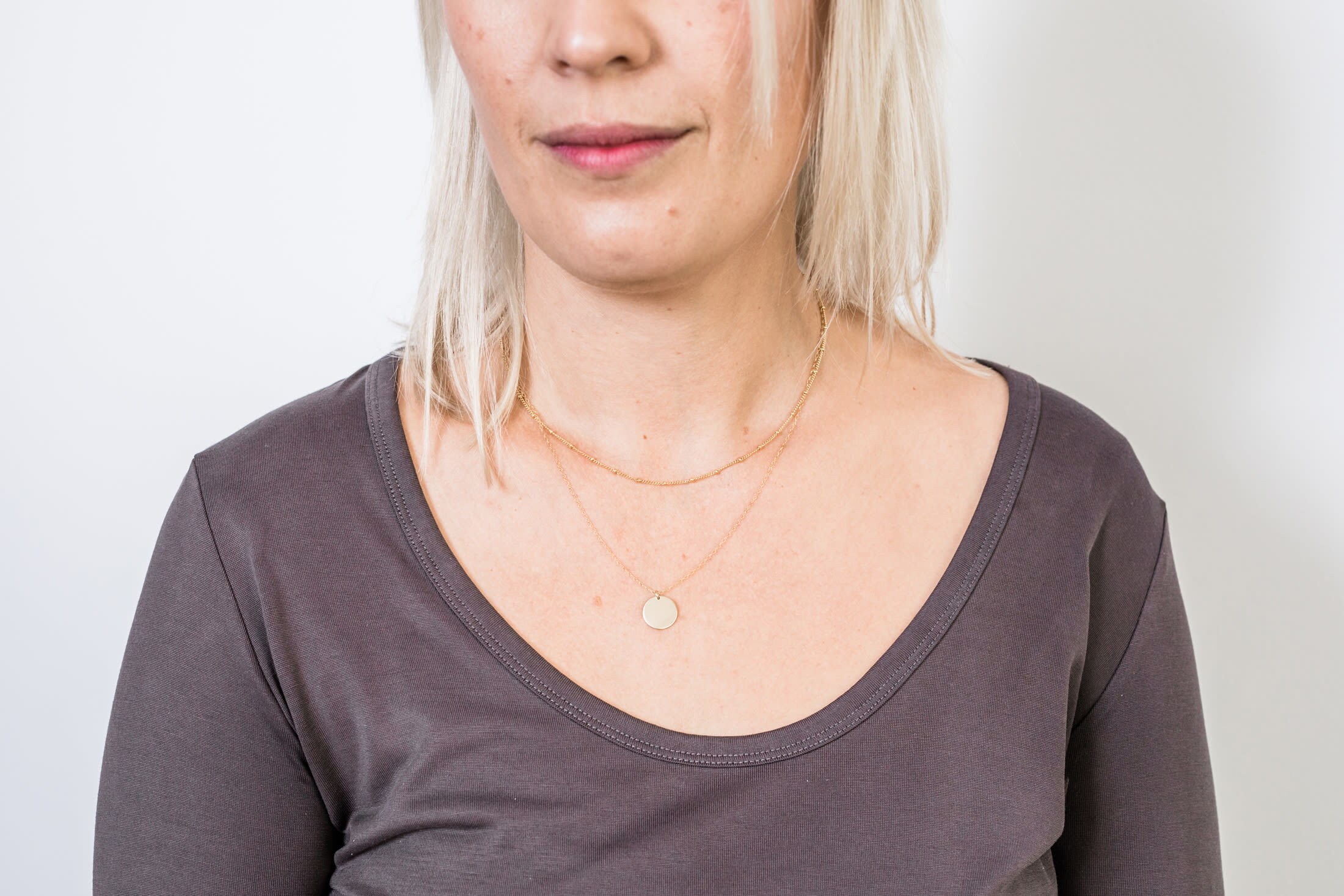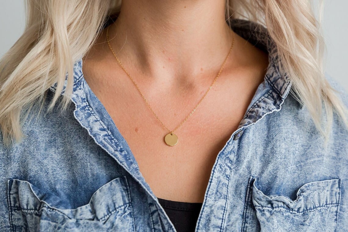 These hand-stamped 12mm discs are available in your choice of material. Discs and chains are available in sterling silver, 14kt gold plated, and rose gold plated. These long-lasting, water-resistant materials are perfect for everyday wear.
