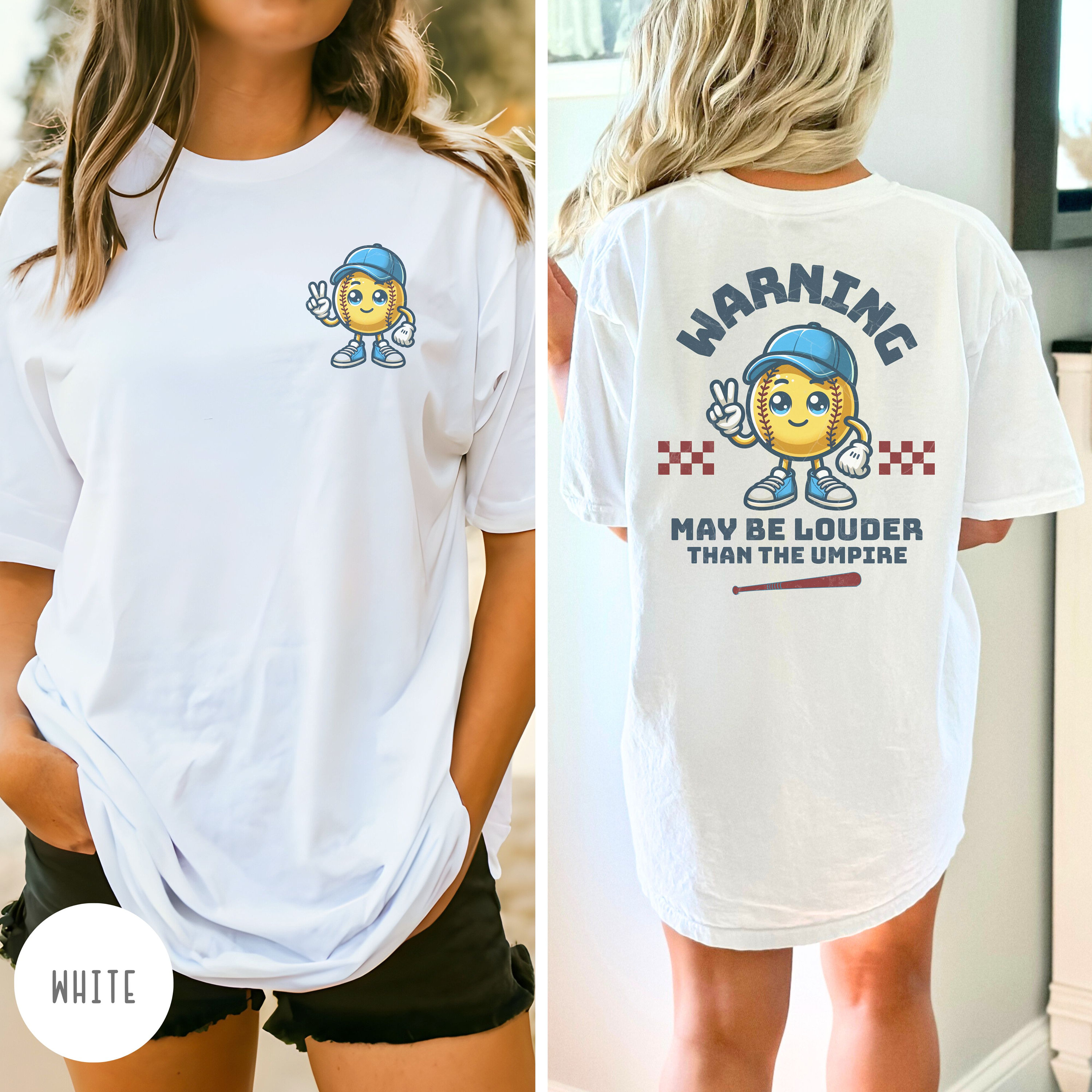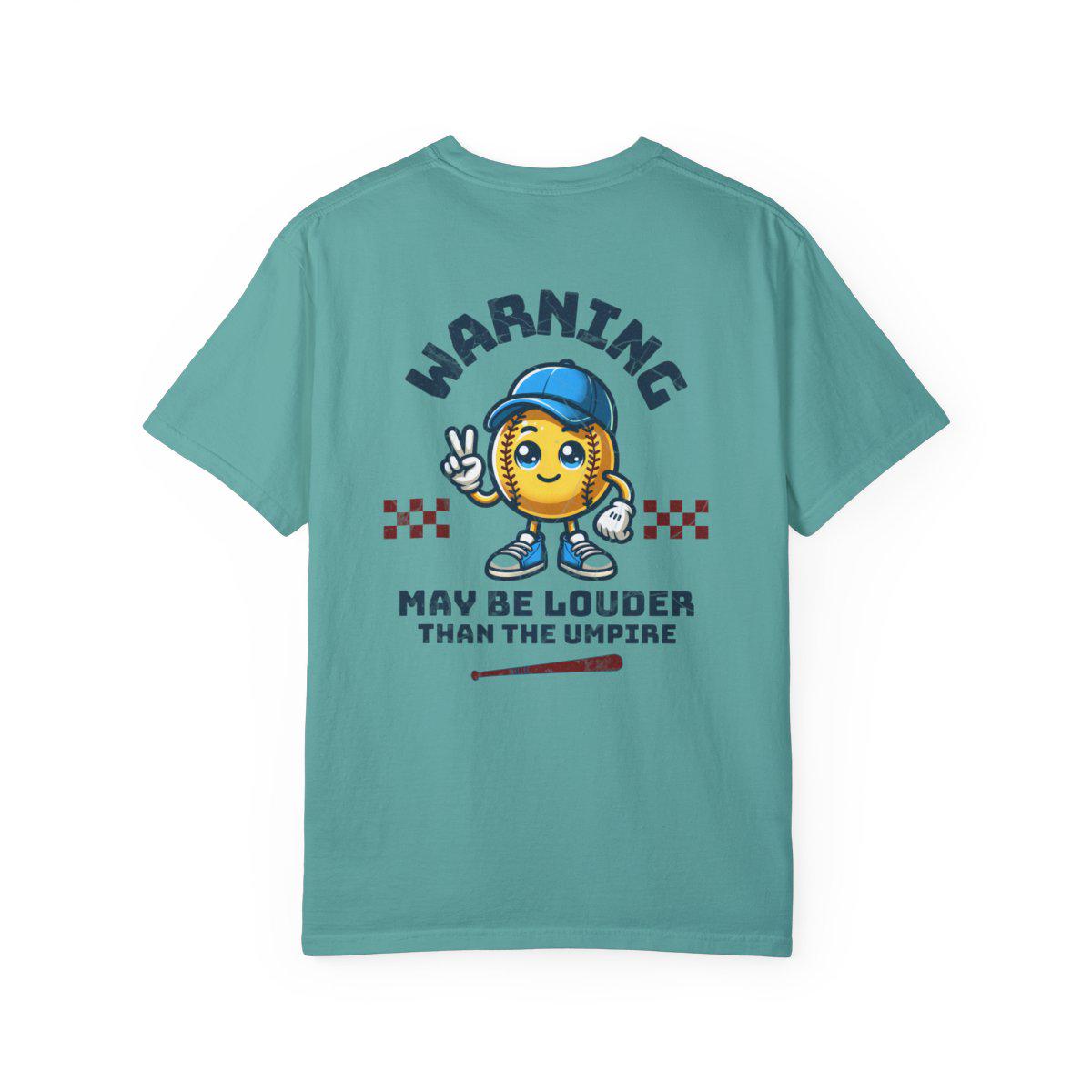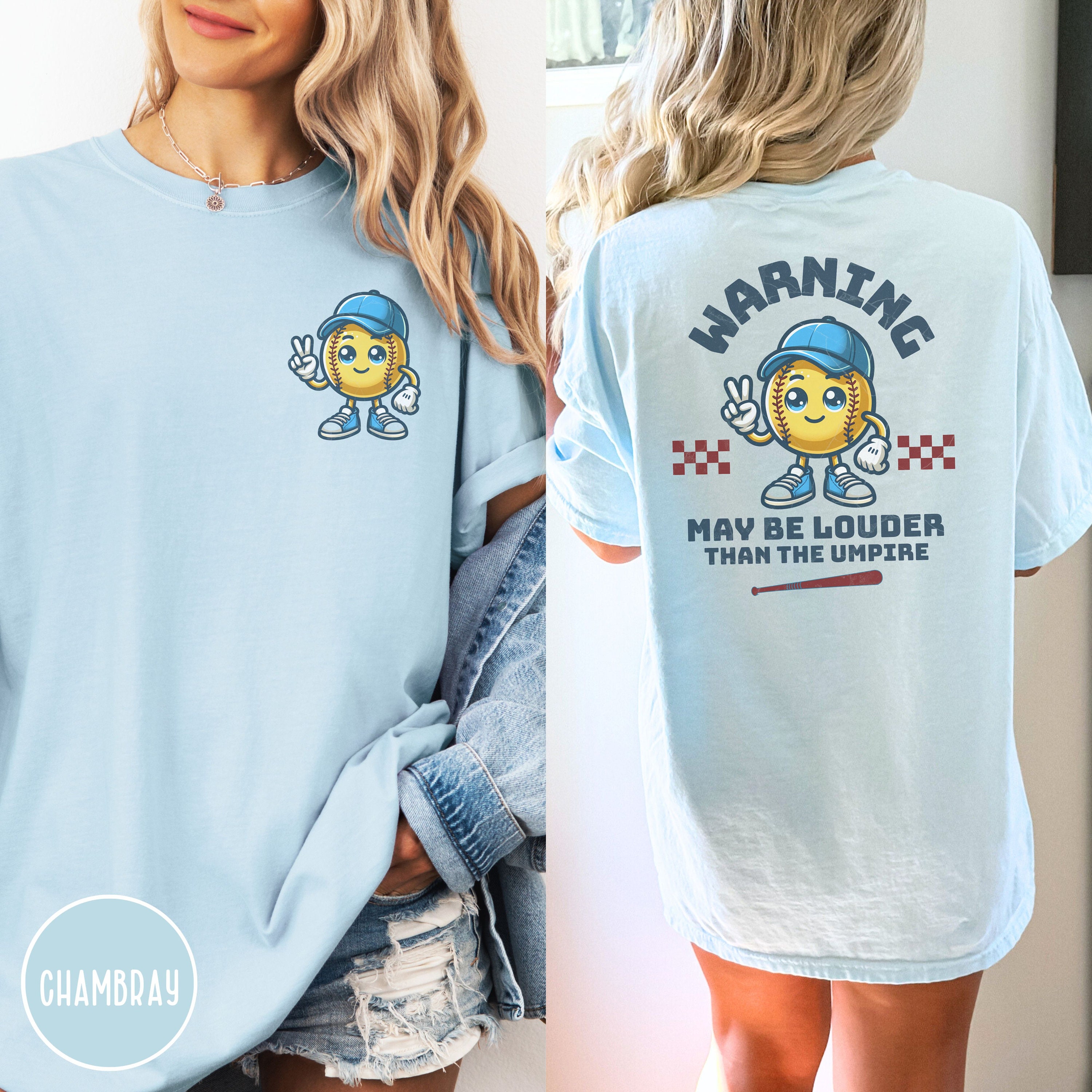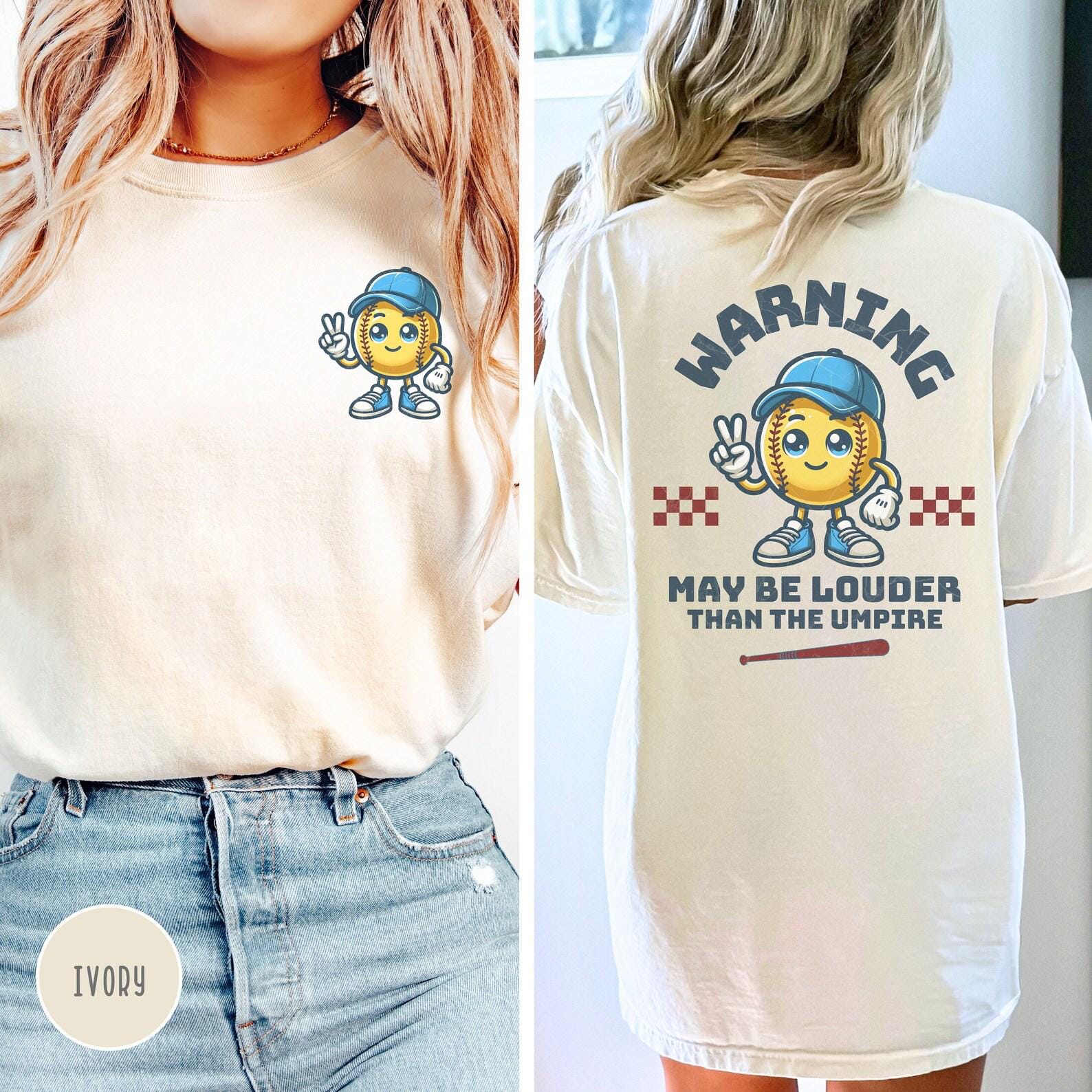 ⚾ Elevate your game day look with our funny softball t-shirts in comfort colors! Printed with the witty phrase "Warning, I Might Be Louder Than the Umpire," this t-shirt is perfect for any passionate softball fan or mom. Plus, by going up 2-3 sizes, a stylish oversized look is achieved, ensuring a comfortable and stylish fit for every passionate supporter in the stands!