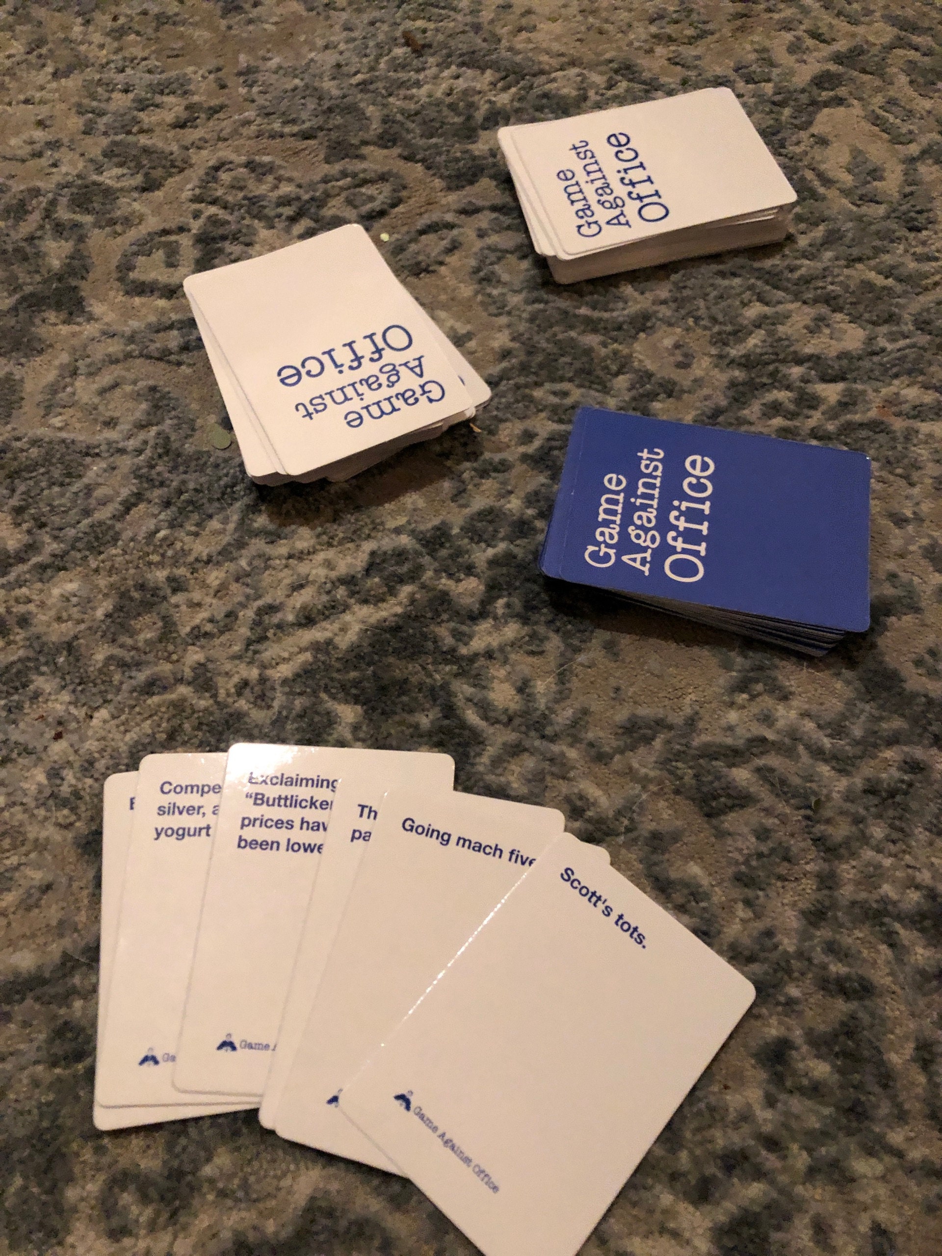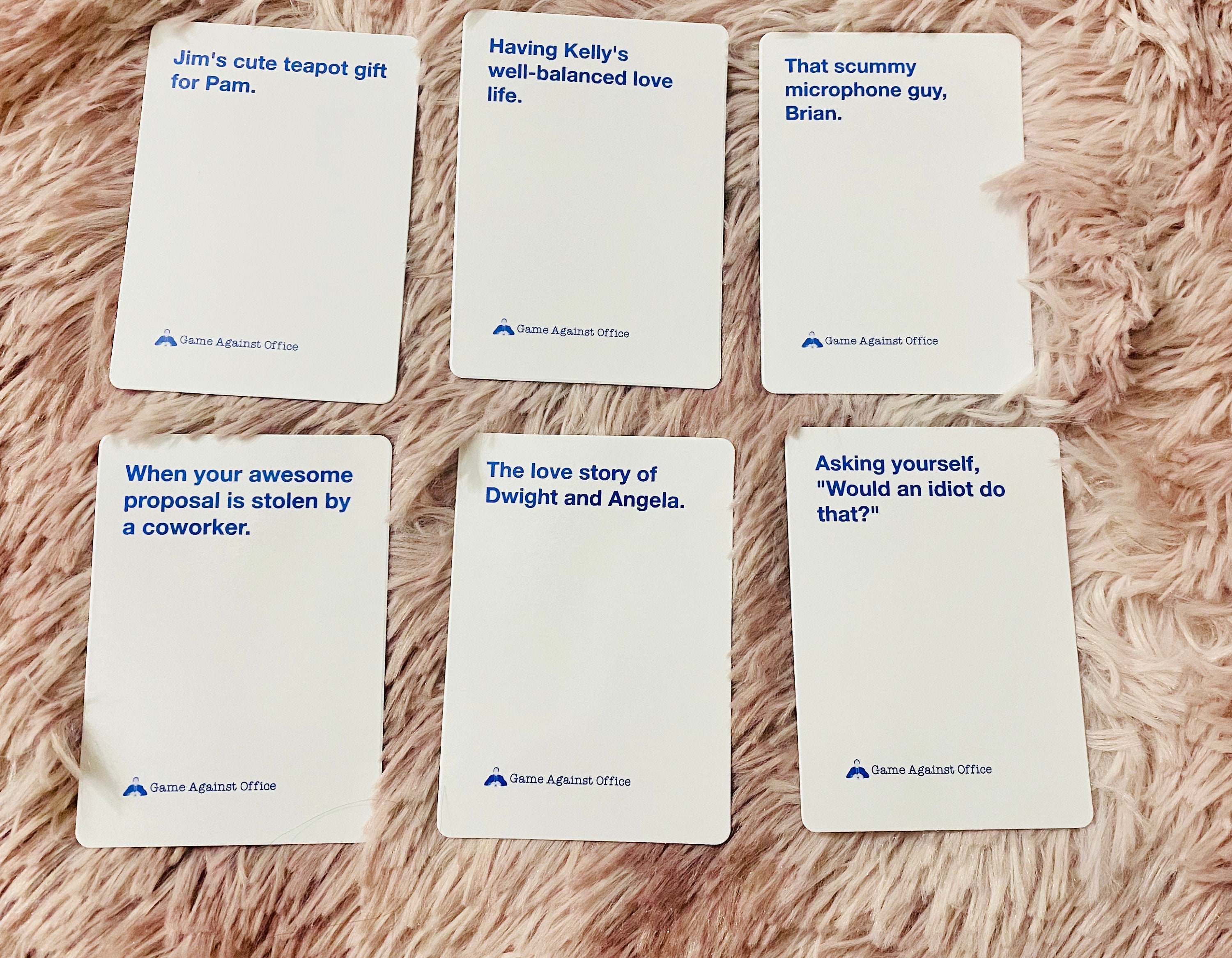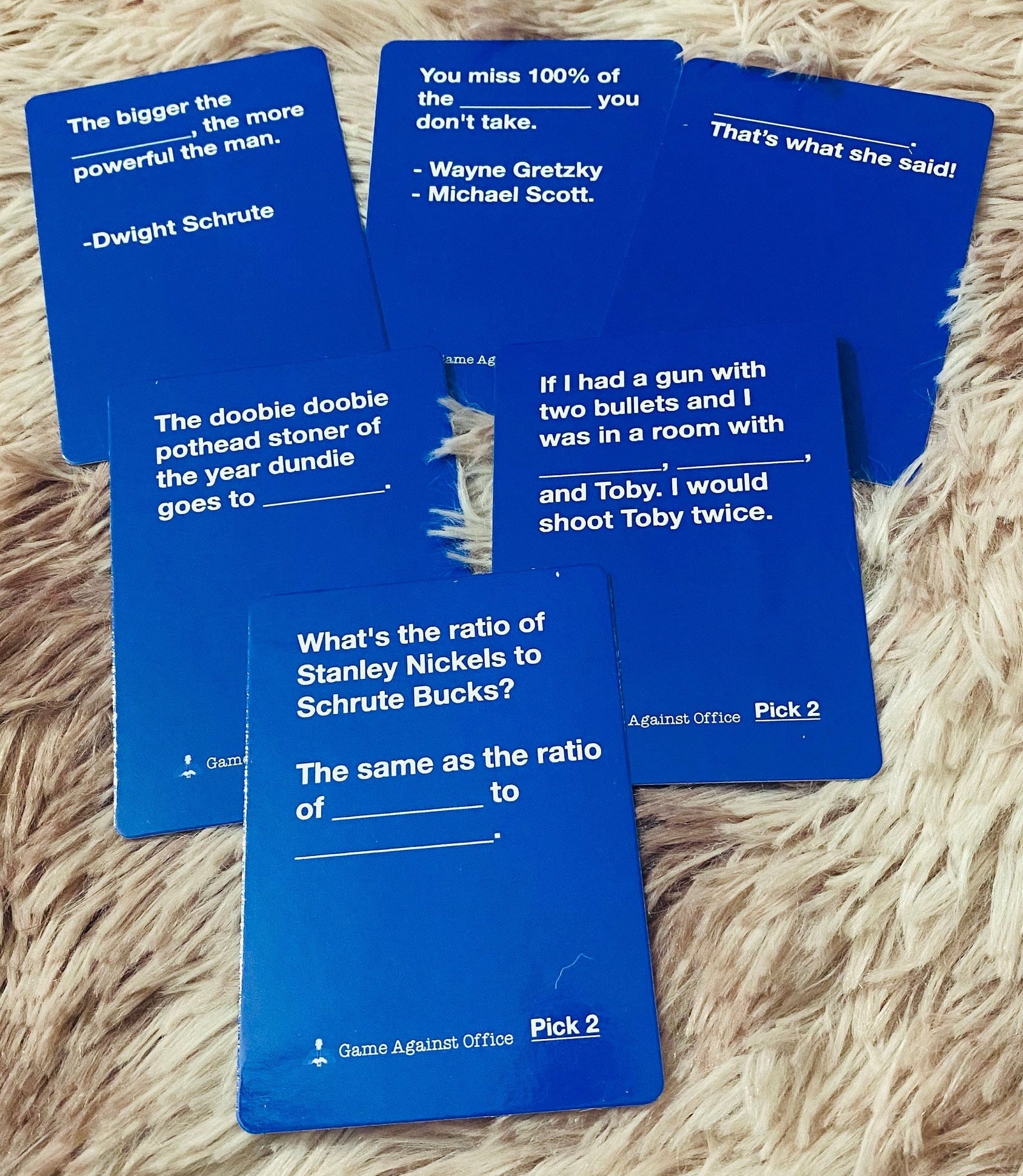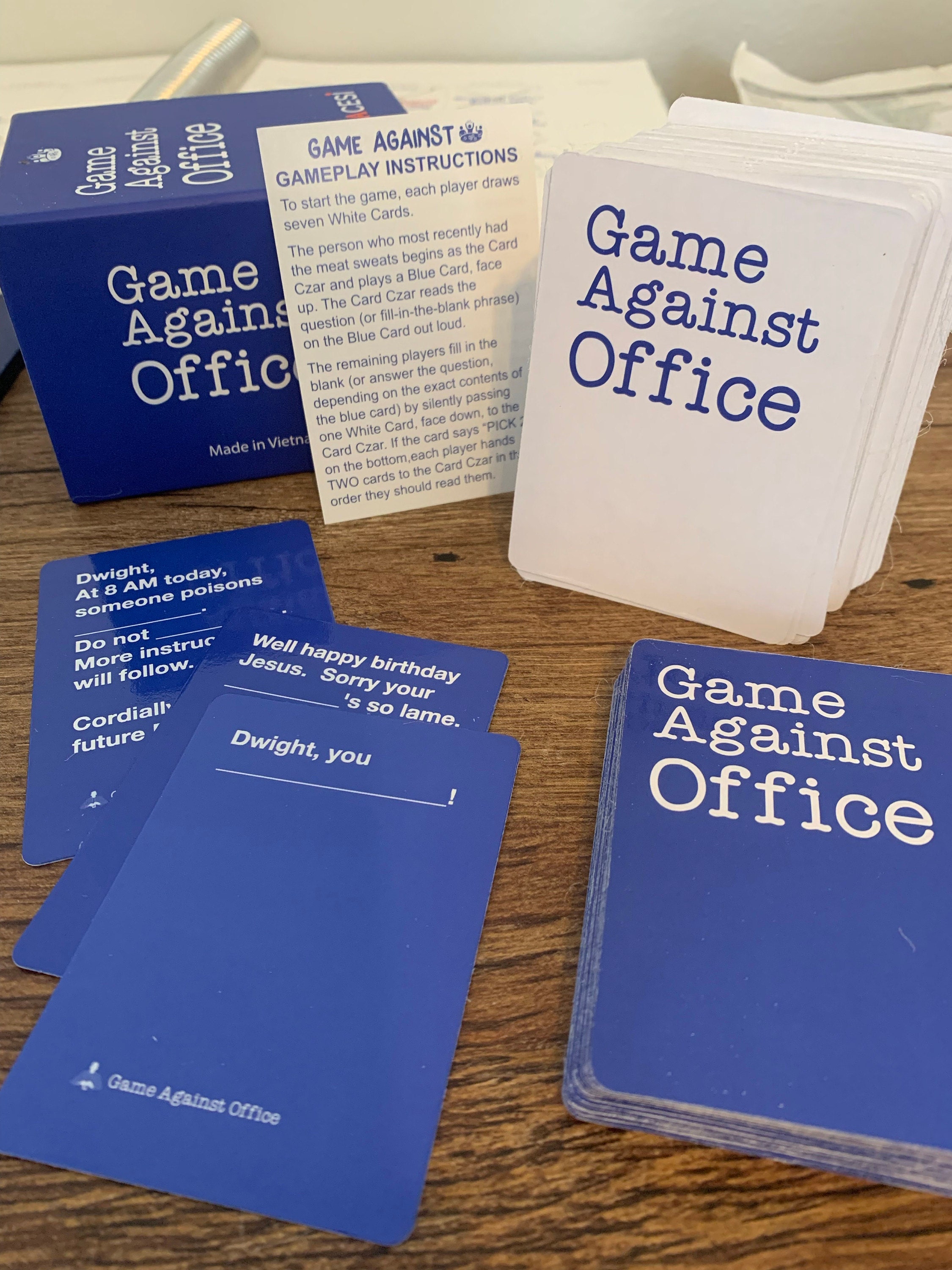 What makes this game even more appealing is that, even with 99 “blue cards” (aka reminder cards) and 180 “white cards” (the card you use to answer the prompt) for “The Office “, a game to fill in the topic of Office.