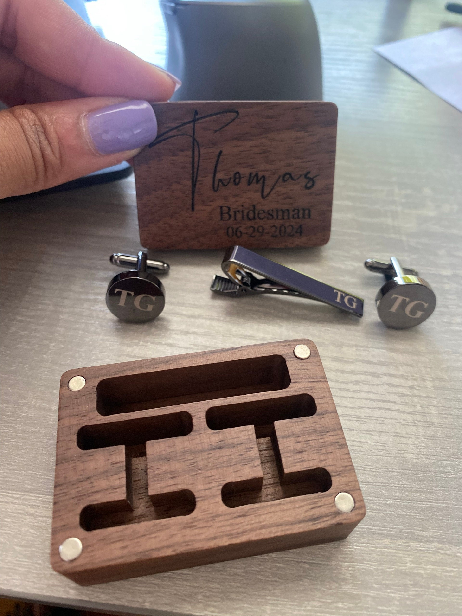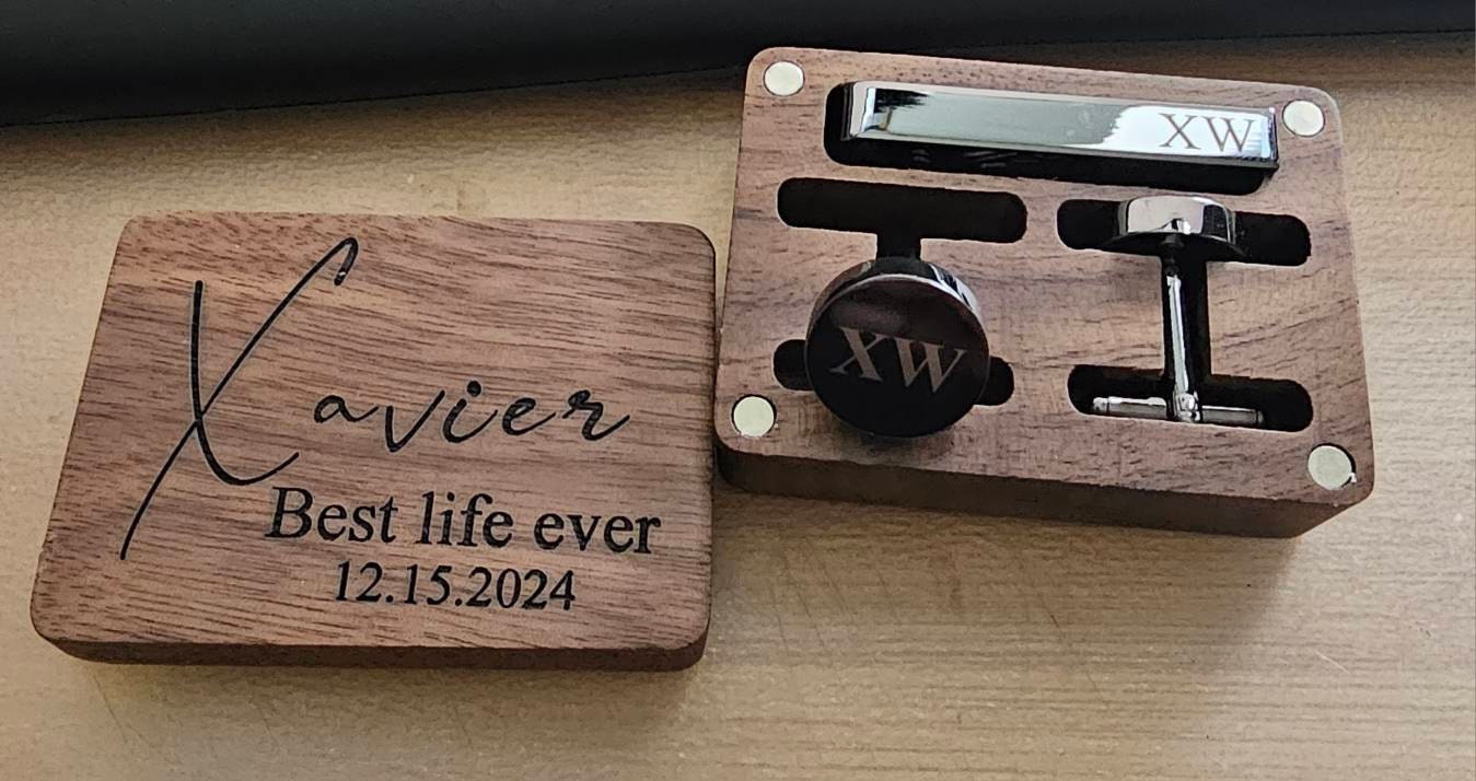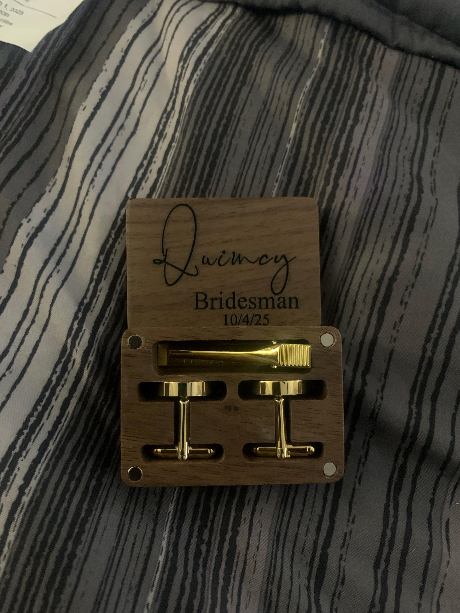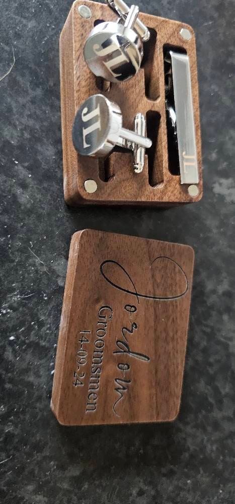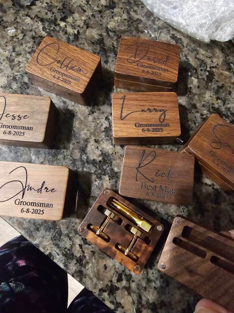 These cufflinks and tie clips with wooden box can be customized with your name, initials, wedding date as per your requirements.