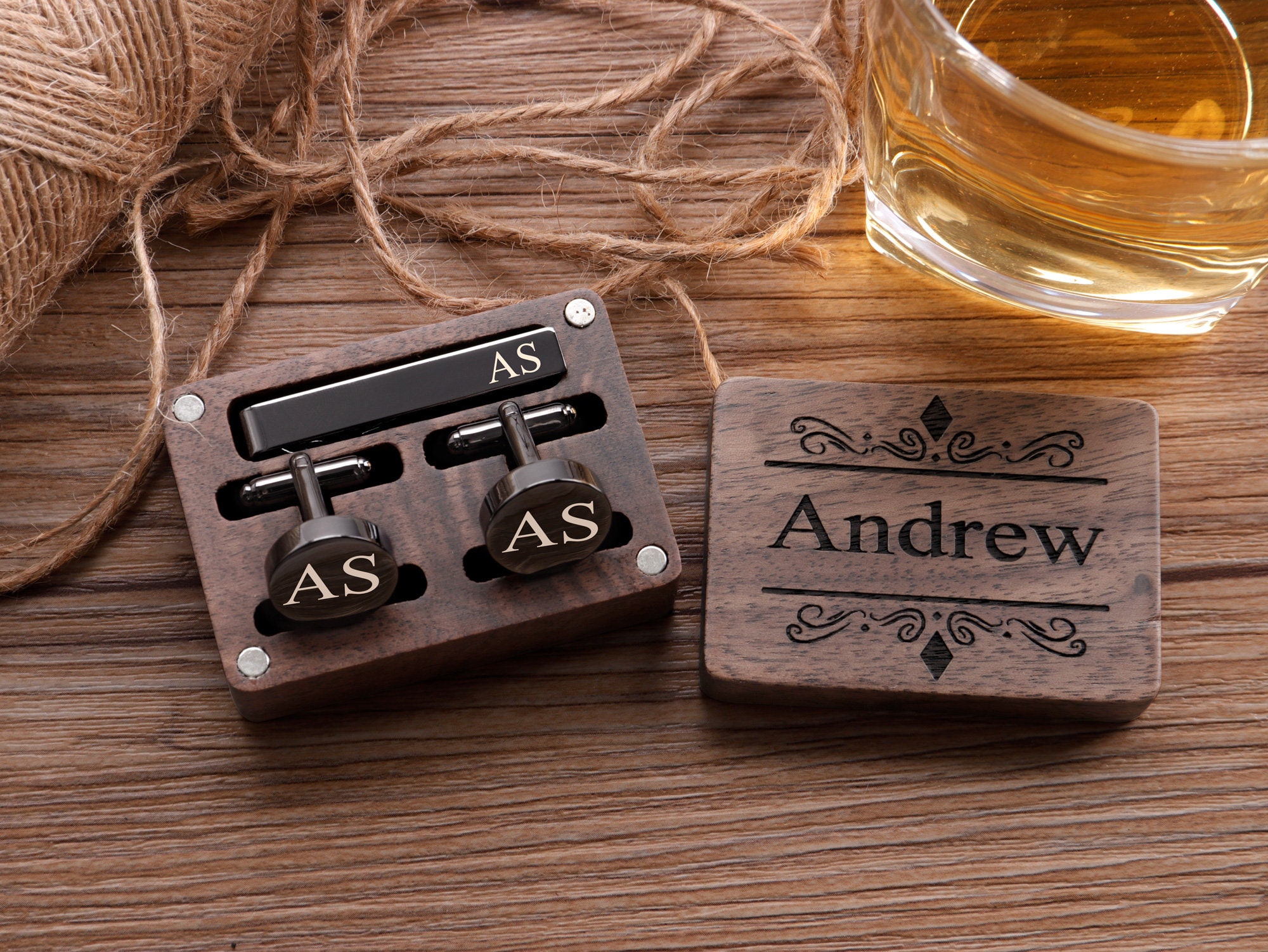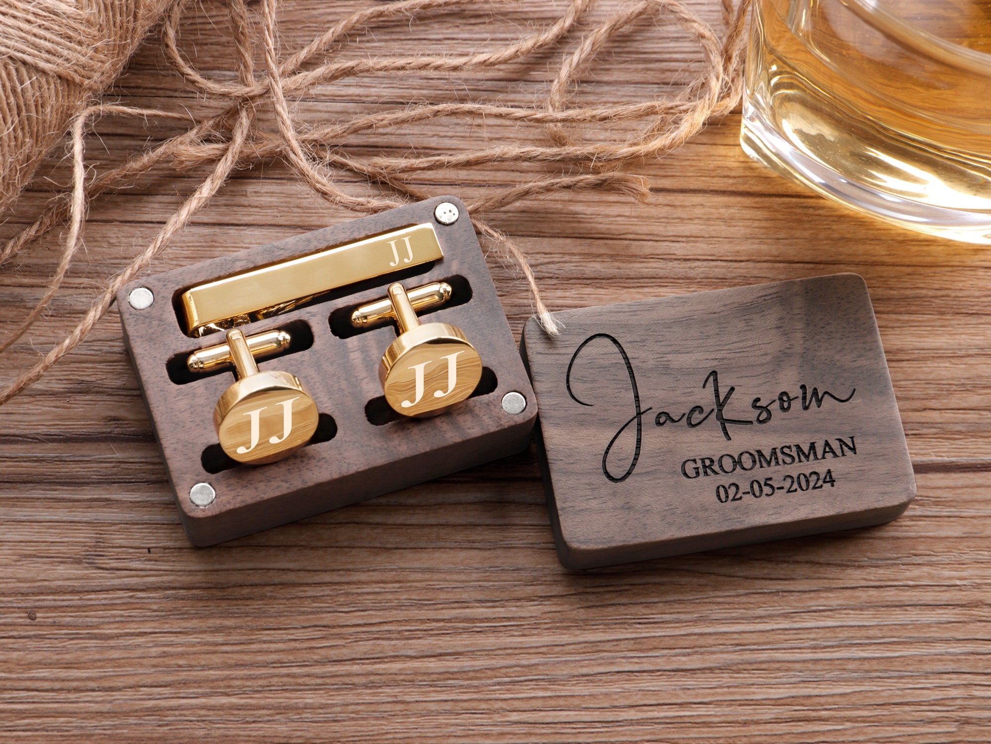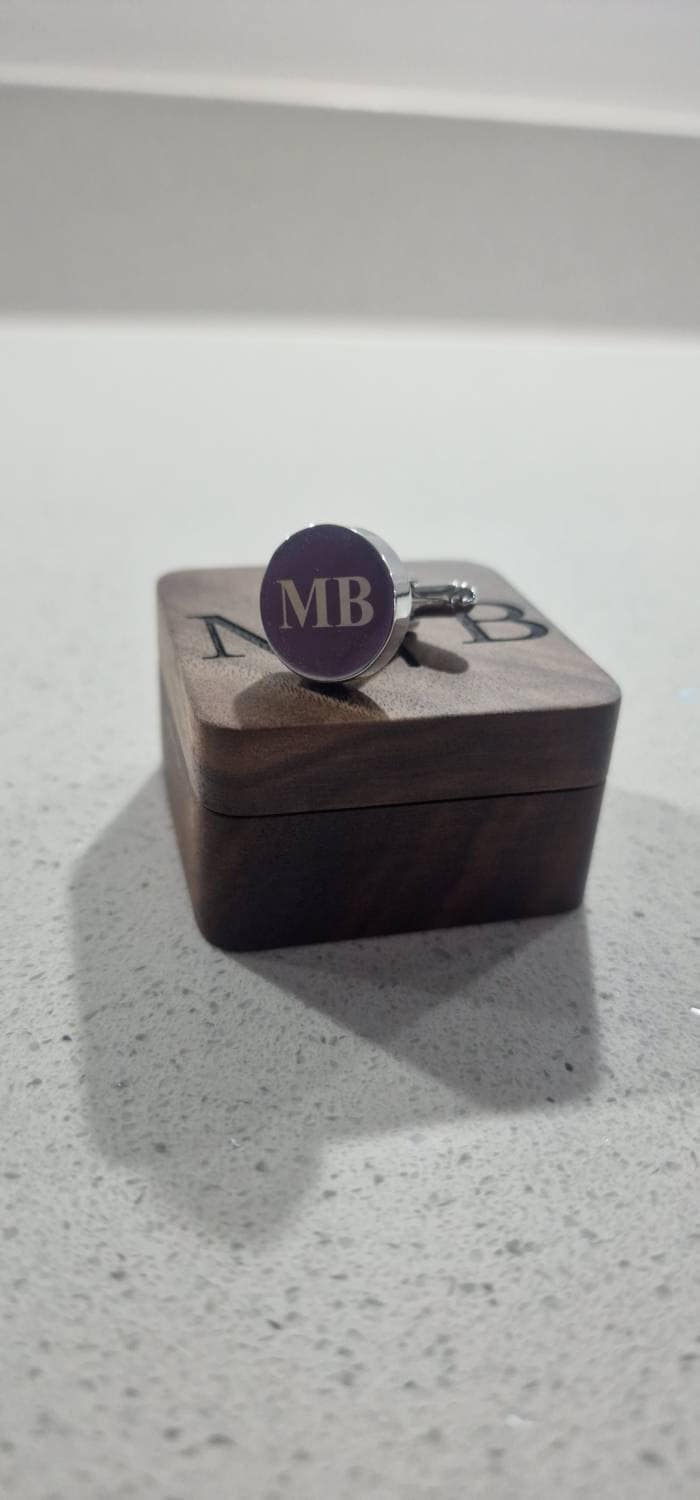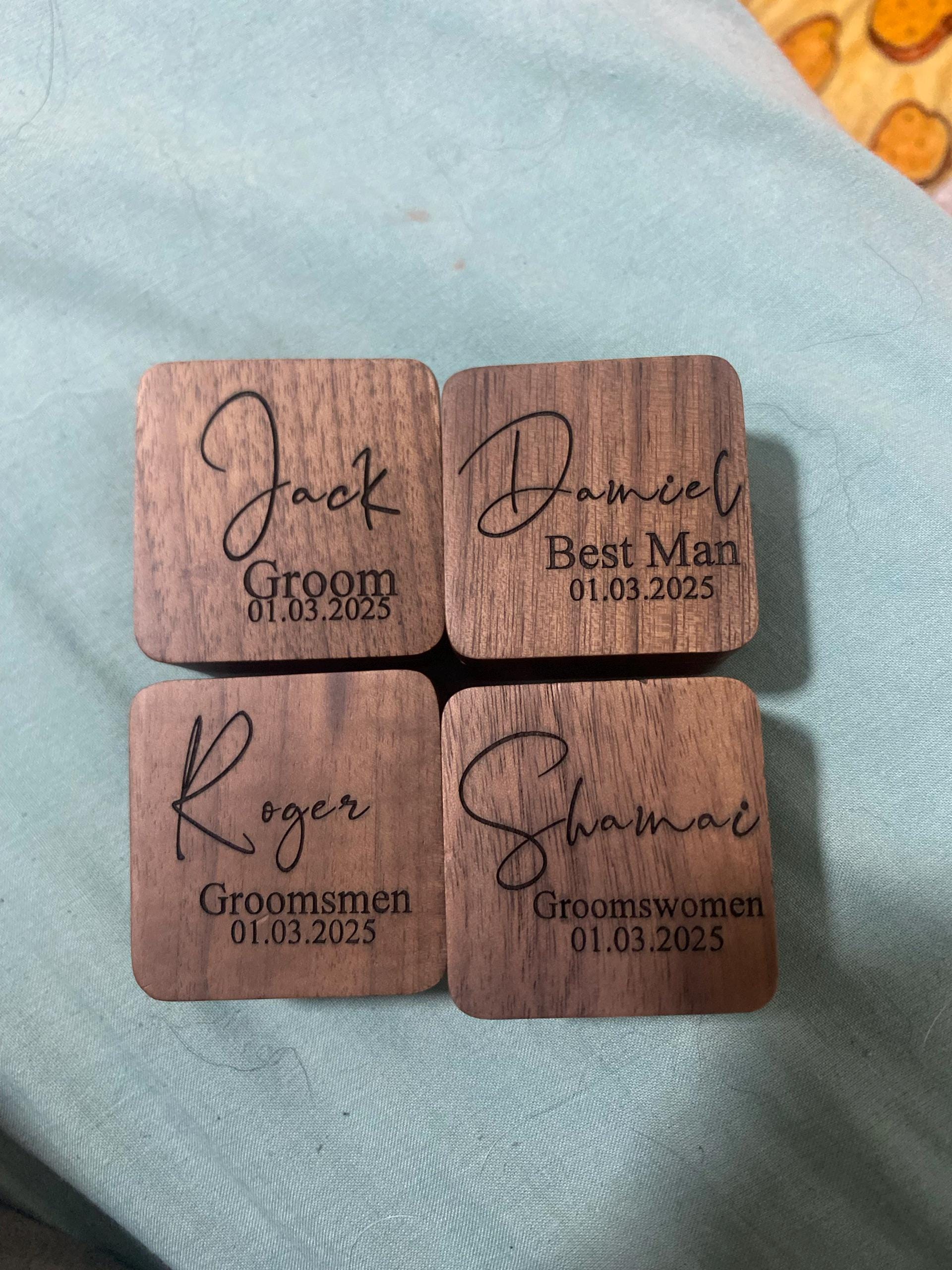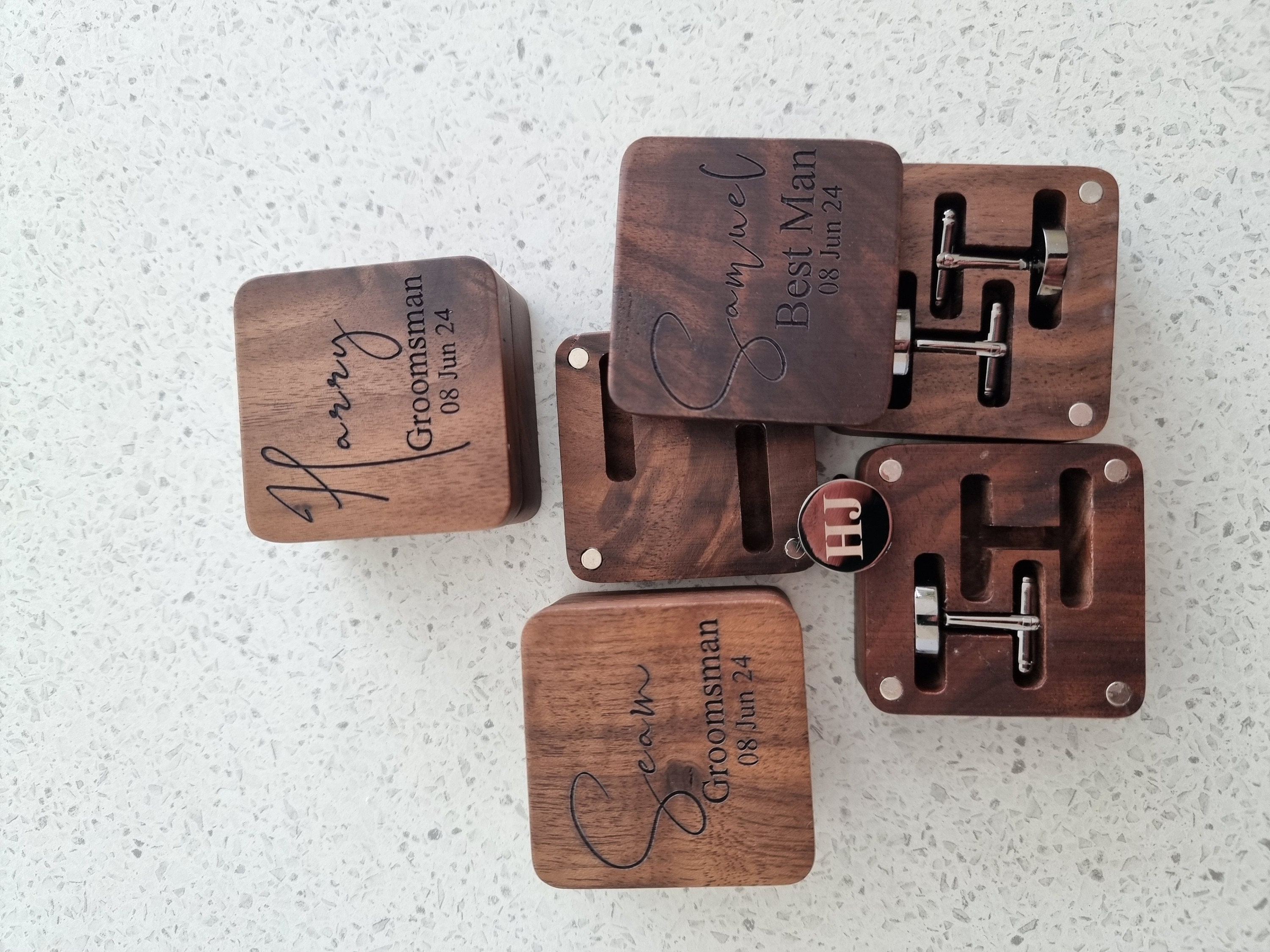 These cufflinks and tie clips with wooden box can be customized with your name, initials, wedding date as per your requirements.