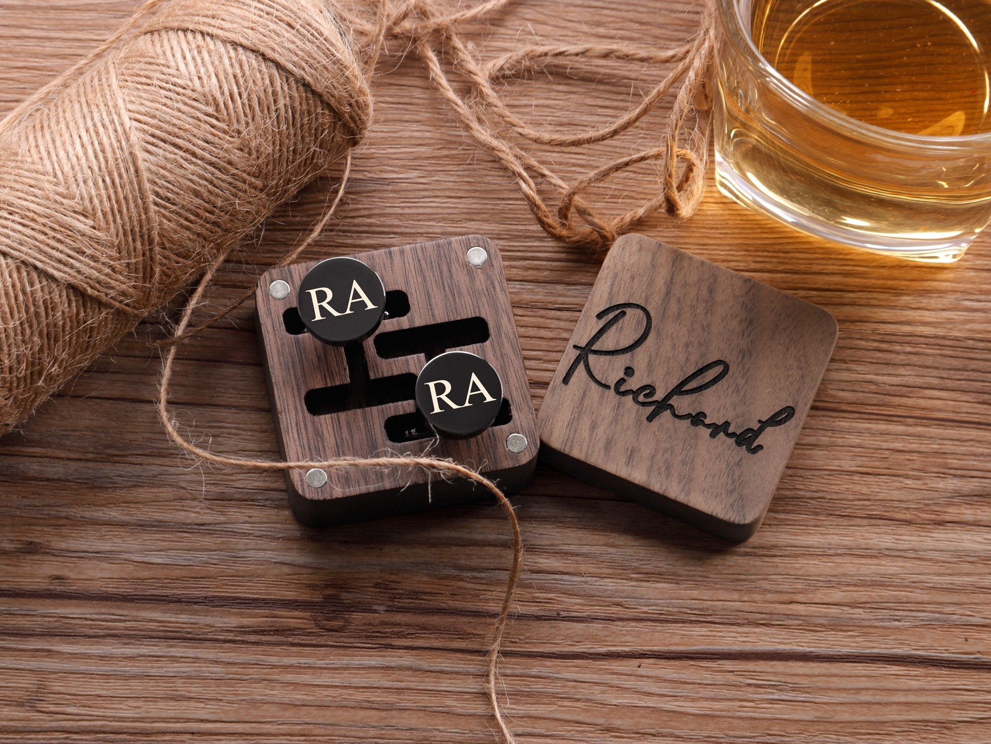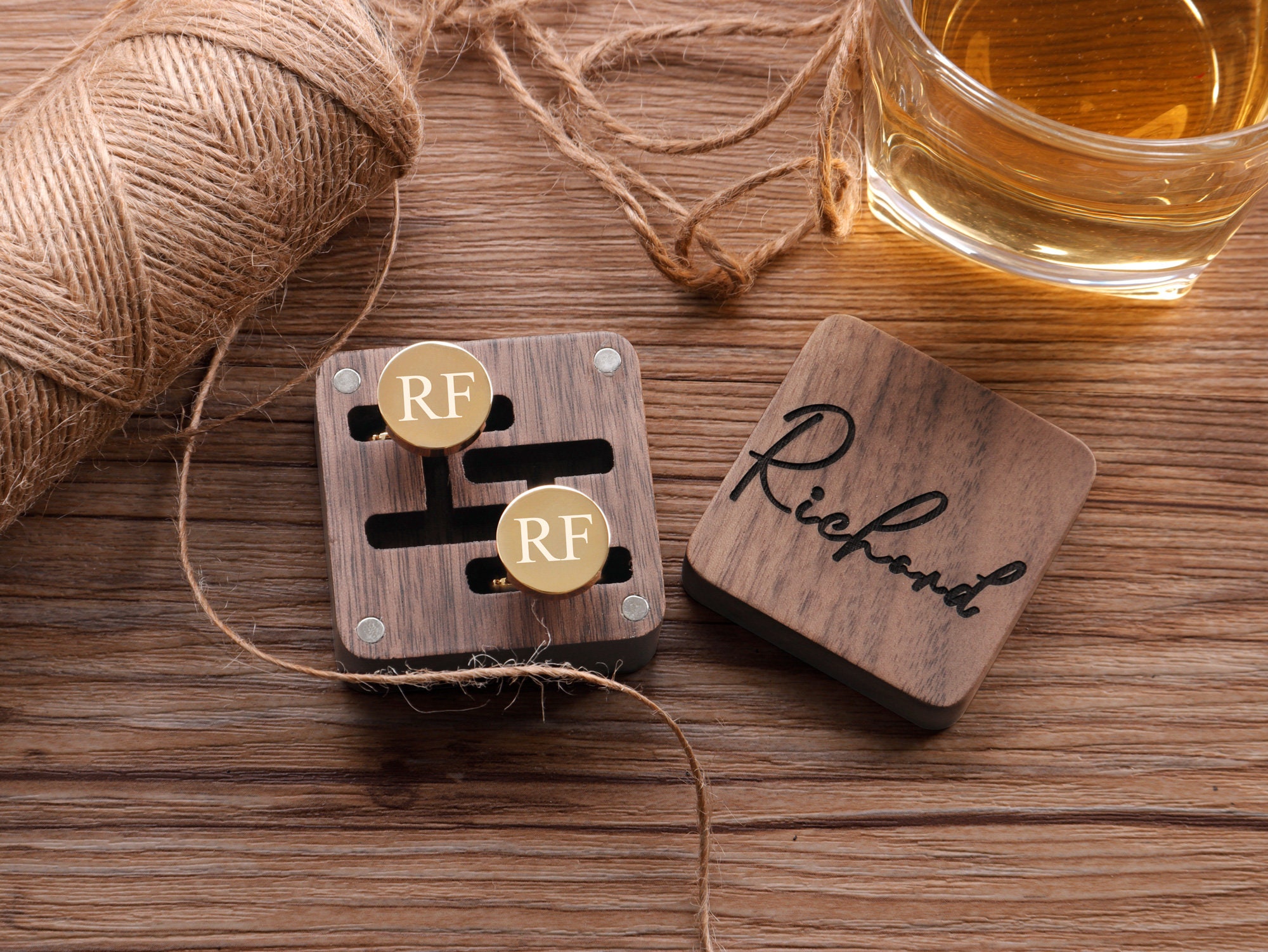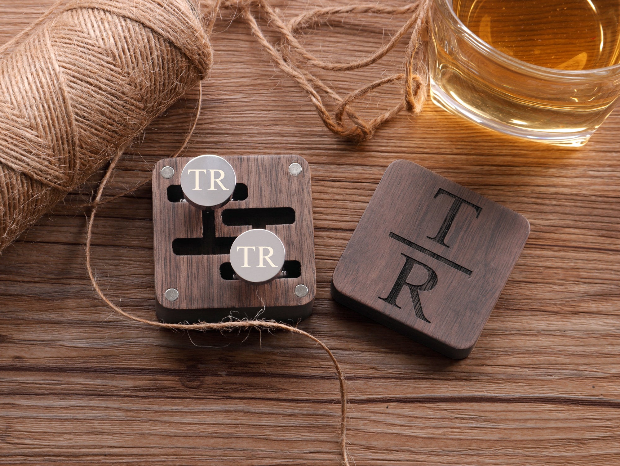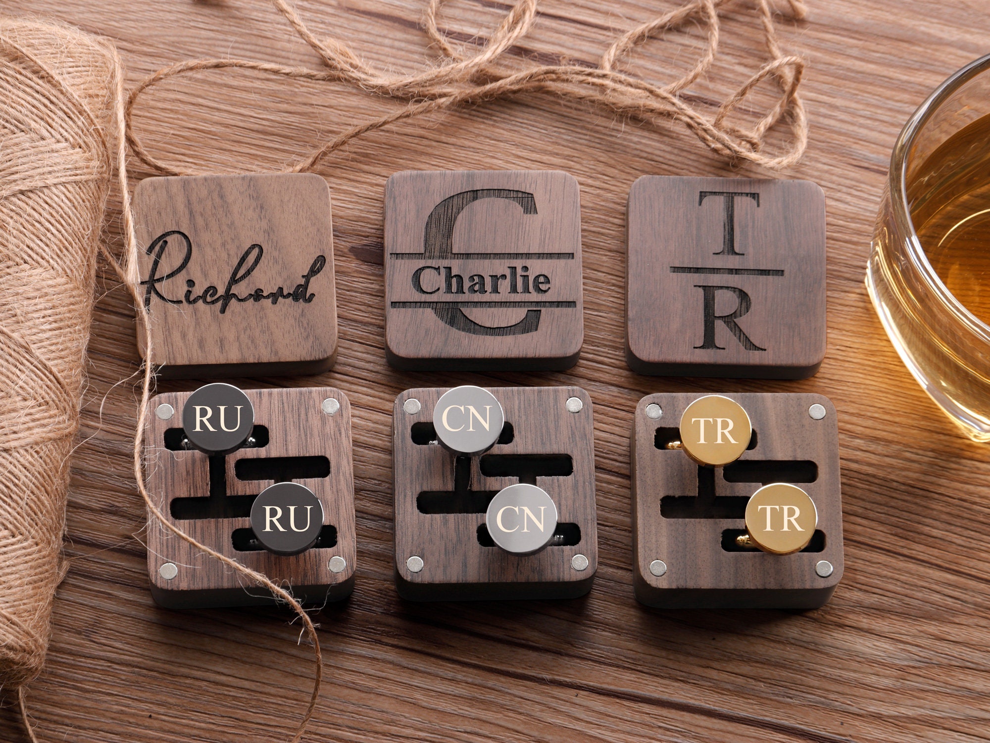 These cufflinks and tie clips with wooden box can be customized with your name, initials, wedding date as per your requirements.