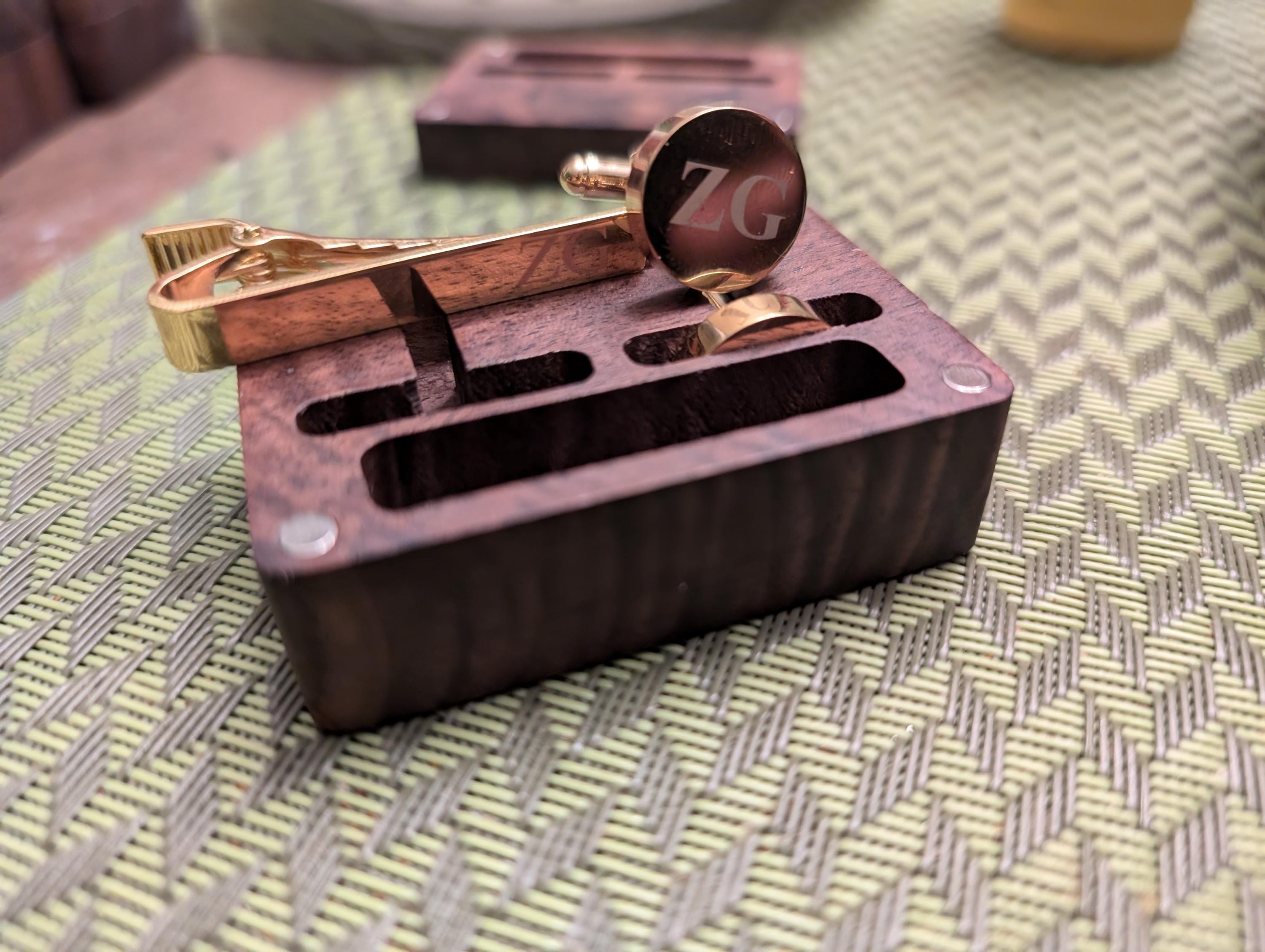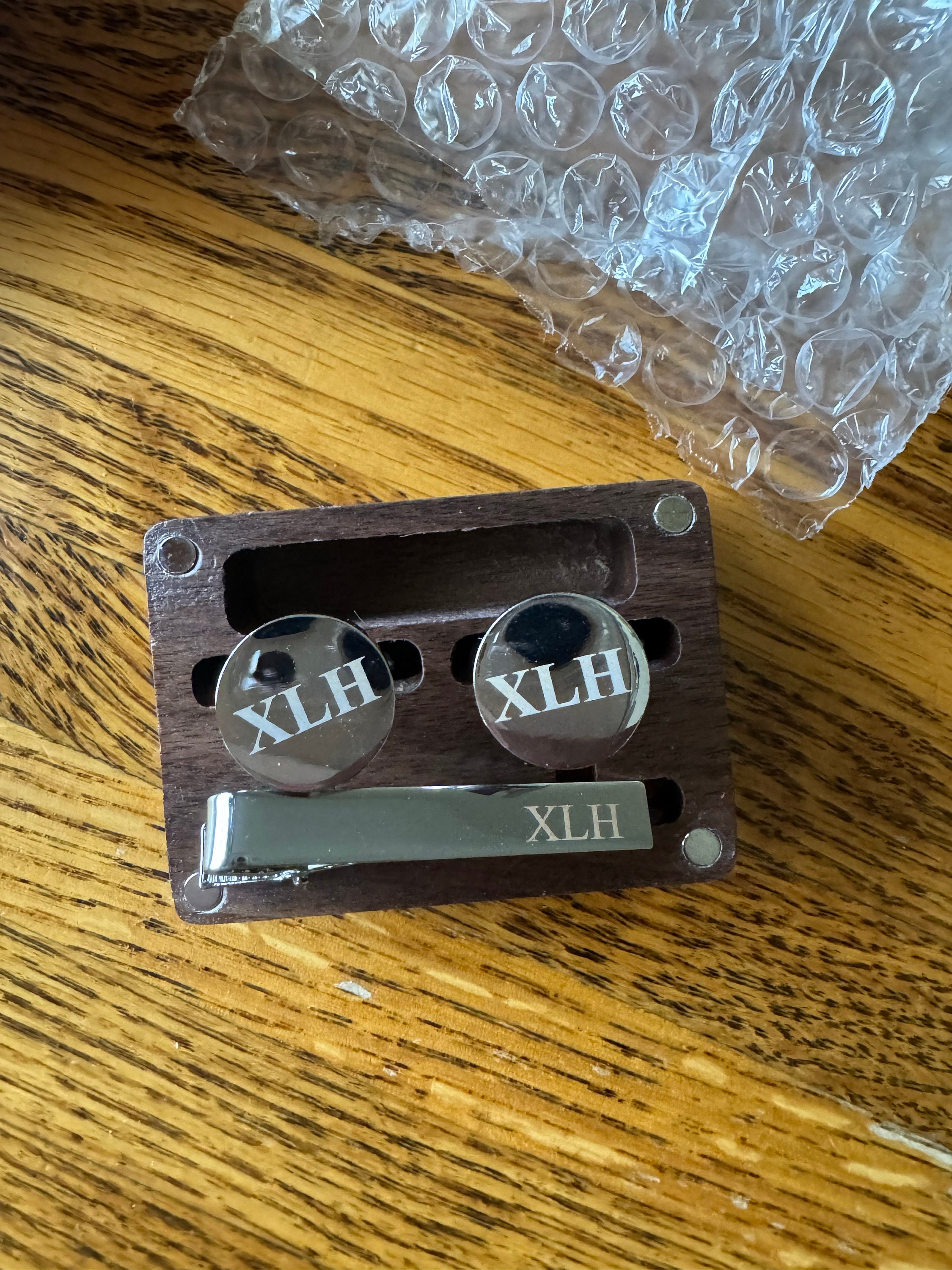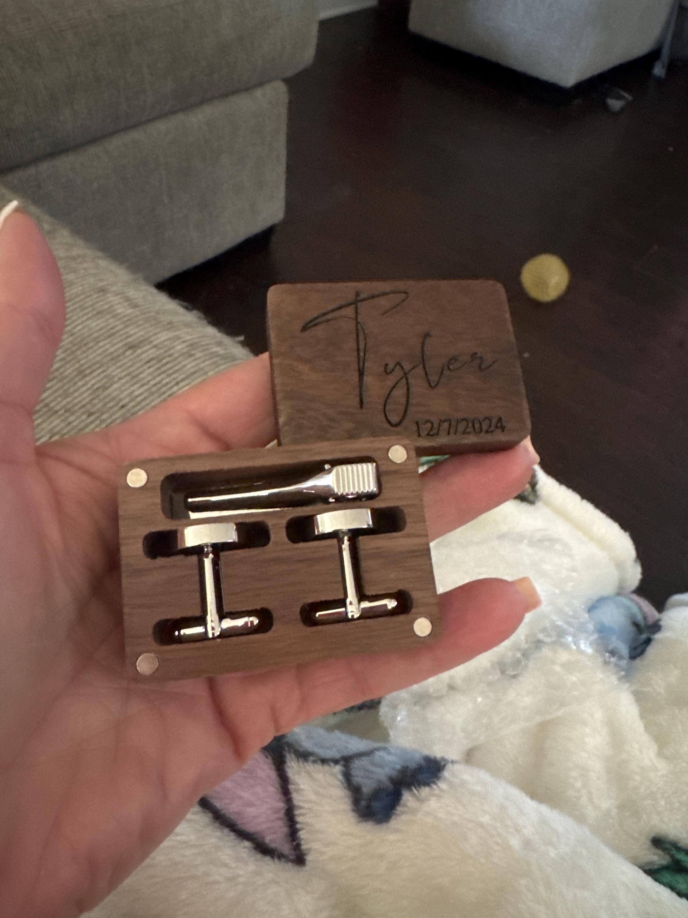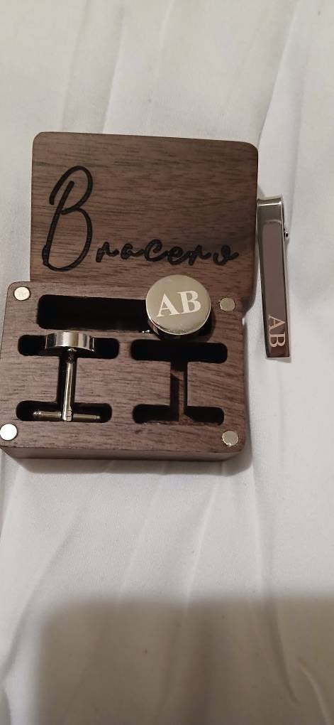 This is a beautiful set of men's custom cufflinks/tie clips that come with a wooden box.