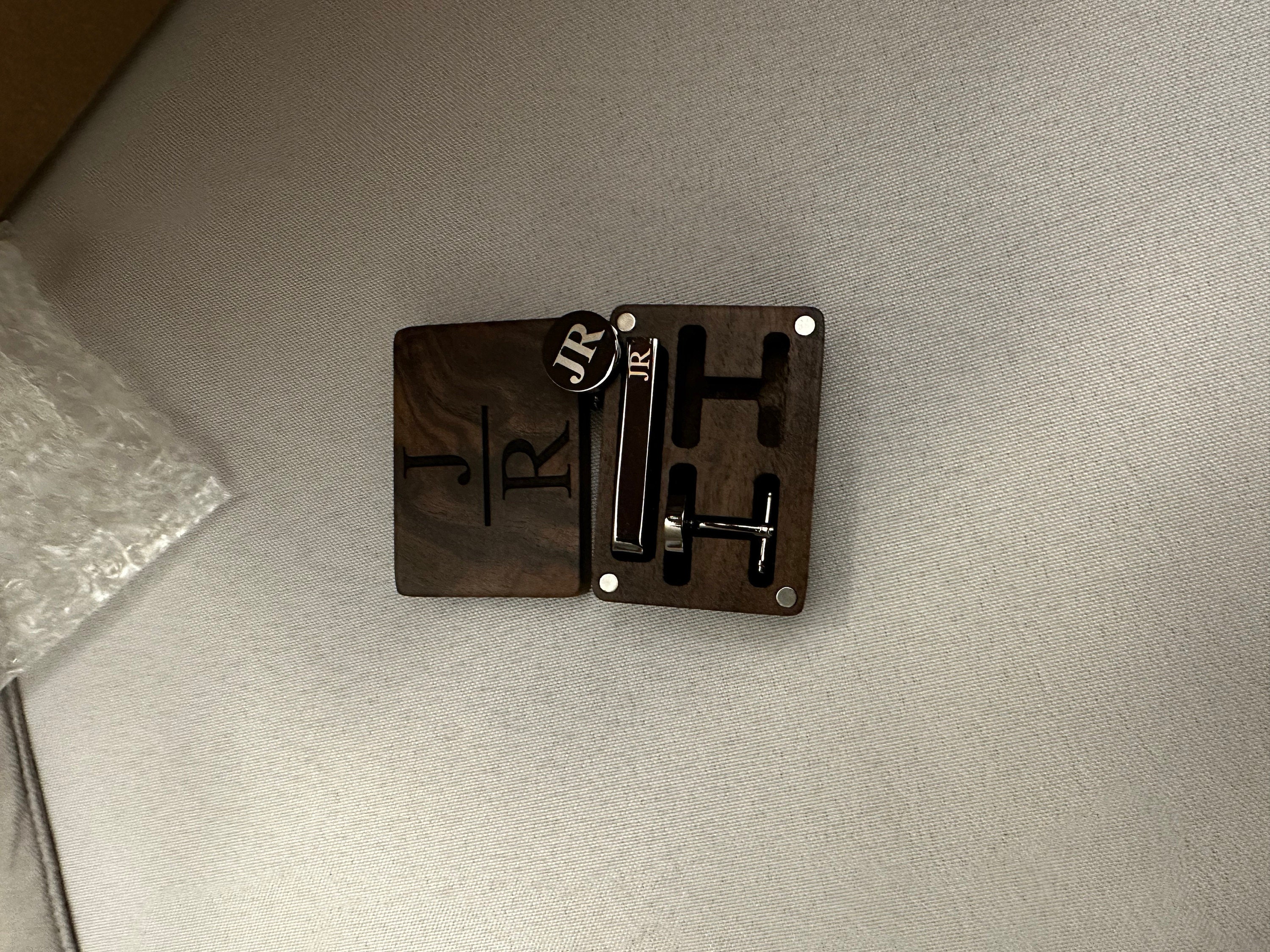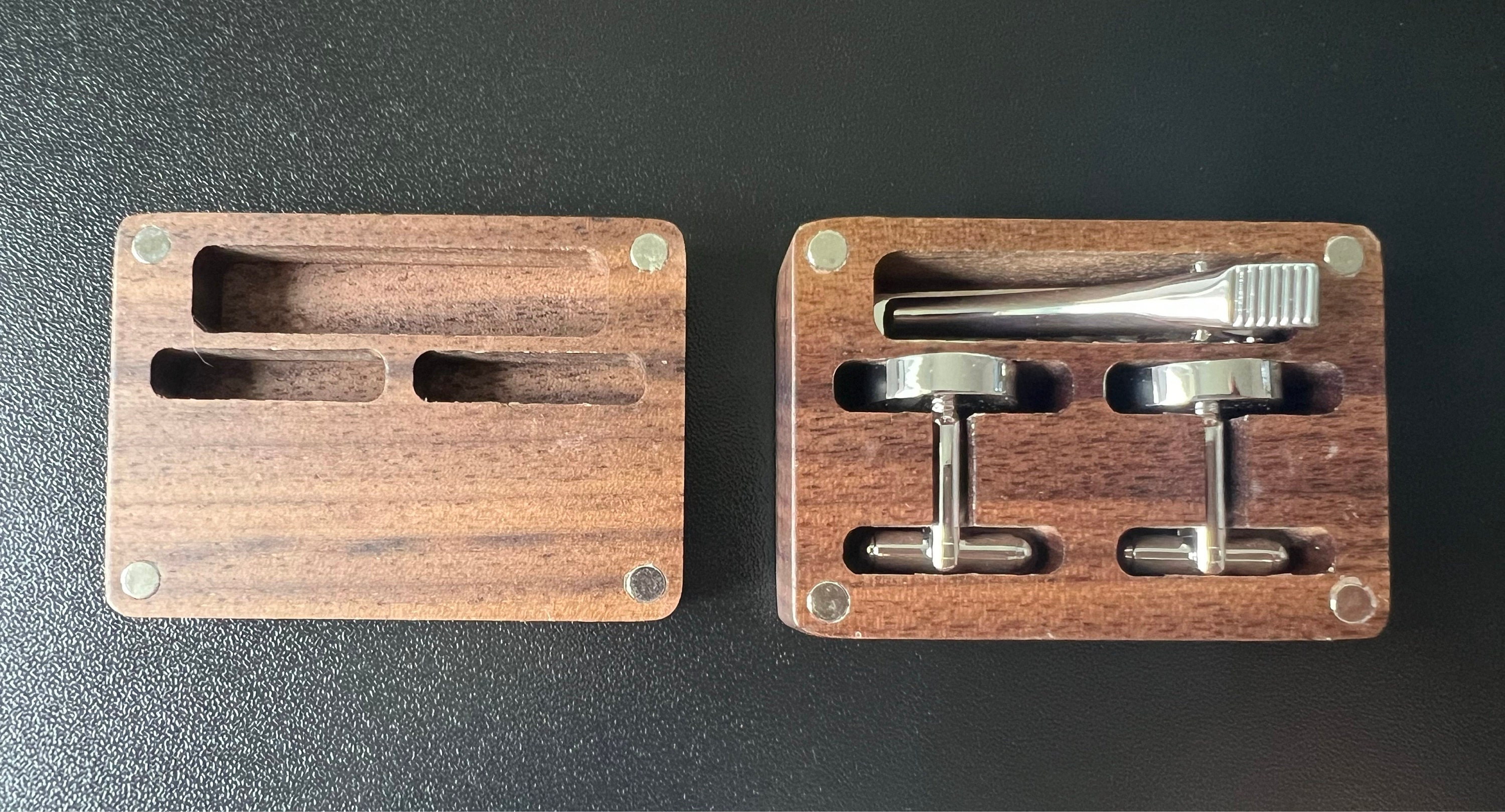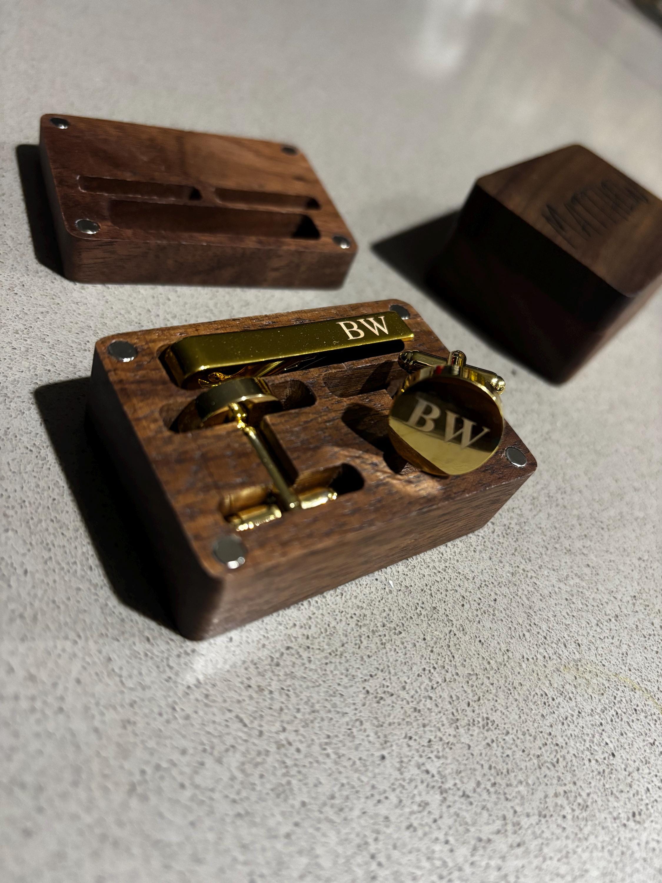 This is a beautiful set of men's custom cufflinks/tie clips that come with a wooden box.