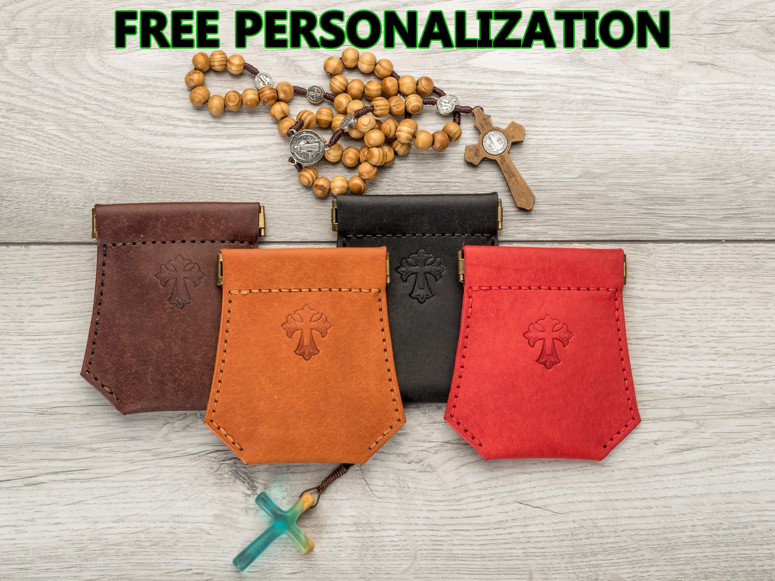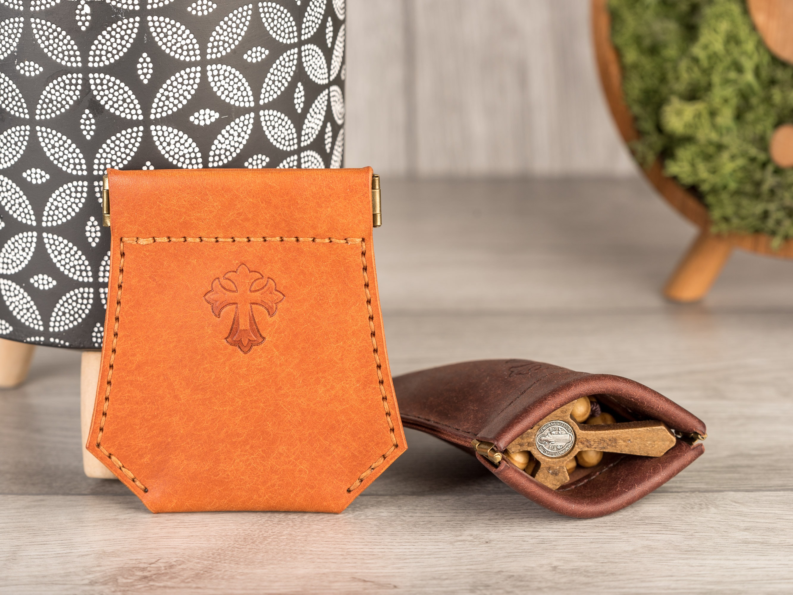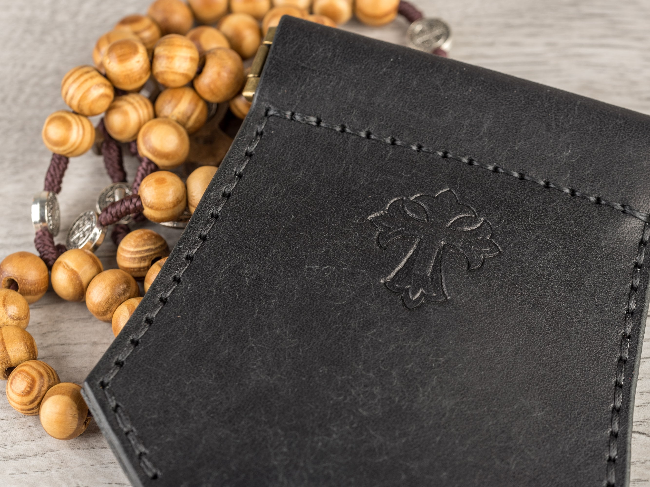 We would like to present You designed by us leather rosary pouch with embossed cross on the front. These pouches are made from top quality Italian, natural Pueblo leather. Pueblo leather is the unique rustic patterning on the grain side of the leather. This gives the leather an almost suede style look, yet feels smoother than suede to touch, with only a slight graininess. This product is 100% handmade: each leather hide is hand selected and the product has been hand cut, hand stitched, and hand finished. Made from 4 oz (1.4-1.6mm) leather. The case is closed with squeeze frame. It is great idea for a gift for catolics, Holy communion or confirmation.