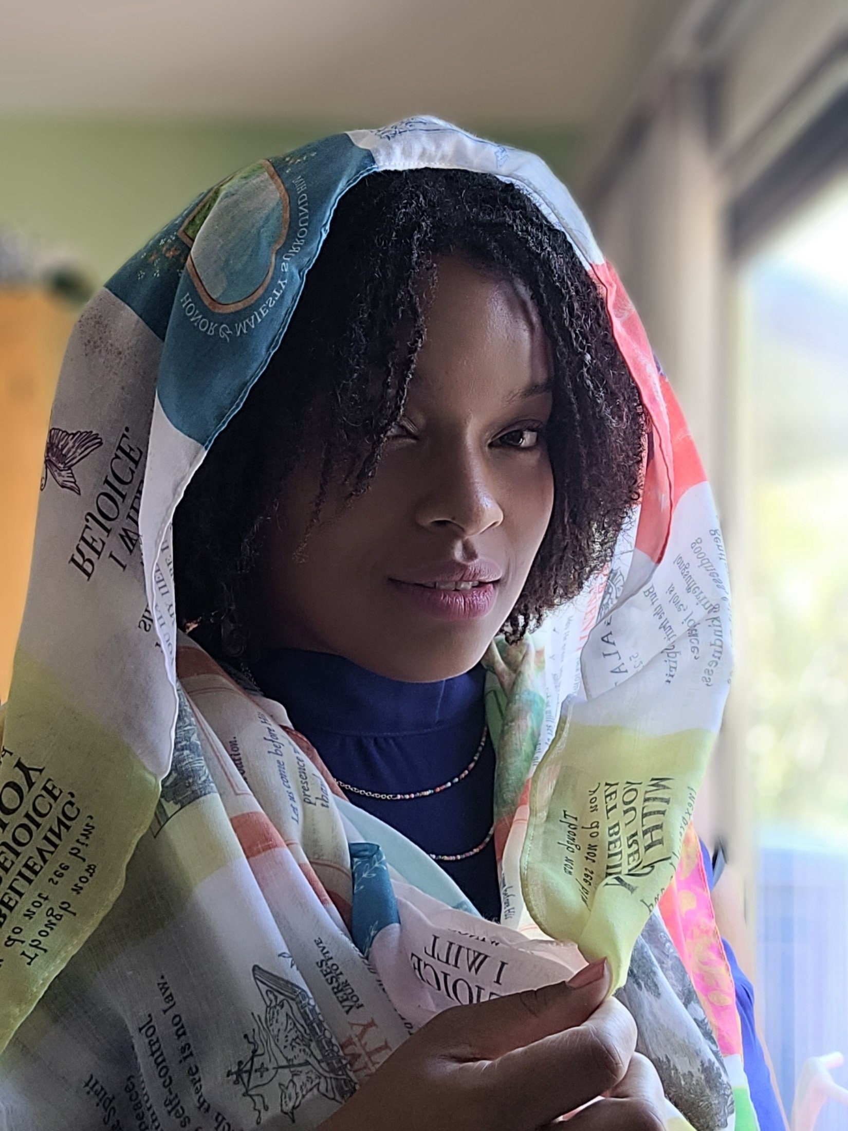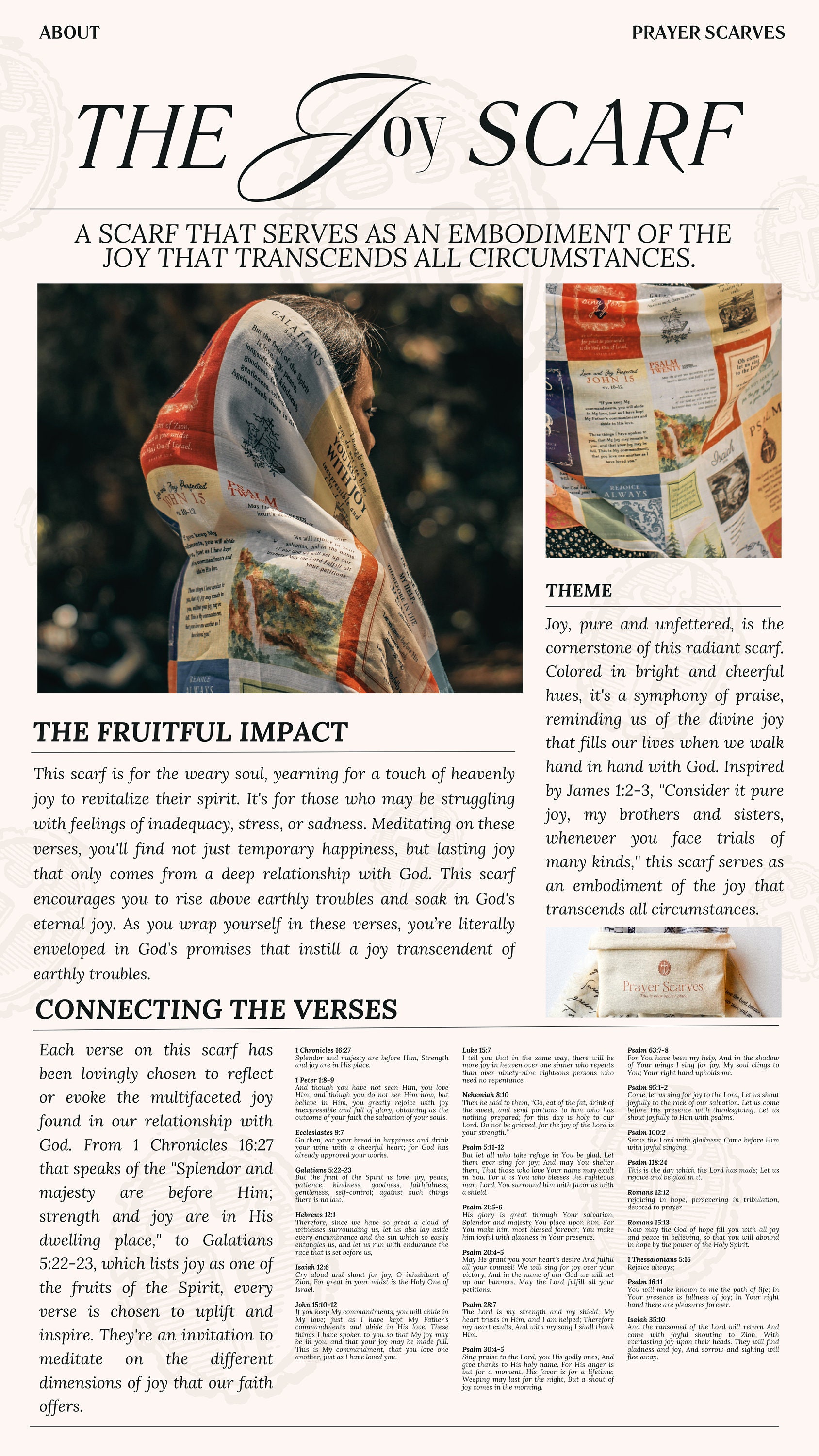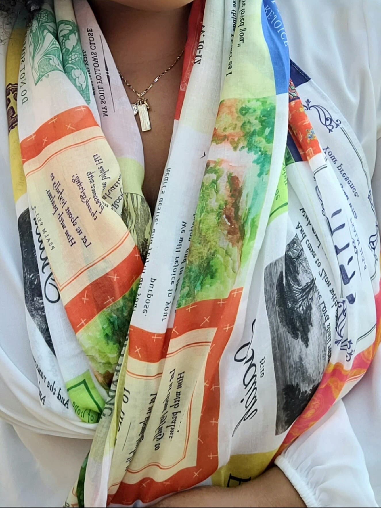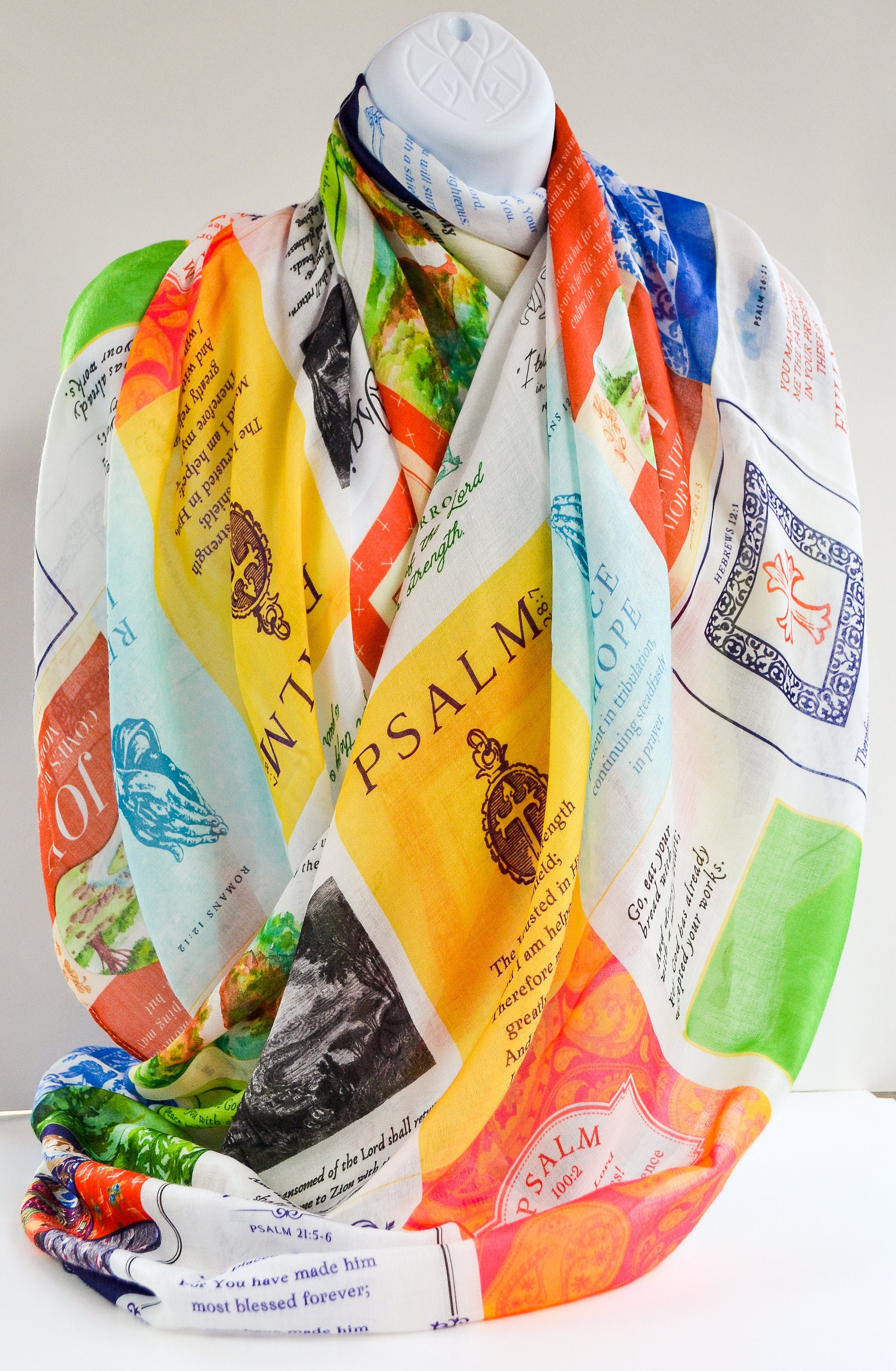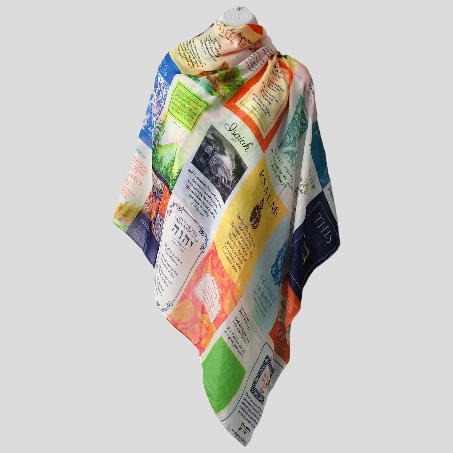 Saturated with colorful Scripture, this scarf sings verses that call us to rejoice in the presence of the Lord. It carries the essence of James 1:2-3 and other joyful Scriptures, weaving a fabric of happiness that will withstand all trials.