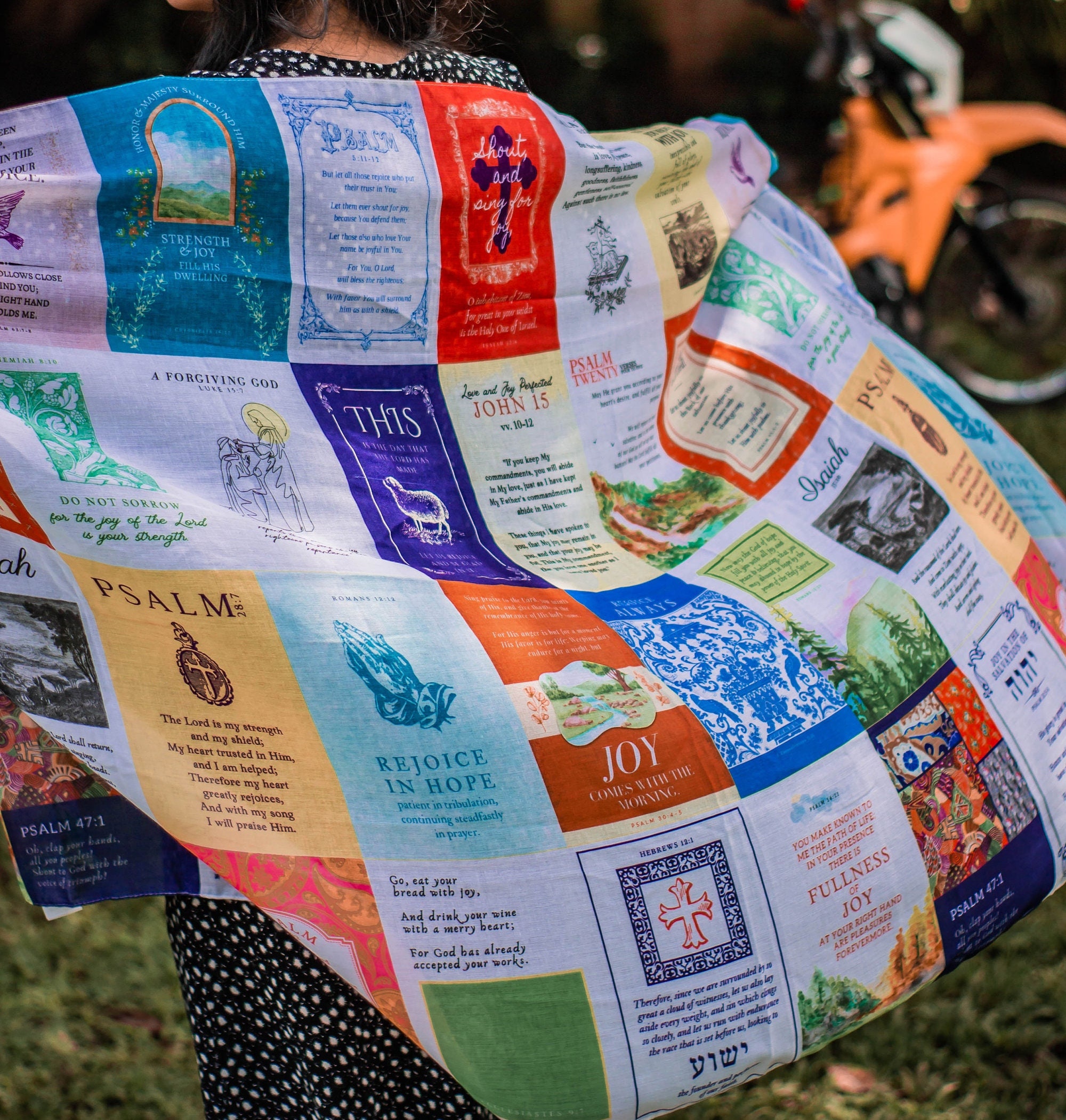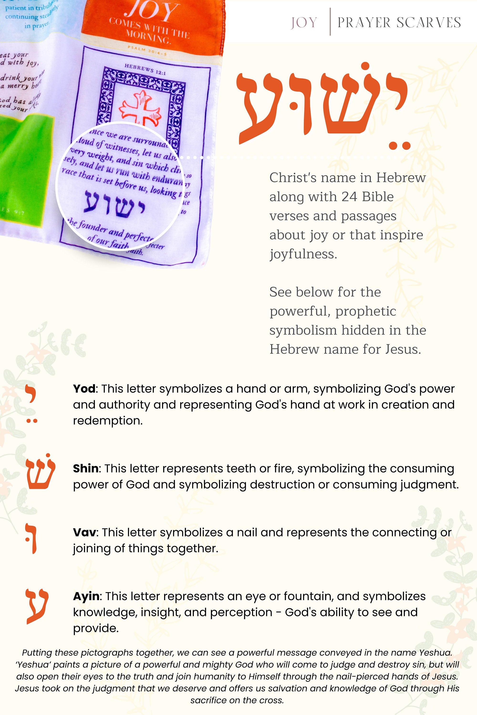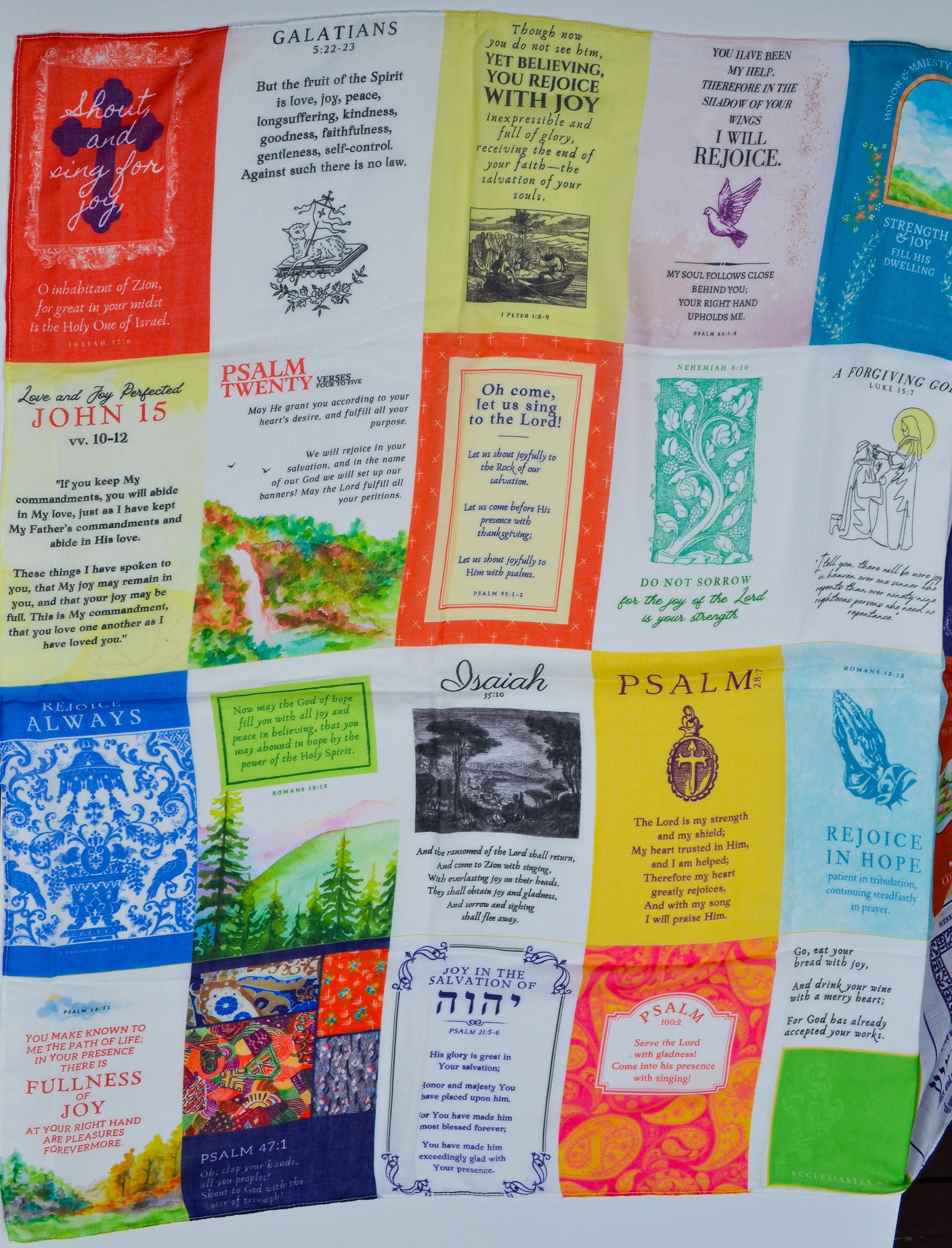 This scarf recalls Scripture from Nehemiah 8:10 to John 15:10-12, wrapping you in God’s joyful redemption narrative. The Scriptures are a collage of encouragement, celebrating the various joys in a life of faith: