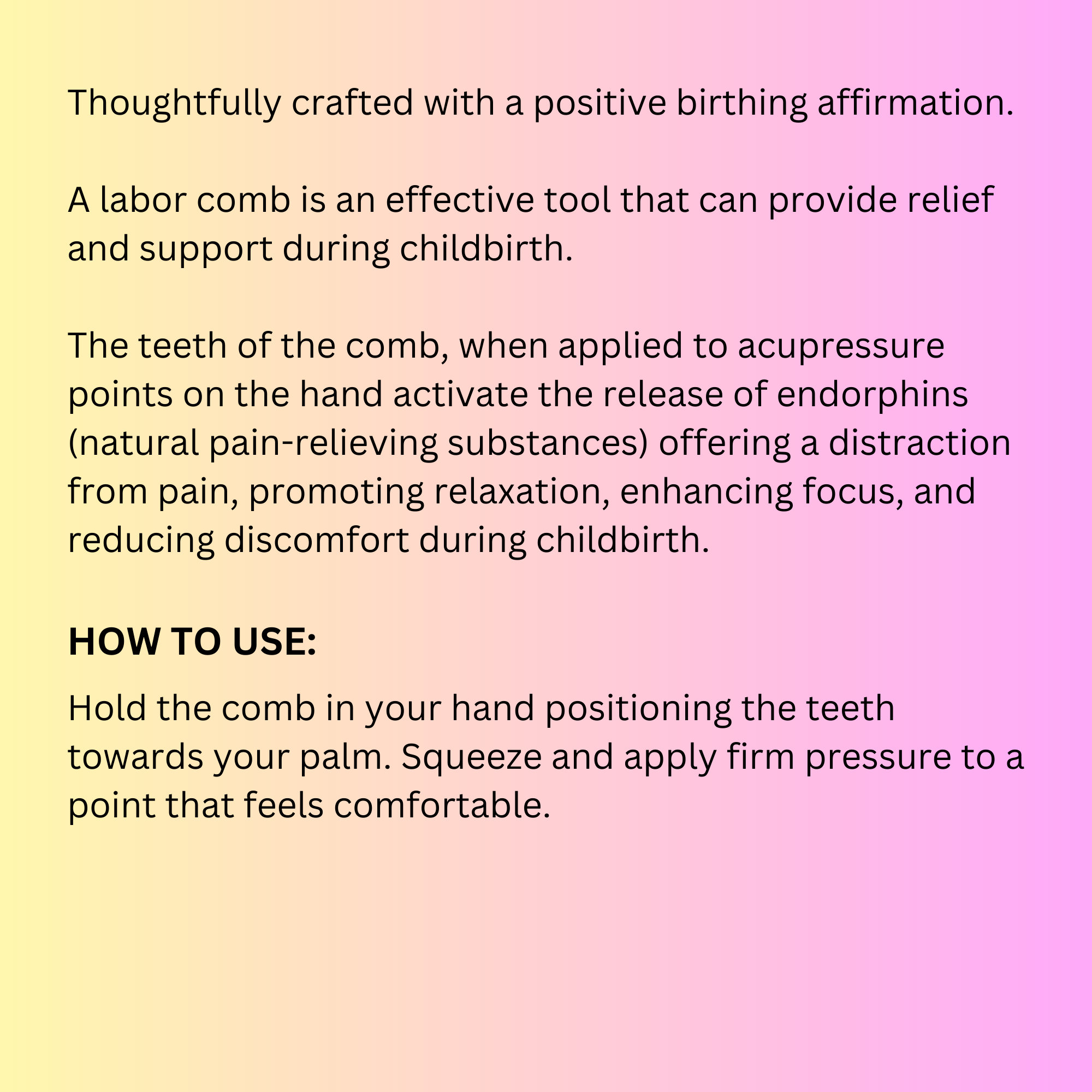 Engraved Labor and Delivery Comb. Thoughtfully crafted with a positive birthing affirmation. This wood comb is designed to ease discomfort and promote relaxation during labor and delivery. Activate endorphin (natural pain-relieving substances) release by applying the comb's teeth to hand acupressure points, easing pain, enhancing focus, and promoting relaxation during childbirth."