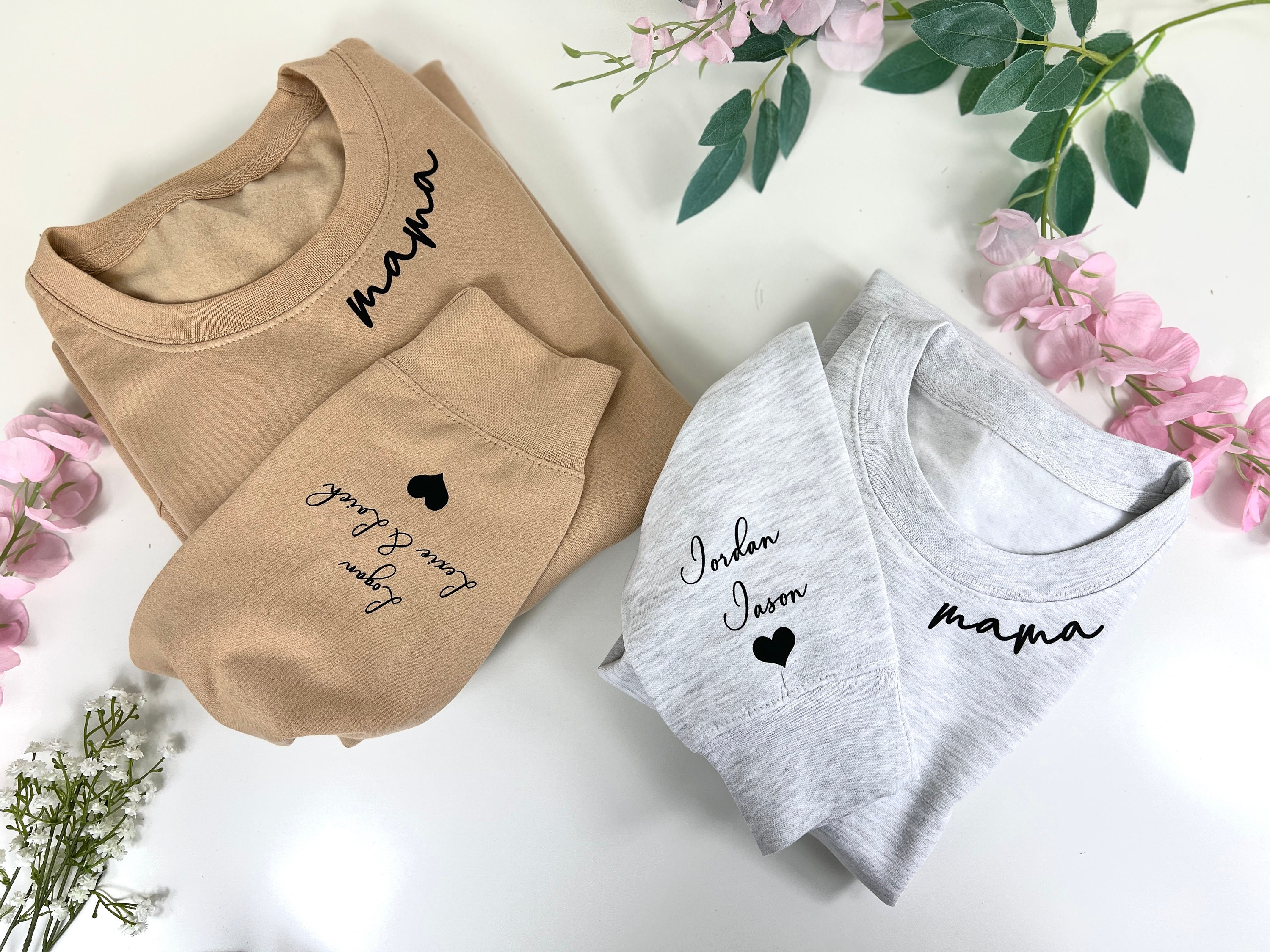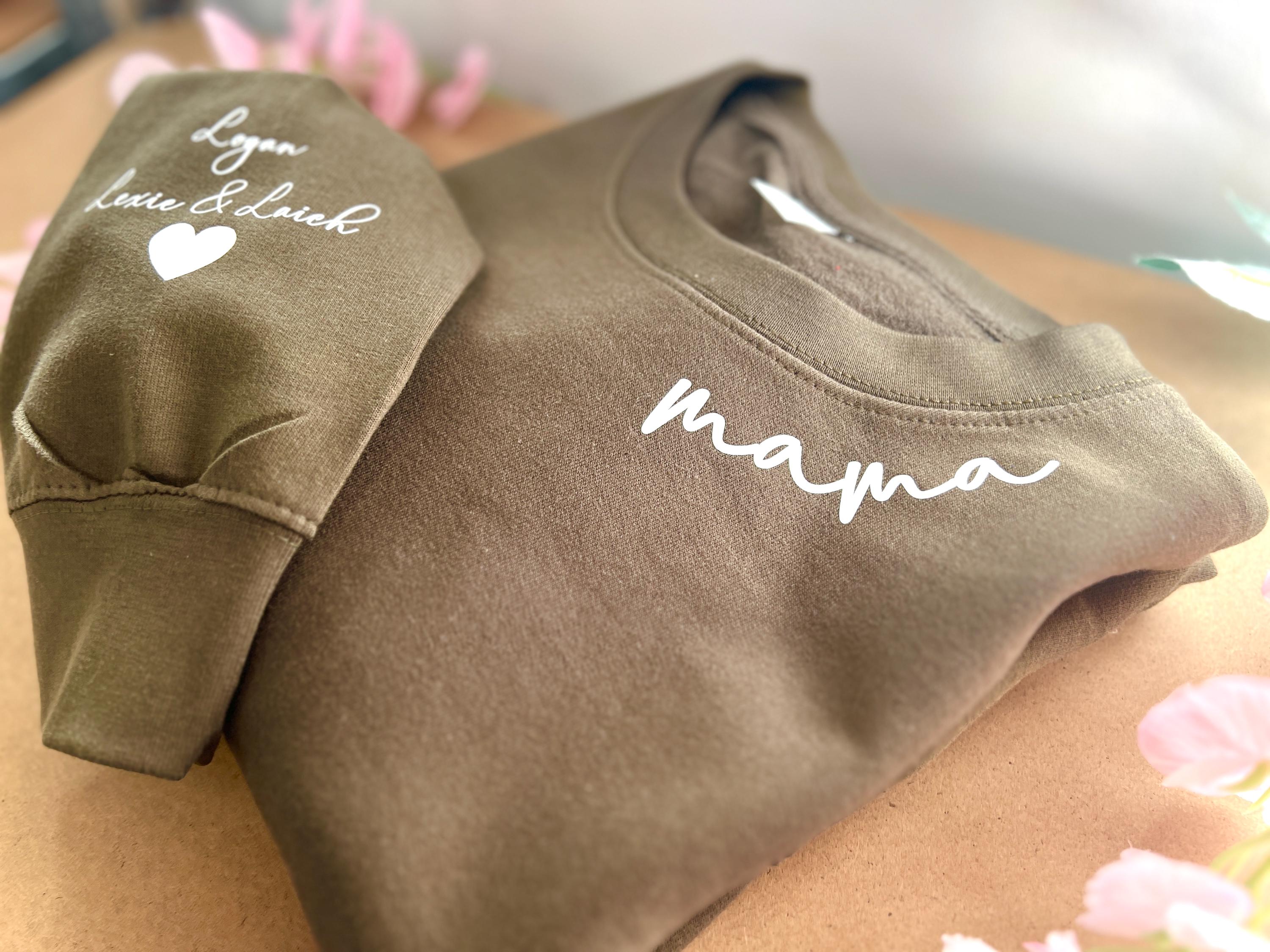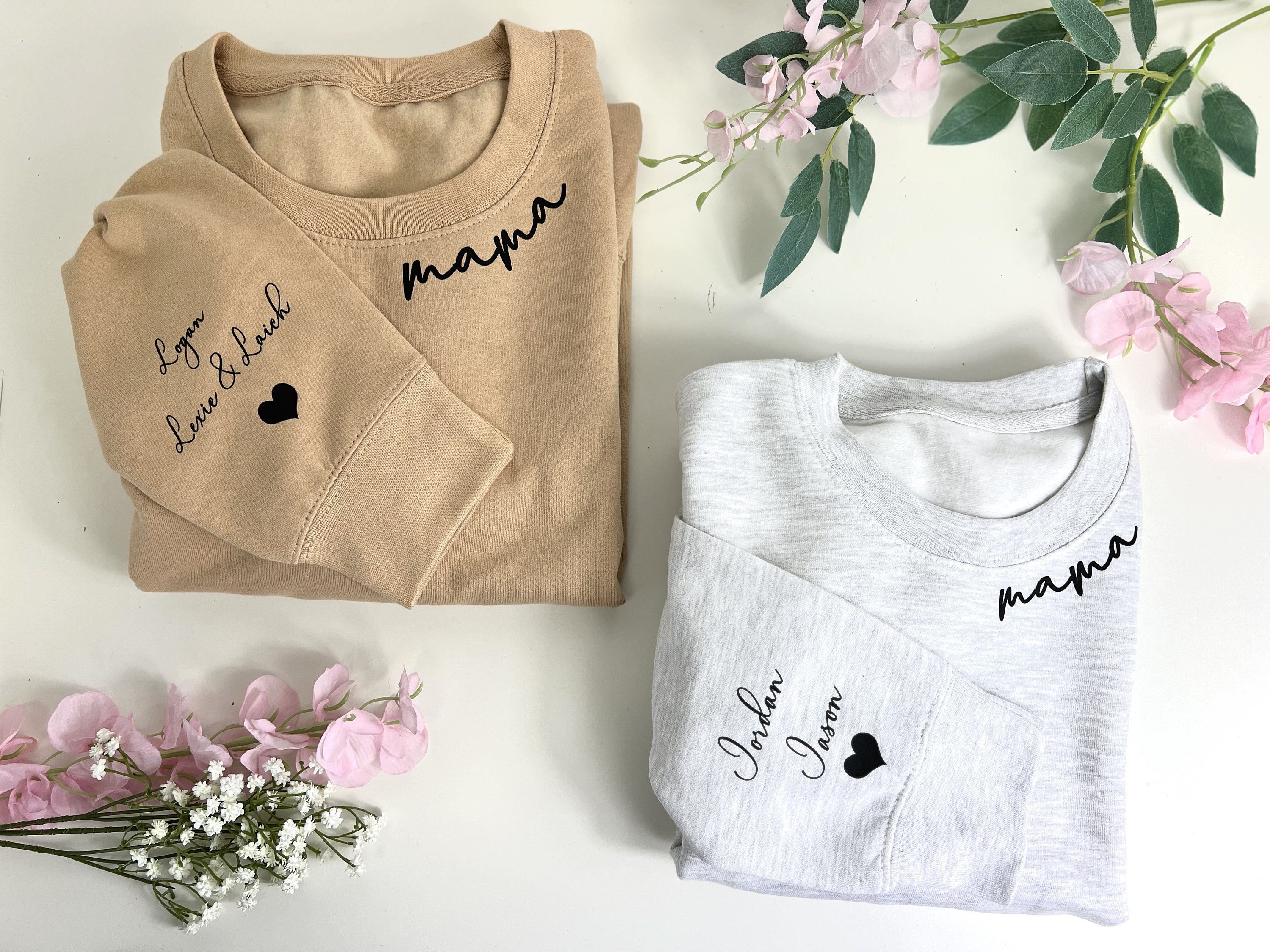 This is the perfect Mother's Day gift for her! A sweater made for Mama. The perfect gift for Mother's Day, or for a mother's birthday, valentines day or just a treat! With Mama design on the neckline with the choice to add each child's name on the sleeve this is the perfect personalised gift for her. Personalize the colour of the sweatshirt to make the ultimate unique gift. This is also a thoughtful Valentine's Day gift for her, and a lovely choice for a First Mother's Day gift.