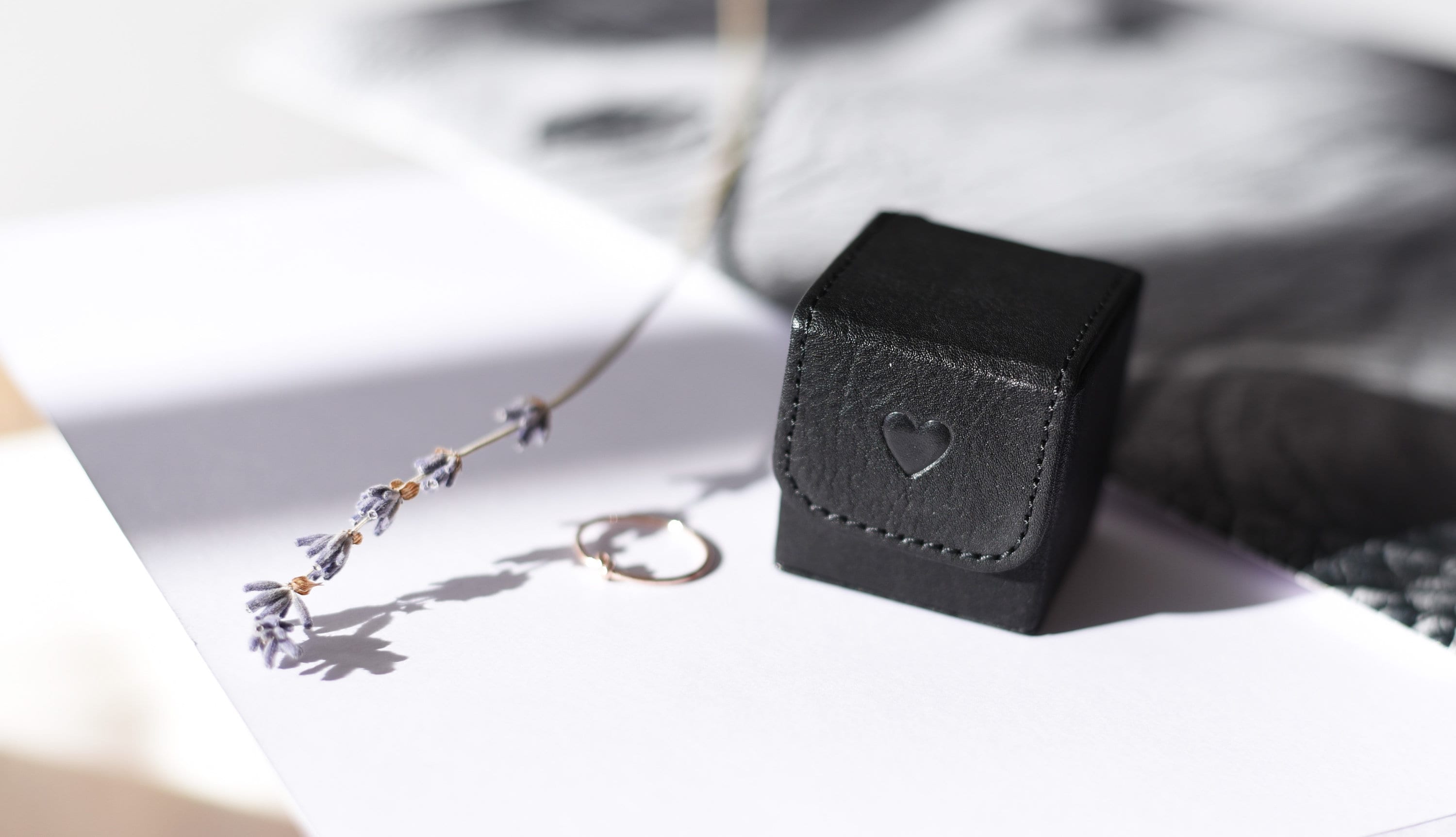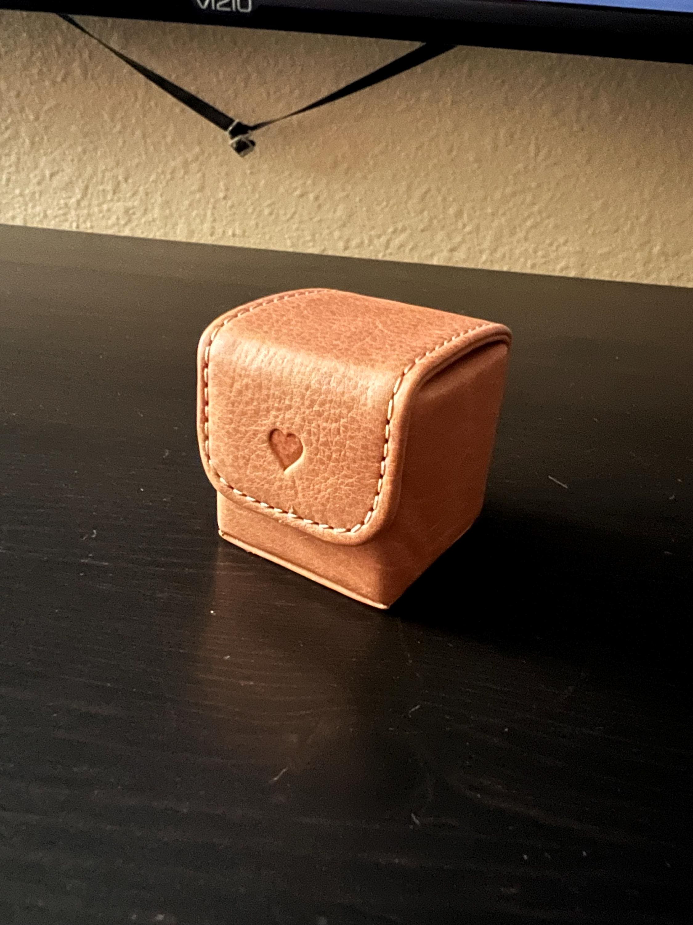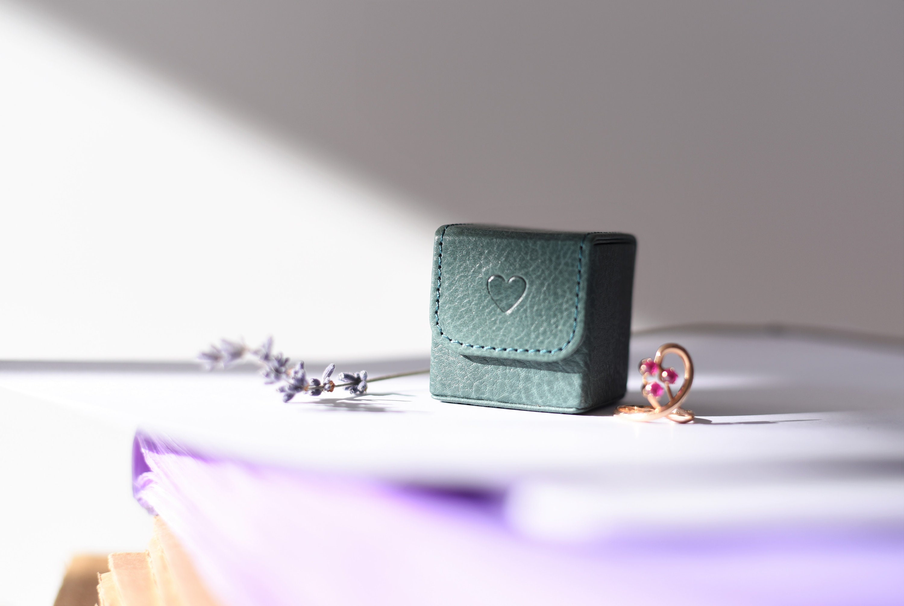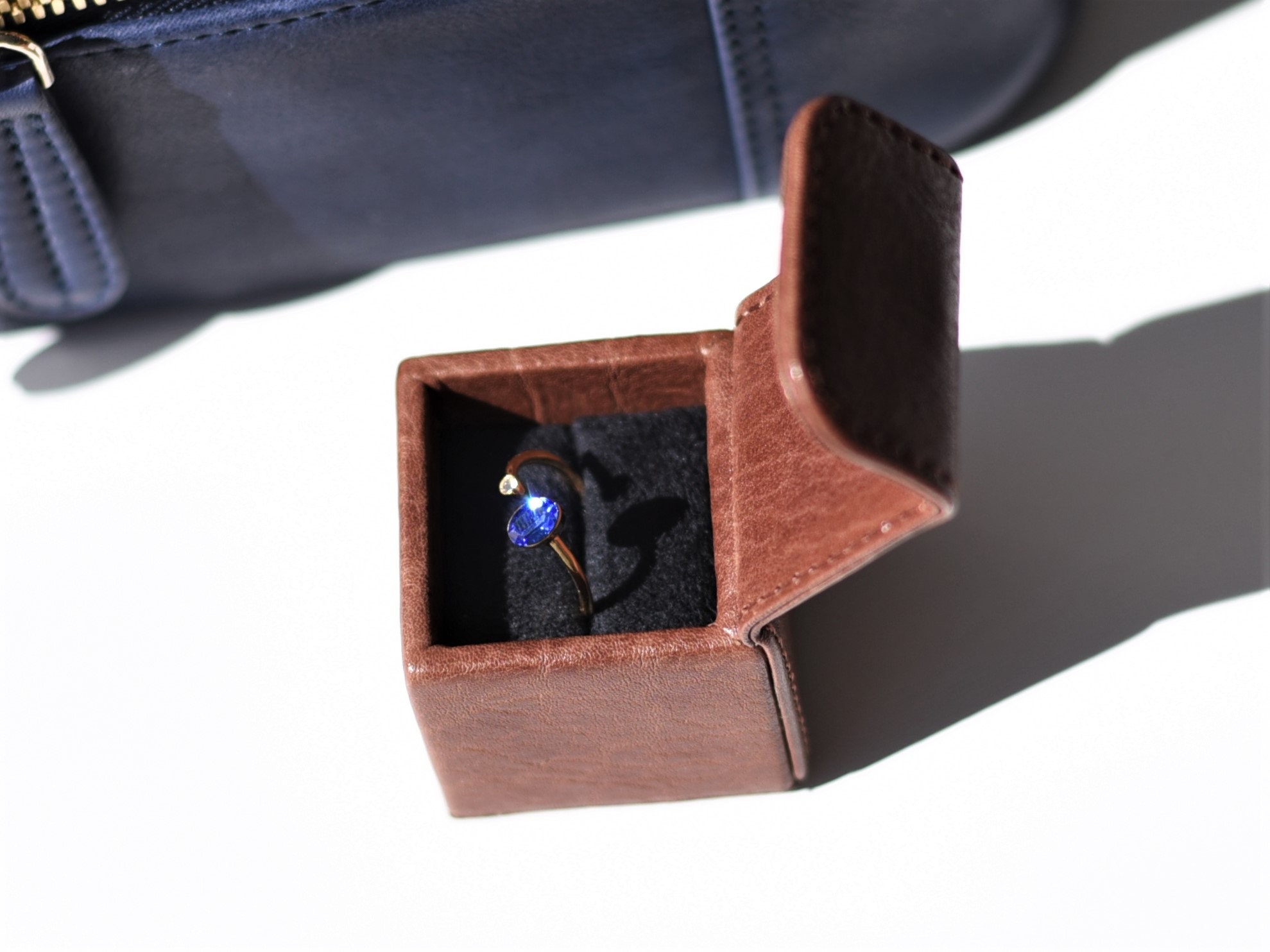 Your very special ring deserves a very special keepsake box 🎁. Made from beautiful full-grain cowhide leather, the keepsake box comes with 2 or 3 soft suede pillows to protect your treasures at home or on the go. The box closes with a secure magnetic flap. It can be personalized with up to 3 characters engraved on the top panel and one on the front panel.