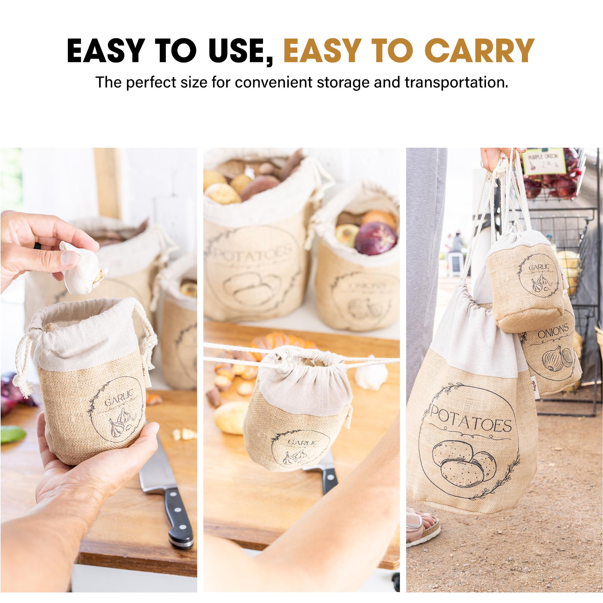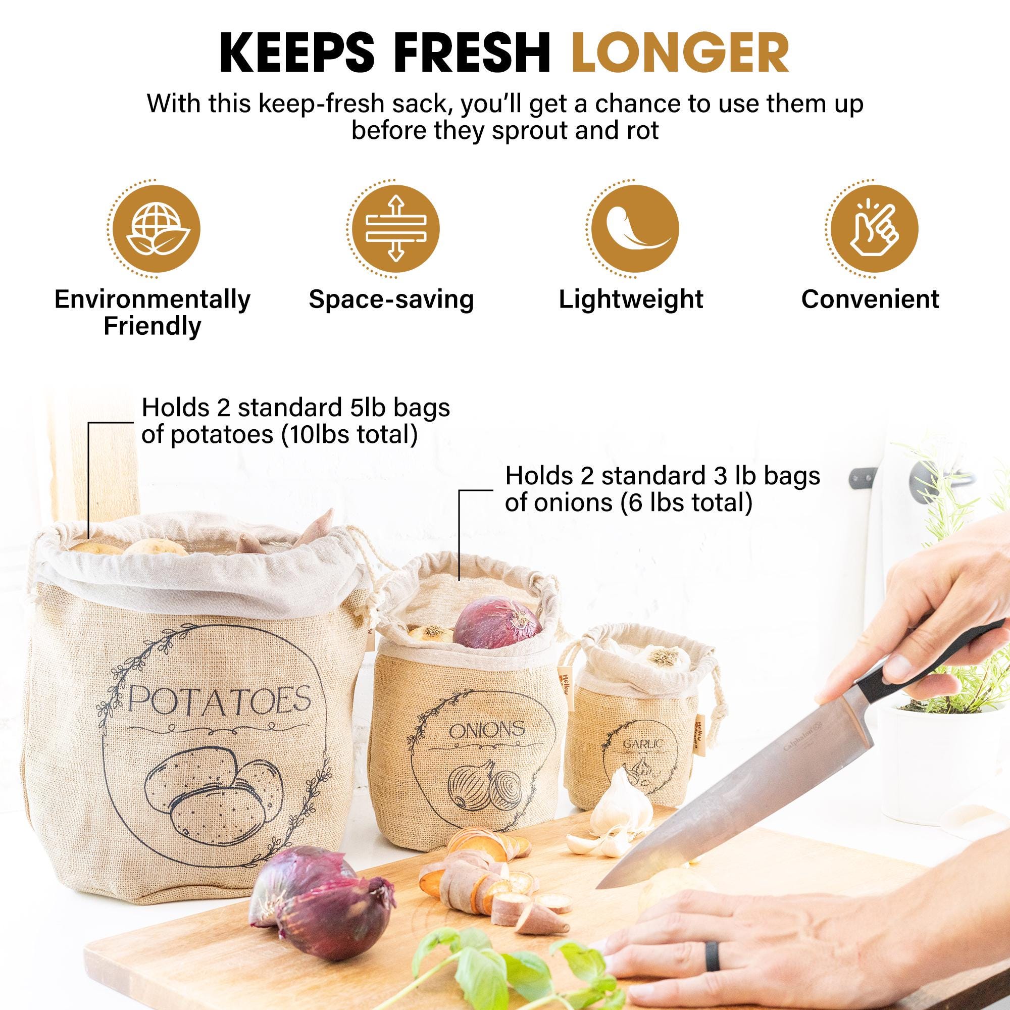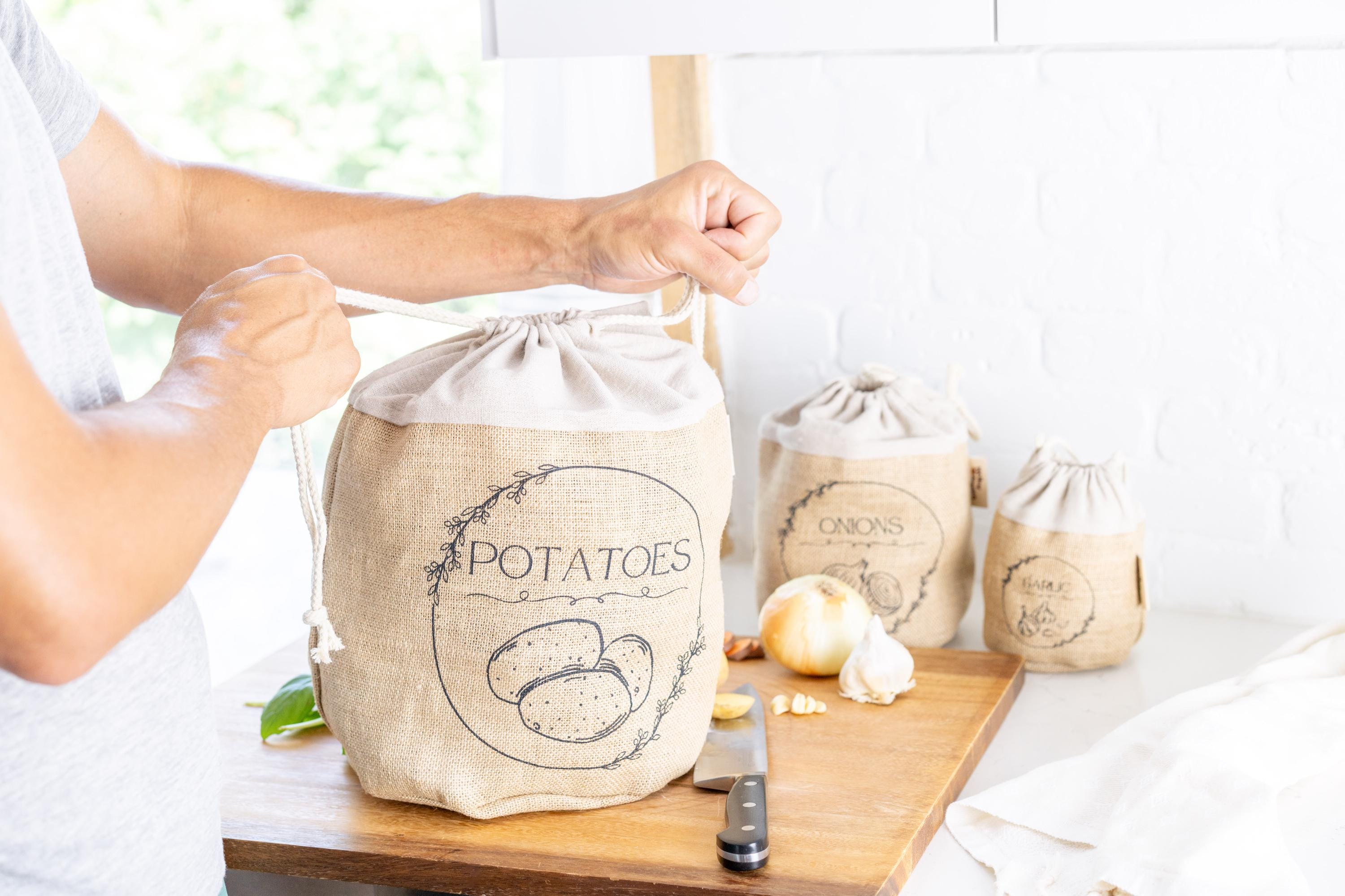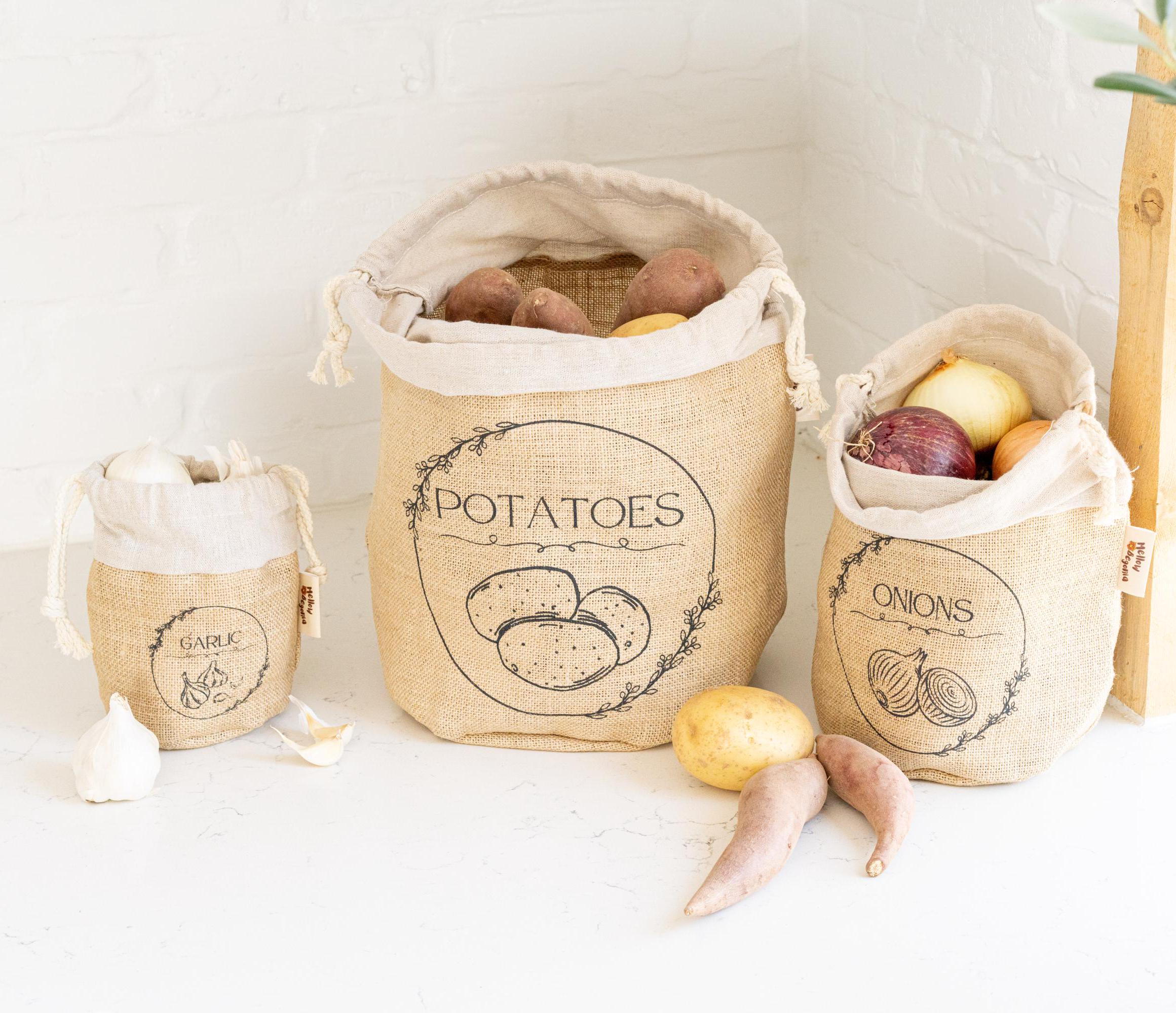 Breathable, washable, natural jute and cotton materials for longer lasting vegetables. Beautiful custom design that blends with any kitchen aesthetic. The potato bag is large enough to hold 10 pounds of potatoes, the onion bag can hold 6 pounds, and the garlic bag can hold 3 large bulbs.