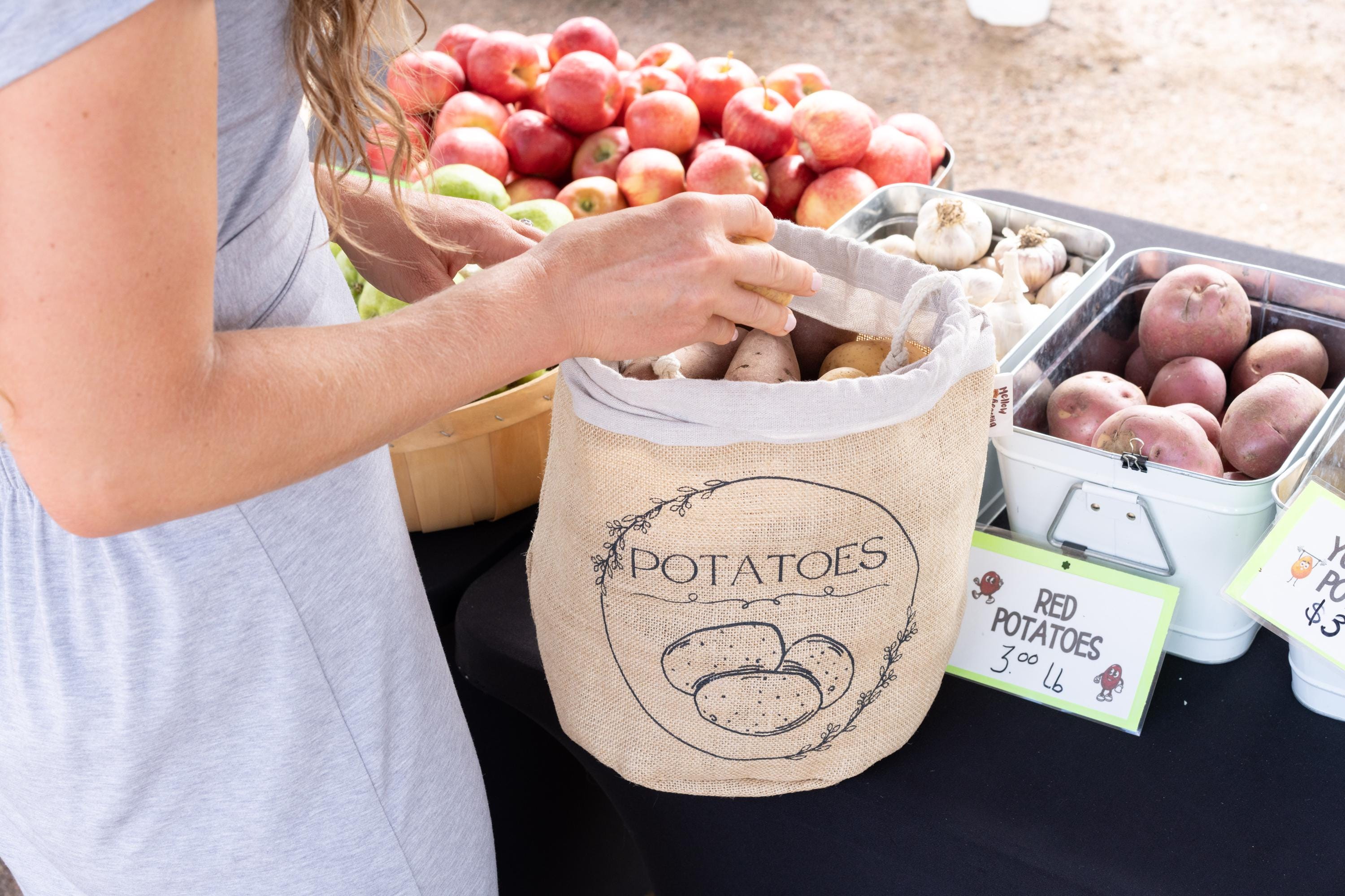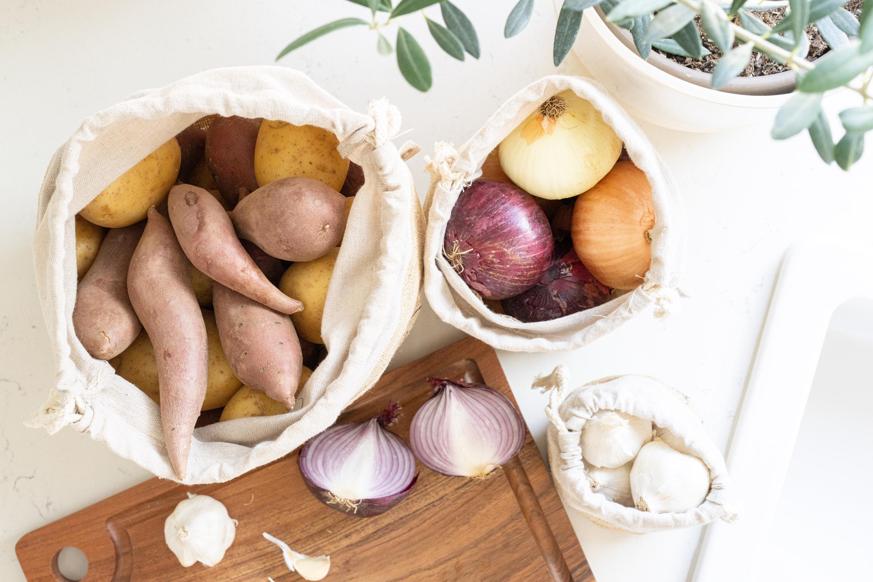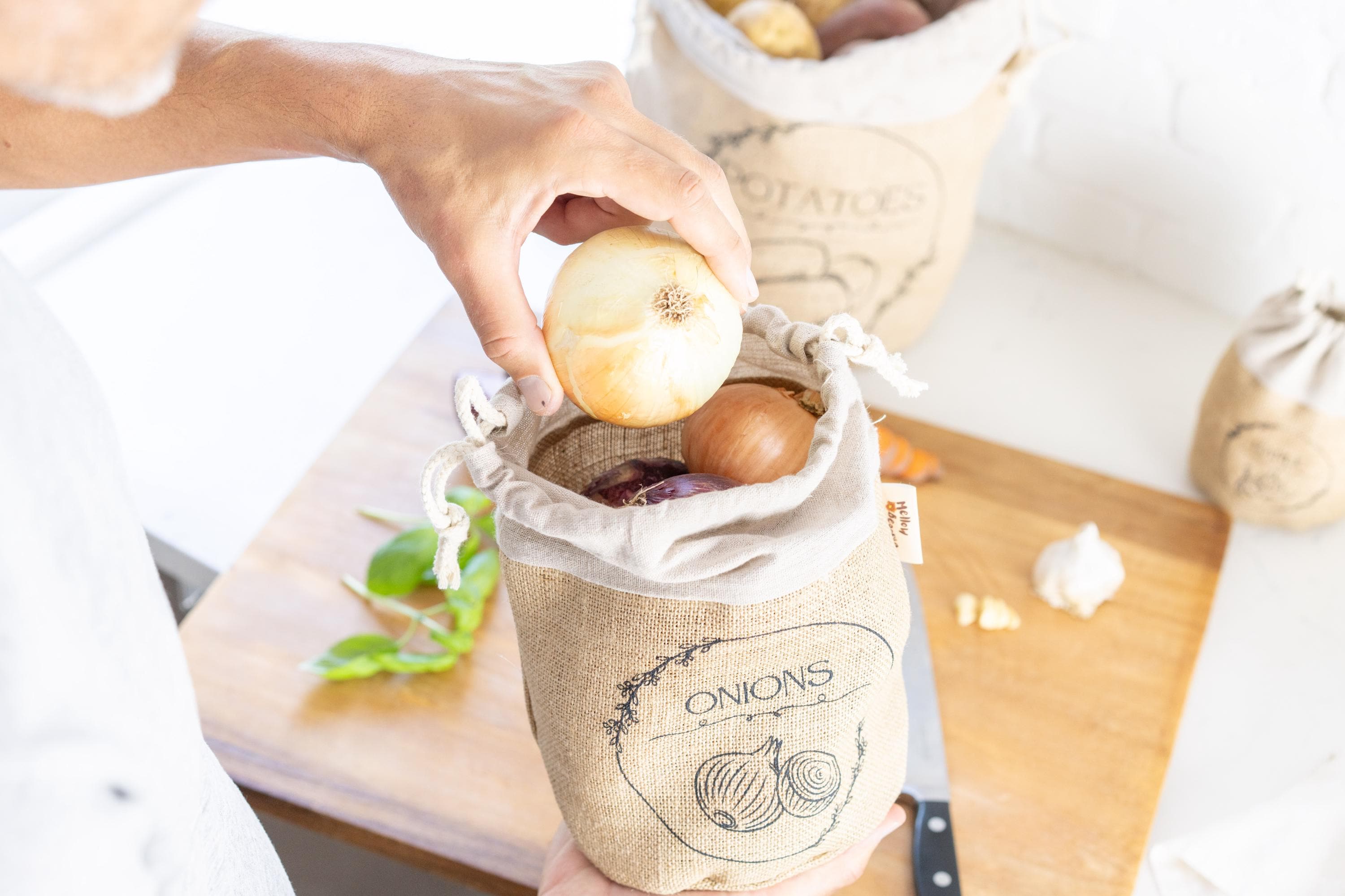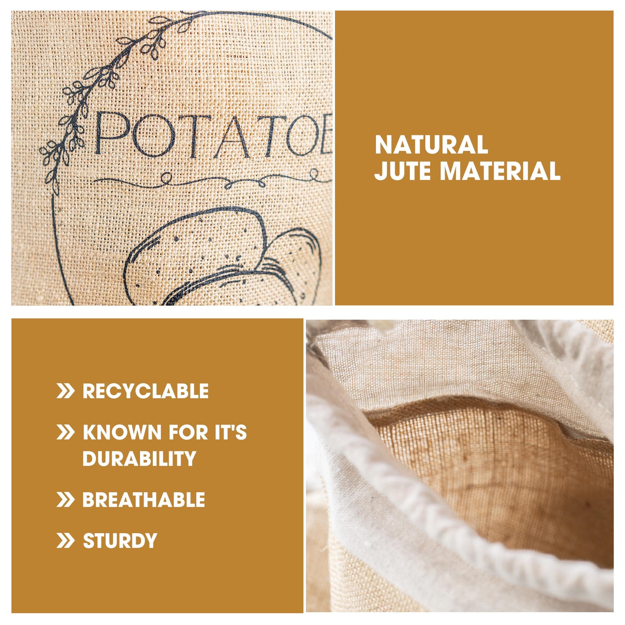 Breathable, washable, natural jute and cotton materials for longer lasting vegetables. Beautiful custom design that blends with any kitchen aesthetic. The potato bag is large enough to hold 10 pounds of potatoes, the onion bag can hold 6 pounds, and the garlic bag can hold 3 large bulbs.