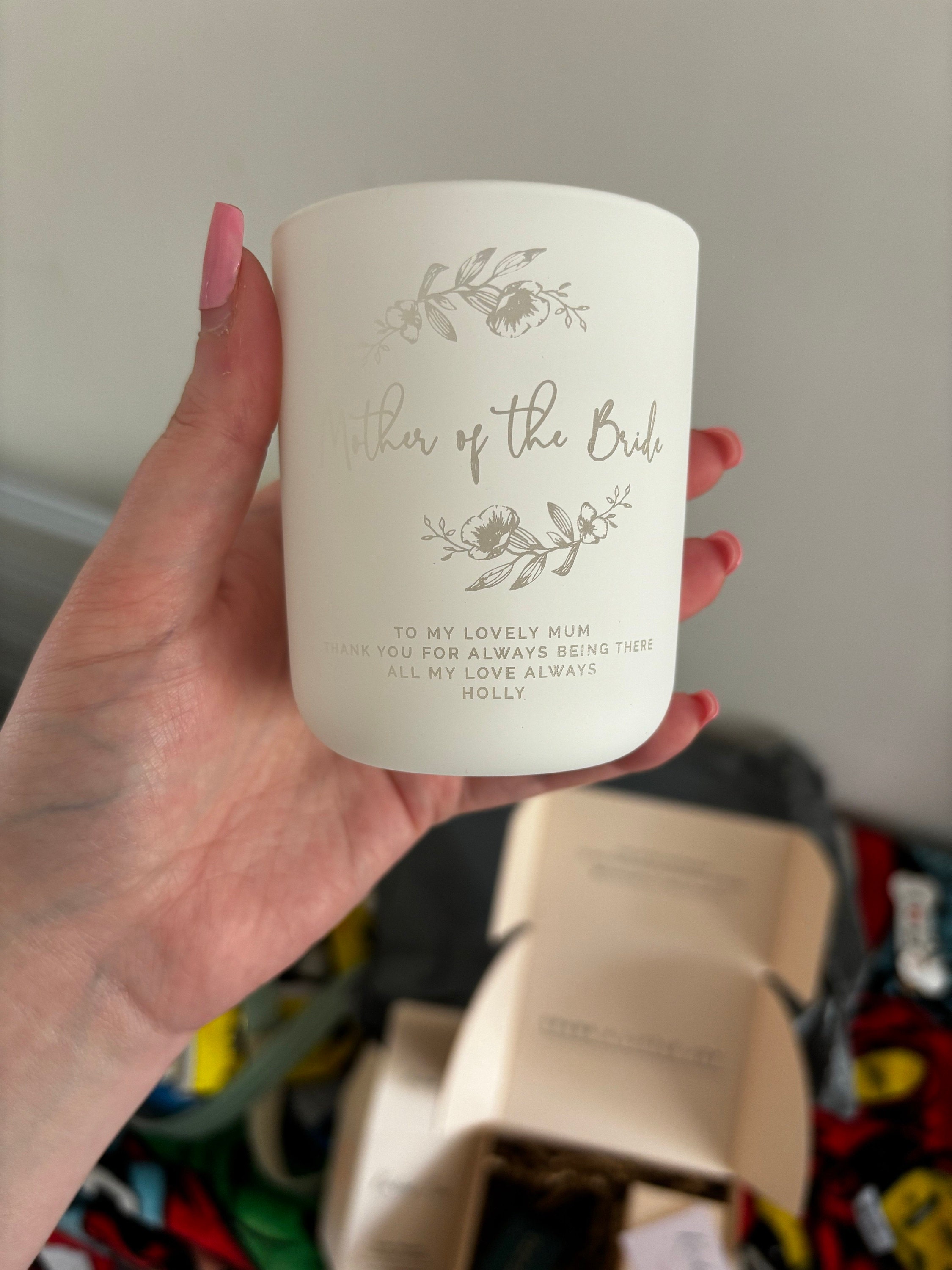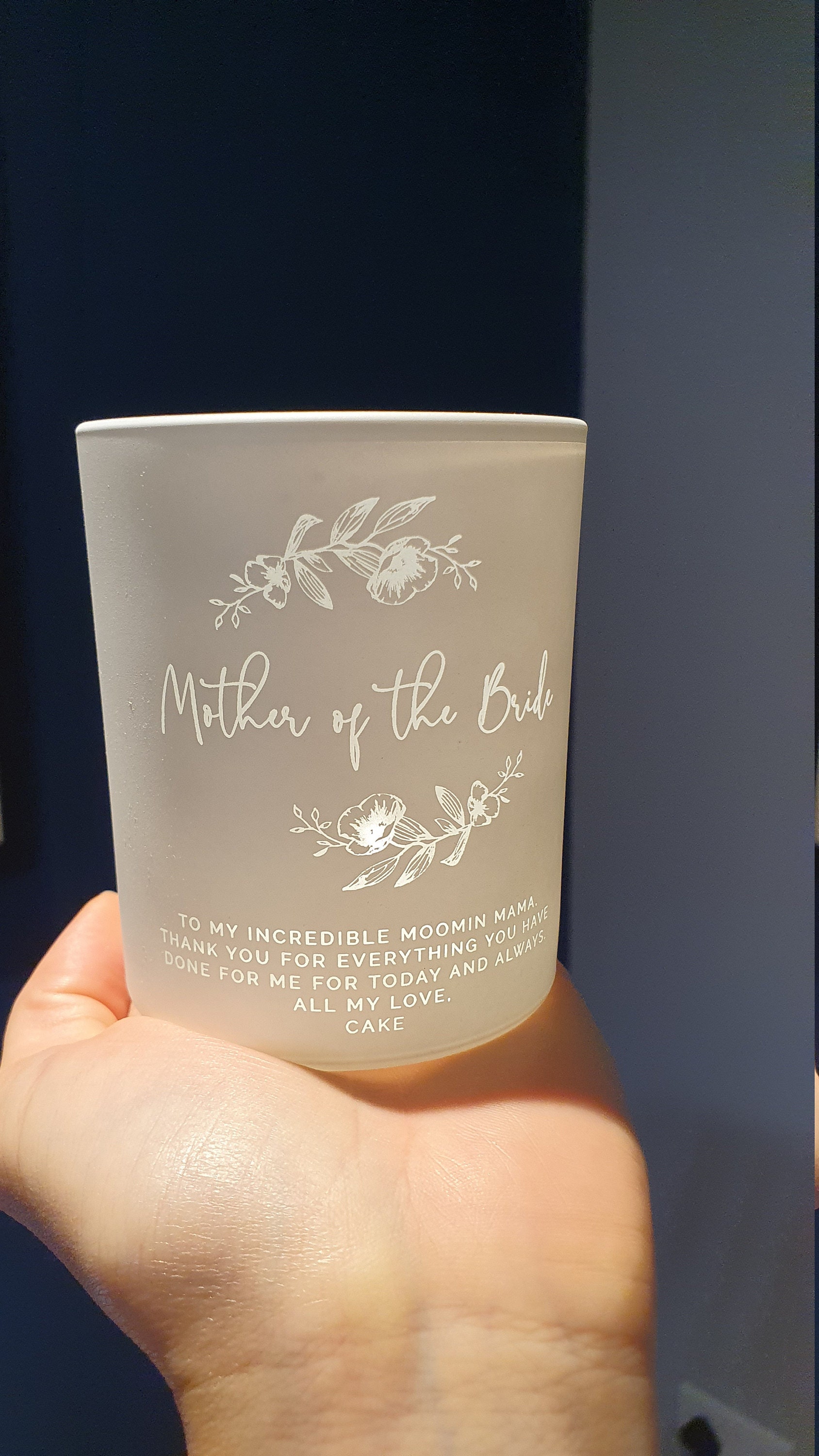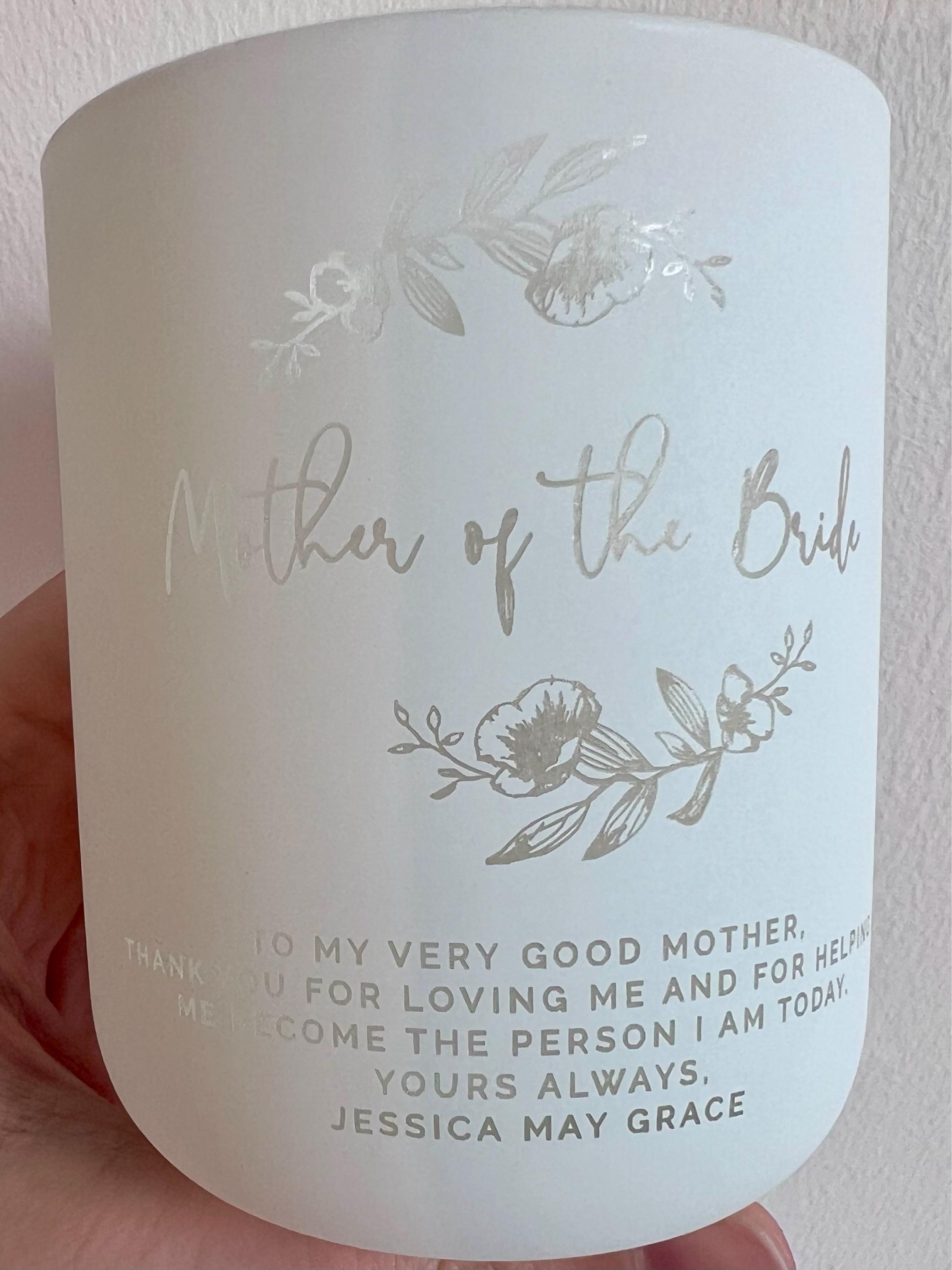 This tea light holder and candle gift set is the perfect gift for the mother of the bride. She will love this sweet tea light holder, a beautiful keepsake to remind her of her daughter's special day. The tea light holder is designed with white matte glass and is handmade in our studio. The front of the tea light holder is engraved with a floral design, romantic Mother of the Bride text and a personalized message where you can express your gratitude to the mother of the bride.