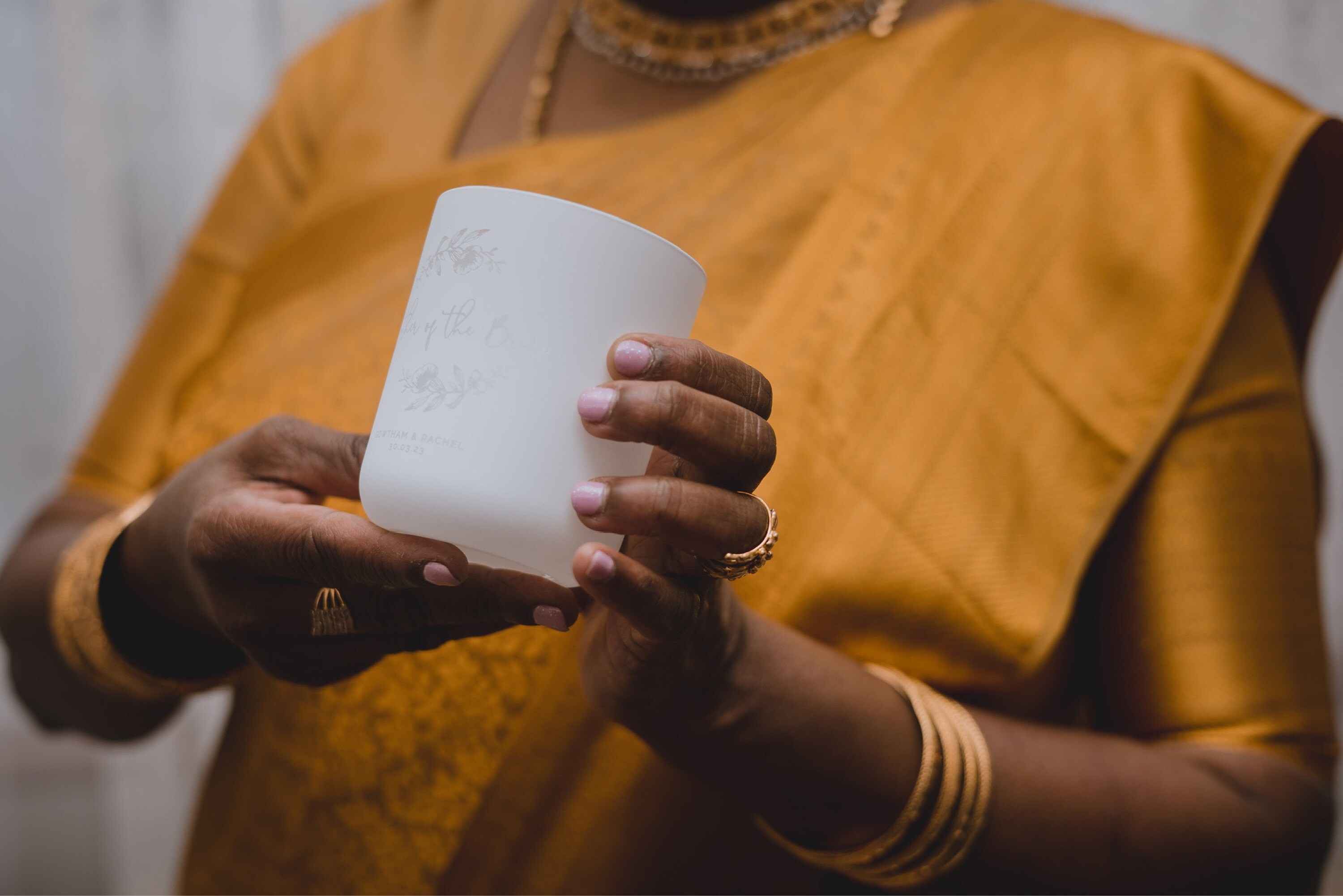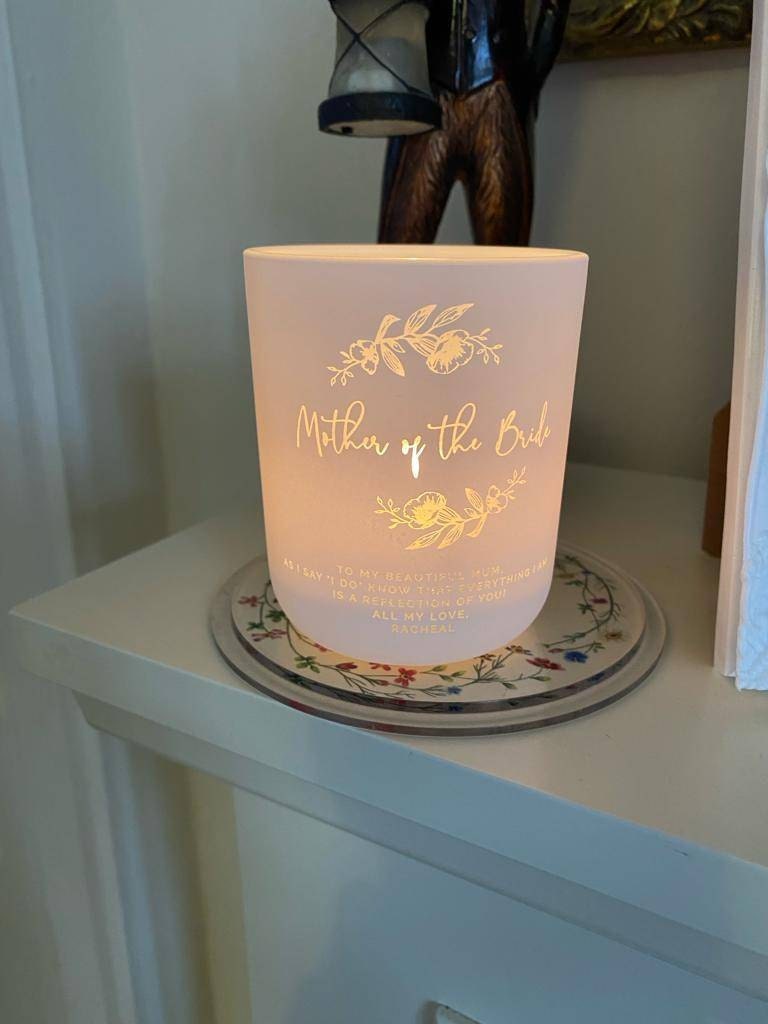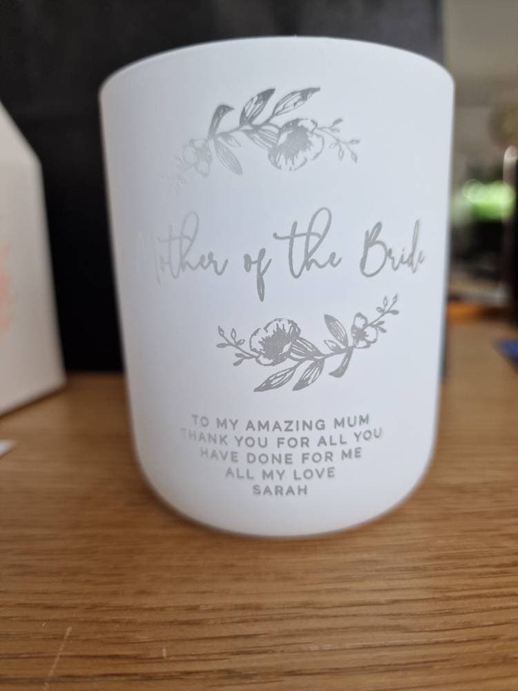 This tea light holder and candle gift set is the perfect gift for the mother of the bride. She will love this sweet tea light holder, a beautiful keepsake to remind her of her daughter's special day. The tea light holder is designed with white matte glass and is handmade in our studio. The front of the tea light holder is engraved with a floral design, romantic Mother of the Bride text and a personalized message where you can express your gratitude to the mother of the bride.