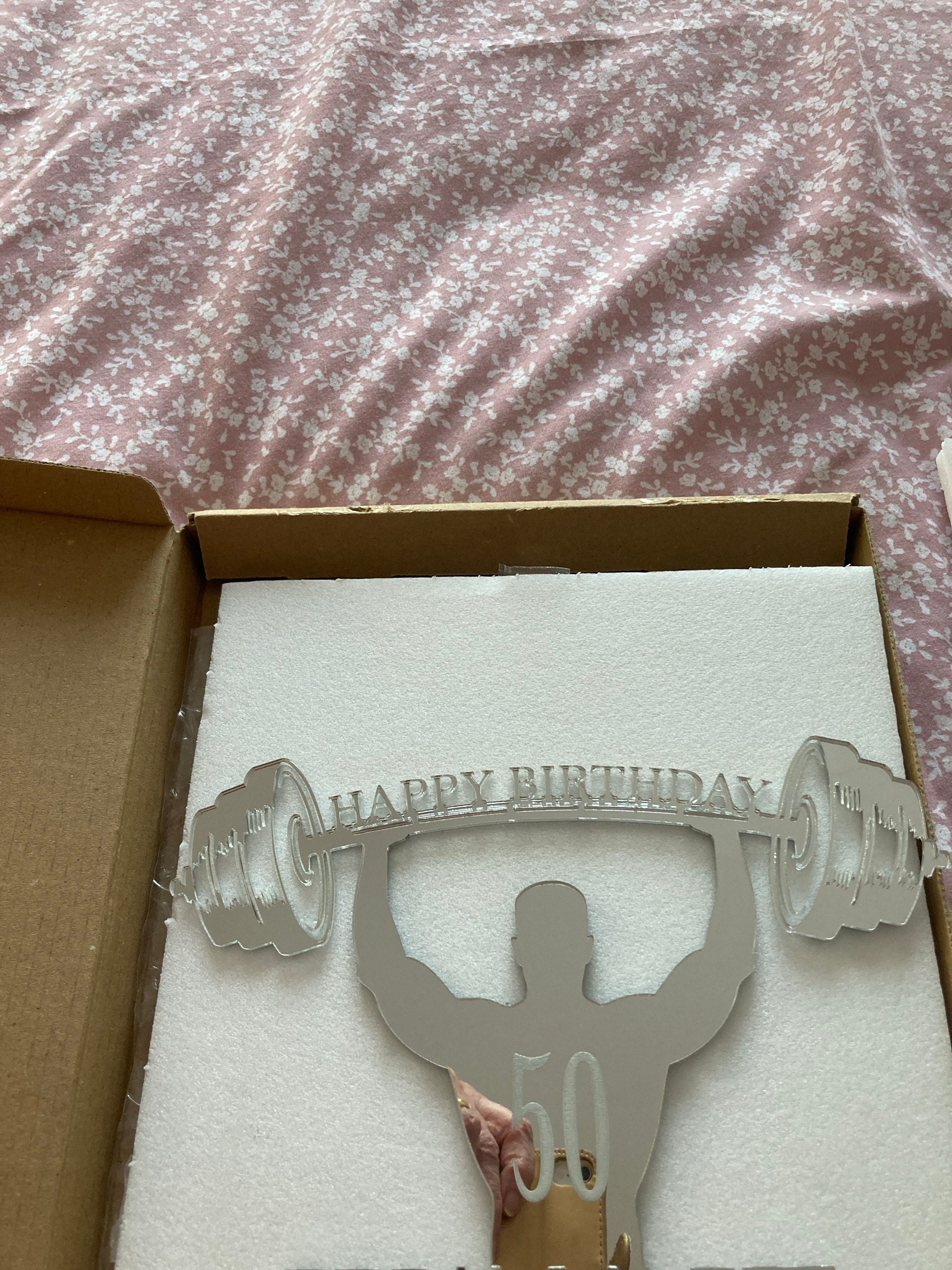 This cake topper comes with a custom name, age and text "Happy Birthday" on the top.