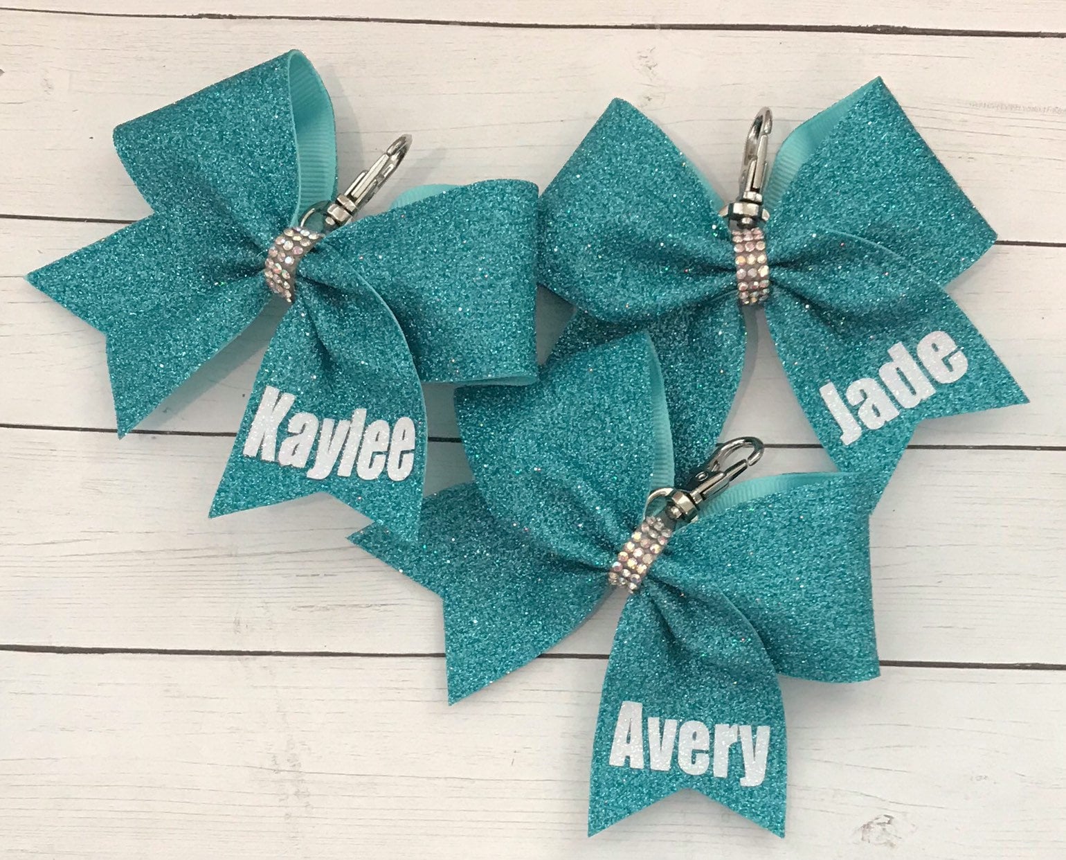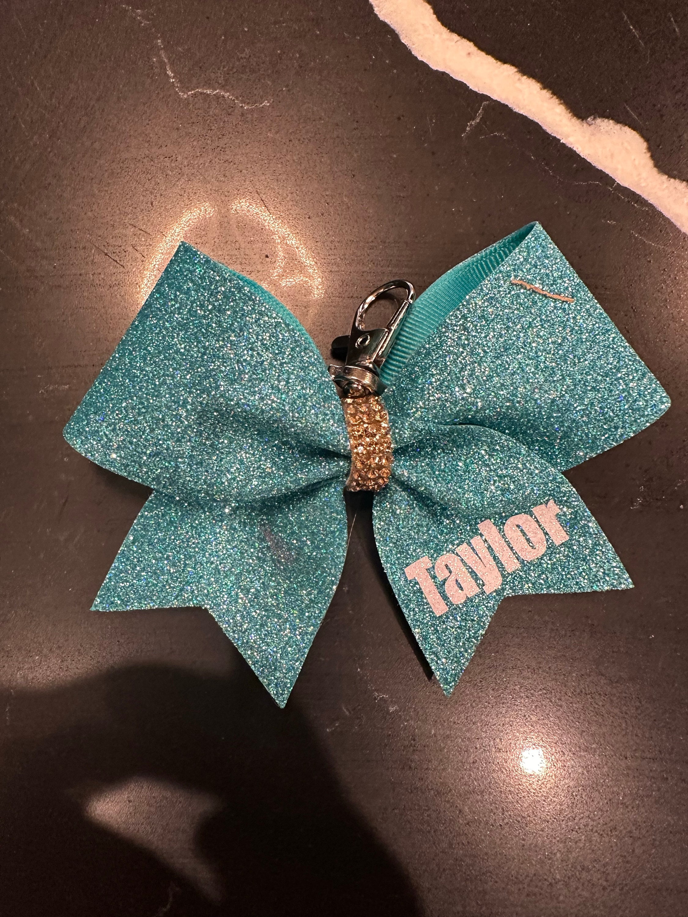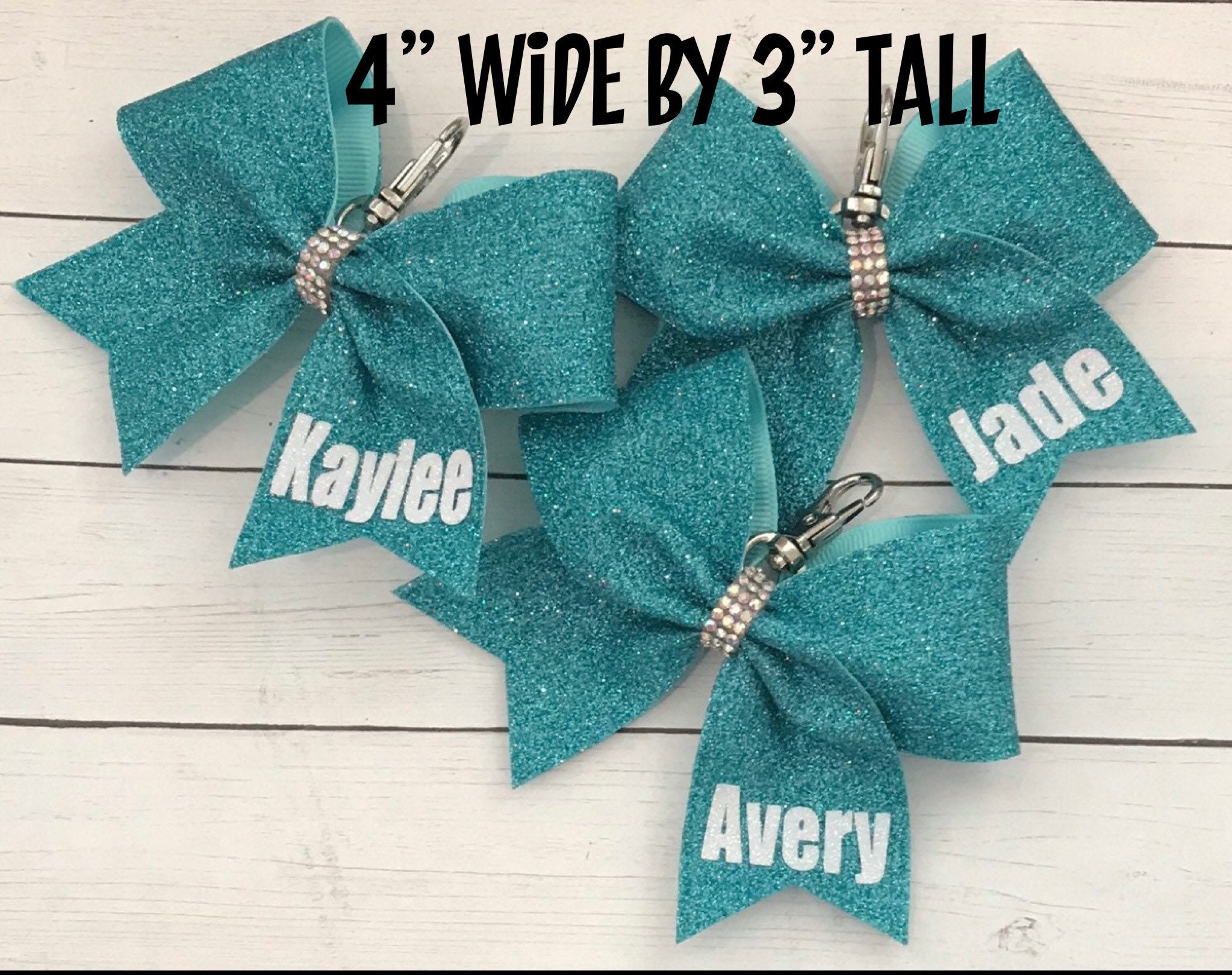 Personalized Cheer Bow Key Chain with Name on Tail only-- Teal 1 Shown, ALL COLORS available. Measures 4x3”.