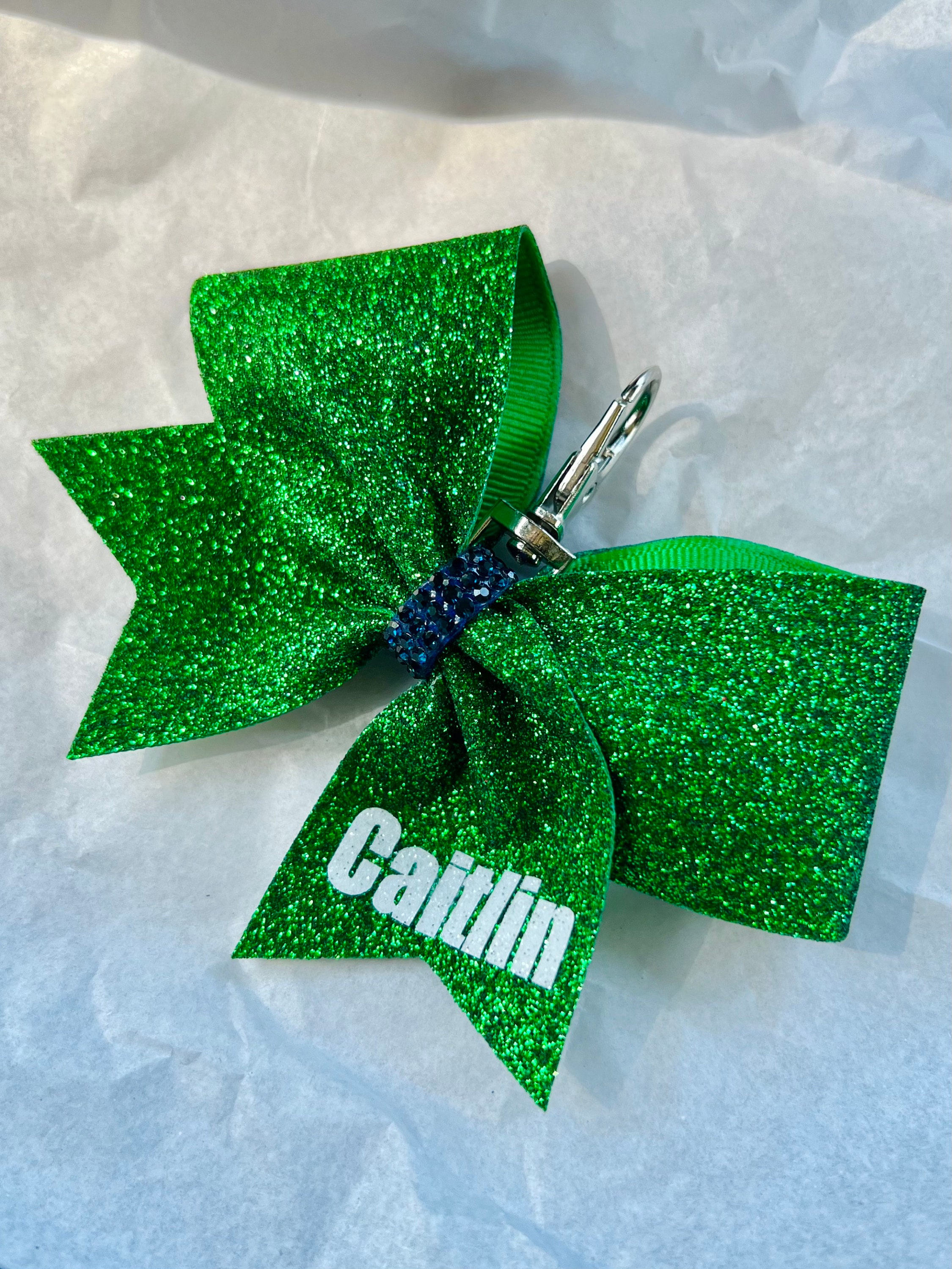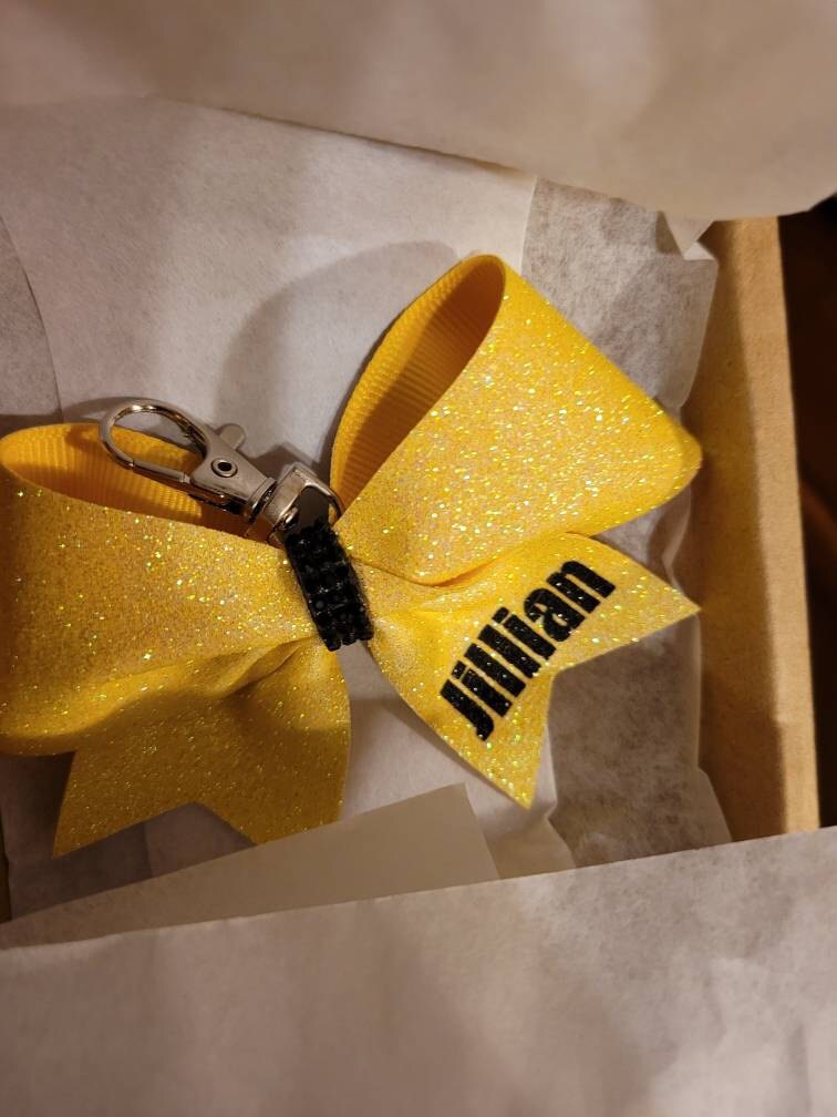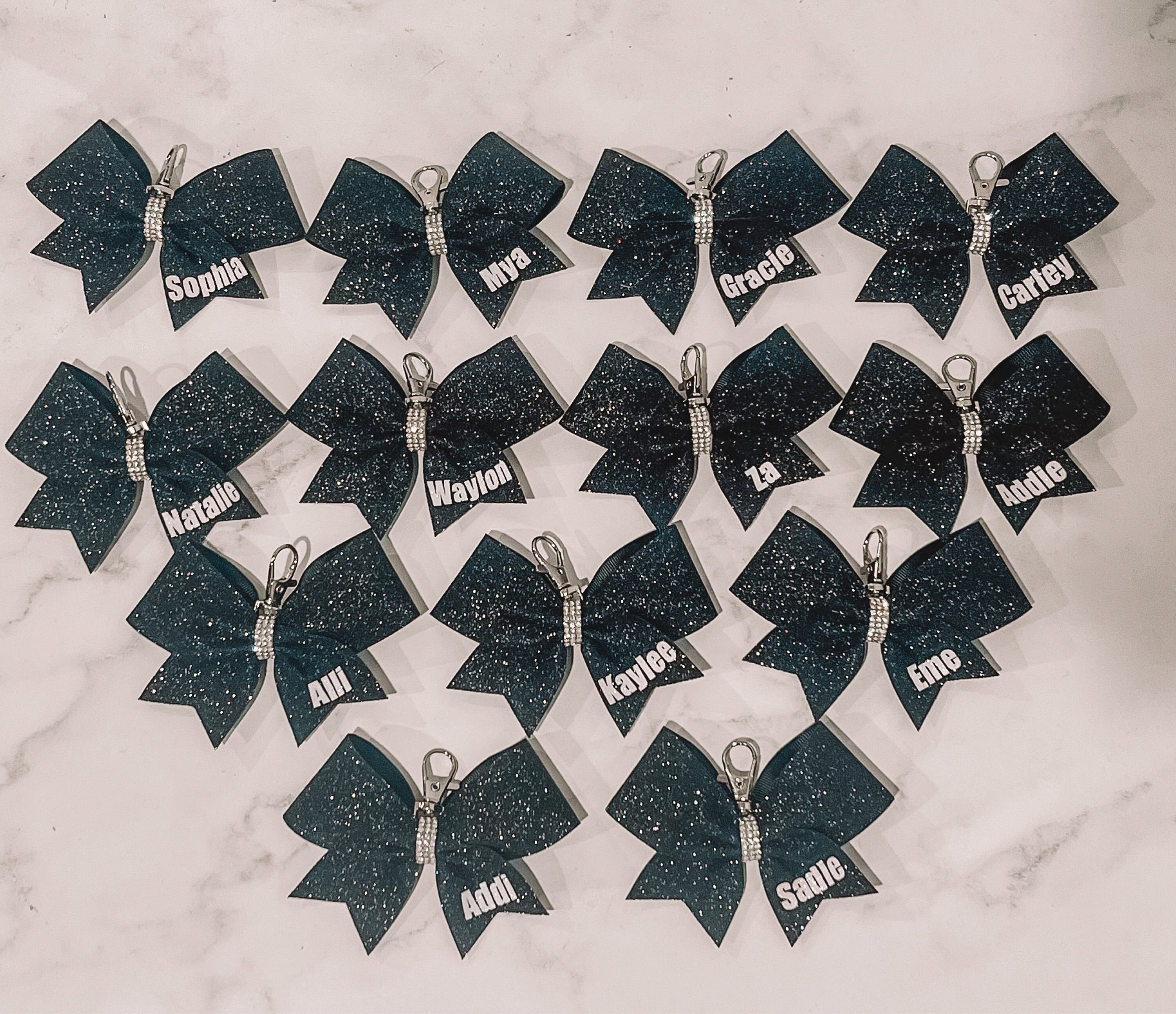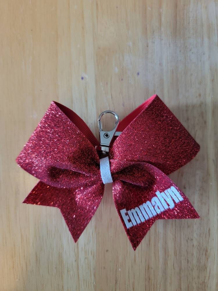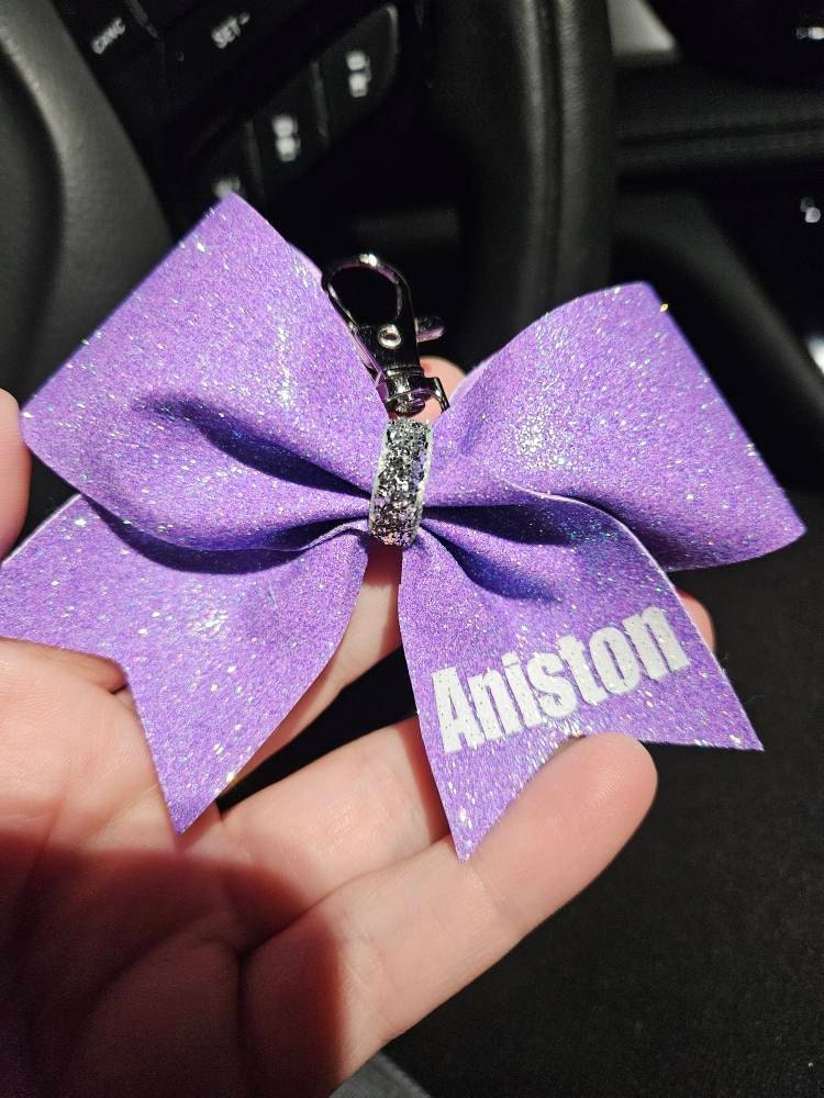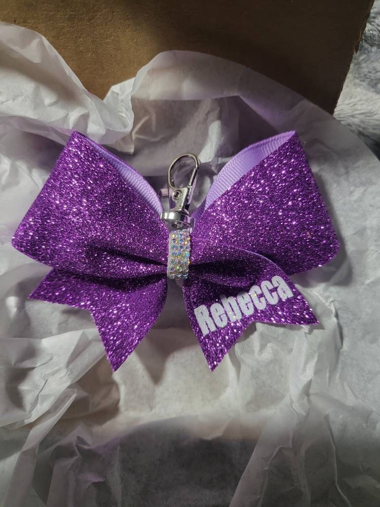 Cheer bow on keychain. Measures approximately 3x4 inches. Made from 1.5" glitter ribbon and a name, simple icon, or initials. Letters are usually written in white. If you require a different color, please note that other colors do not always cut as cleanly due to the size of the individual glitter pieces. White glitter pieces are smaller than other colors and cut the cleanest.