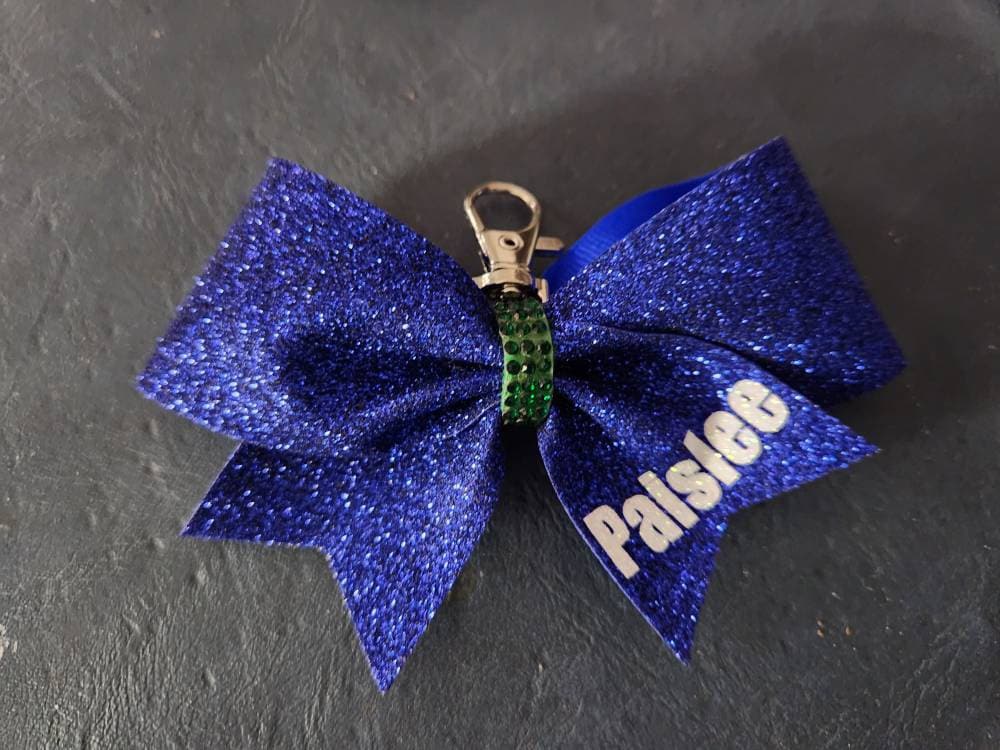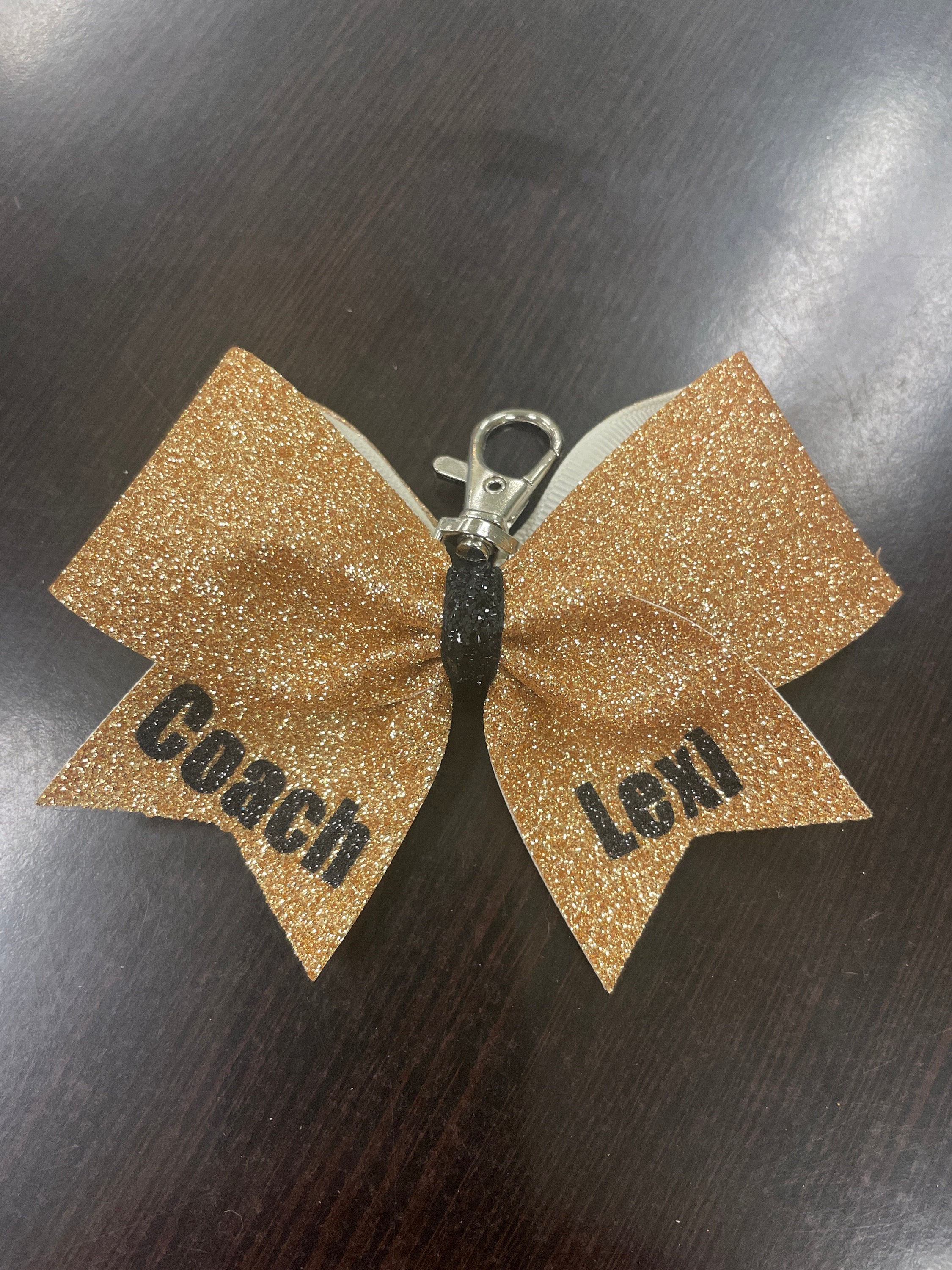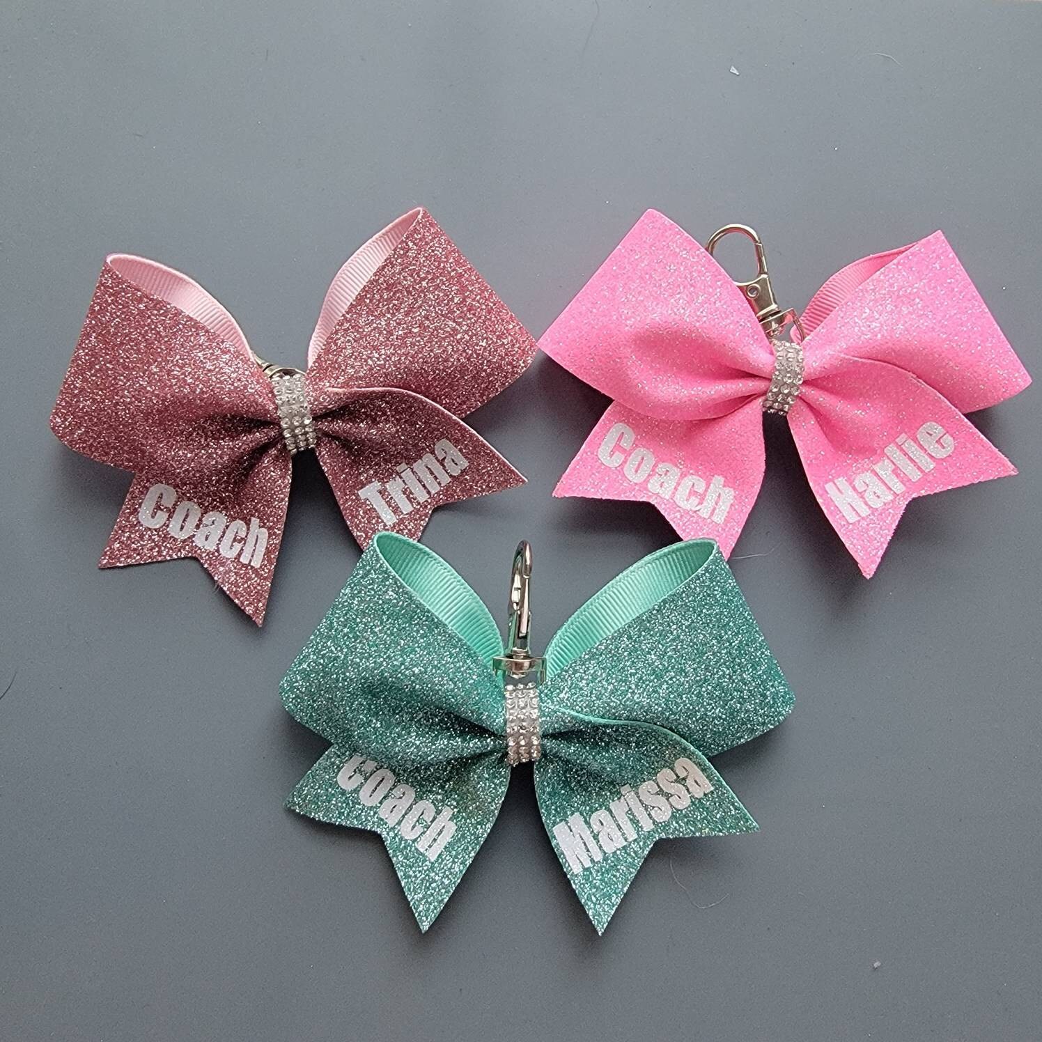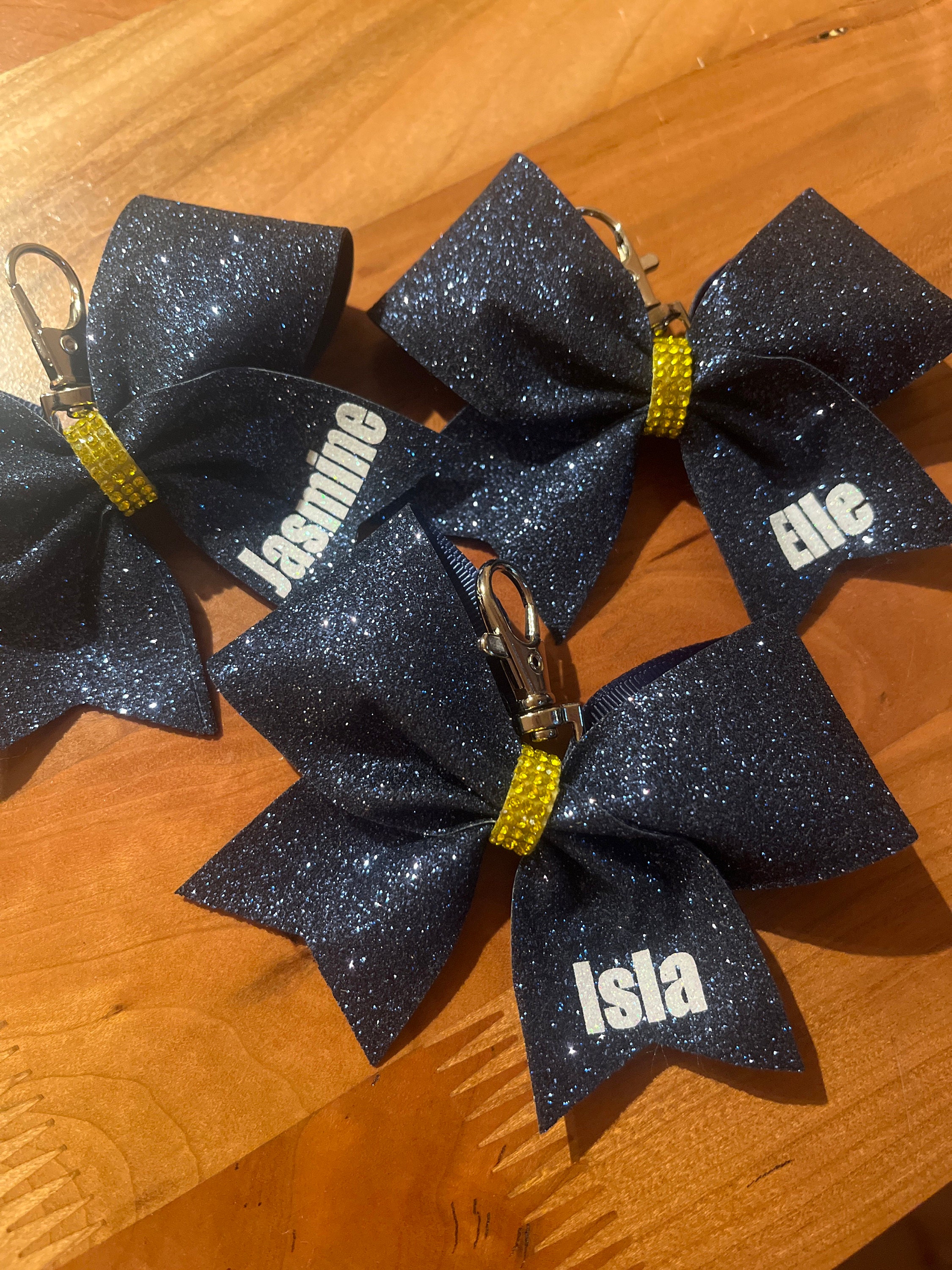 Cheer bow on keychain. Measures approximately 3x4 inches. Made from 1.5" glitter ribbon and a name, simple icon, or initials. Letters are usually written in white. If you require a different color, please note that other colors do not always cut as cleanly due to the size of the individual glitter pieces. White glitter pieces are smaller than other colors and cut the cleanest.