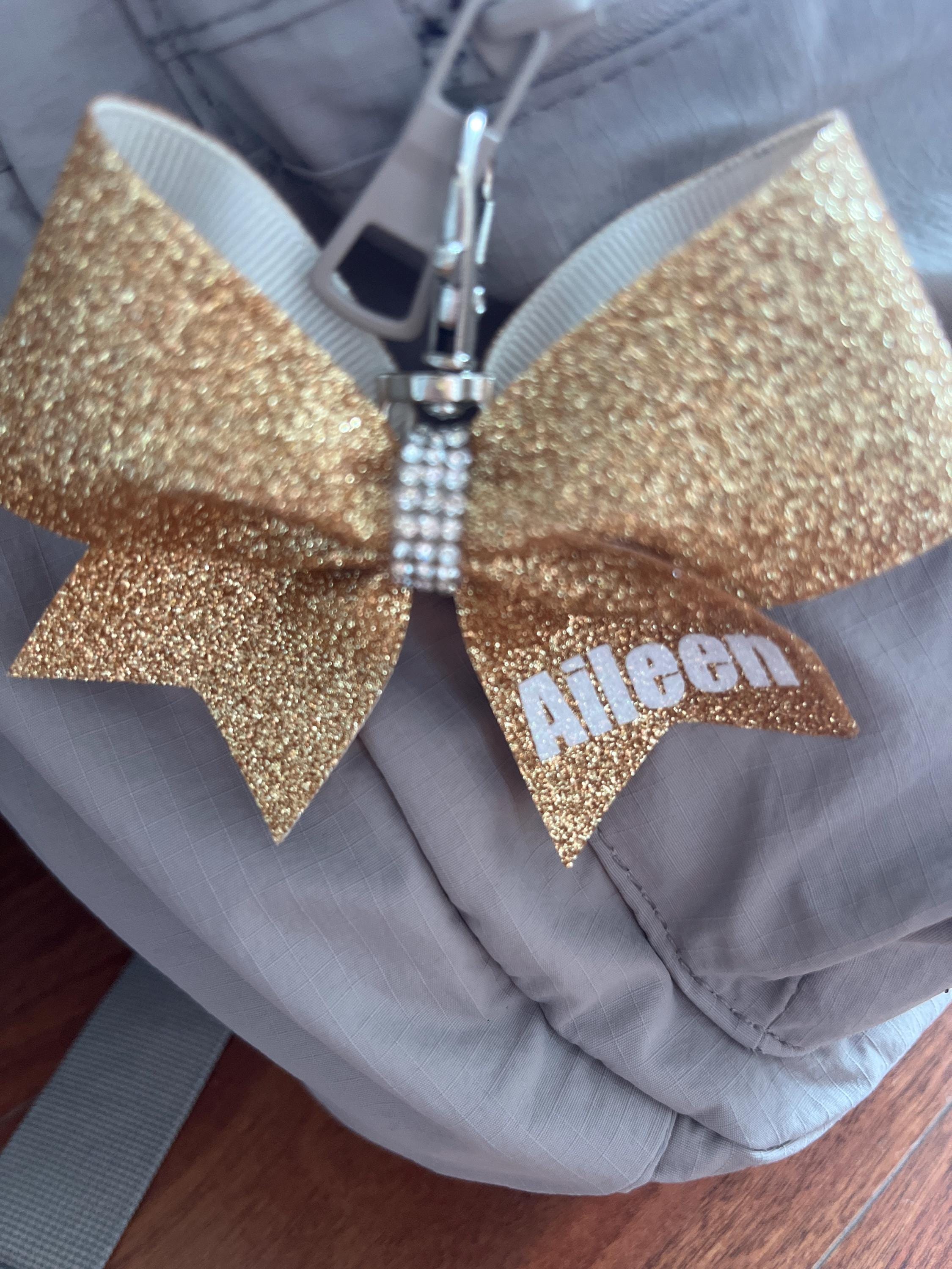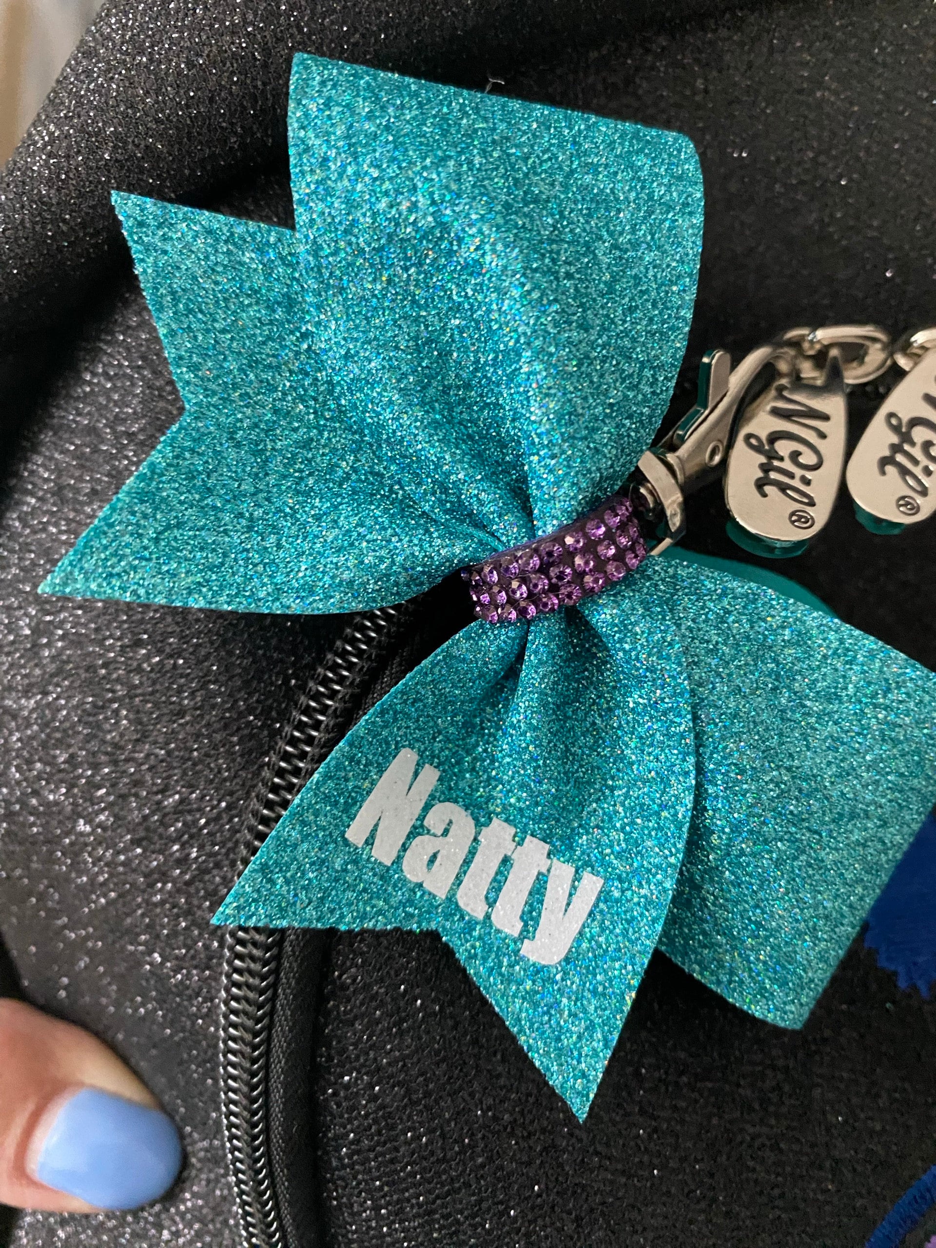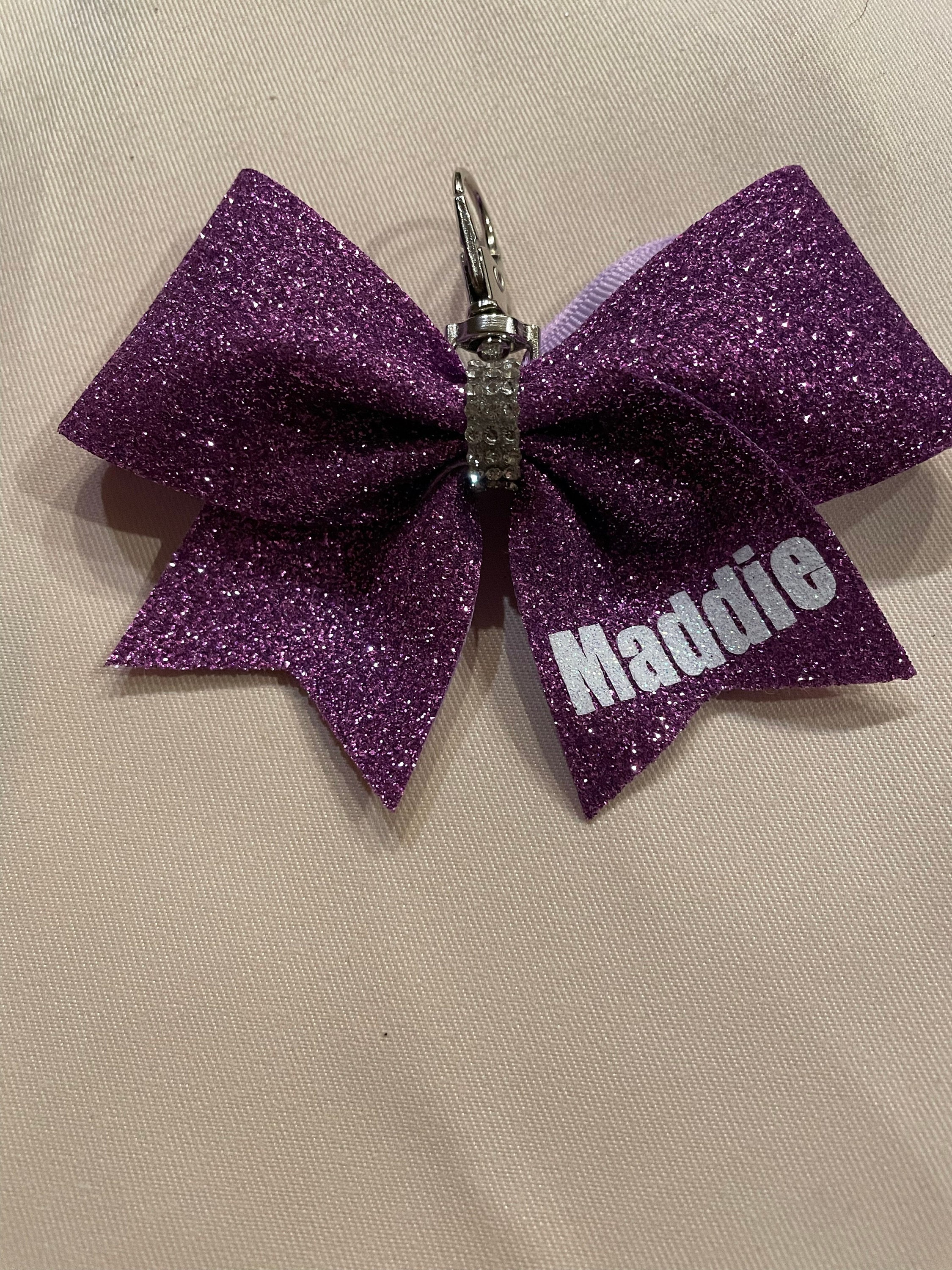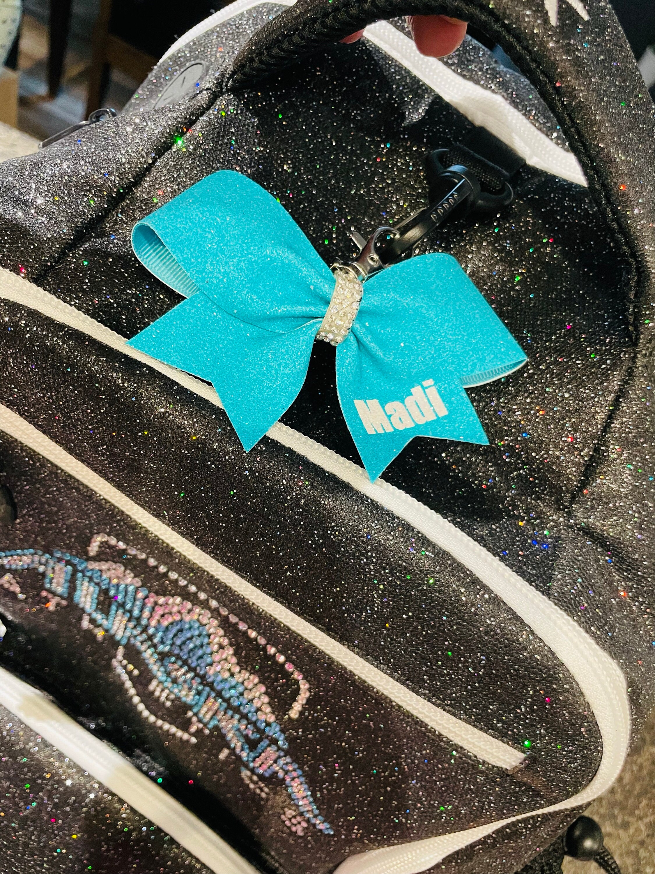Cheer bow on keychain. Measures approximately 3x4 inches. Made from 1.5" glitter ribbon and a name, simple icon, or initials. Letters are usually written in white. If you require a different color, please note that other colors do not always cut as cleanly due to the size of the individual glitter pieces. White glitter pieces are smaller than other colors and cut the cleanest.
