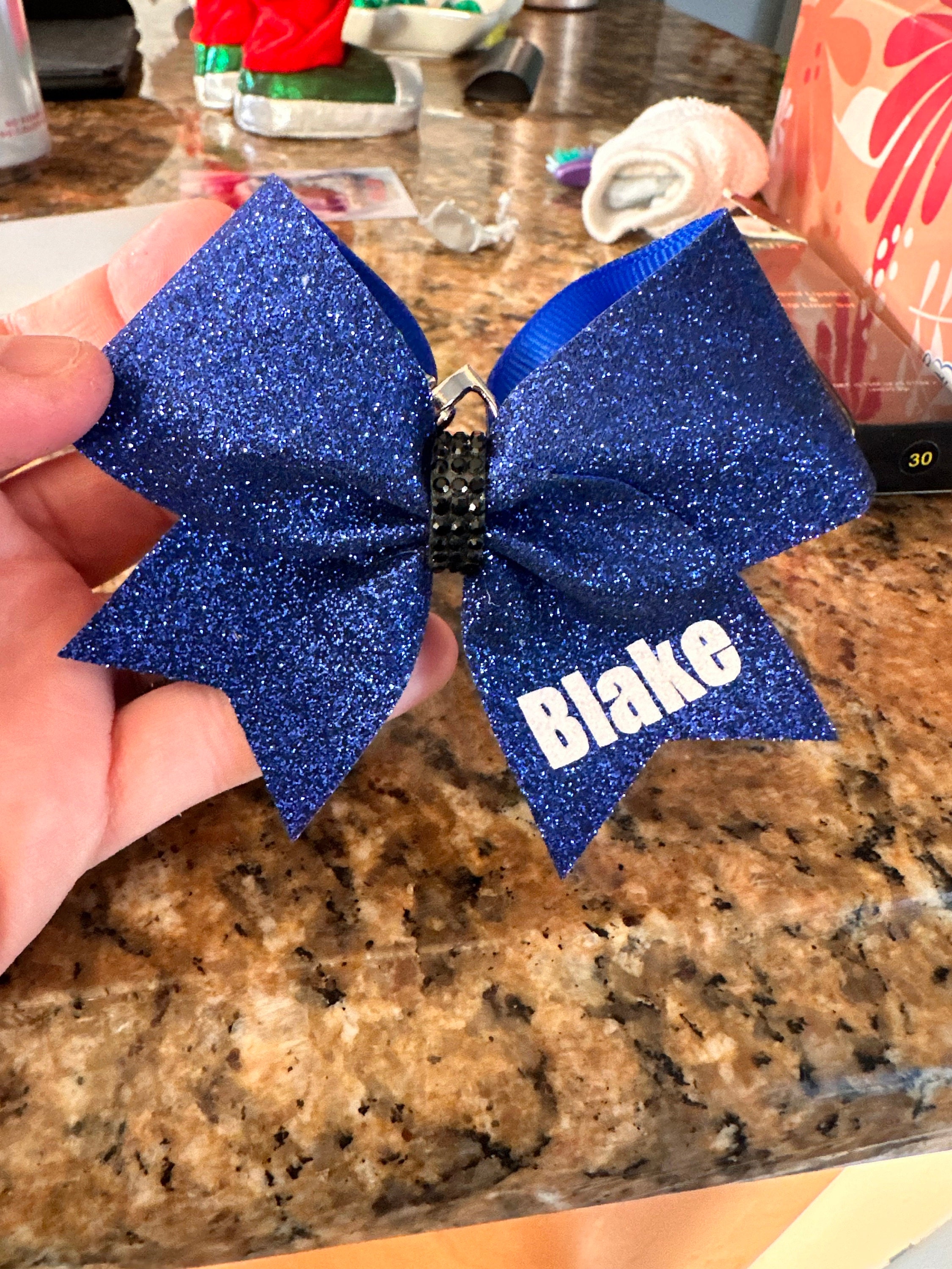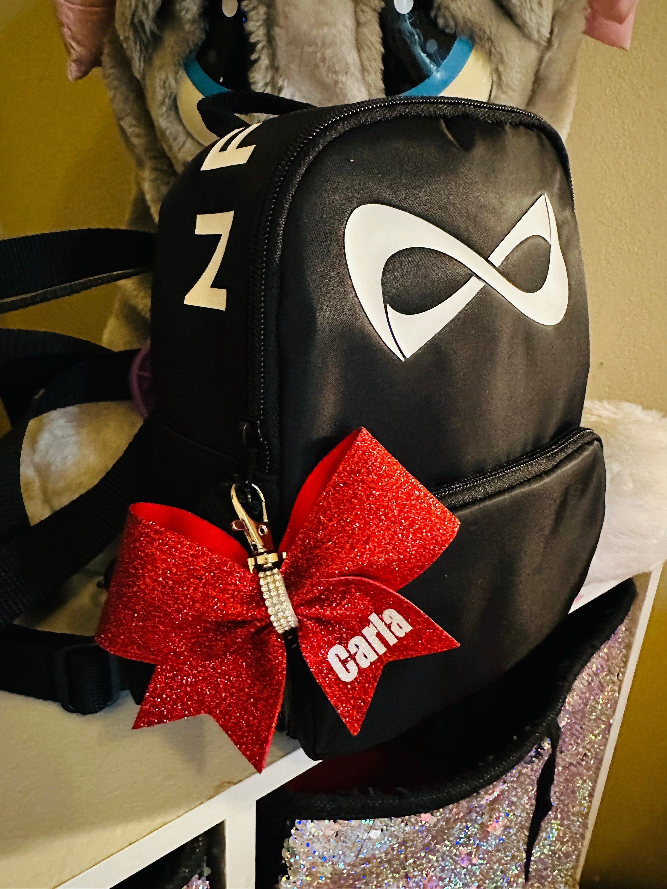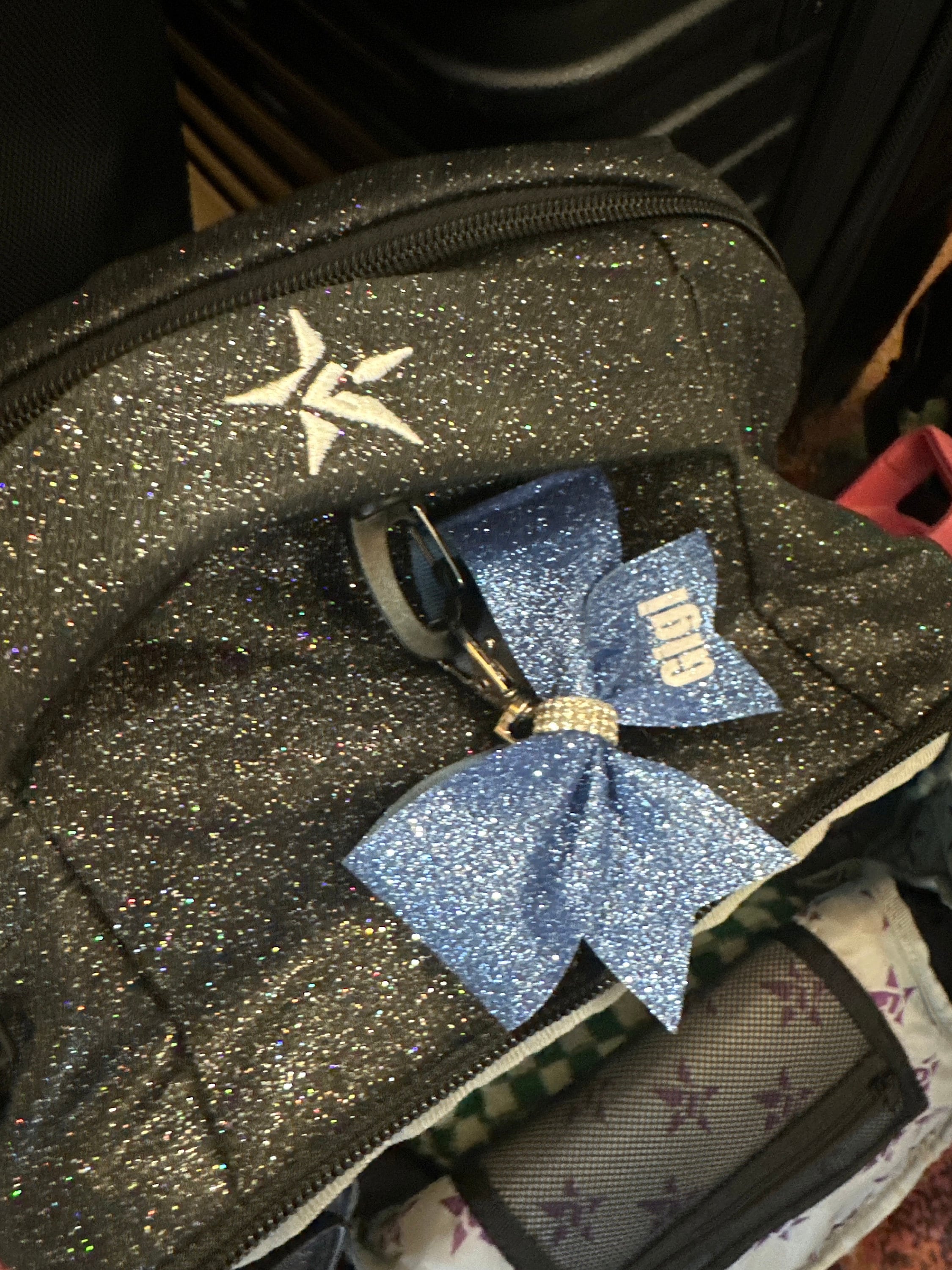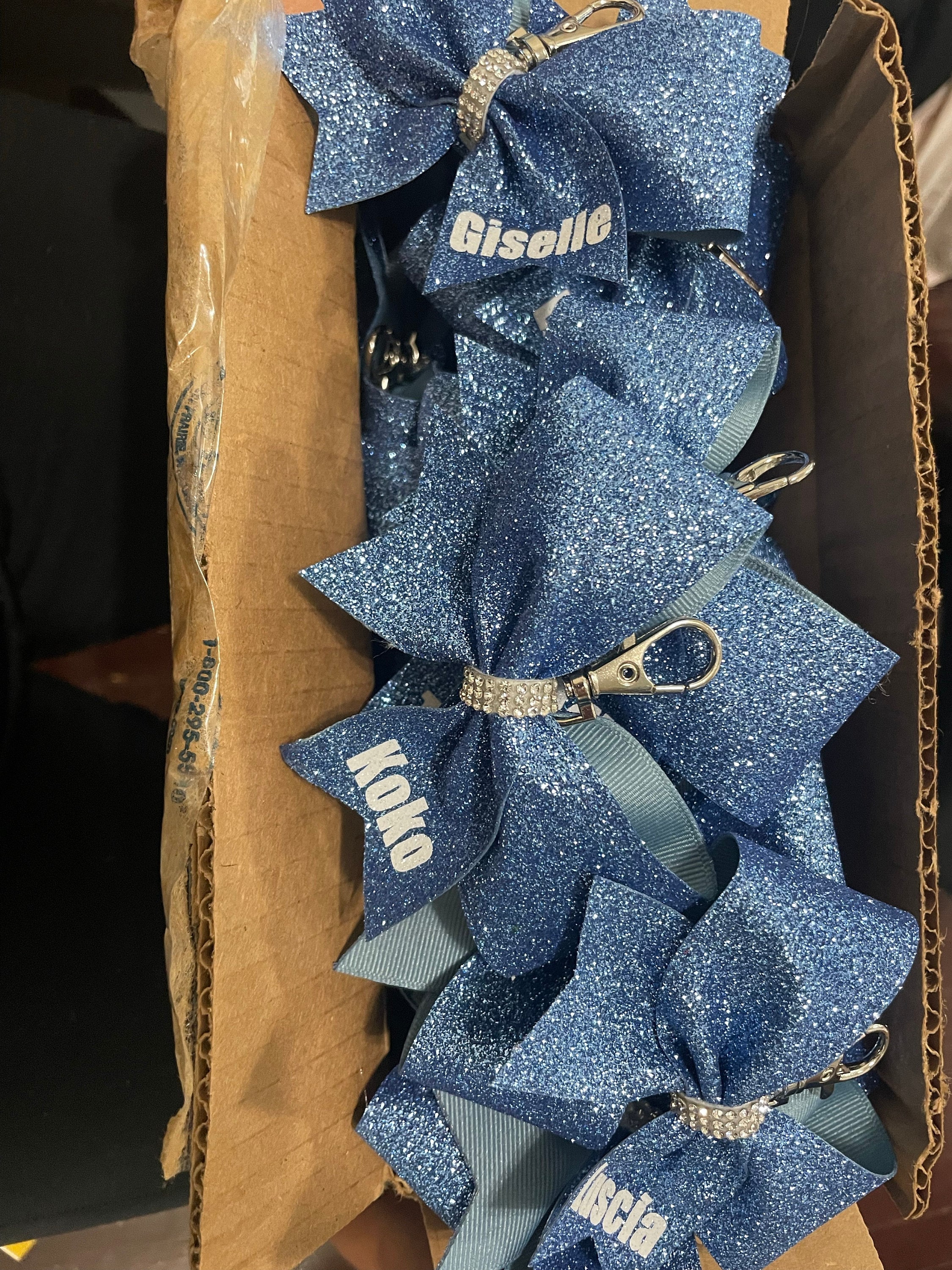 Cheer bow on keychain. Measures approximately 3x4 inches. Made from 1.5" glitter ribbon and a name, simple icon, or initials. Letters are usually written in white. If you require a different color, please note that other colors do not always cut as cleanly due to the size of the individual glitter pieces. White glitter pieces are smaller than other colors and cut the cleanest.