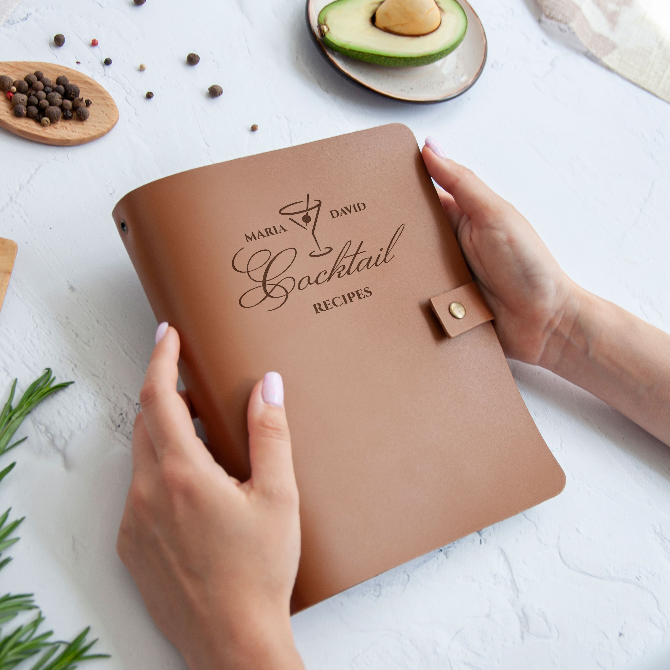 Personalized leather cocktail recipe book is perfect choice for those who want to keep recipes of the most delicious homemade dishes. Custom blank recipe book is great assistant in the kitchen daily life. Pages of such kitchen diary will keep all secrets passed down from generation to generation.