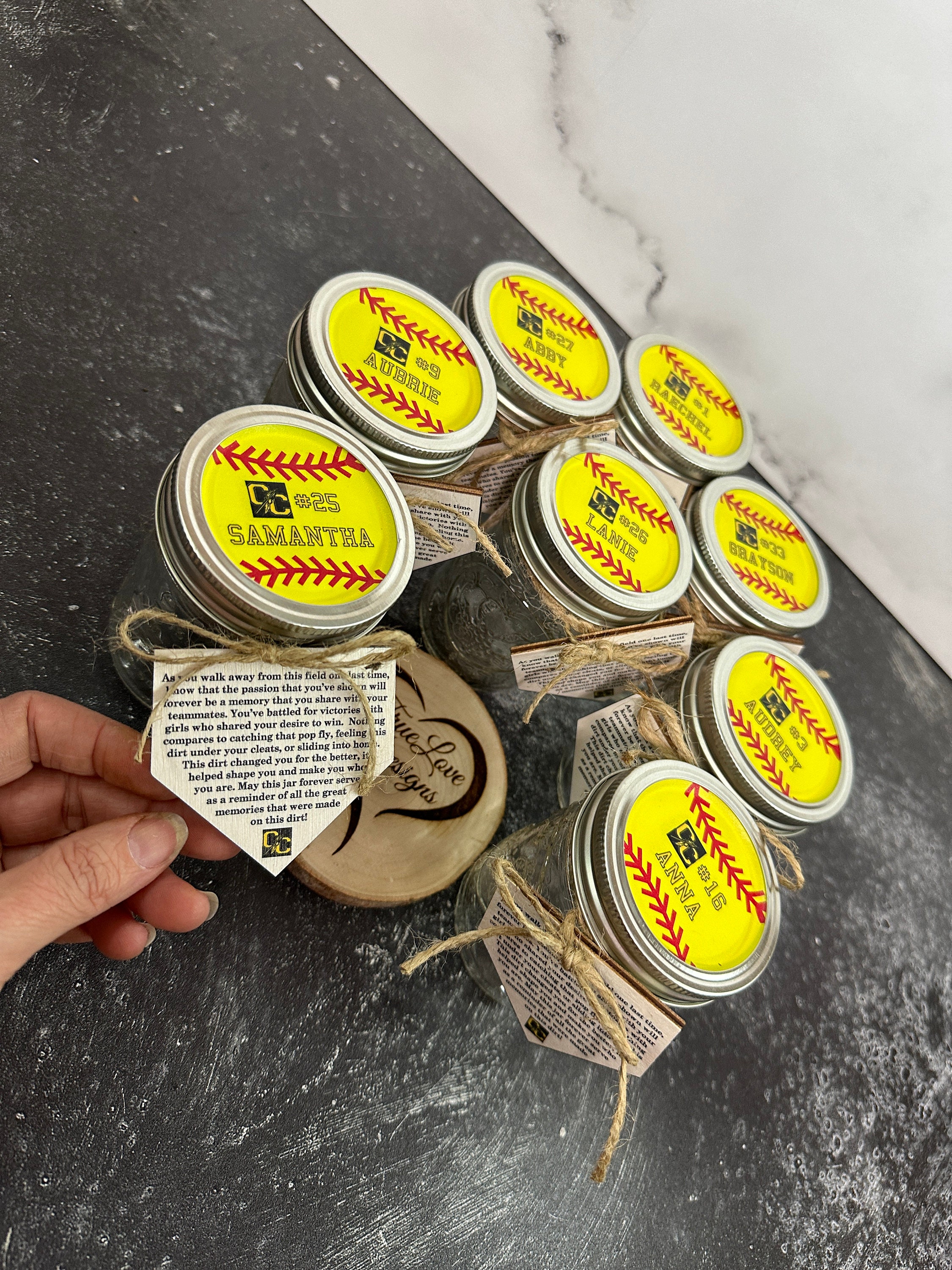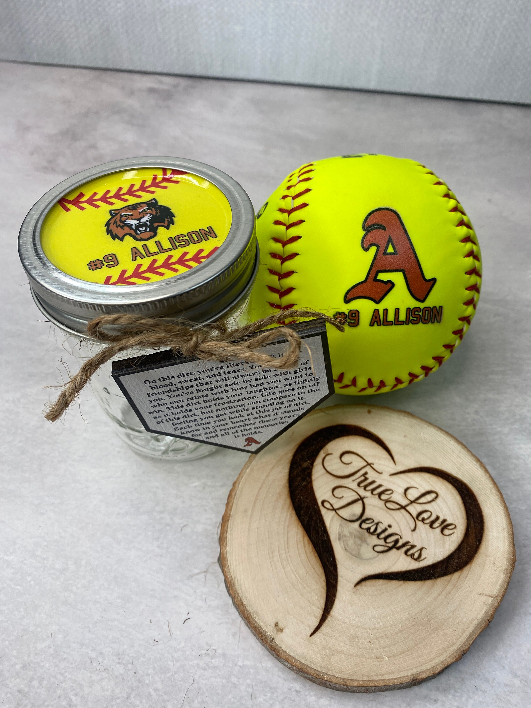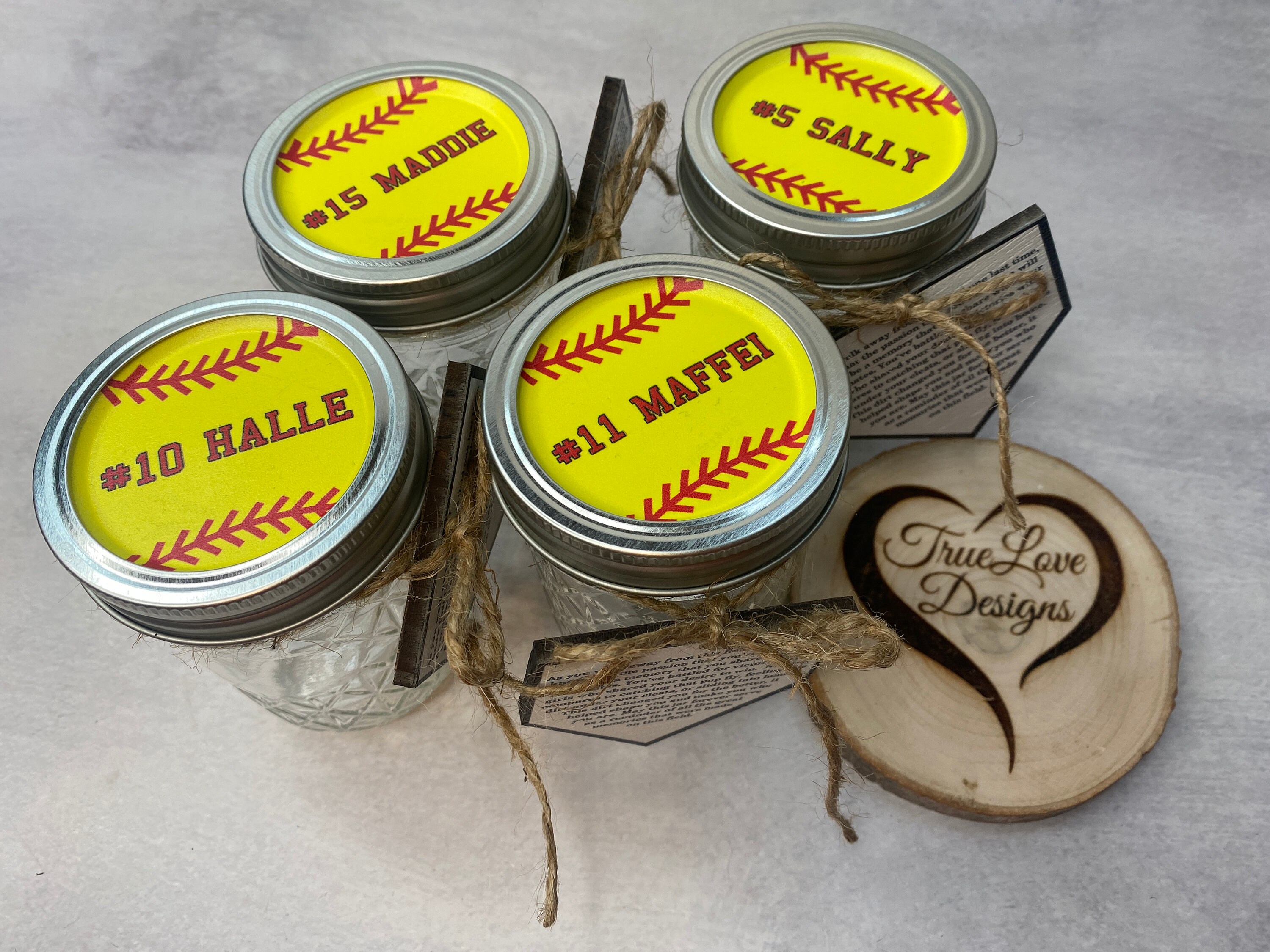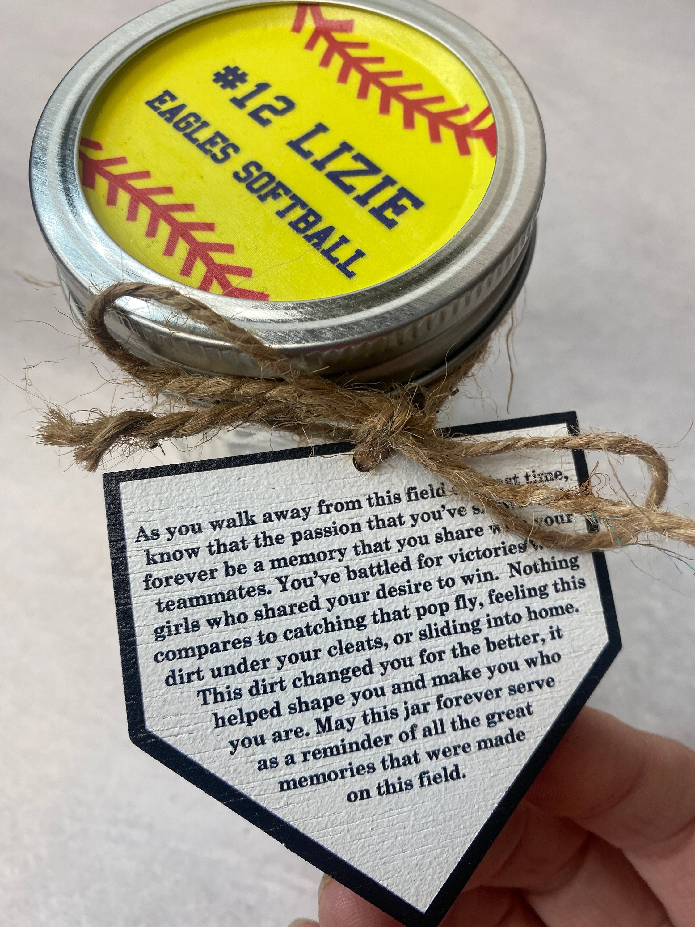 Our personalized clay jar is the perfect gift for the senior softball player in your life. Included in the listing is an 8 oz mason jar with a personalized lid, and a home plate label that is tied to the jar with twine. All you need to do is add home plate clay to make this graduation night the best night ever! This is a great sentimental gift for a senior softball player and the perfect addition to their graduation night at school. It also makes a perfect addition to your graduation party table decor!