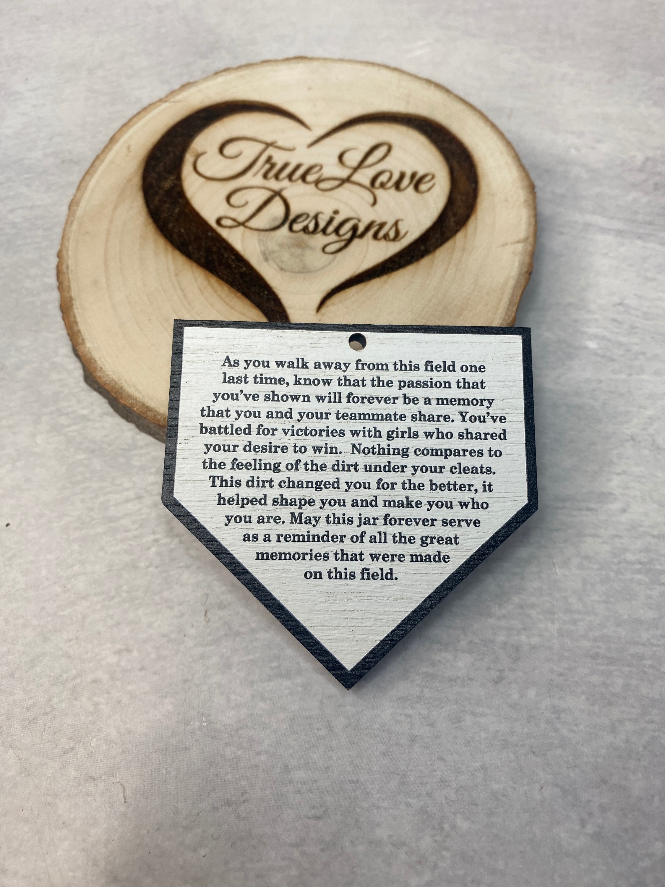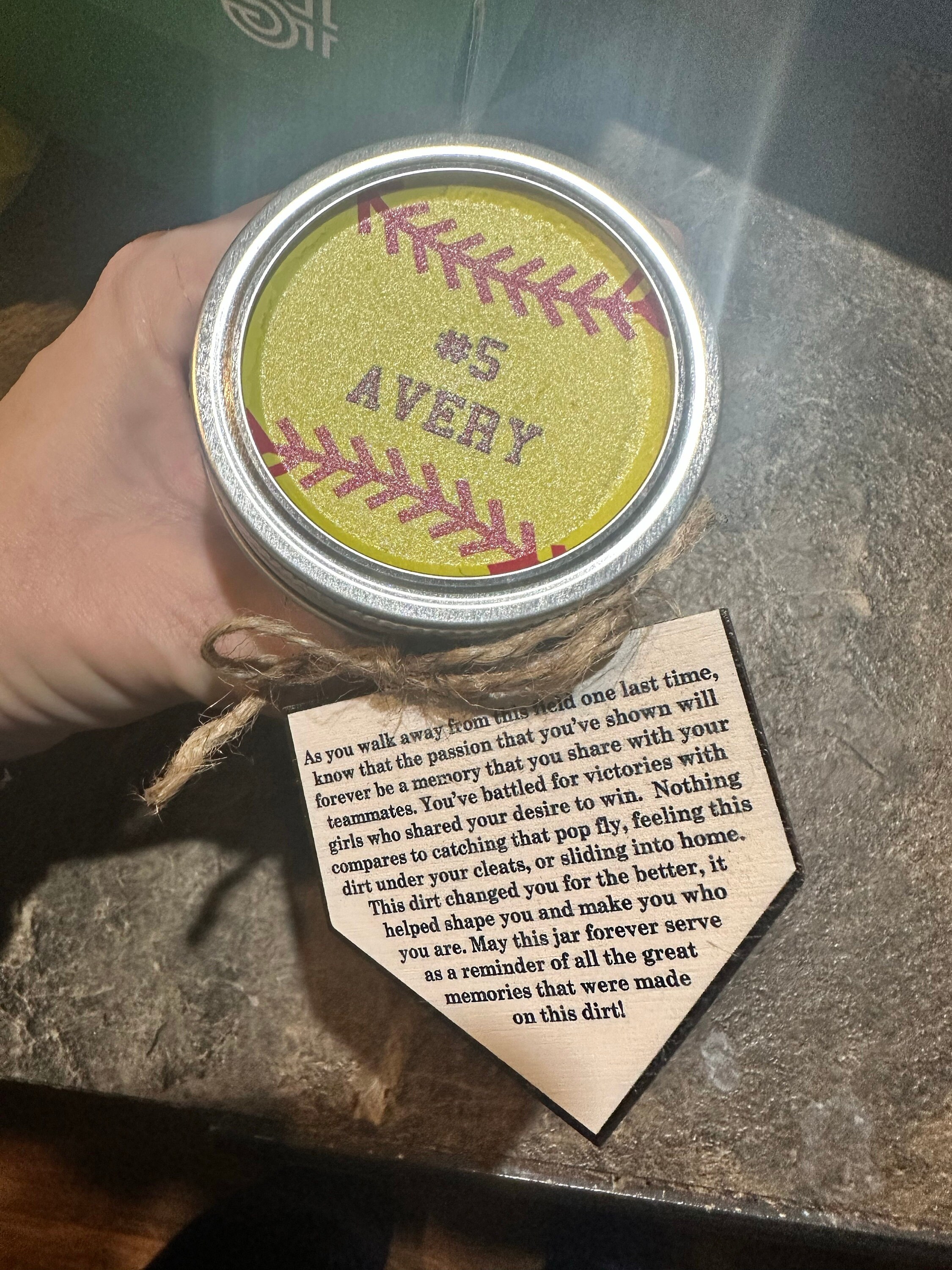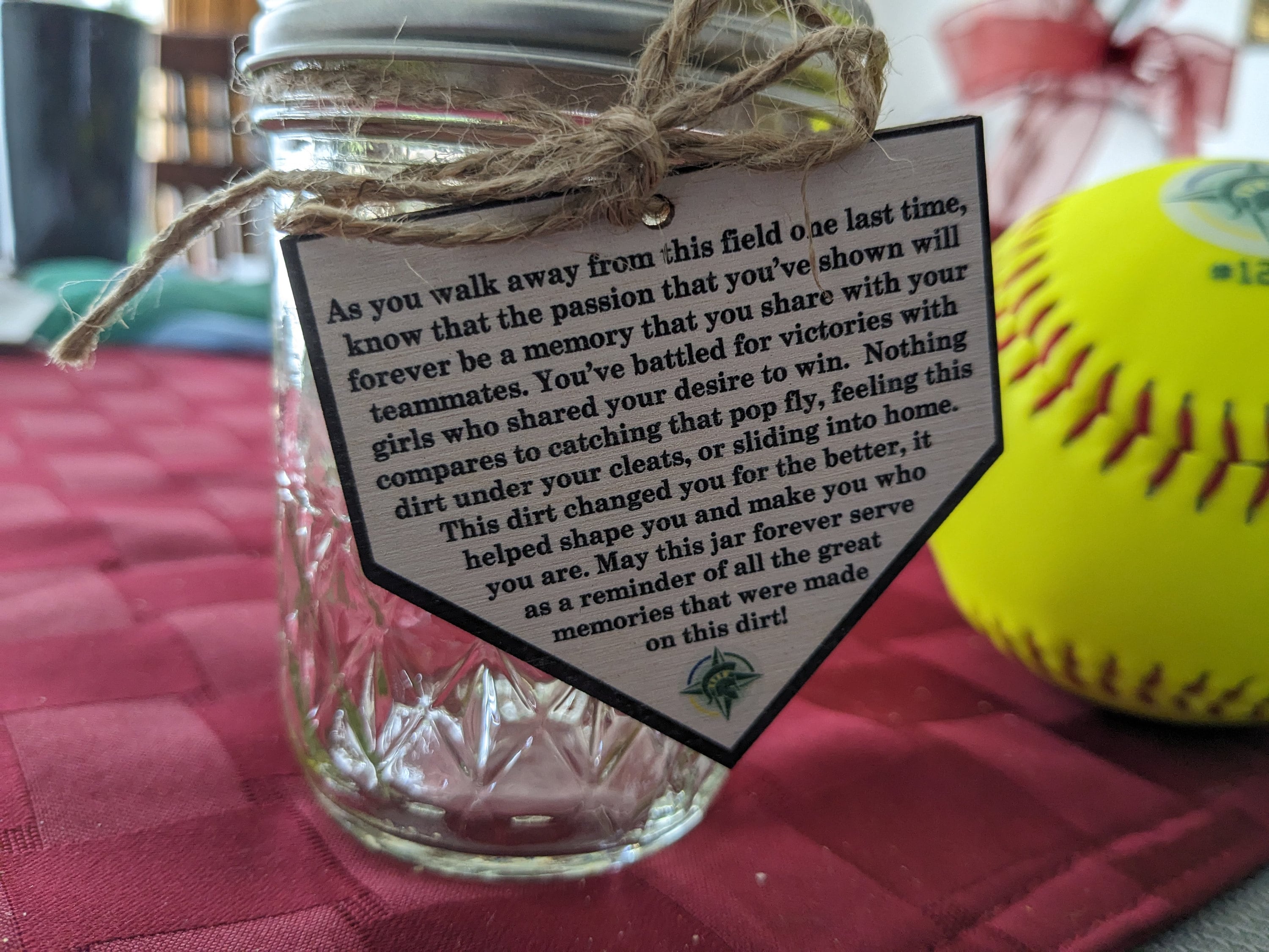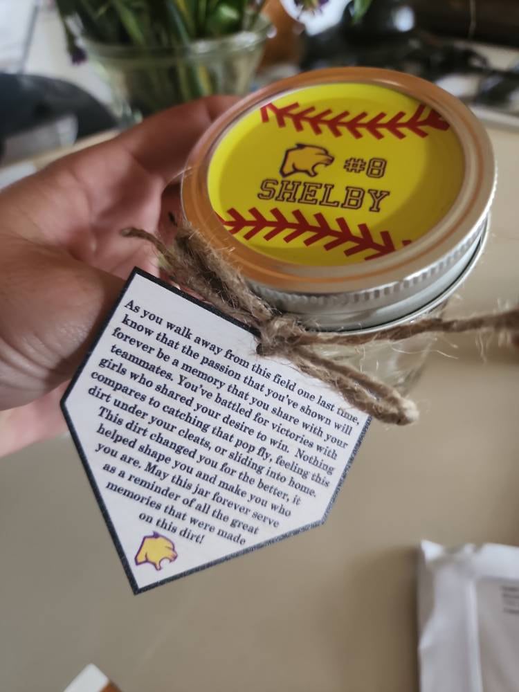 "When you leave this field for the last time, know that the passion you showed will forever be a memory you and your teammates shared. You played for the win with girls who wanted it just as badly as you did. There is nothing better than the feeling of dirt beneath your cleats. That dirt made you better, it helped shape you into who you are today. May this jar forever serve as a reminder of all the great memories you made on this field."