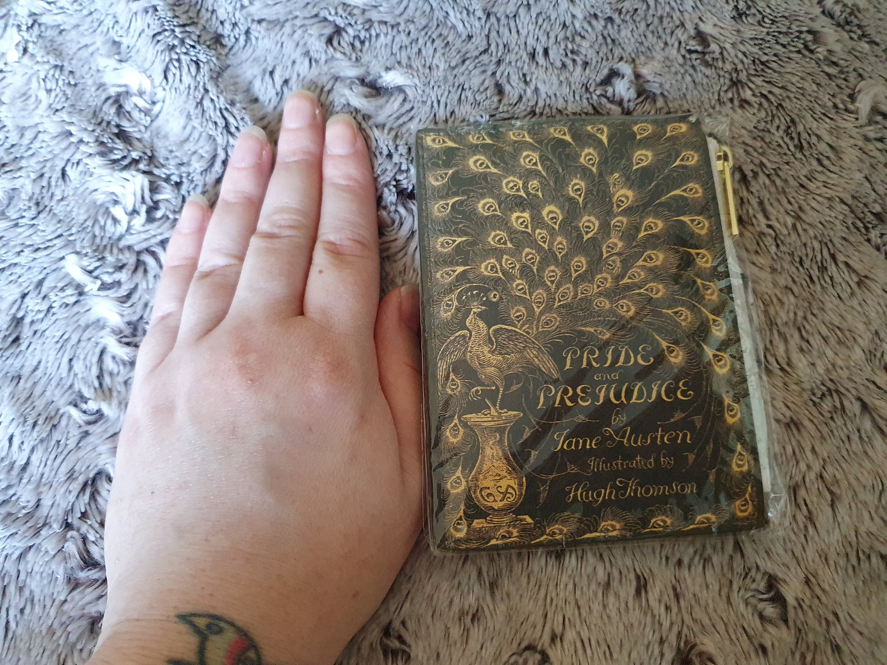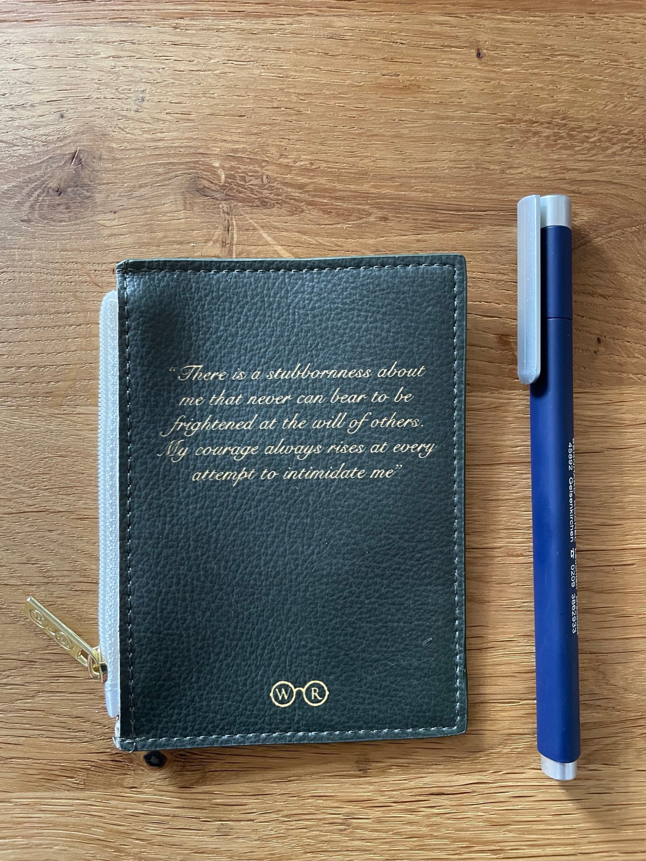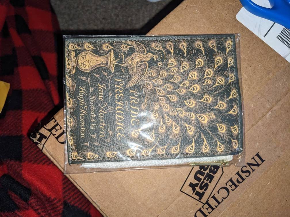 This pocket-sized coin purse is themed after Jane Austen's famous novel Pride and Prejudice. The front of the purse features a delicate gold peacock pattern and is made from vegan leather. It is also based on the cover design of Hugh Thomson's original 1813 book. The back of the purse is embellished with a memorable quote: "I have a stubbornness that can never bear to be intimidated by the will of others. Whenever someone tries to intimidate me, my courage grows."