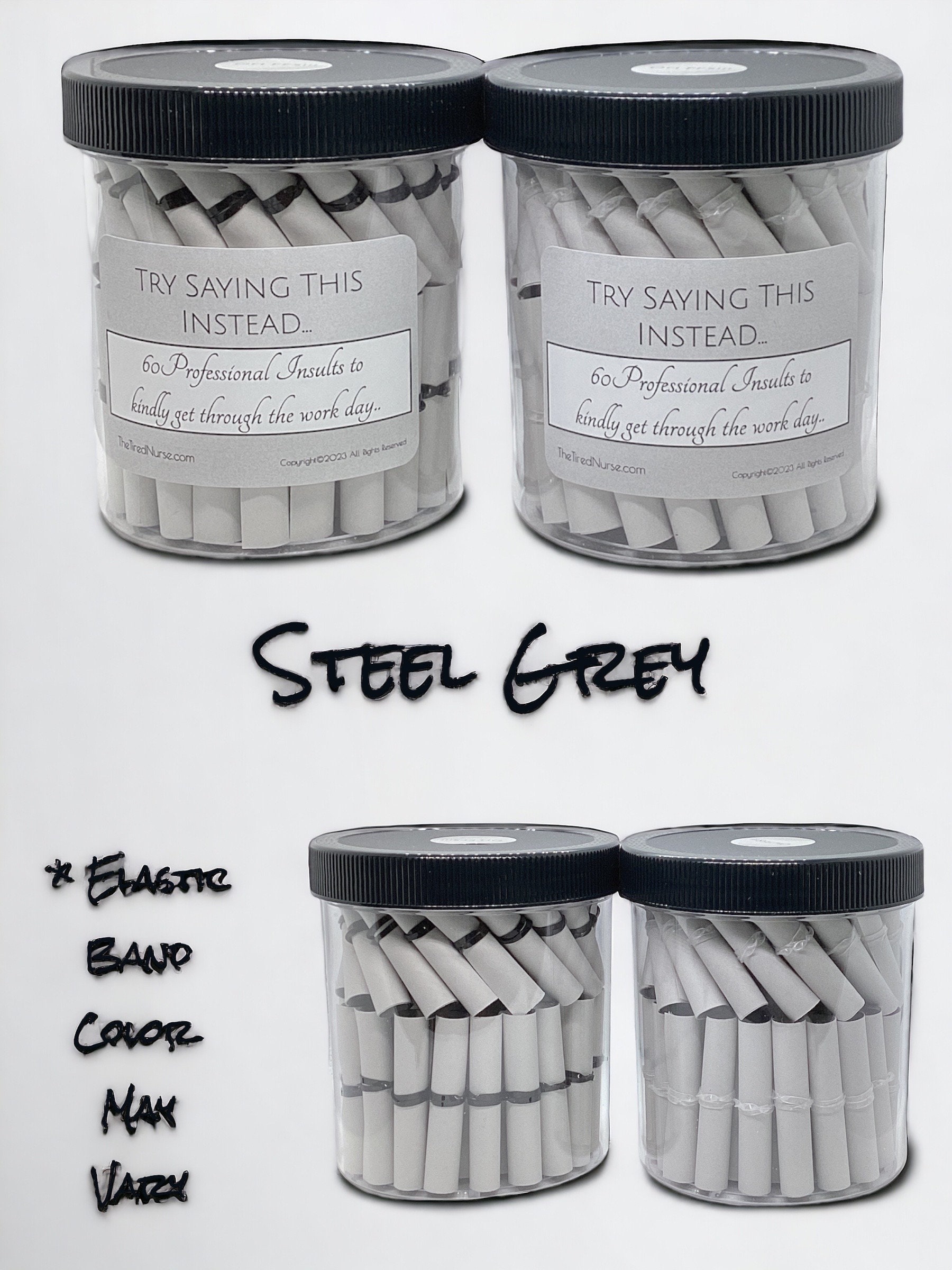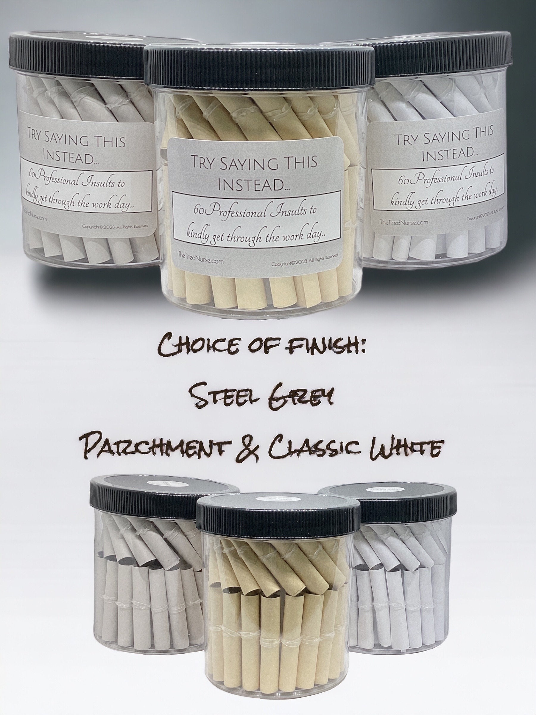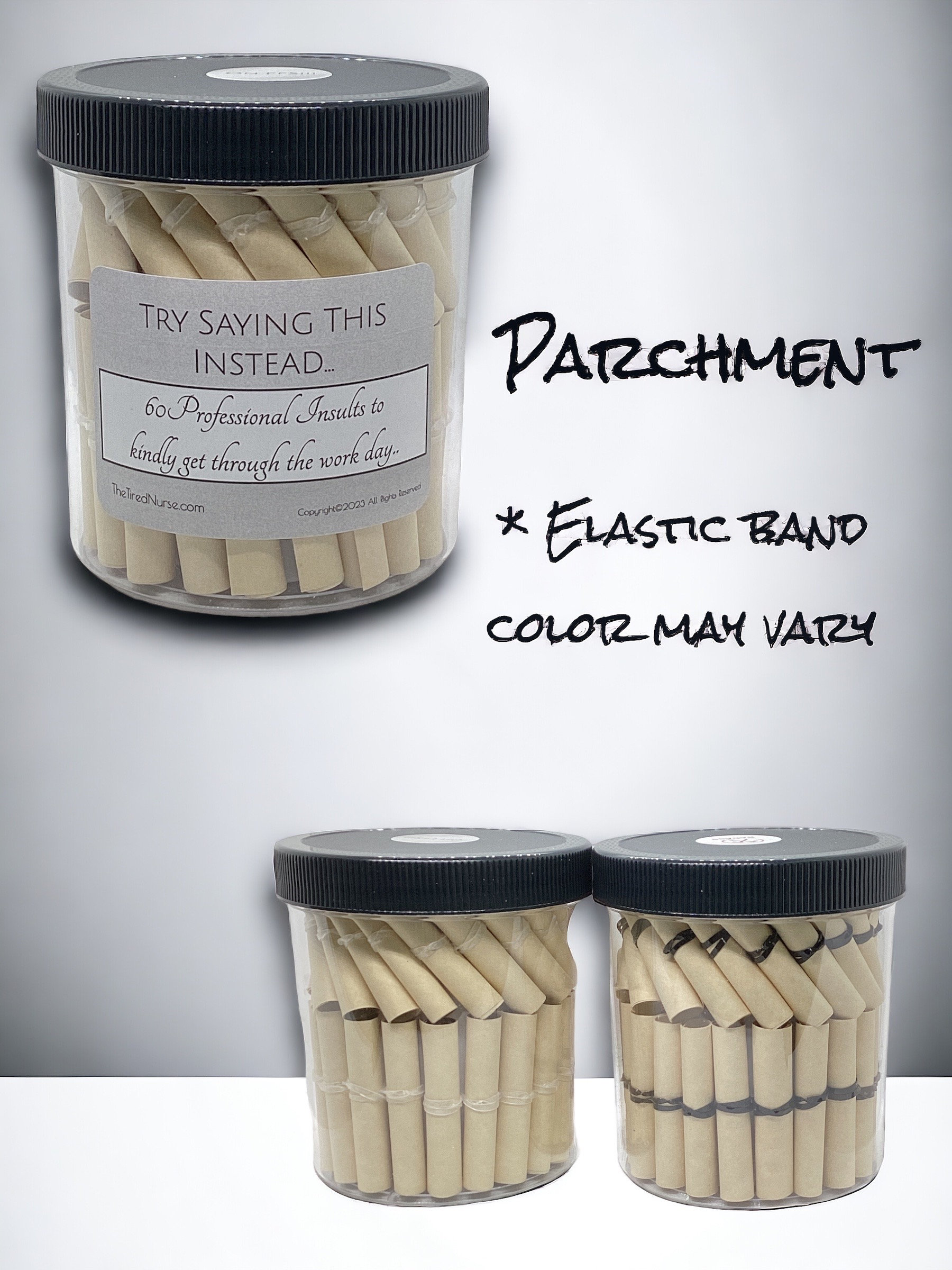 Contains 60 professionally themed insults that translate into well-worded responses, hand rolled, and secured with an elastic band.