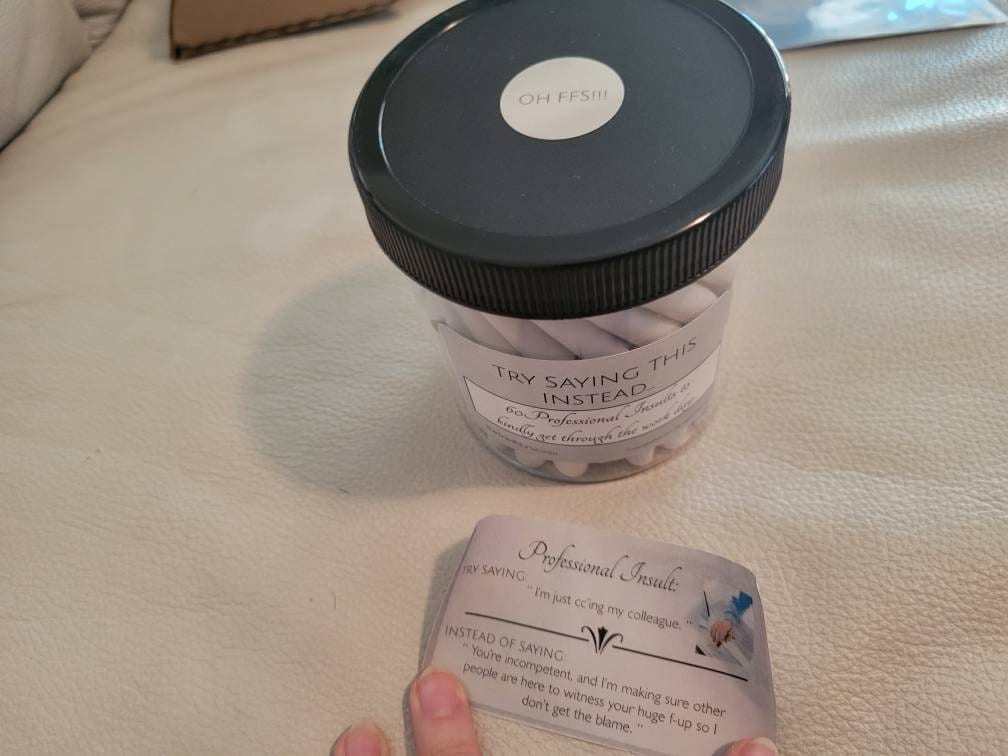 Looking for a unique and funny gift for a colleague or friend at work? Our Professional Insult Affirmation Jar is ideal for birthdays, office parties, or just to brighten someone's day.