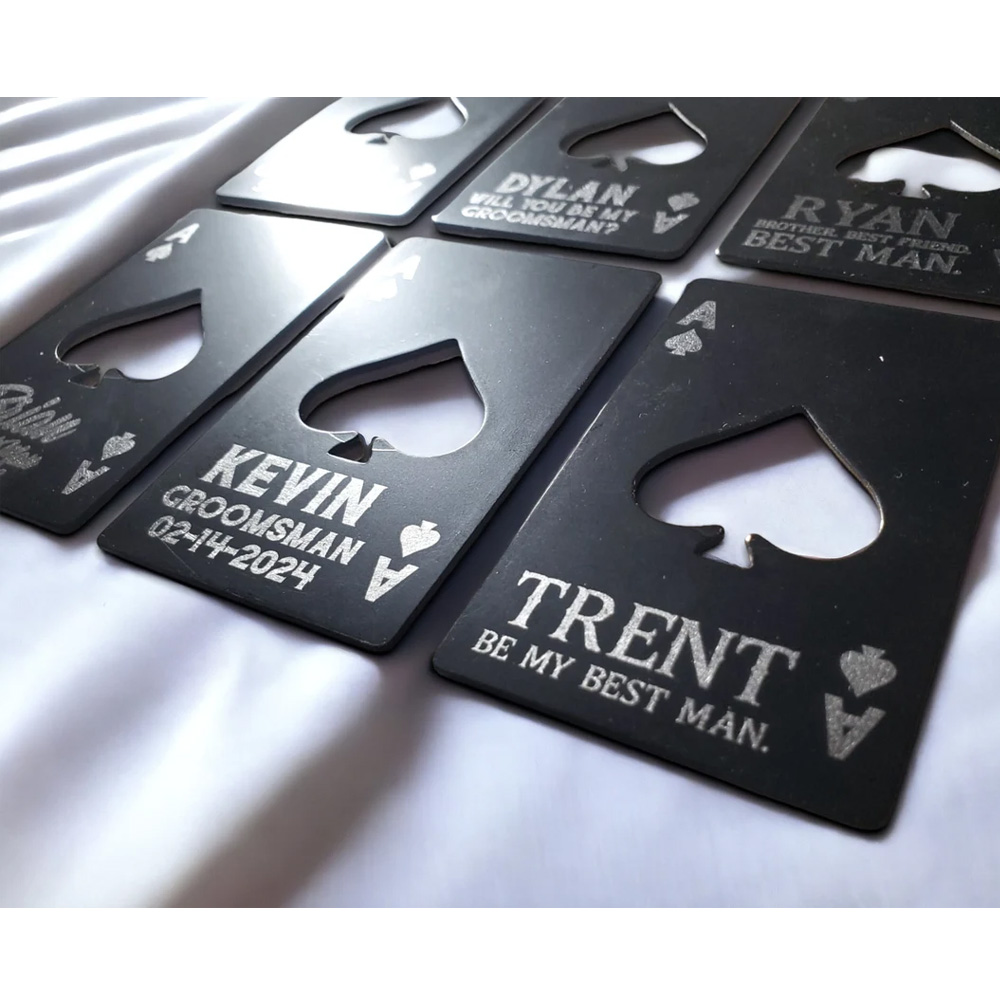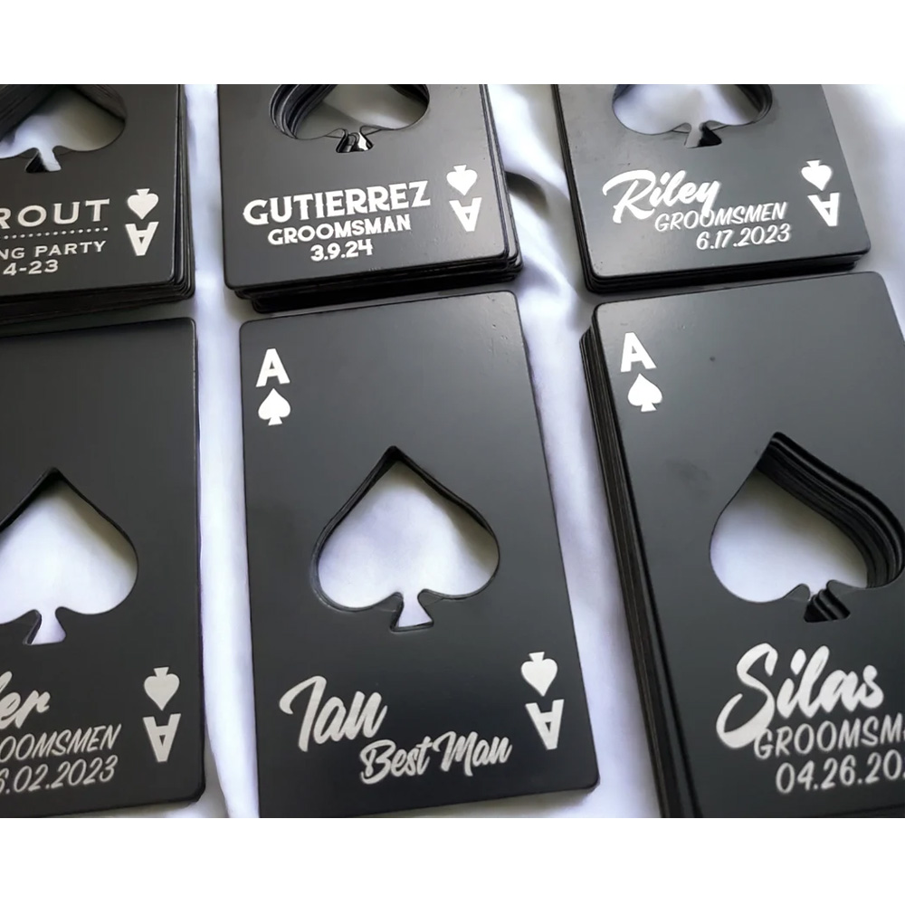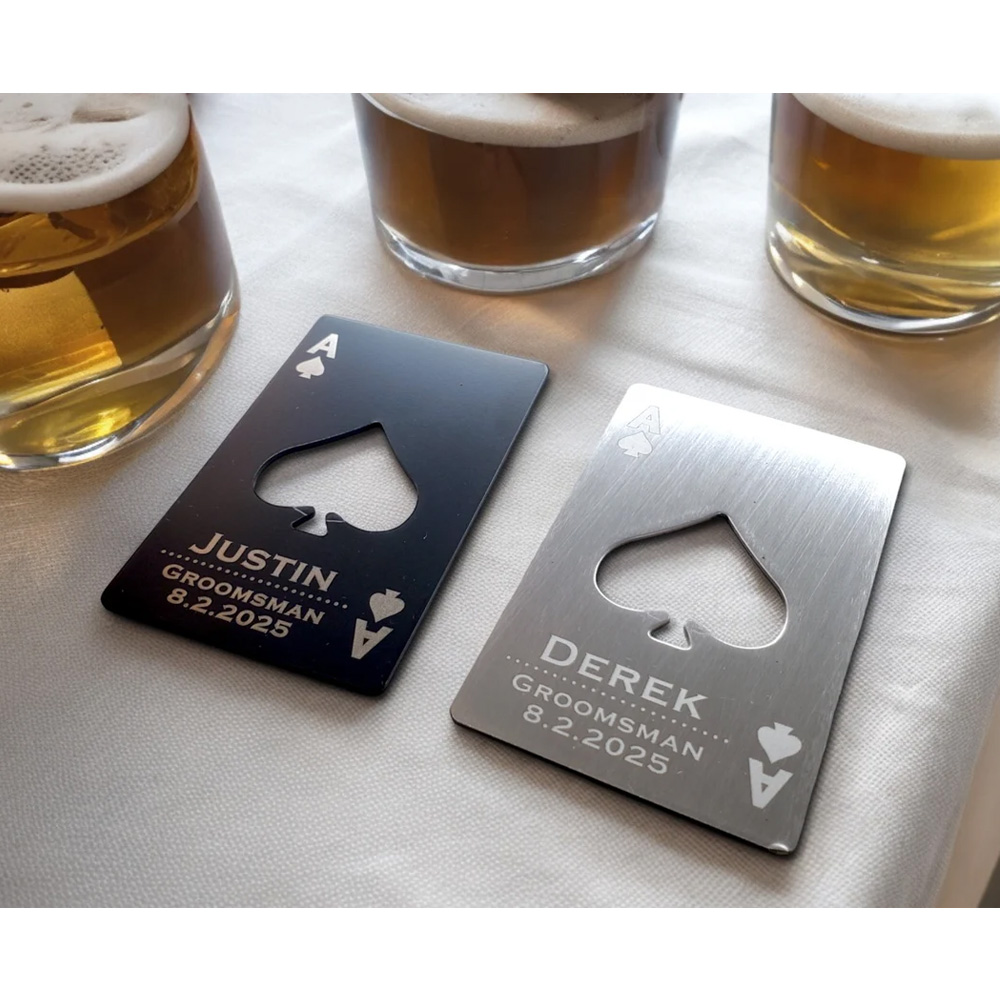 Propose to your groomsmen in style with this unique Ace of Spades Bottle Opener! This custom-designed bottle opener features the iconic spade symbol, making it the perfect way to ask your closest friends to stand by your side on your big day.
