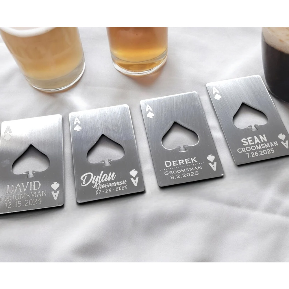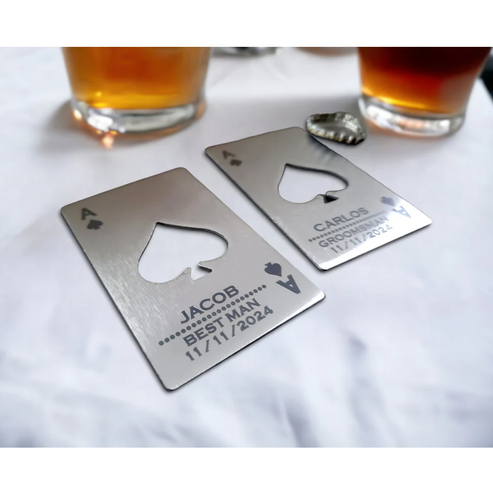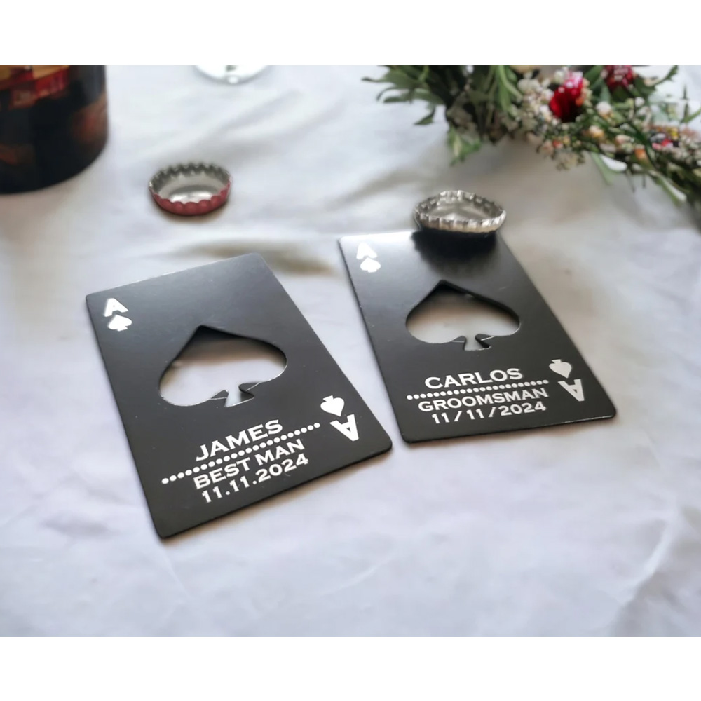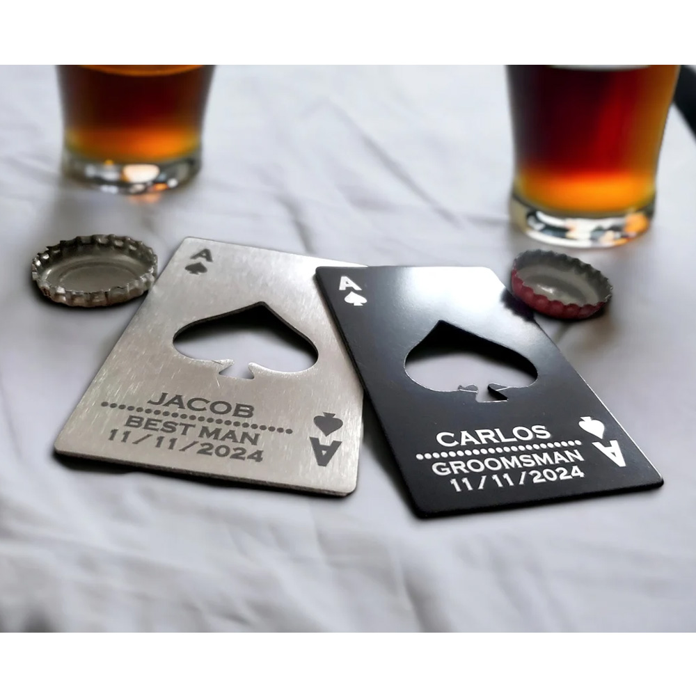 Propose to your groomsmen in style with this unique Ace of Spades Bottle Opener! This custom-designed bottle opener features the iconic spade symbol, making it the perfect way to ask your closest friends to stand by your side on your big day.