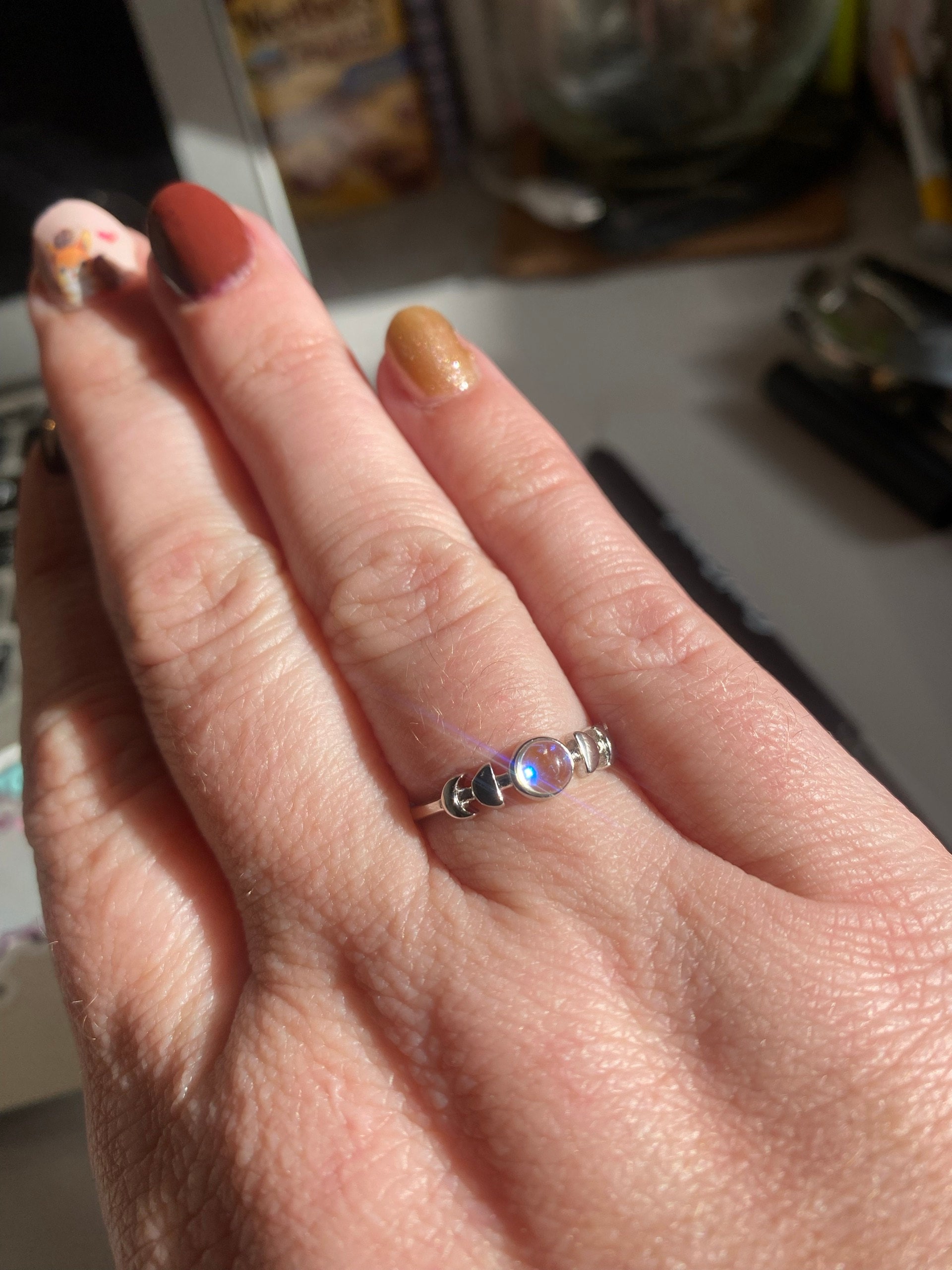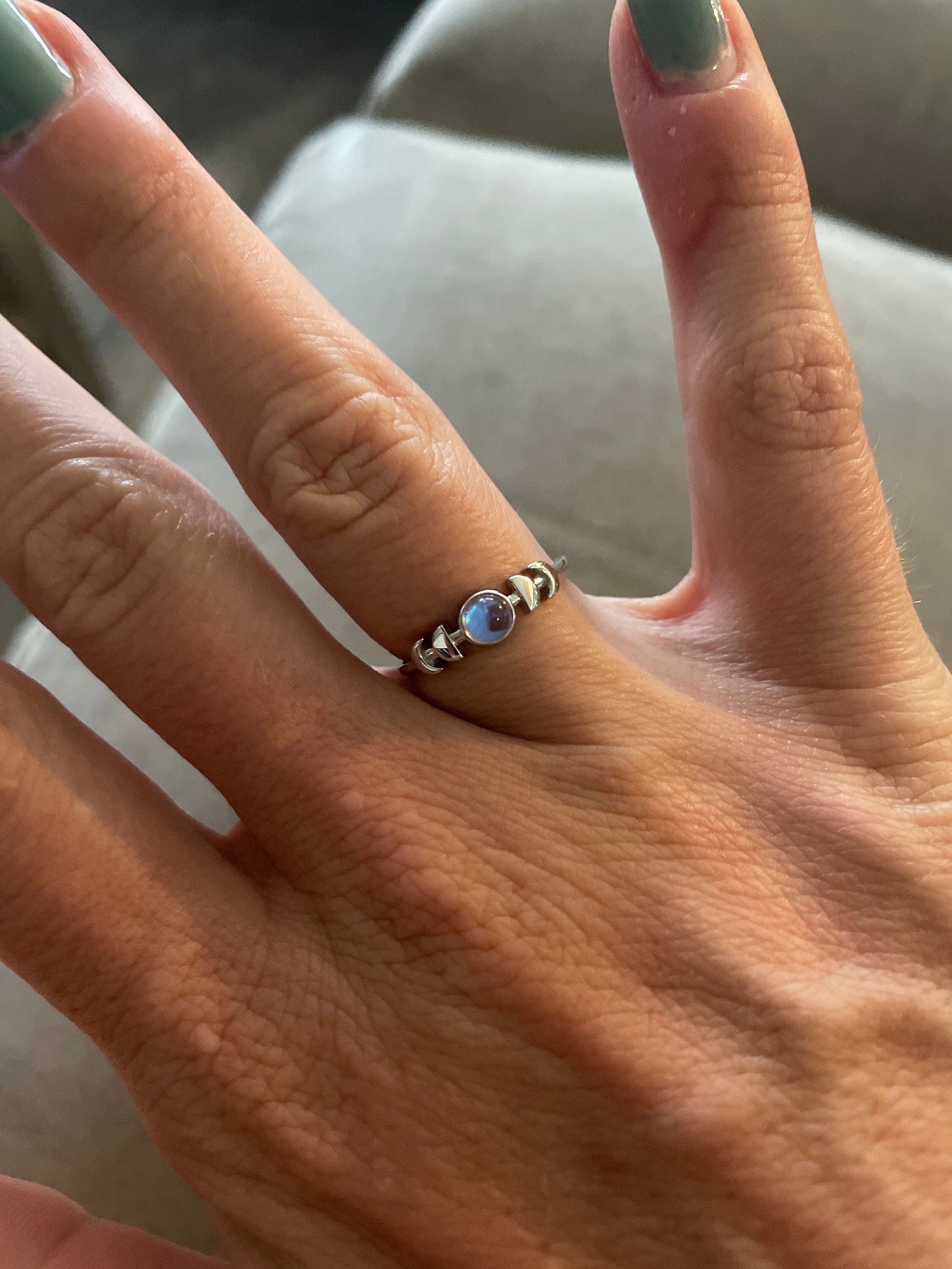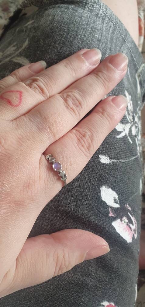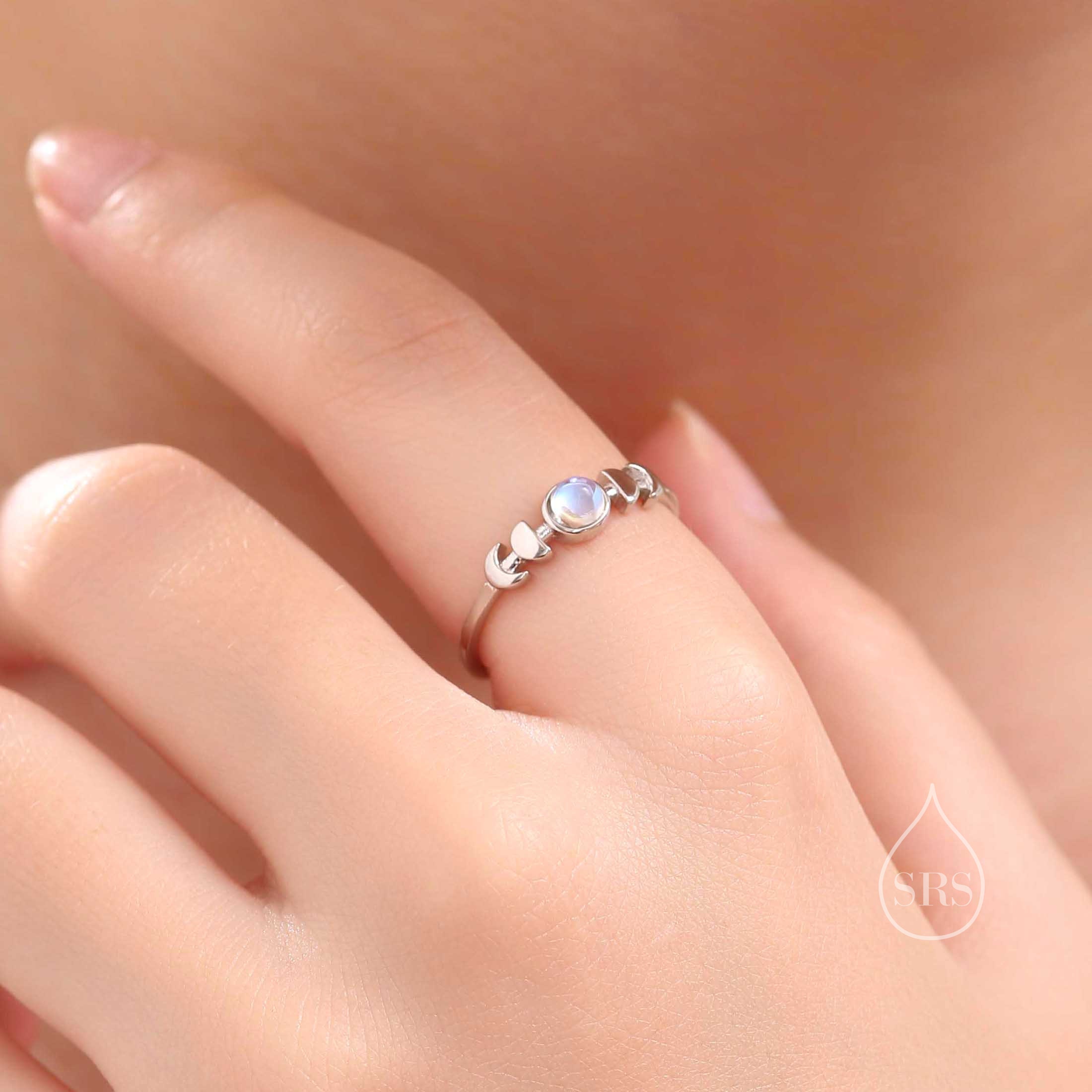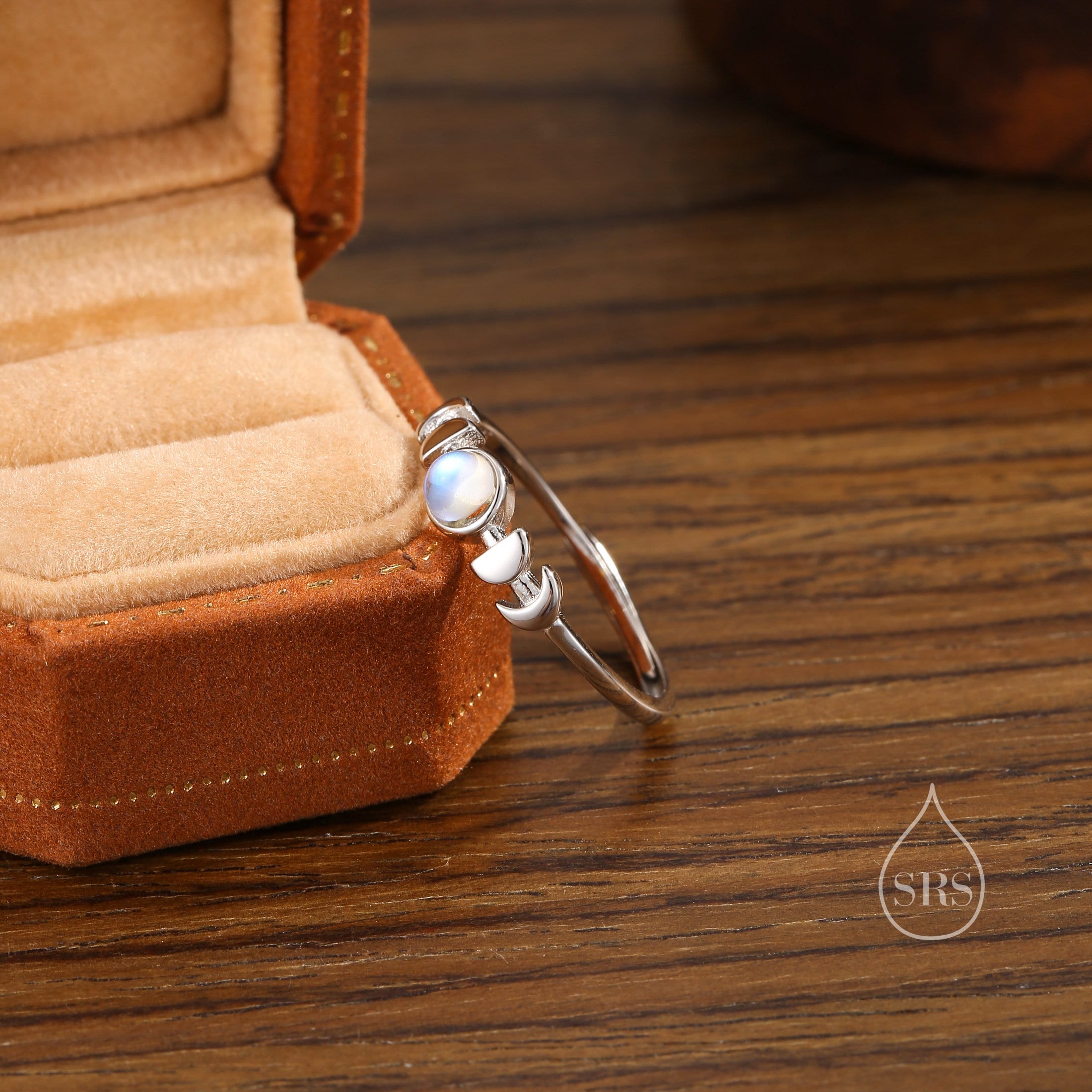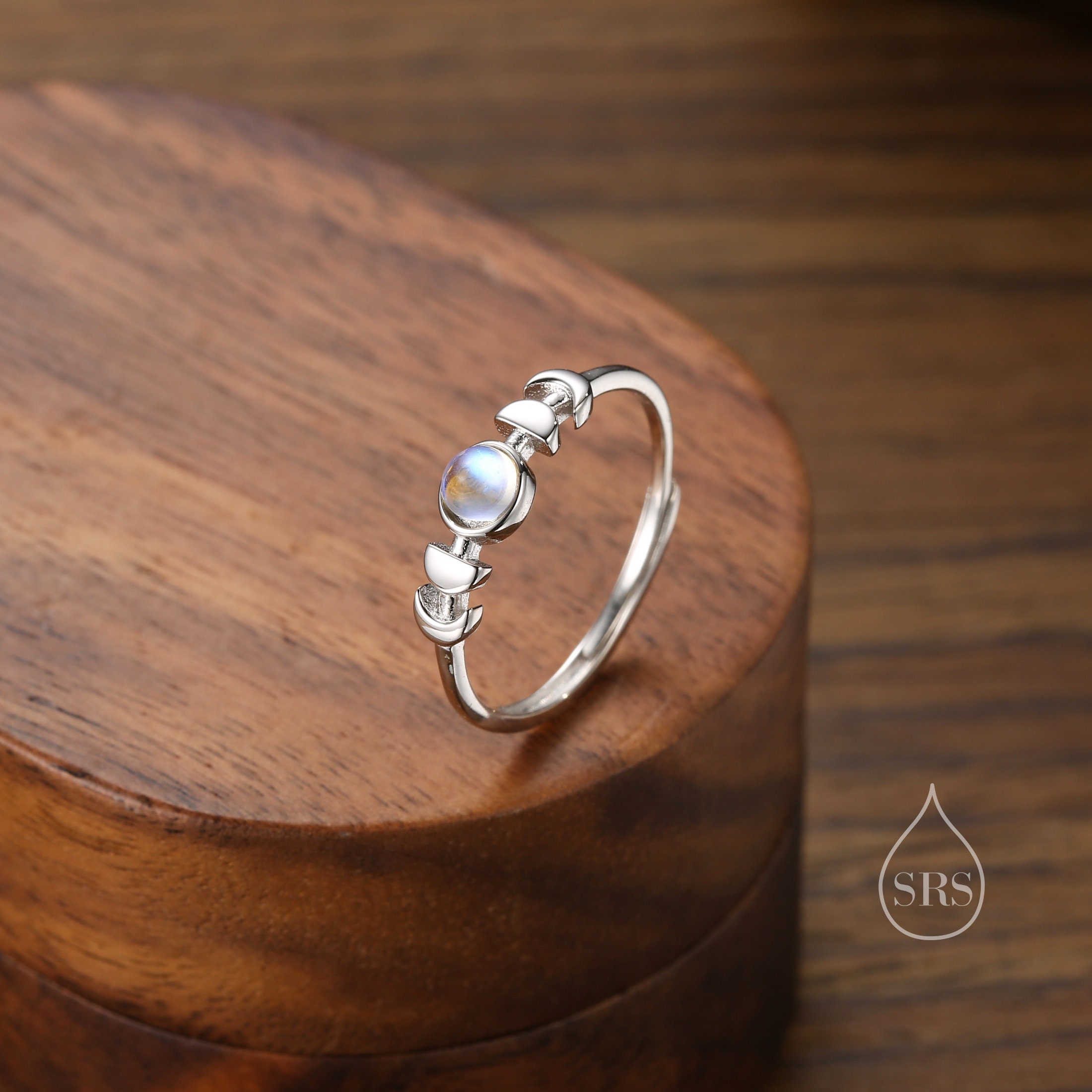 Sterling Silver Moon Phase Ring with Simulated Moonstone, Adjustable Size, Celestial Jewellery, Dainty and Delicate, Moon Ring