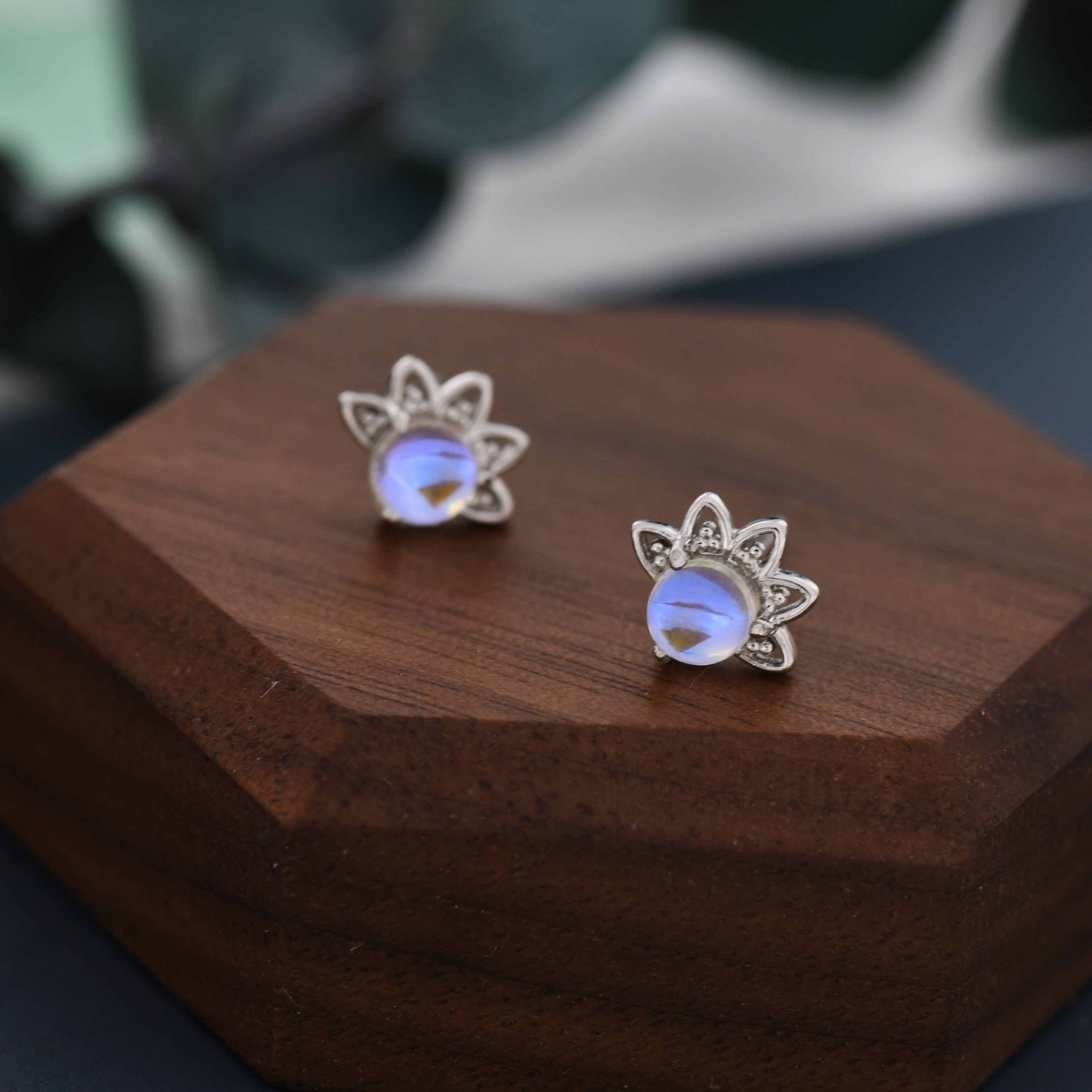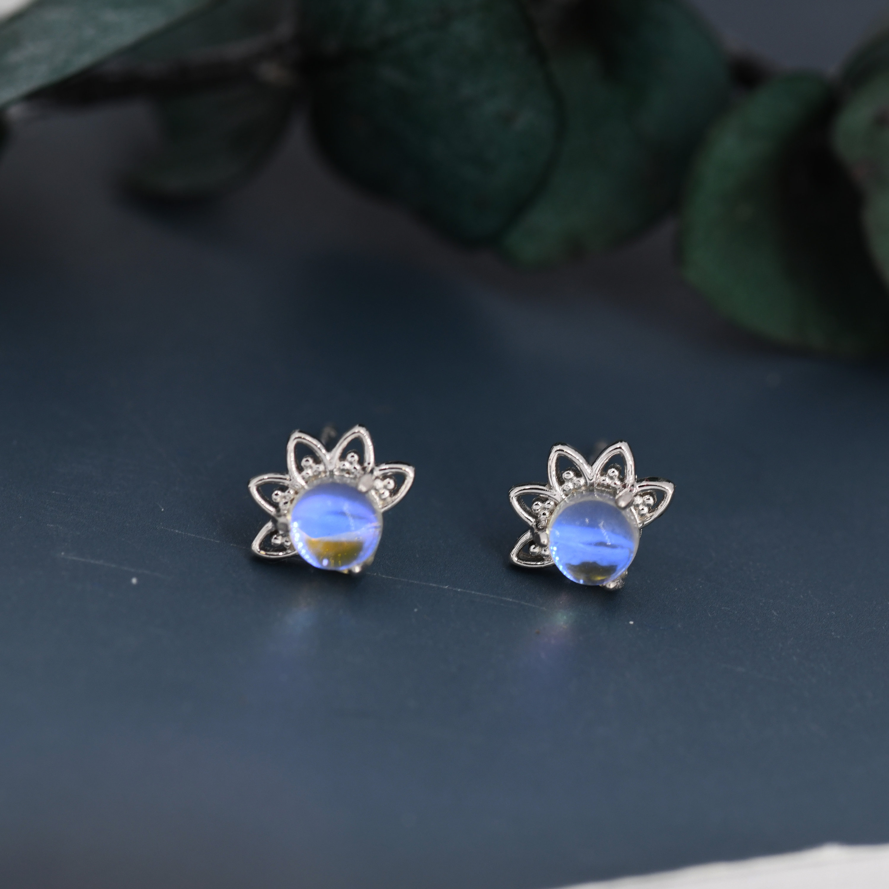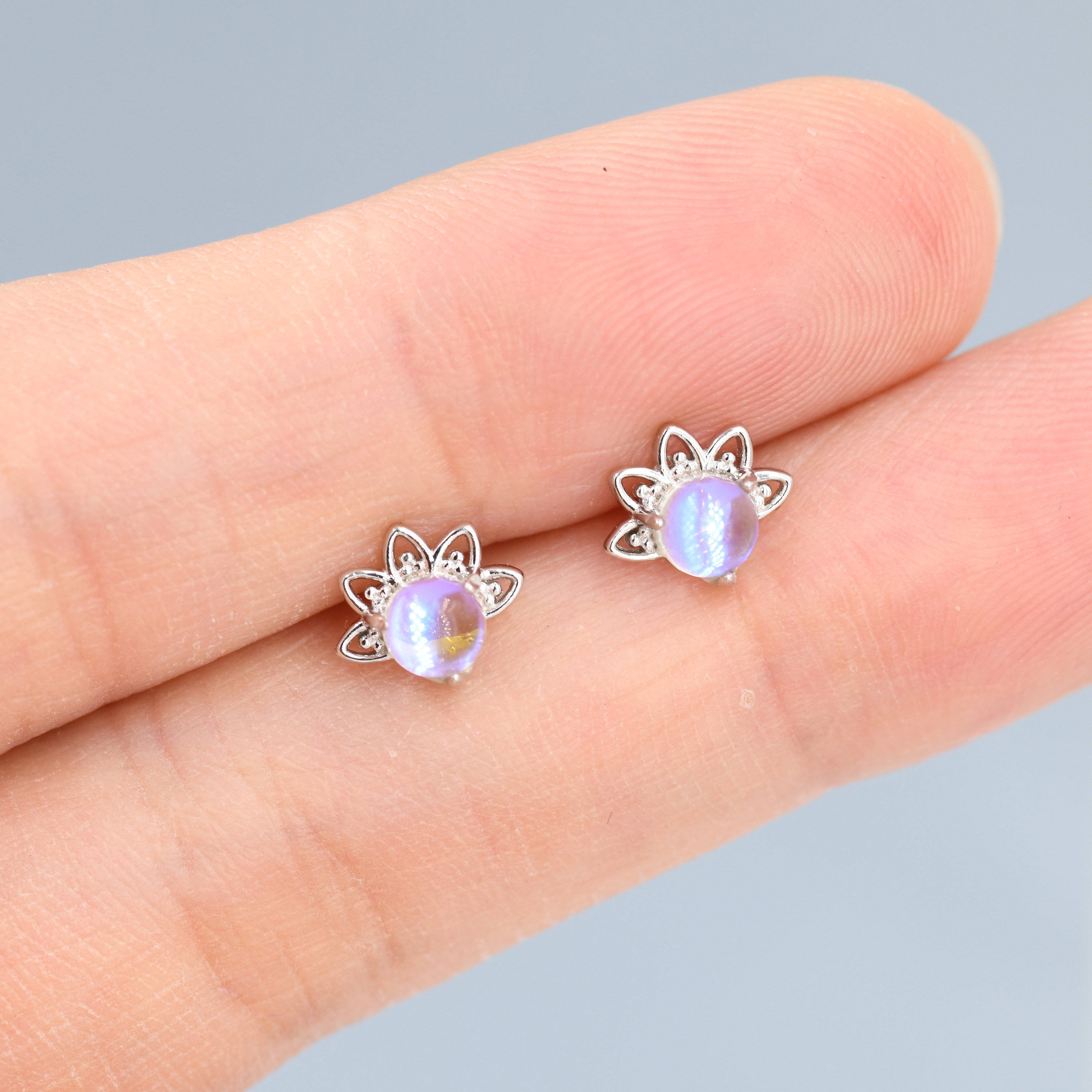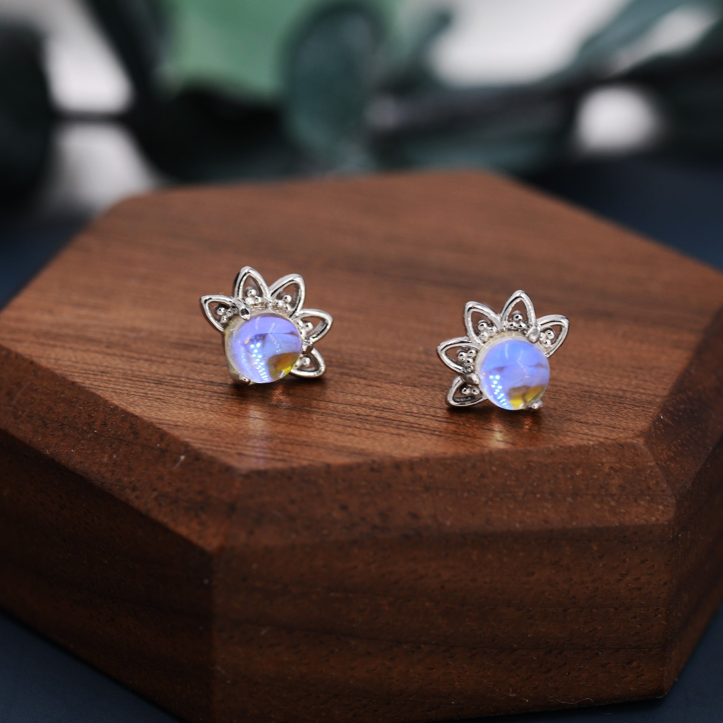 Sterling Silver Moonstone Crown Stud Earrings, Prong Set, Mermaid Colour Earrings, Simulated Moonstone Glass Earrings, Minimalist